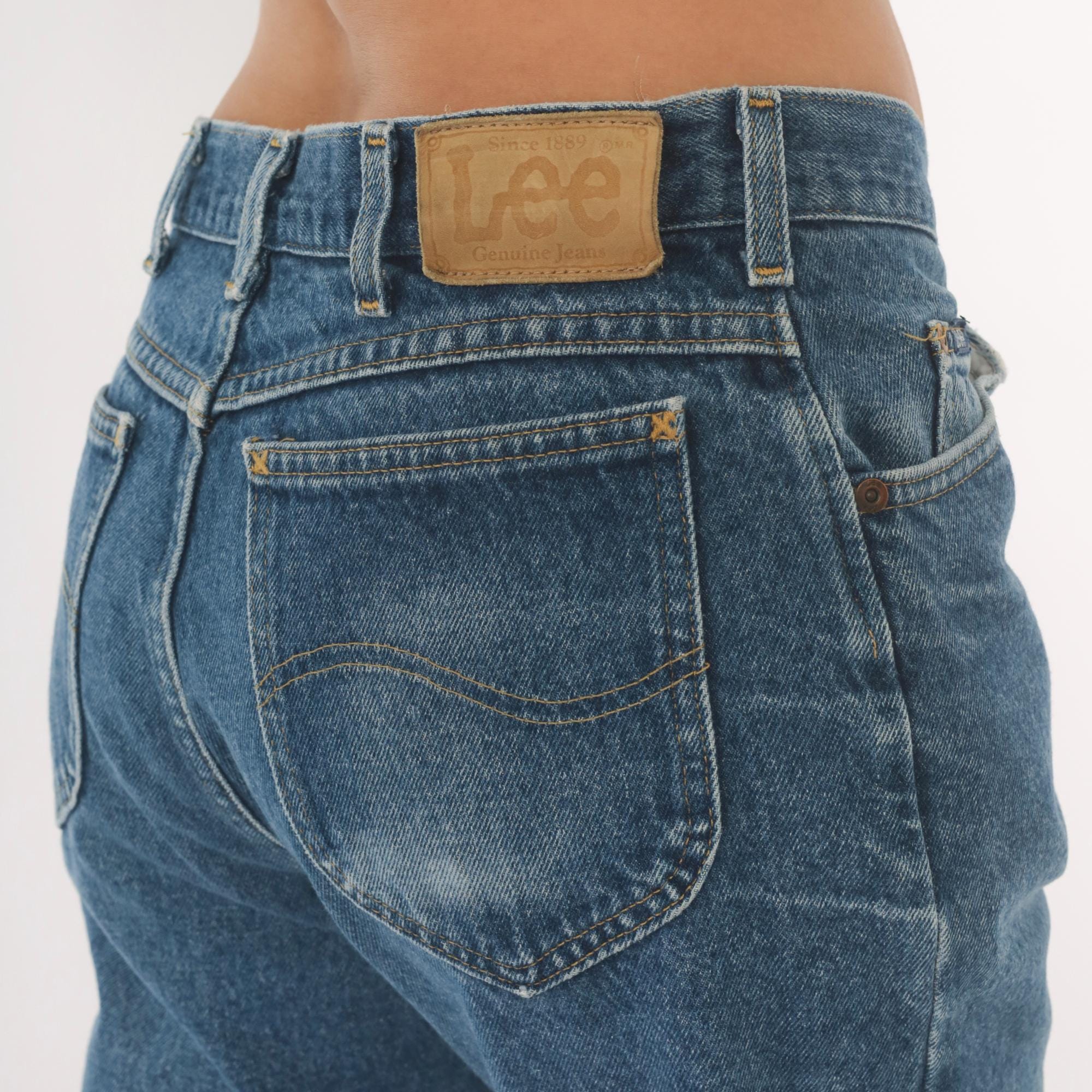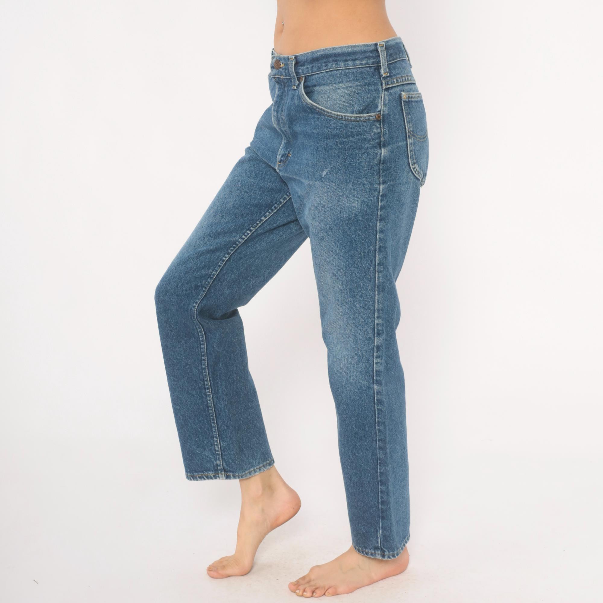 2000s Lee jeans in a medium blue wash with natural fading at the thighs, seat, and front crease areas. Straight leg silhouette with a mid-rise fit and the signature Lee leather patch on the back waistband.