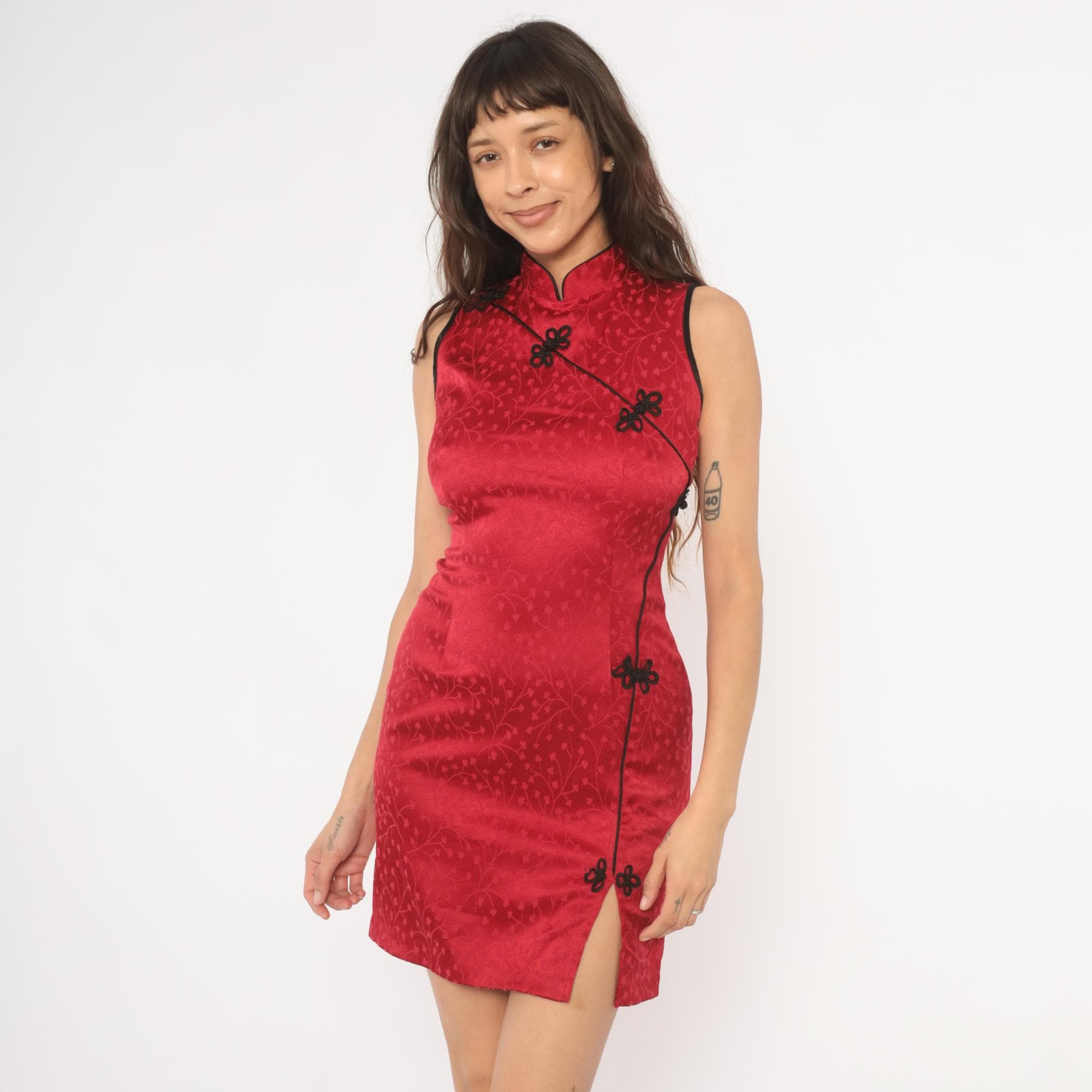 Red cheongsam mini dress from Sabora with a mandarin collar, diagonal front placket, and black frog button closures. Tonal jacquard floral vine pattern across the crimson satin-finish fabric, with black contrast piping along the edges and armholes. Sleeveless and fitted through the bodice and hip, with a small front side slit at the hem and back zipper.