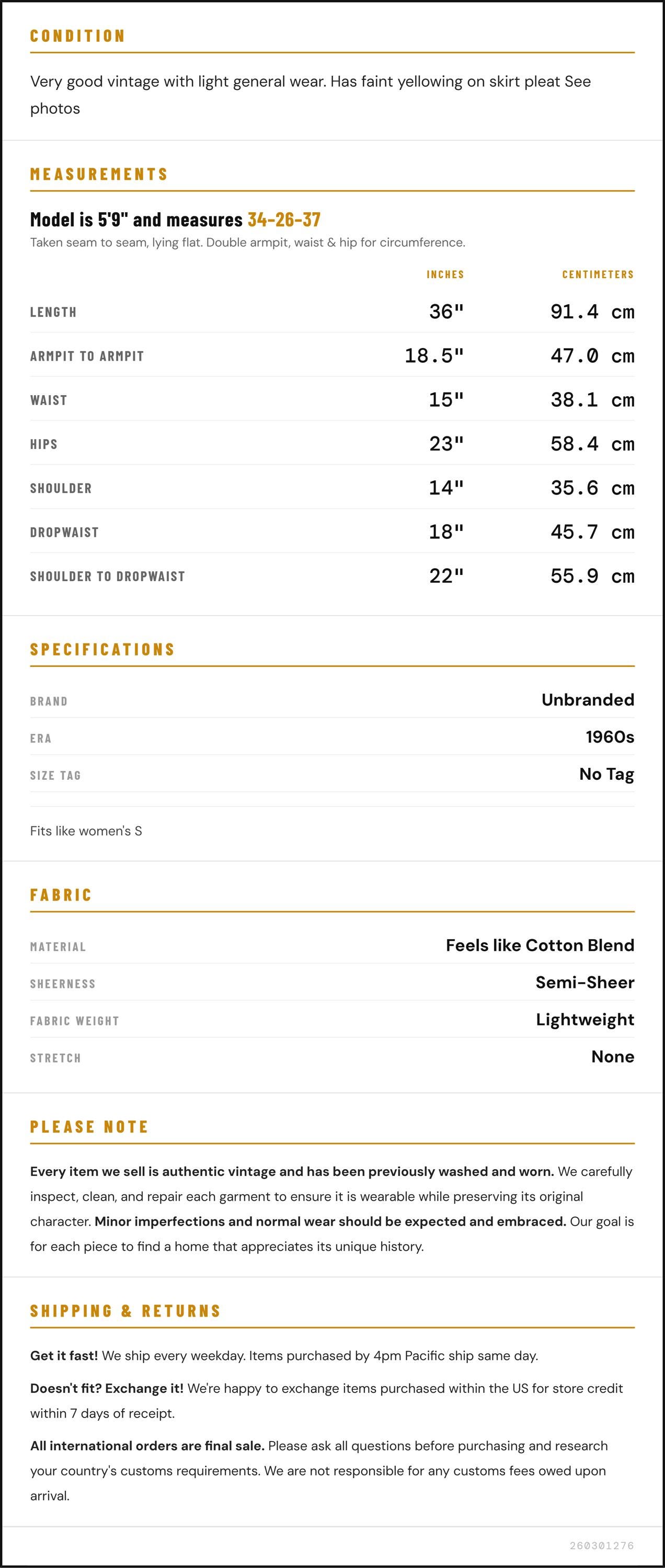 Condition: Very good vintage with light general wear. Has faint yellowing on skirt pleat See photos