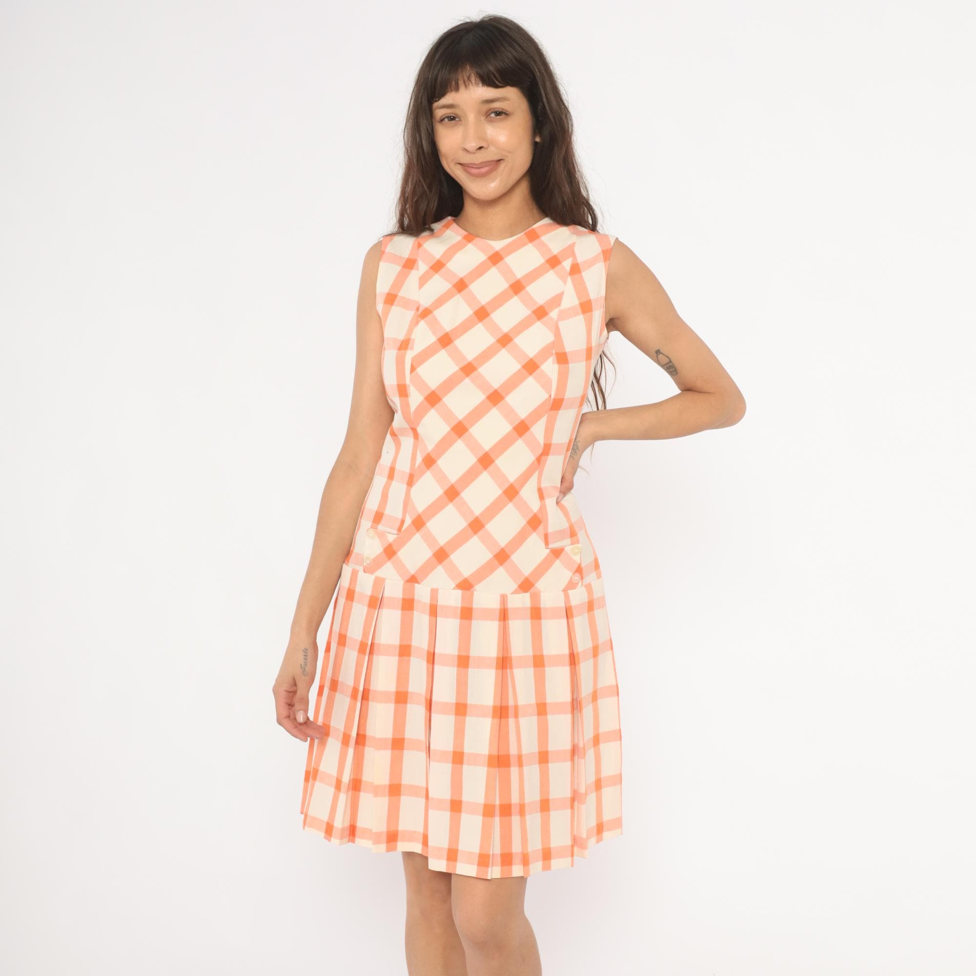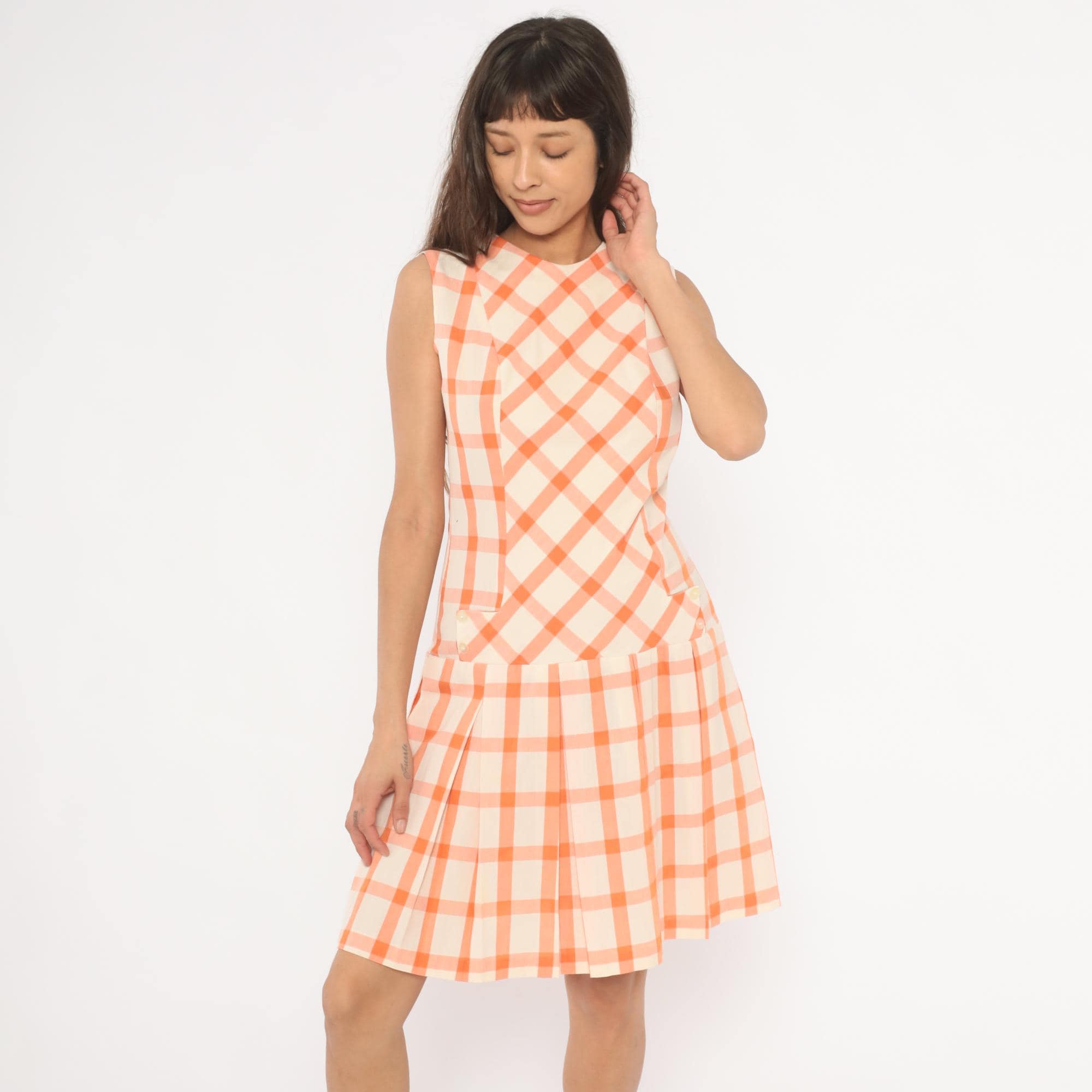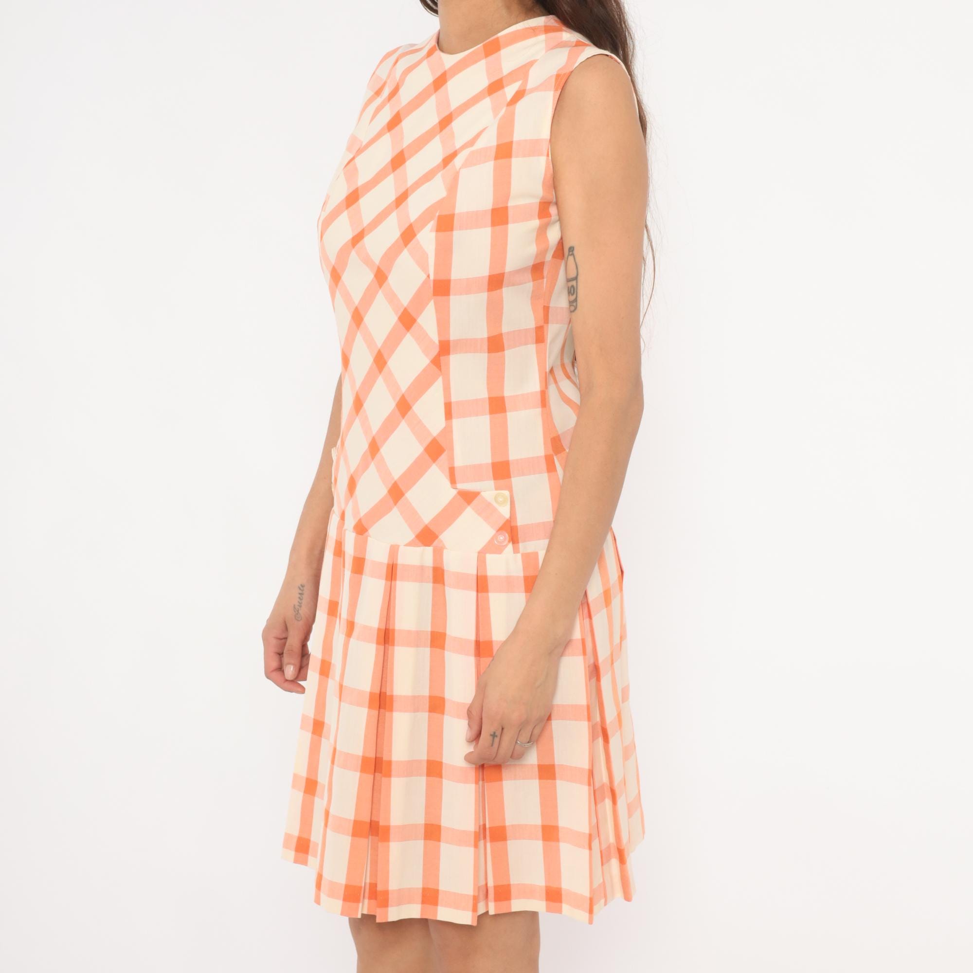 60s orange and cream gingham drop waist dress with a bias-cut bodice and straight-grain pleated skirt below the hip seam. Sleeveless with a round crew neckline, back zipper closure, and small decorative buttons at the front waistline. The bodice plaid runs on the diagonal while the box-pleated skirt has the check pattern on the straight grain, with a semi-sheer hand.