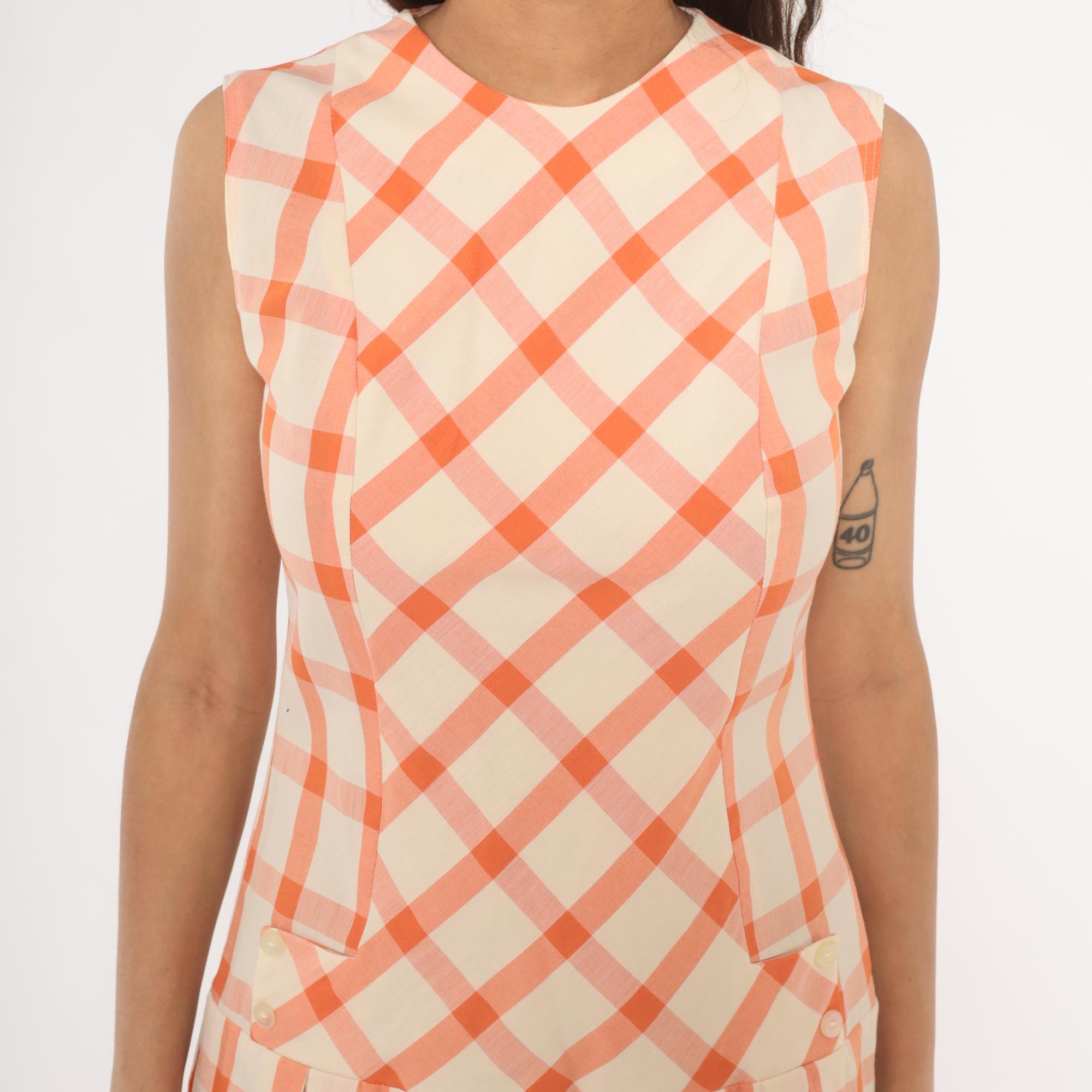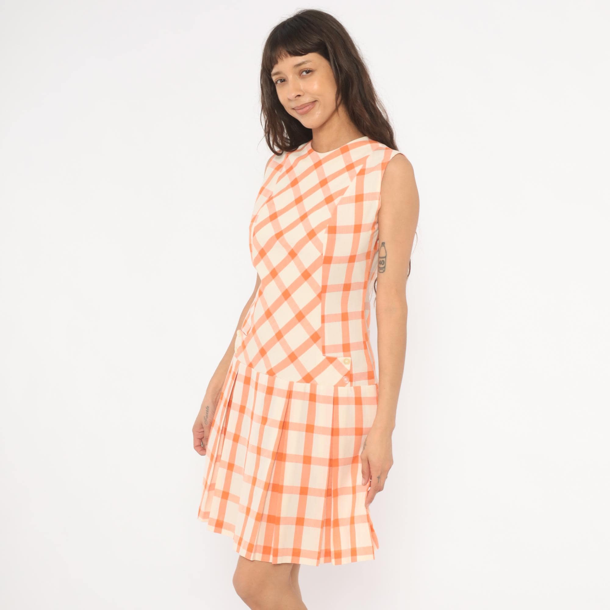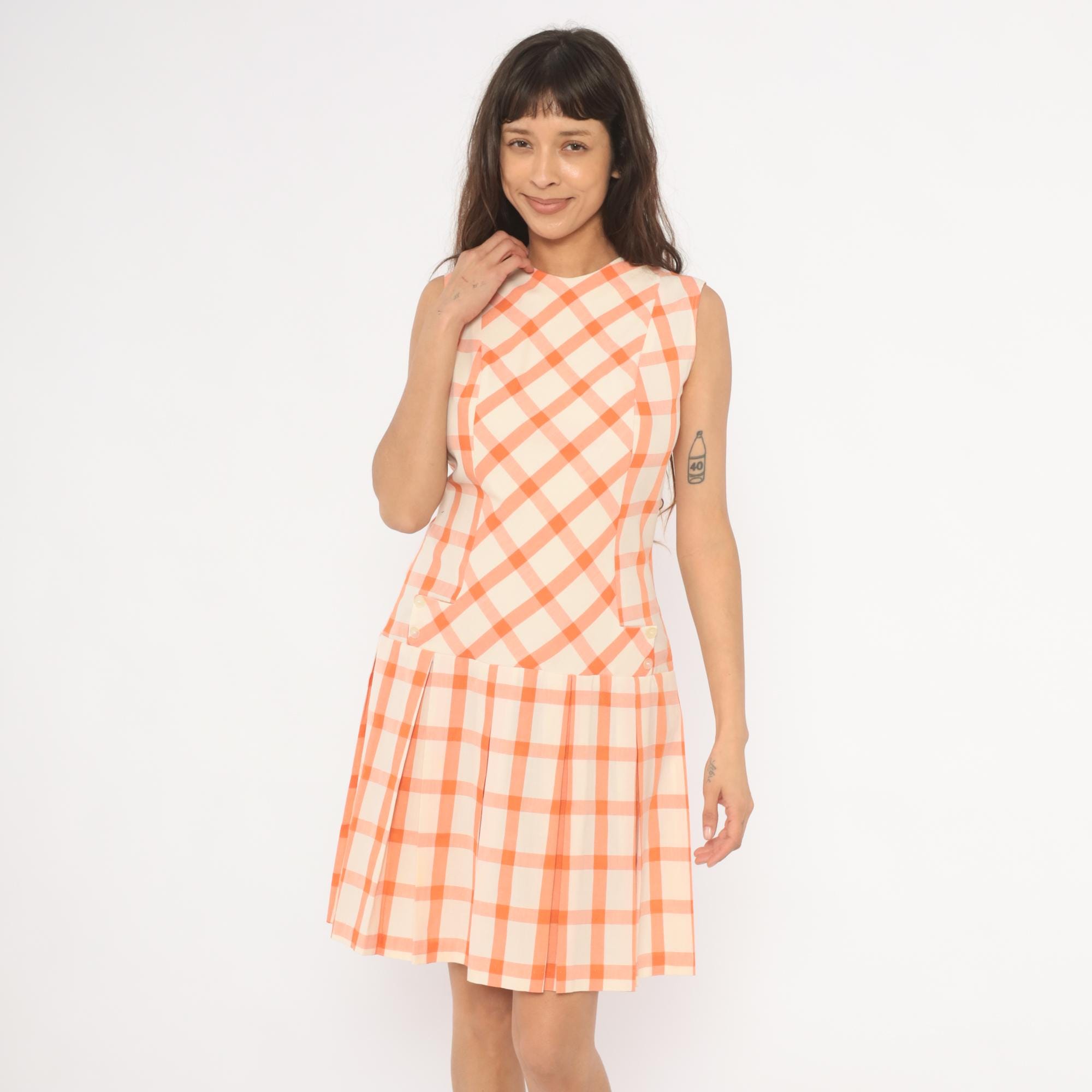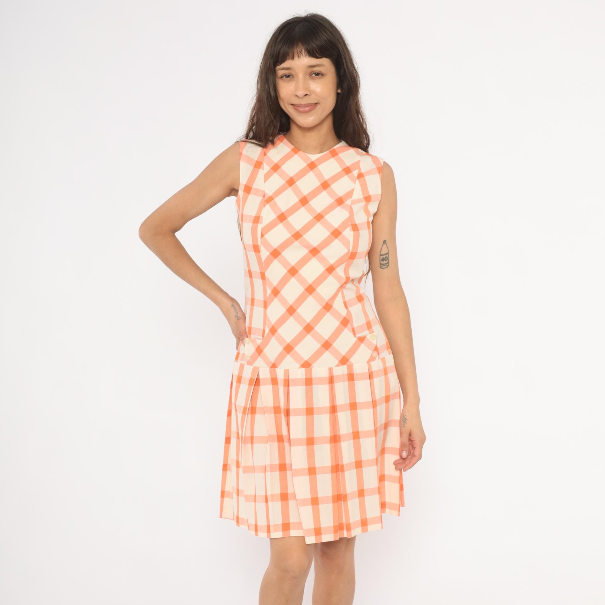 60s orange and cream gingham drop waist dress with a bias-cut bodice and straight-grain pleated skirt below the hip seam. Sleeveless with a round crew neckline, back zipper closure, and small decorative buttons at the front waistline. The bodice plaid runs on the diagonal while the box-pleated skirt has the check pattern on the straight grain, with a semi-sheer hand.