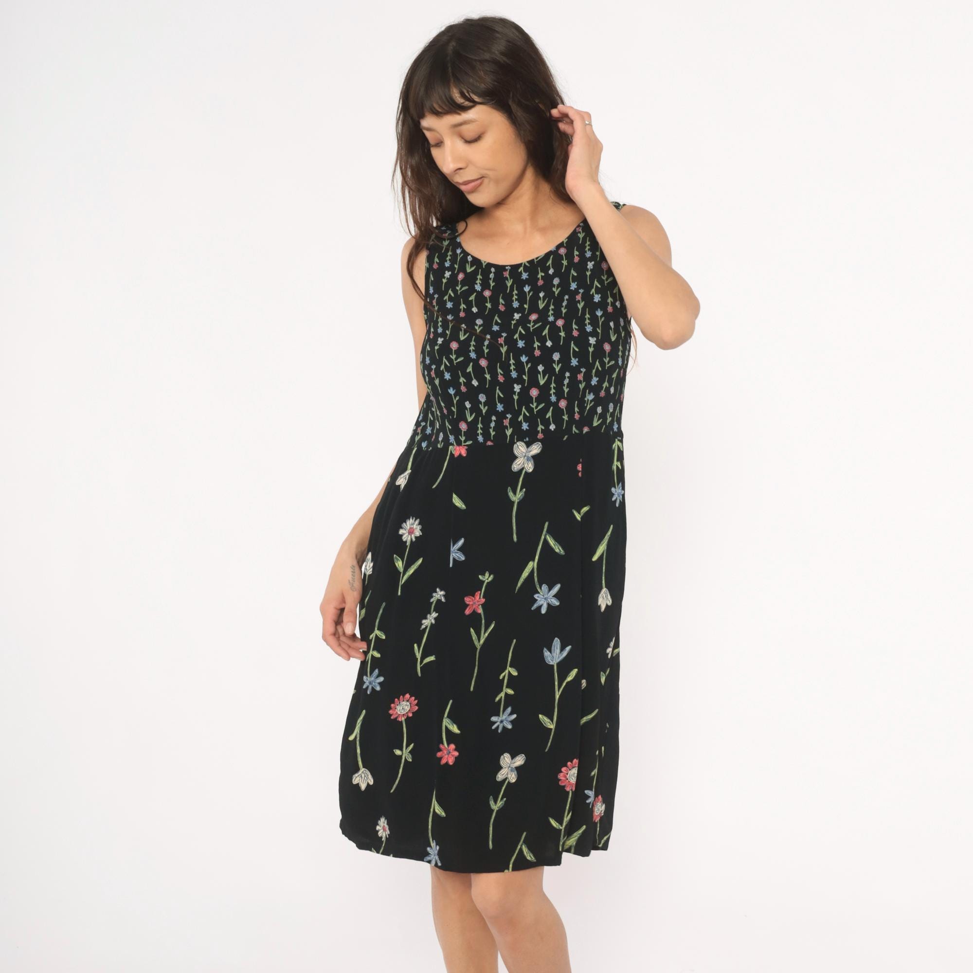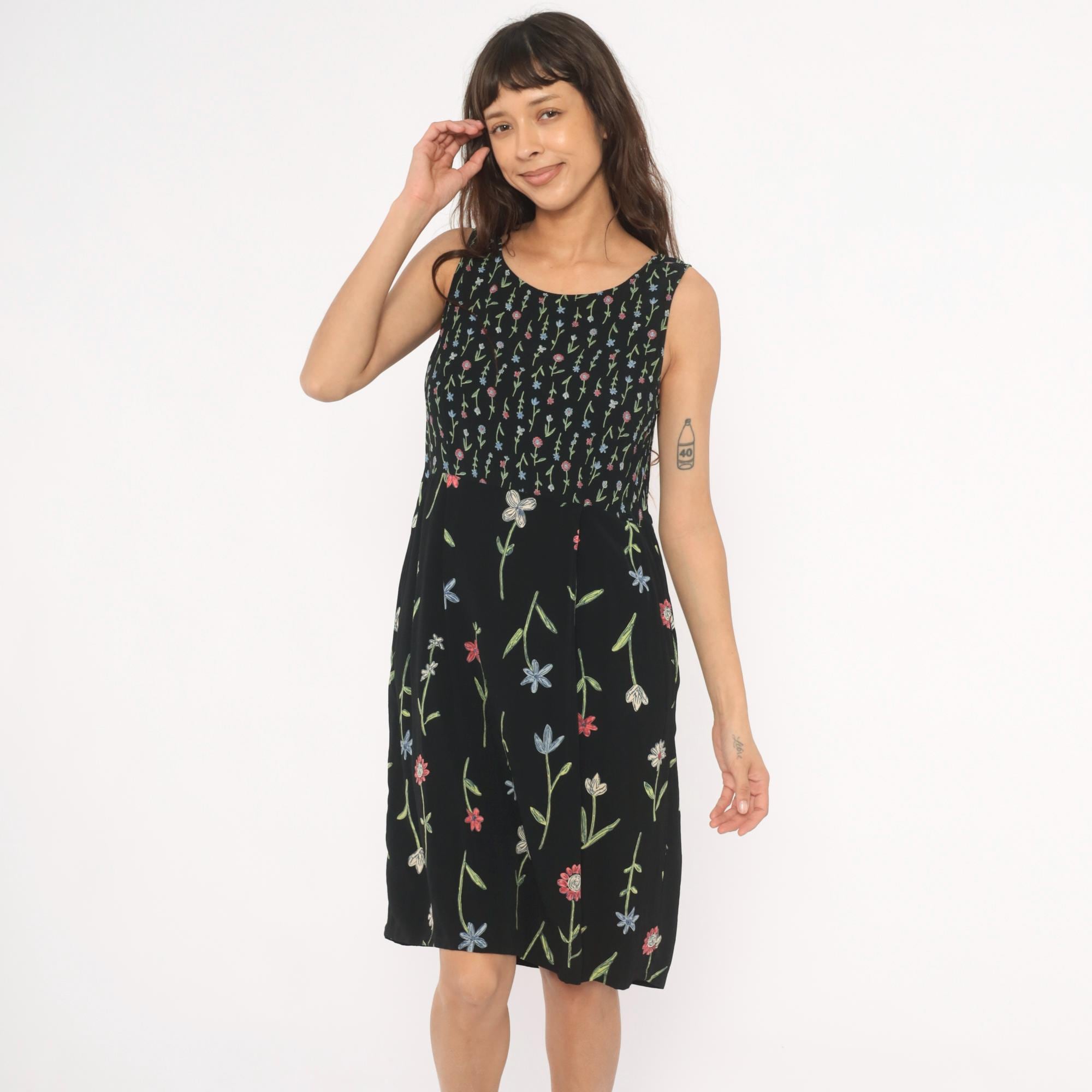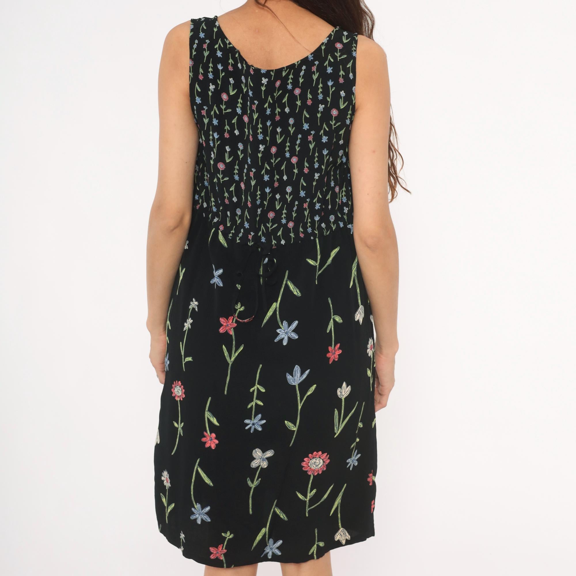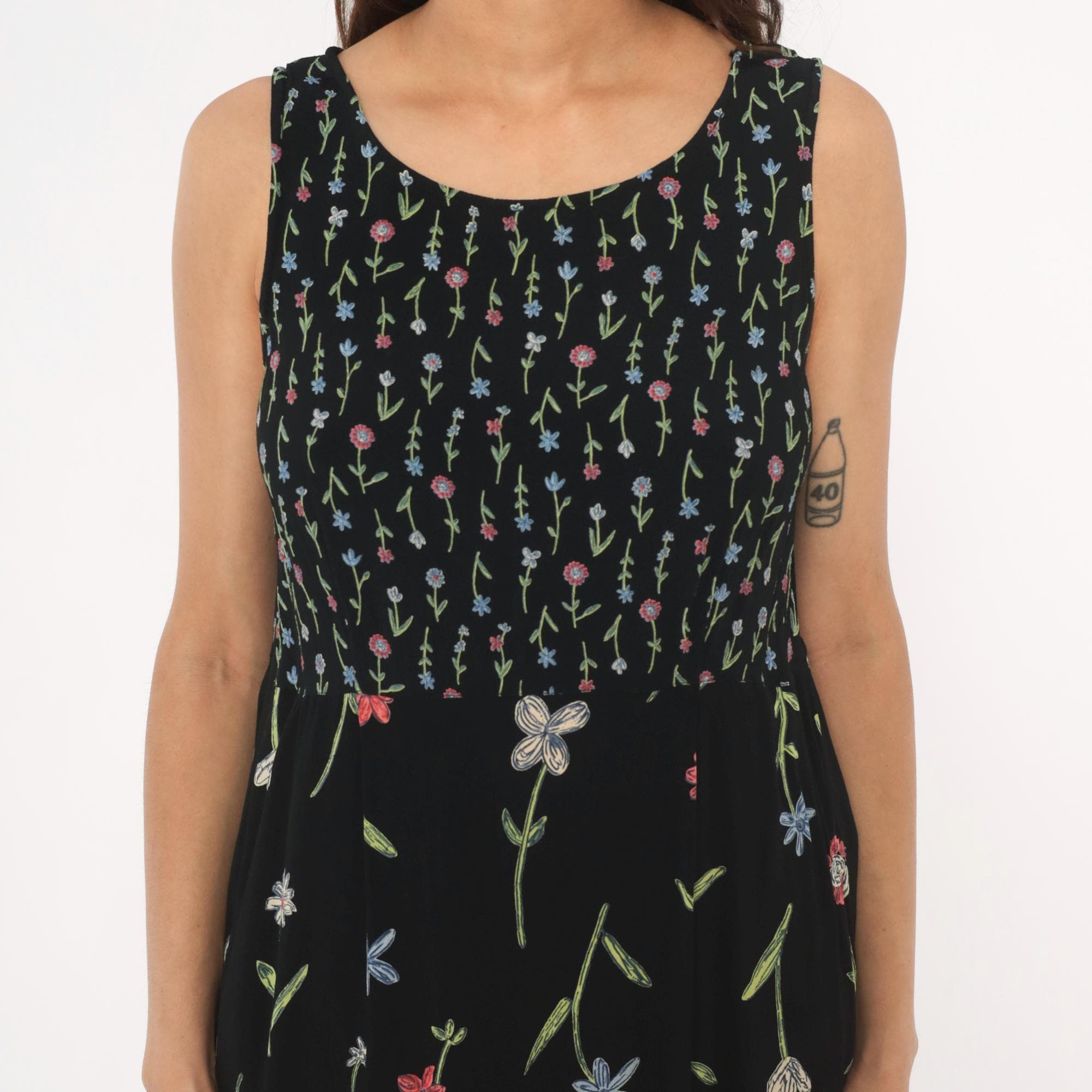90s black sleeveless dress from Putumayo with allover embroidered wildflower motifs in pink, blue, white, and green. Scoop neckline, fitted bodice with dense small-scale floral print transitioning to a larger scattered floral pattern on the skirt. Tie closure at the back waist, side seam pockets, and a knee-length A-line silhouette.