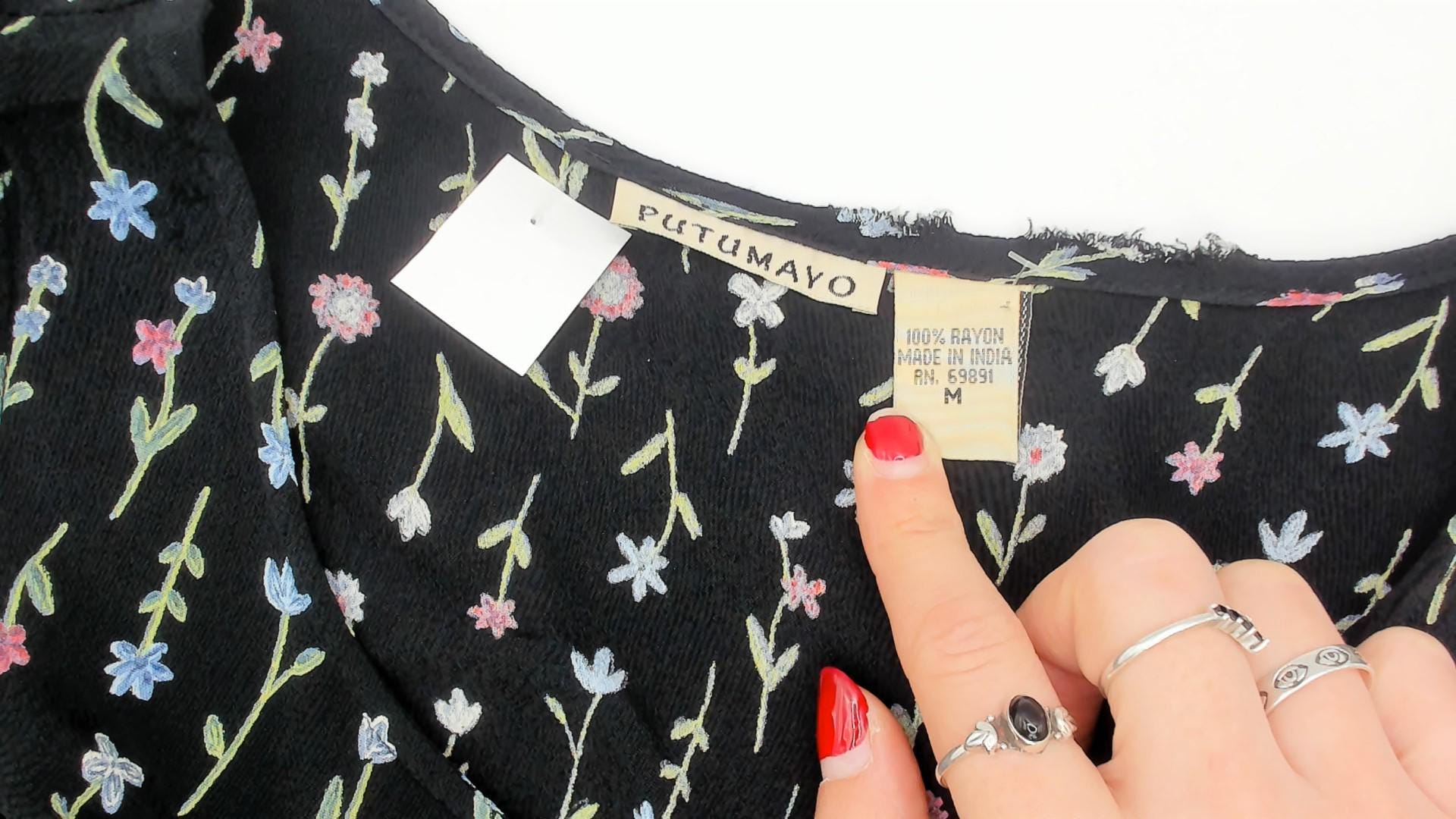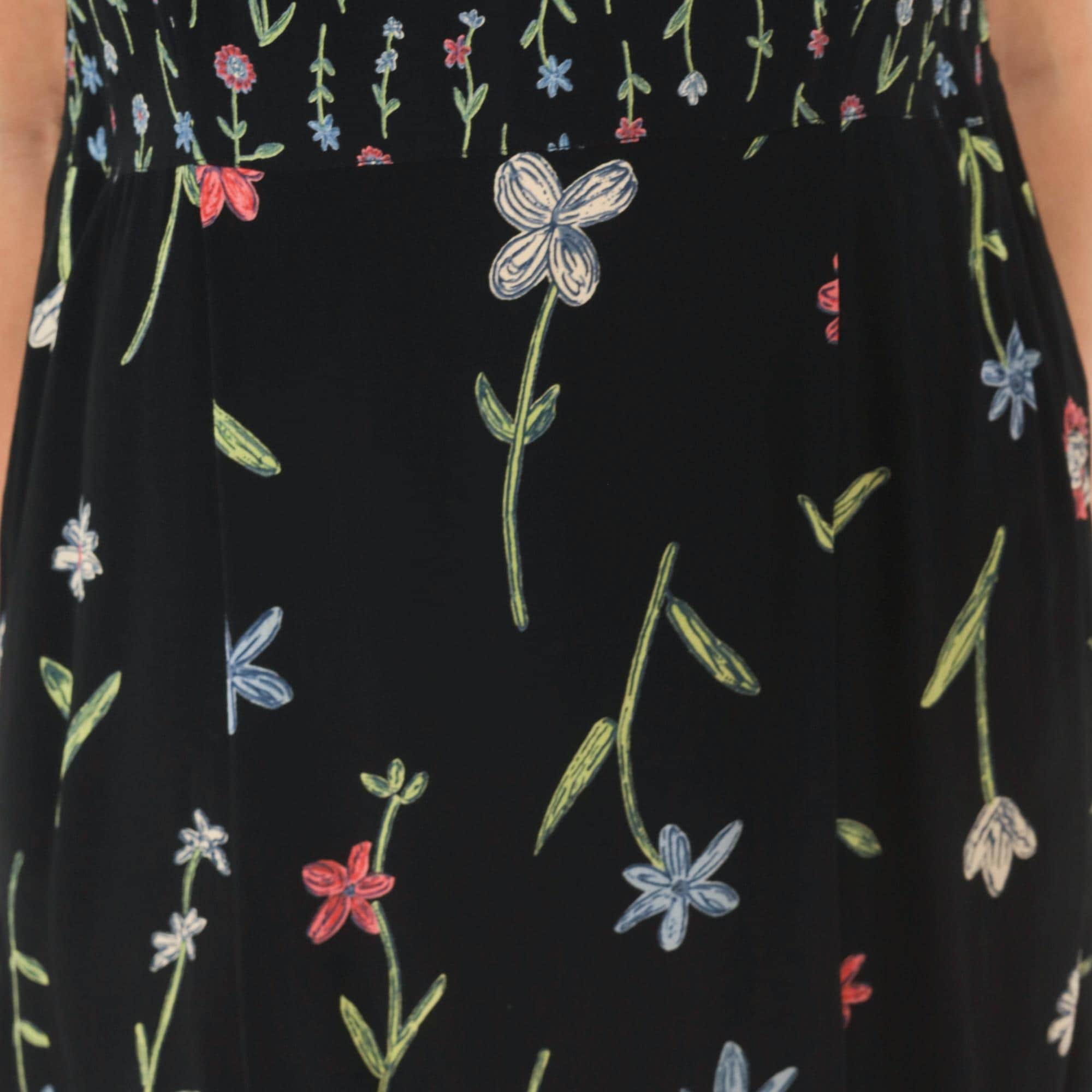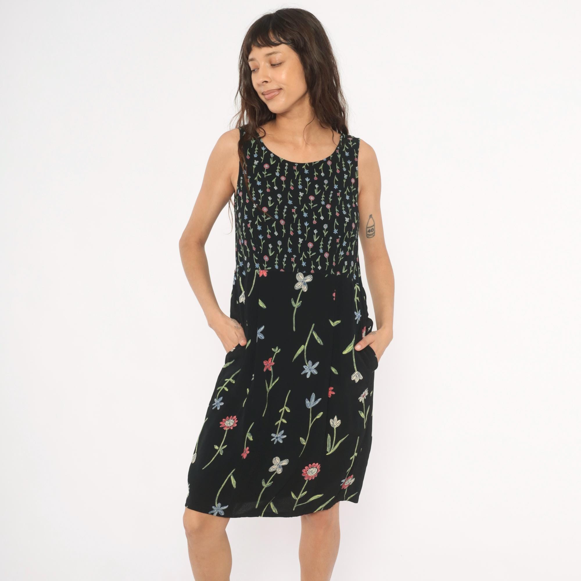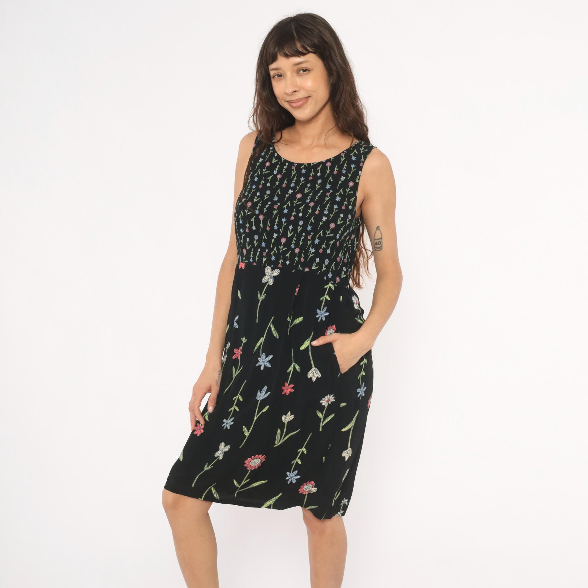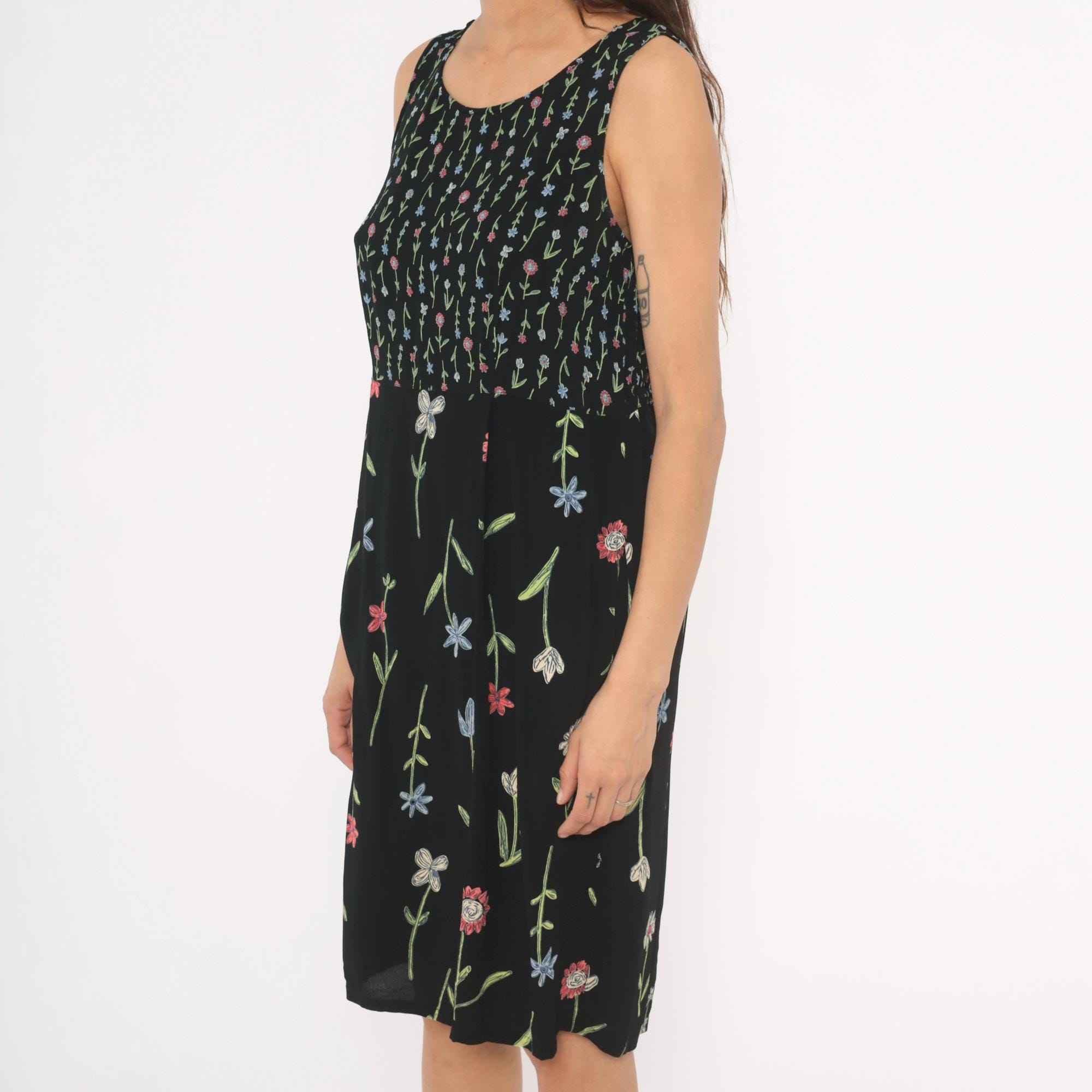 90s black sleeveless dress from Putumayo with allover embroidered wildflower motifs in pink, blue, white, and green. Scoop neckline, fitted bodice with dense small-scale floral print transitioning to a larger scattered floral pattern on the skirt. Tie closure at the back waist, side seam pockets, and a knee-length A-line silhouette.