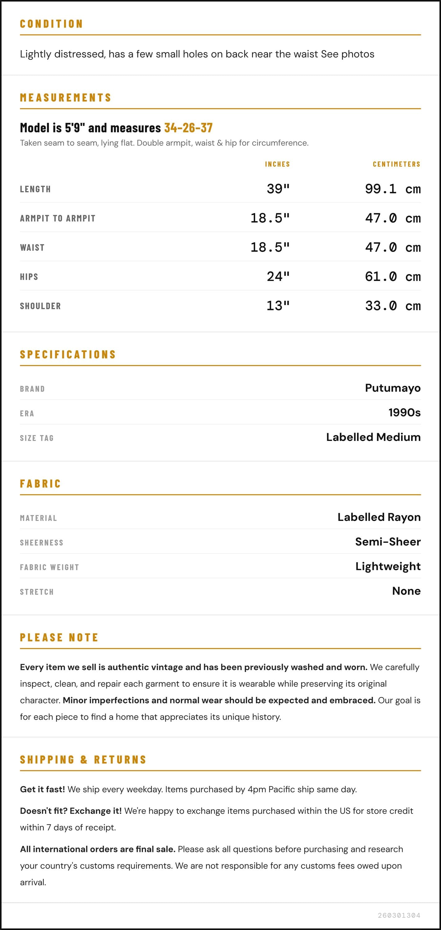 Condition: Lightly distressed, has a few small holes on back near the waist See photos