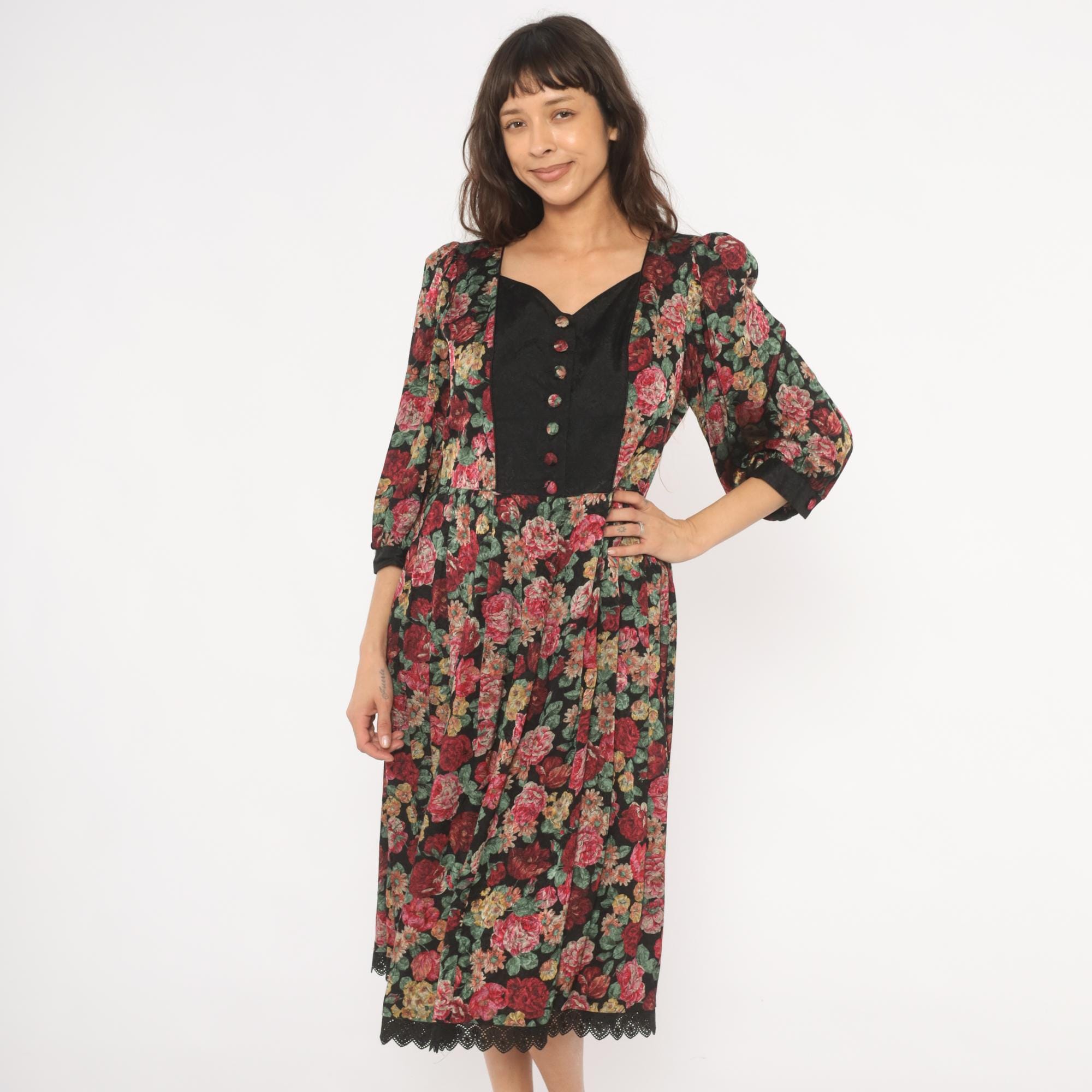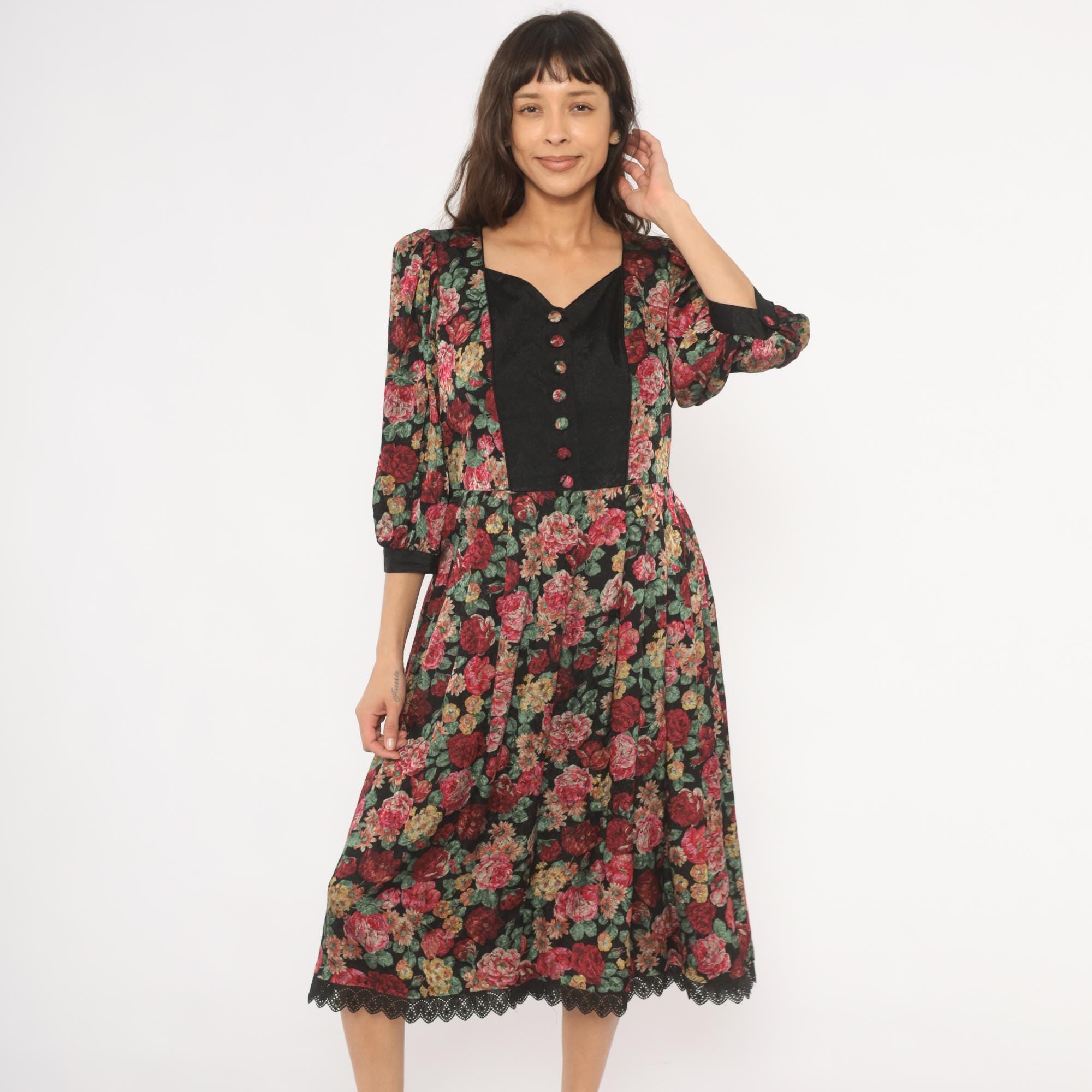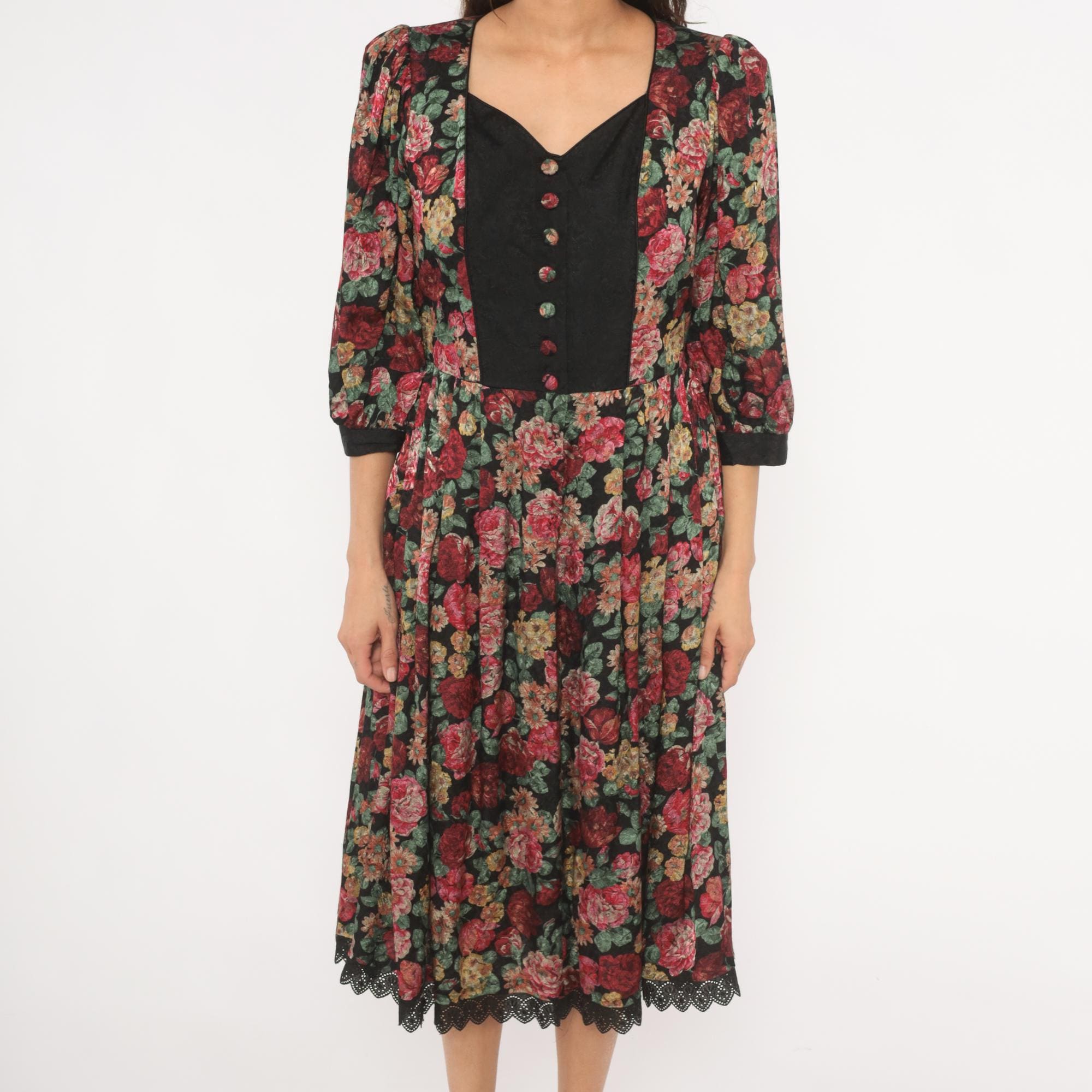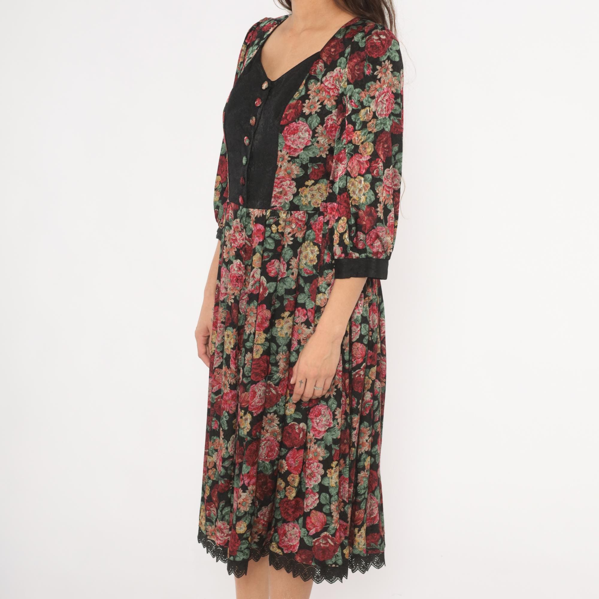 90s dark floral dirndl dress from Rose Dirndl with a black solid bodice panel, sweetheart neckline, and fabric-covered button front closure. Pink, red, and green rose print on a black ground with three-quarter puff sleeves gathered into solid black cuffs.