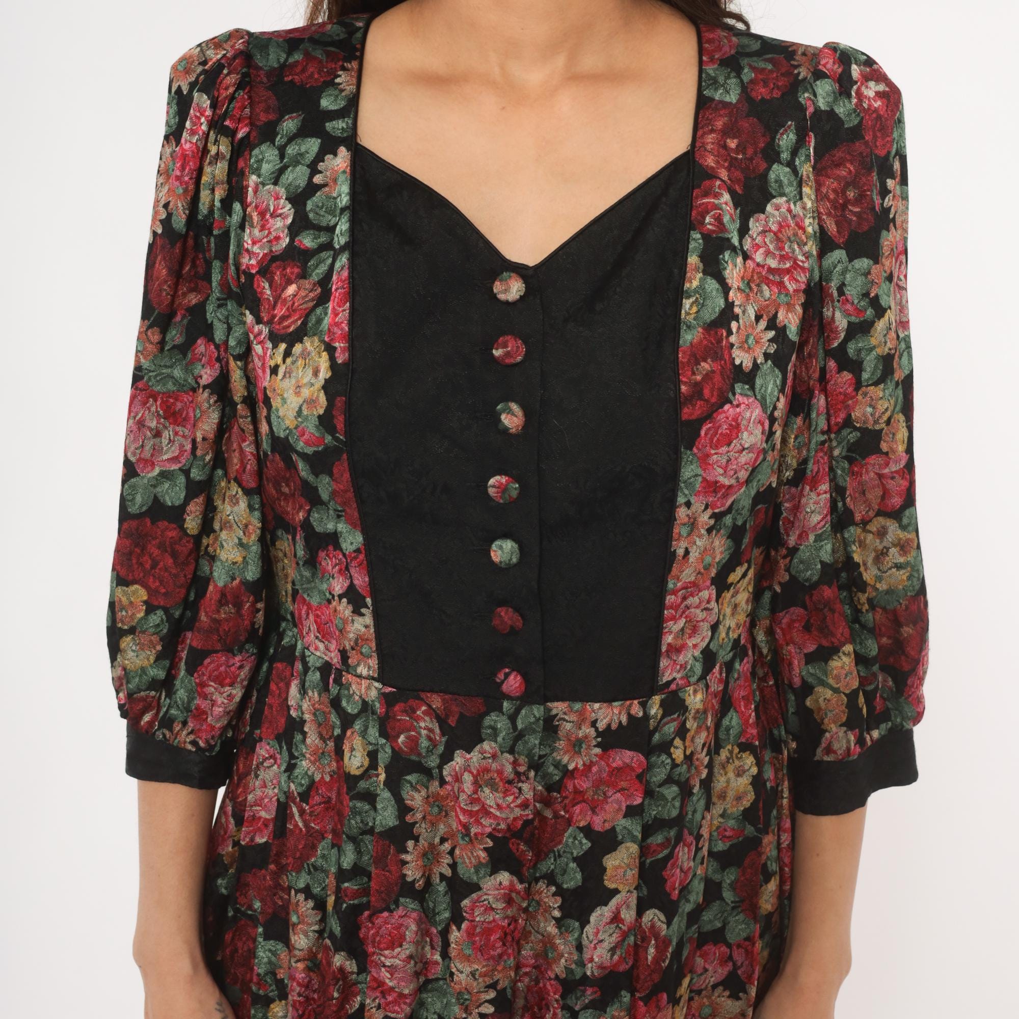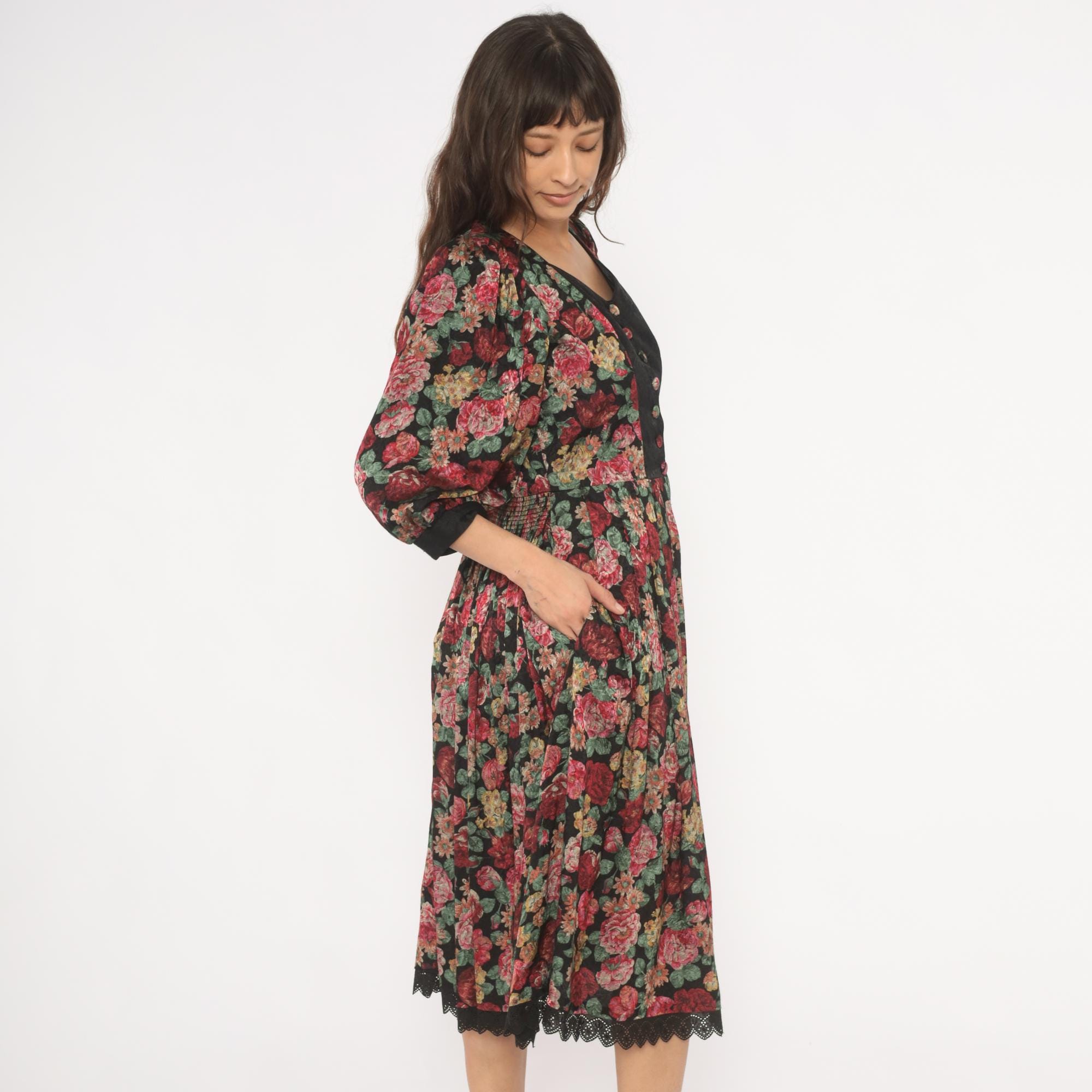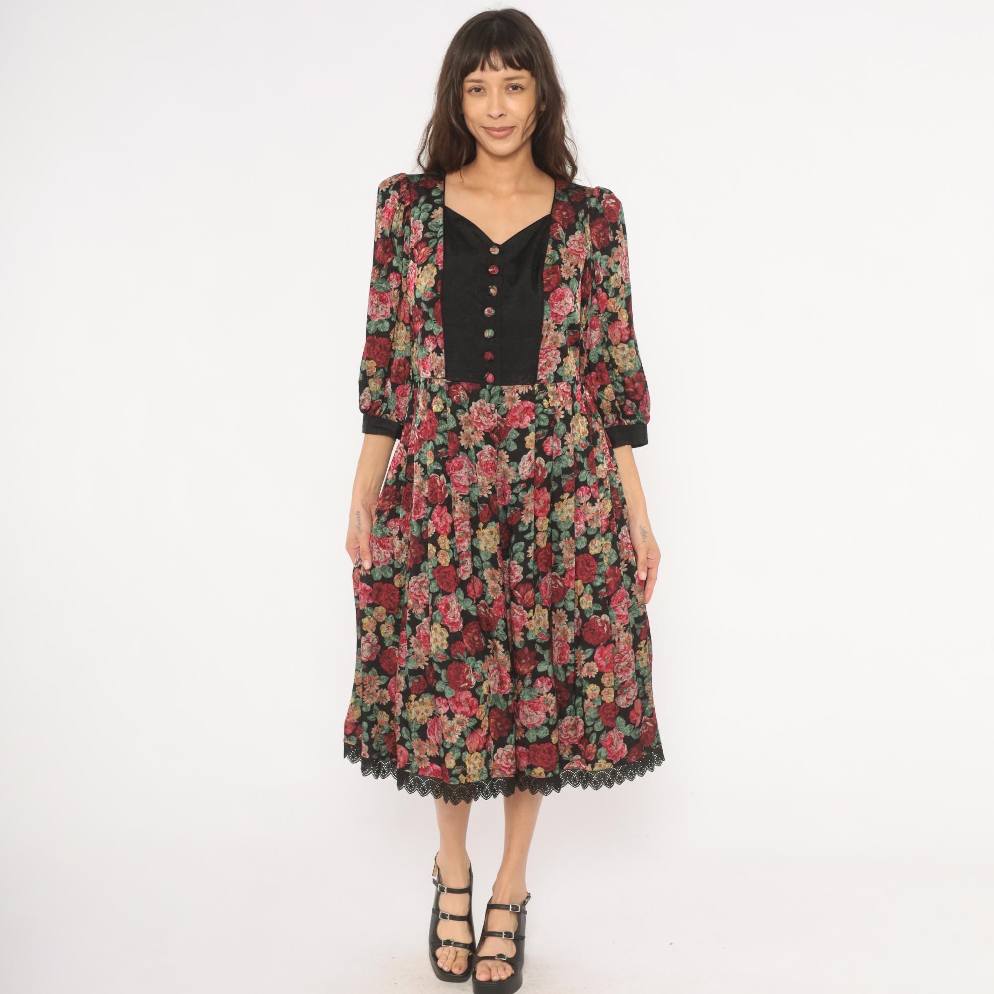 90s dark floral dirndl dress from Rose Dirndl with a black solid bodice panel, sweetheart neckline, and fabric-covered button front closure. Pink, red, and green rose print on a black ground with three-quarter puff sleeves gathered into solid black cuffs.