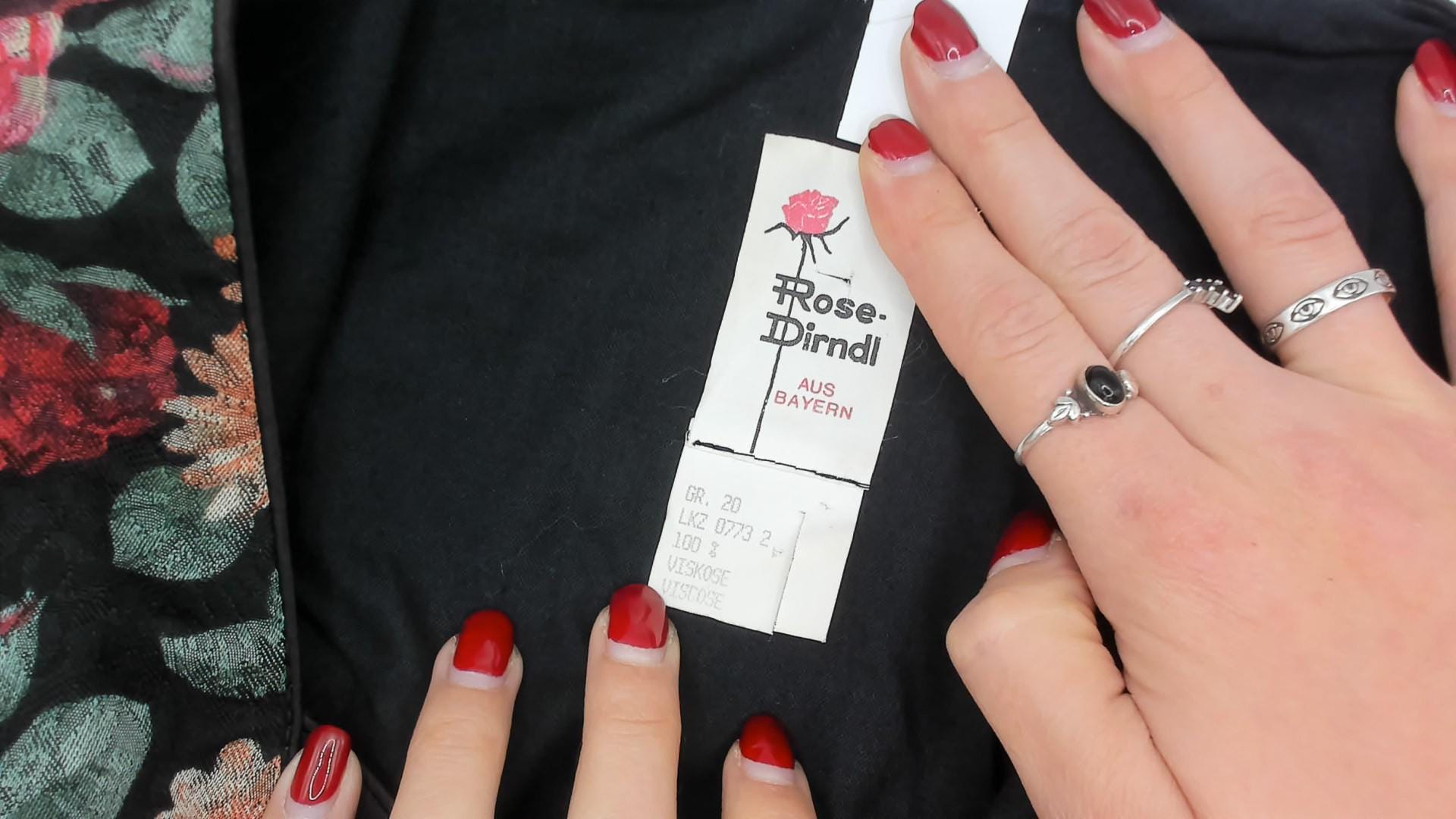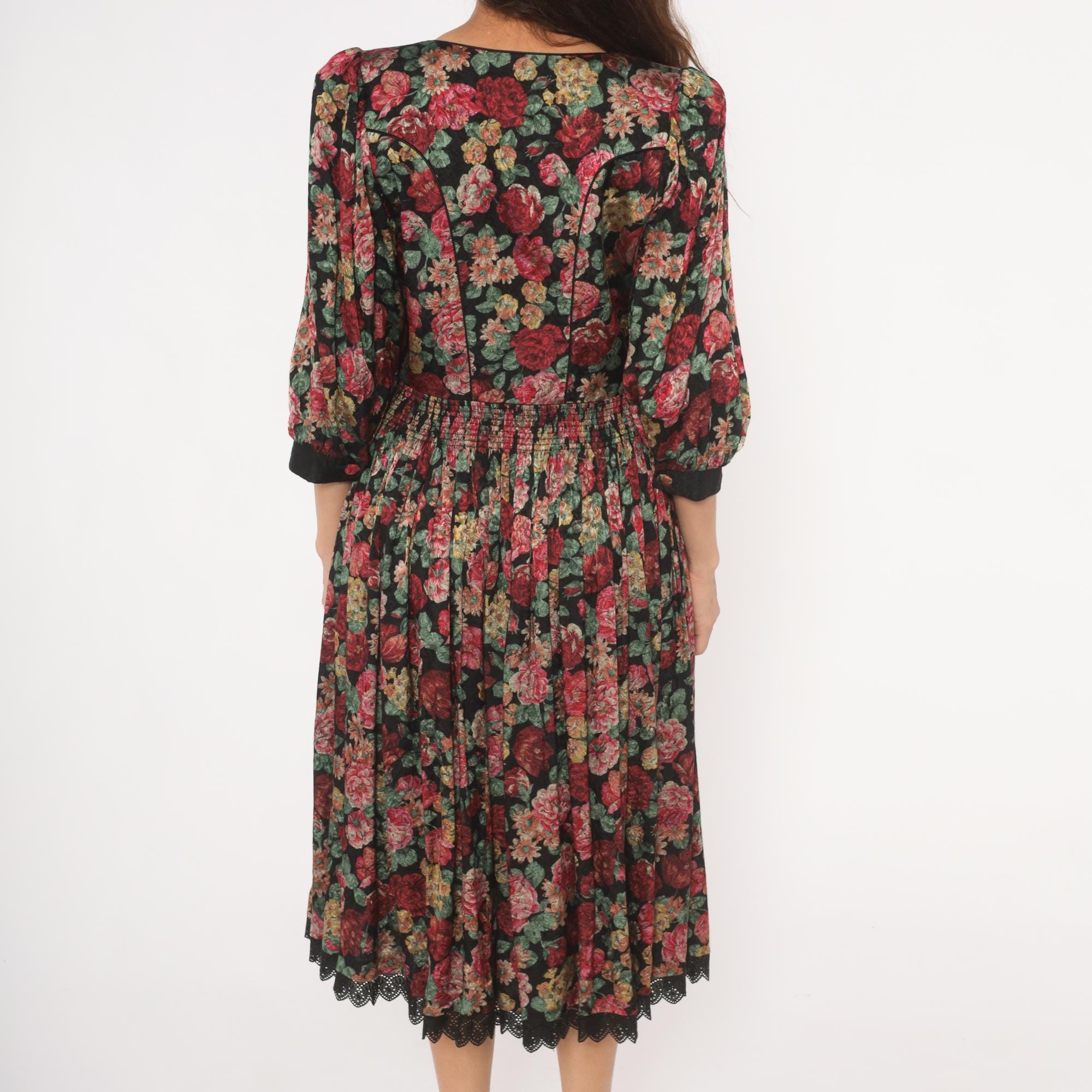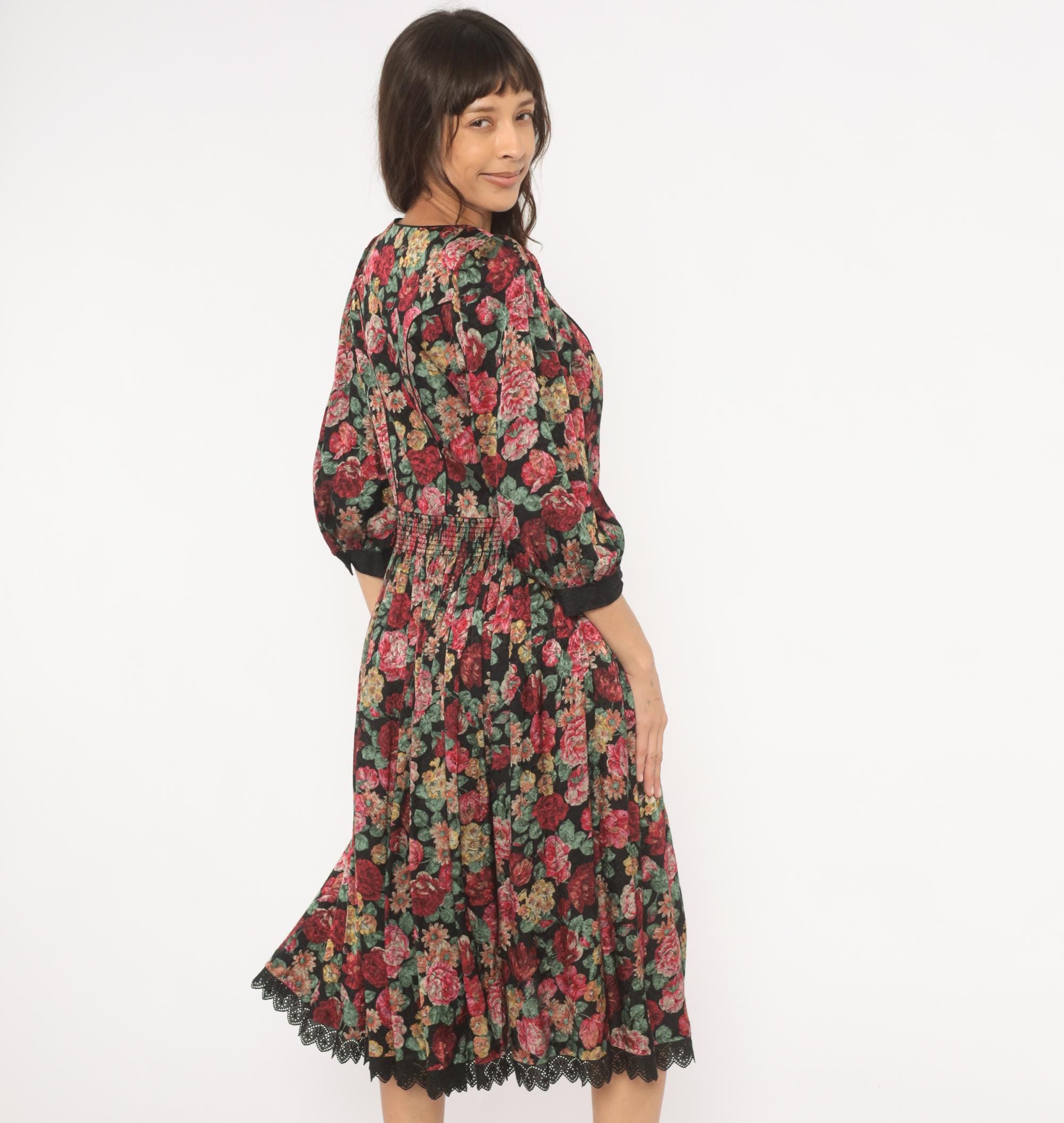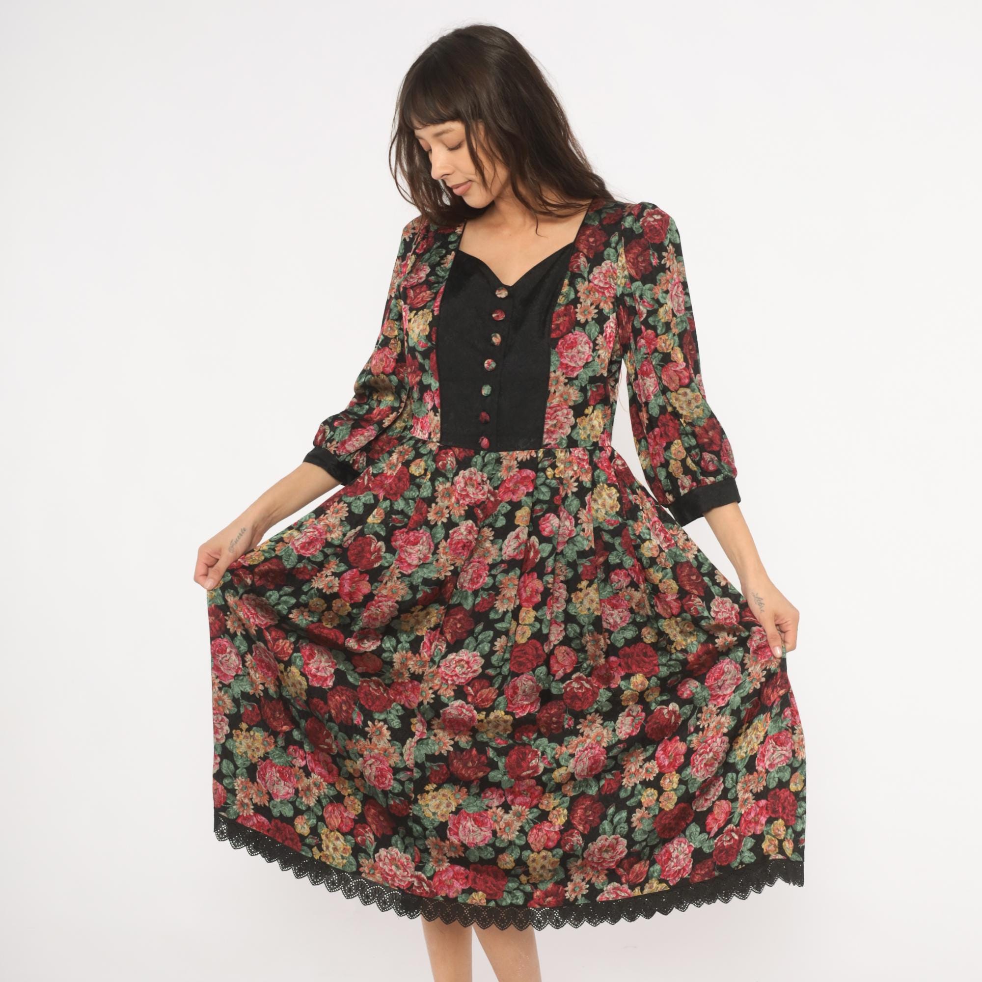 90s dark floral dirndl dress from Rose Dirndl with a black solid bodice panel, sweetheart neckline, and fabric-covered button front closure. Pink, red, and green rose print on a black ground with three-quarter puff sleeves gathered into solid black cuffs.