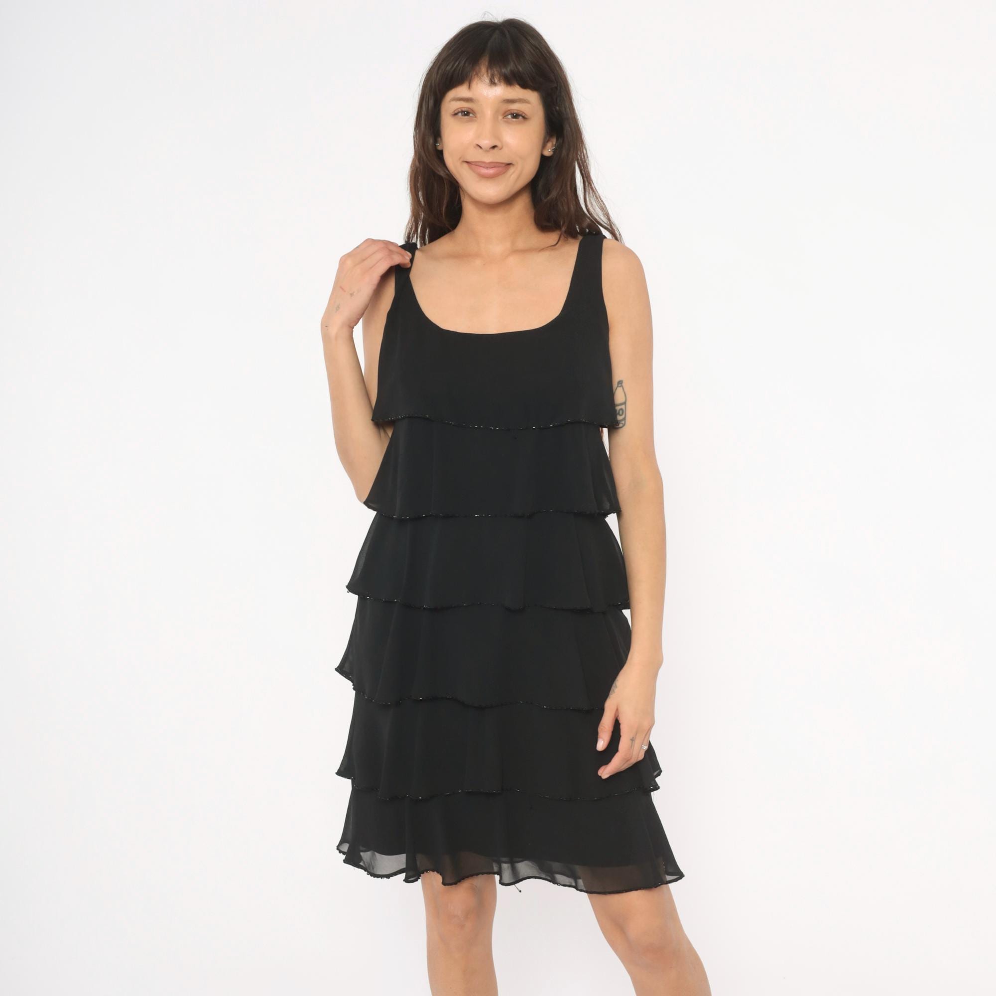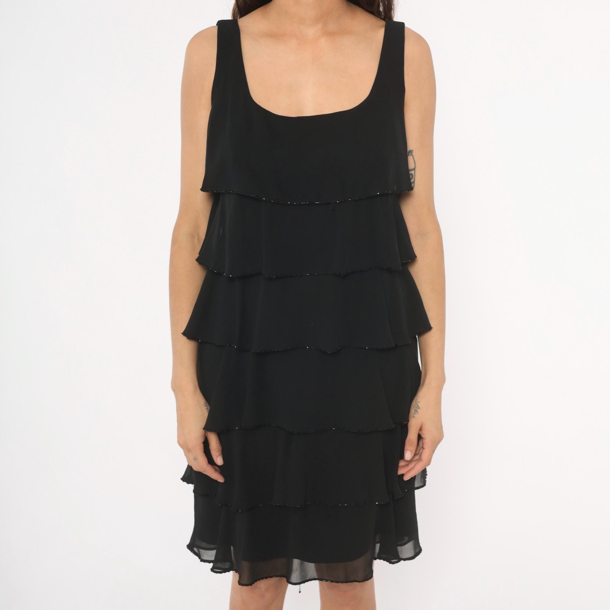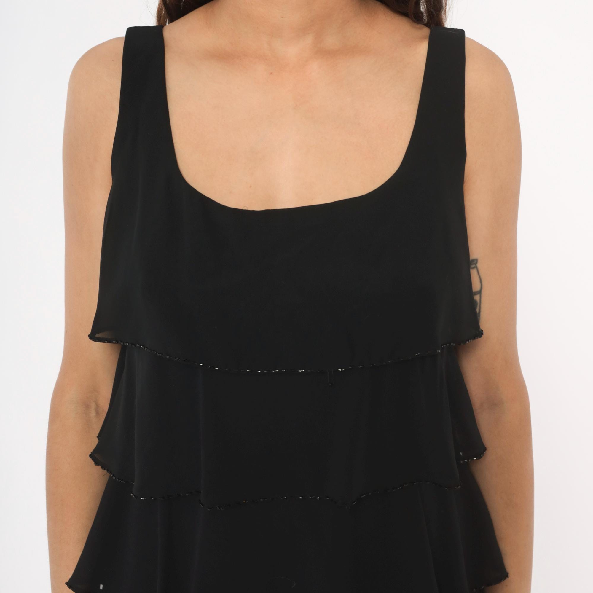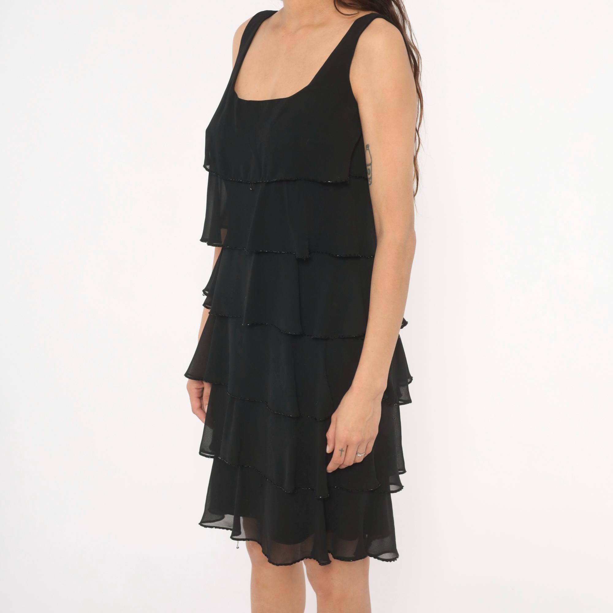 90s black tiered ruffle dress from Patra with multiple layered chiffon tiers from bust to hem, each edged with beaded trim. Sleeveless cut with wide tank straps and a scoop neckline on both front and back. Back zipper closure, knee-length hem with sheer chiffon at the bottom tier.