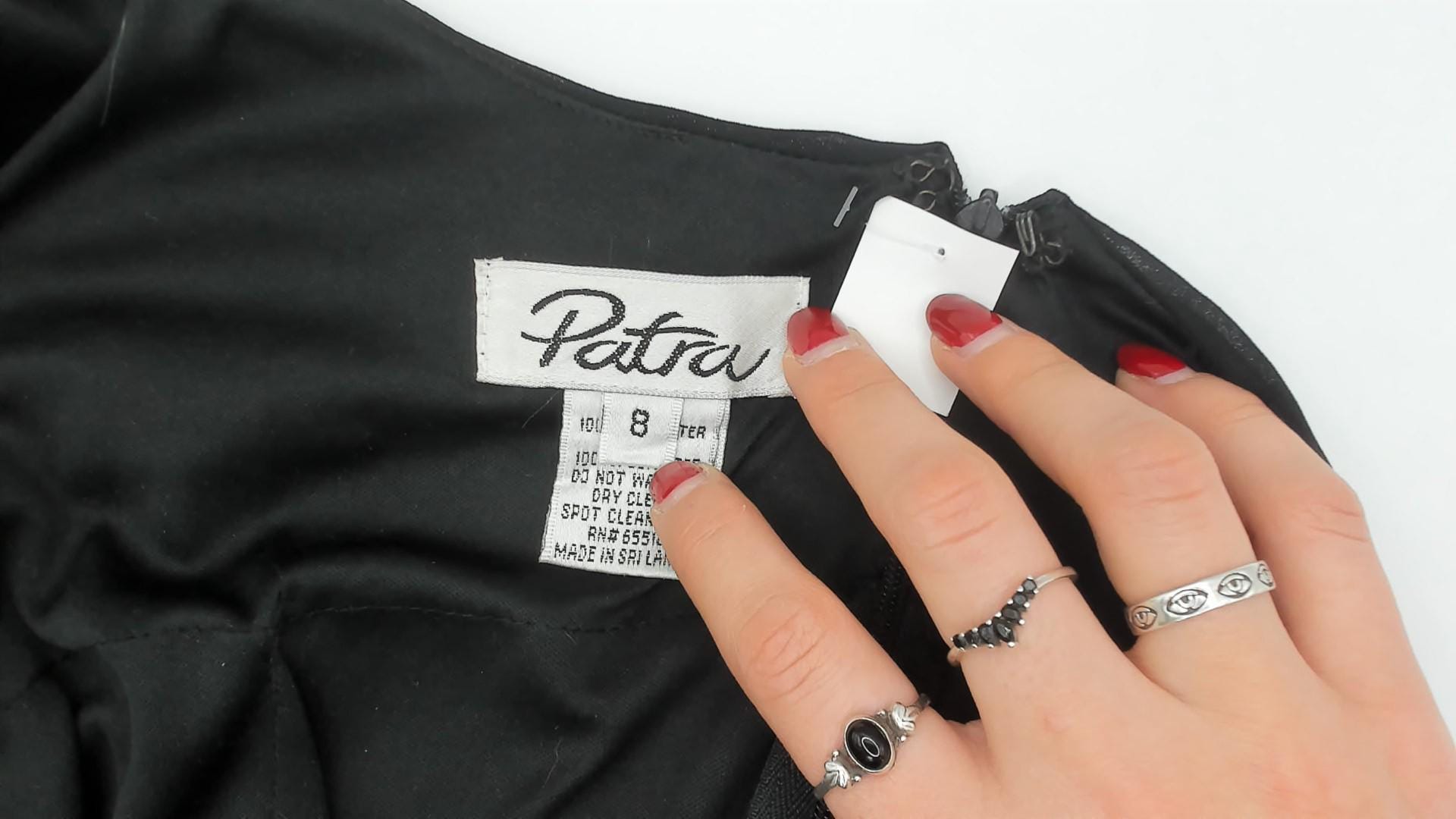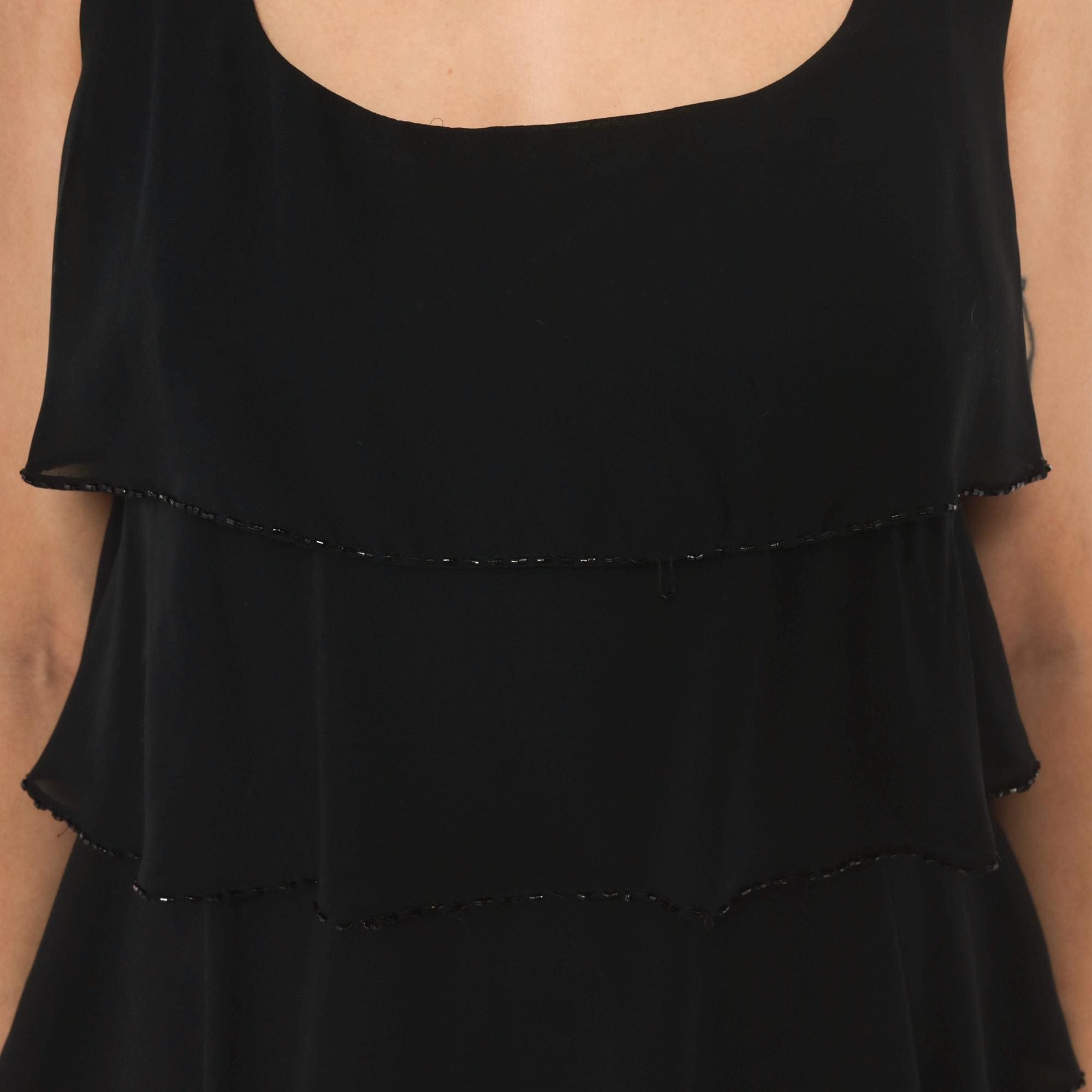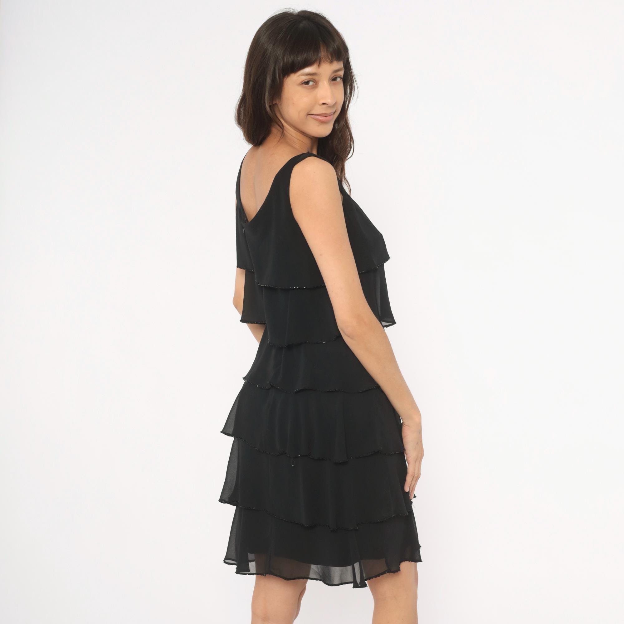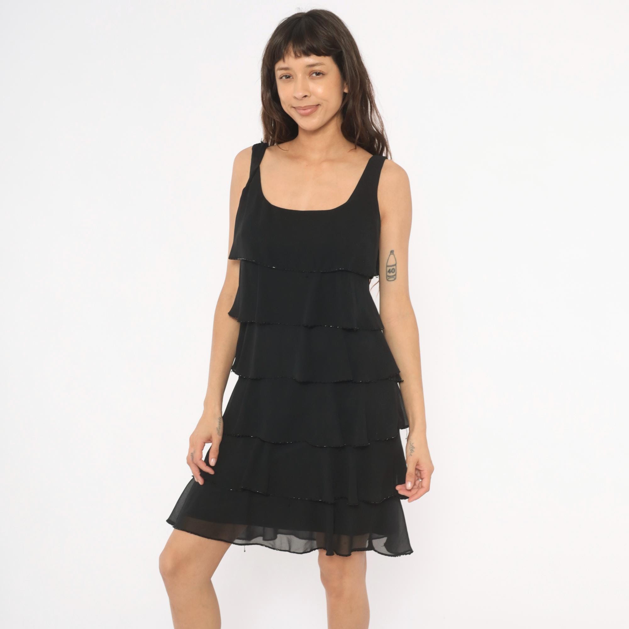 90s black tiered ruffle dress from Patra with multiple layered chiffon tiers from bust to hem, each edged with beaded trim. Sleeveless cut with wide tank straps and a scoop neckline on both front and back. Back zipper closure, knee-length hem with sheer chiffon at the bottom tier.