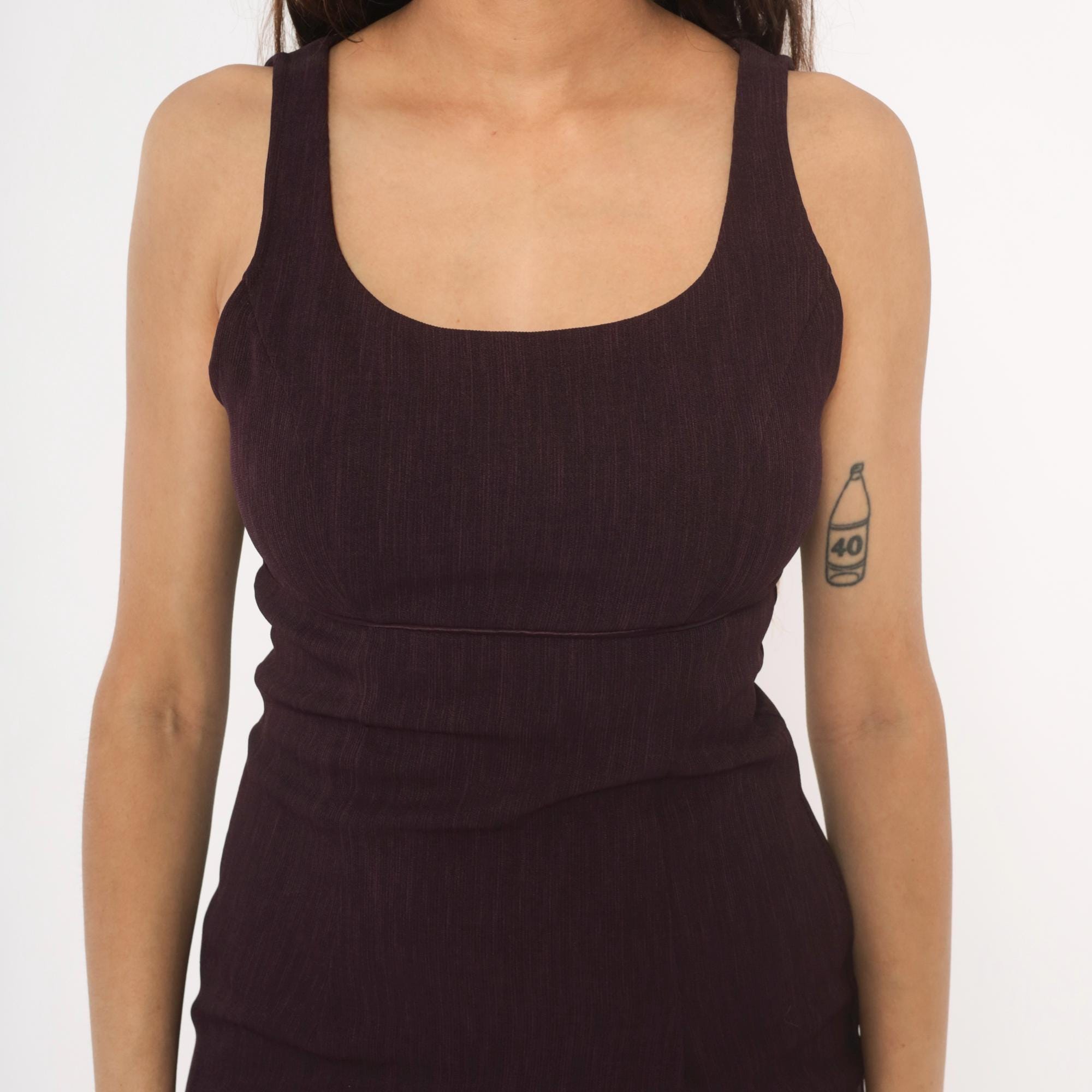 90s plum mini dress from City Triangles with a wide scoop neckline and thick tank-style straps. Fitted bodice with an empire seam at the underbust and a straight, body-skimming skirt with a small side slit at the hem. Dark purple fabric with a subtle vertical texture throughout.