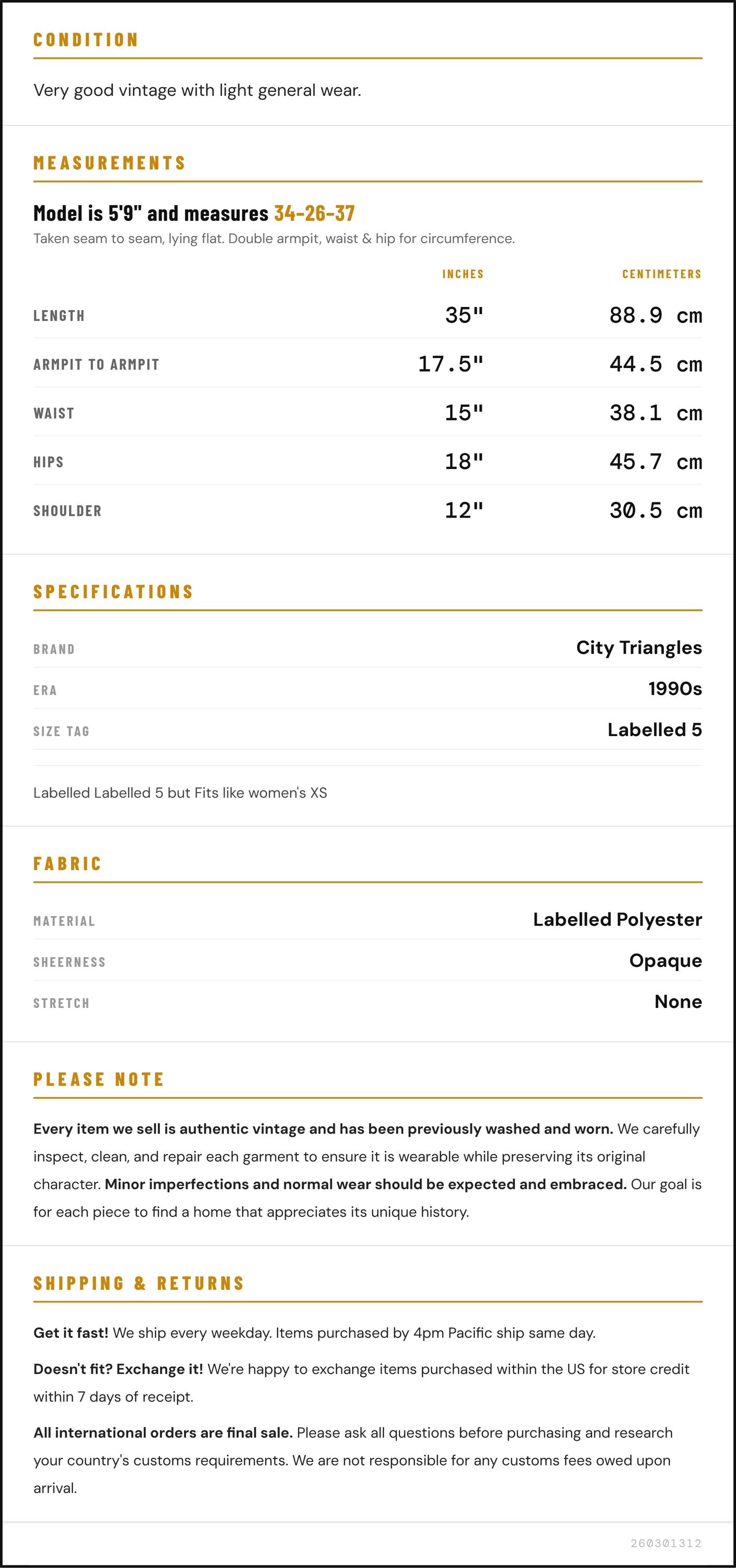 Taken from seam to seam while the garment is lying flat. Double the armpit, waist, and hip measurements.