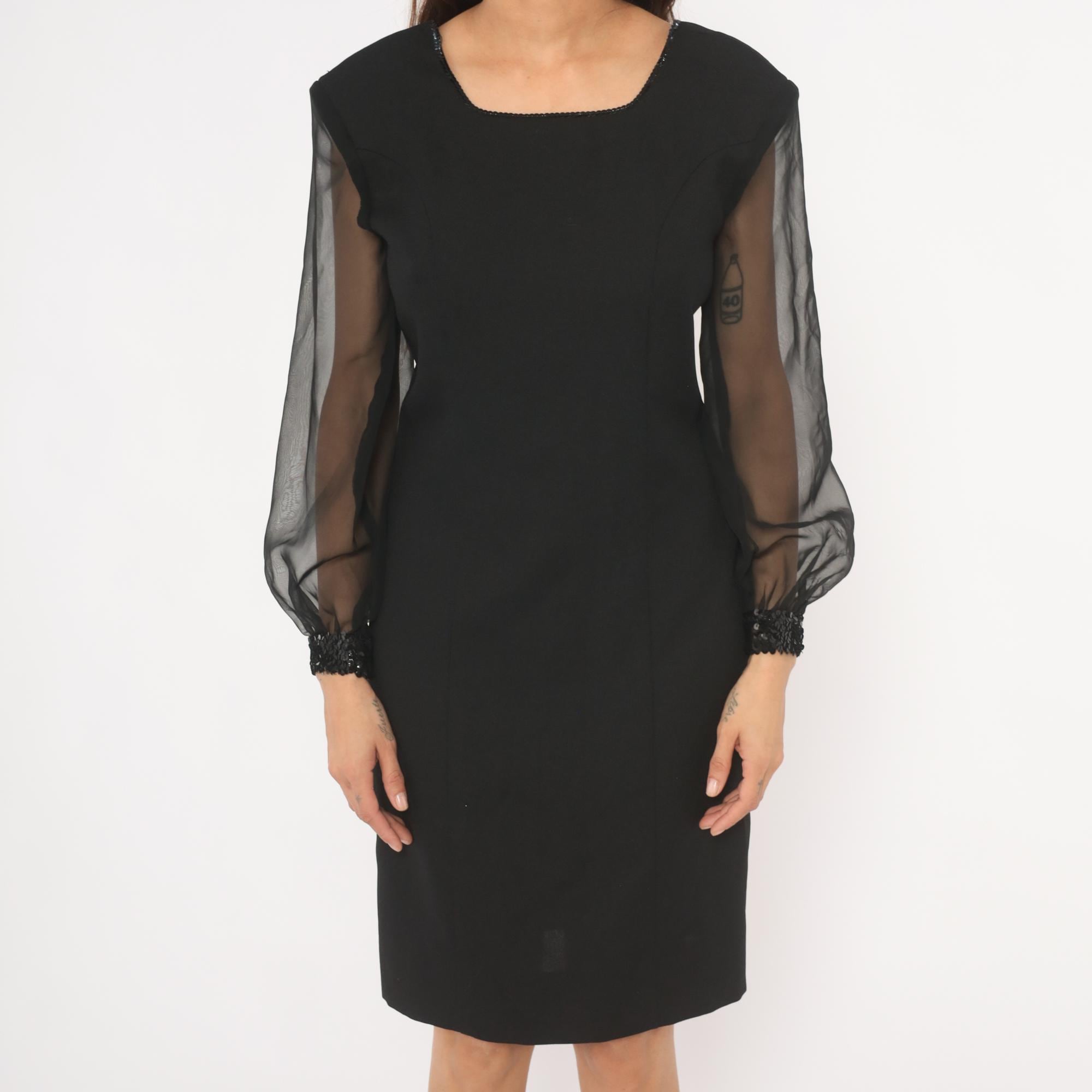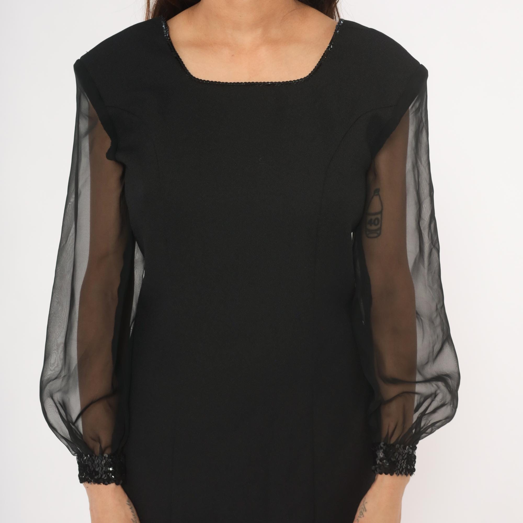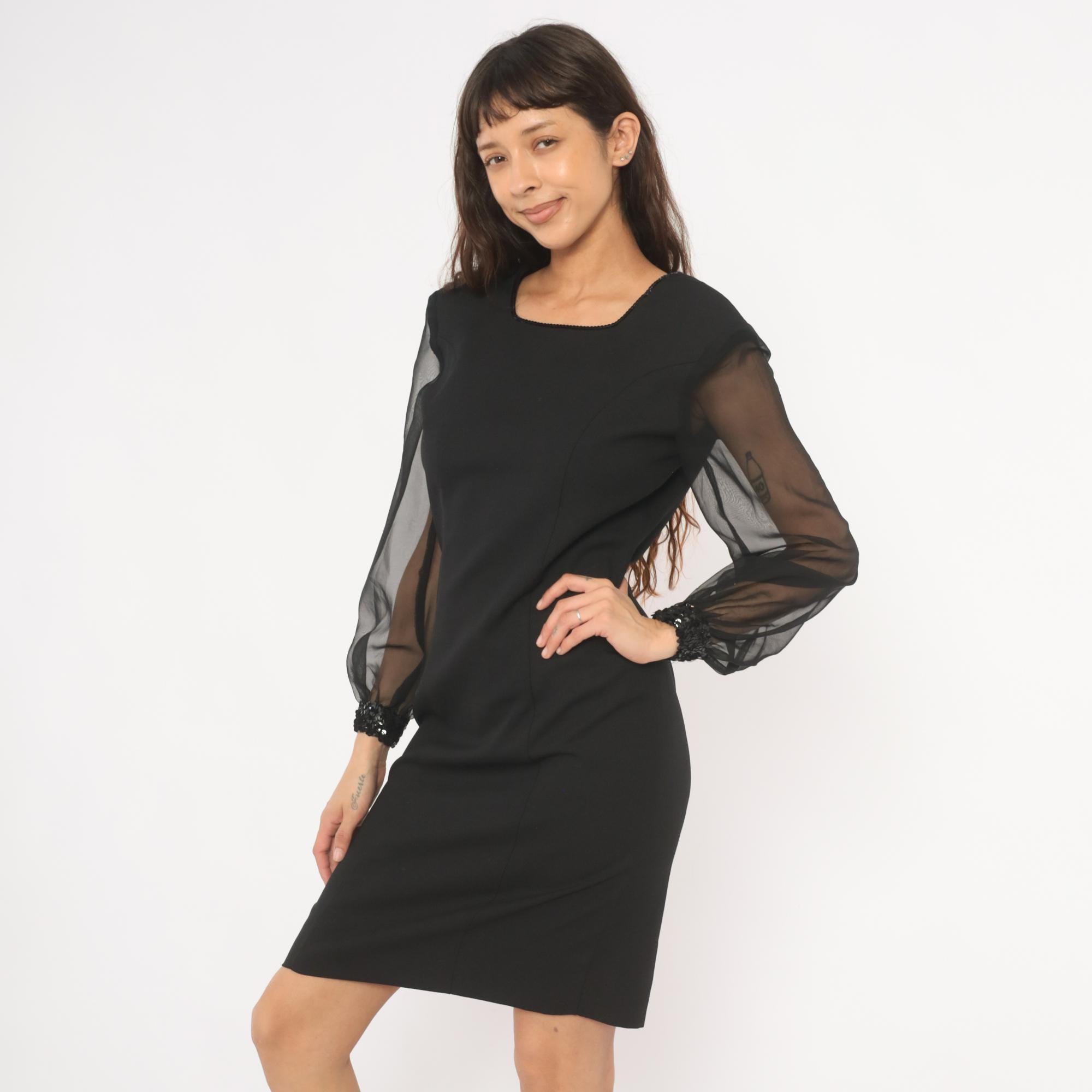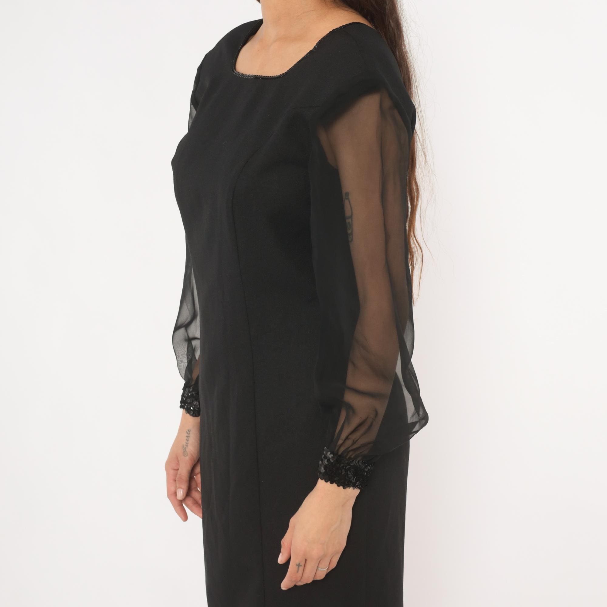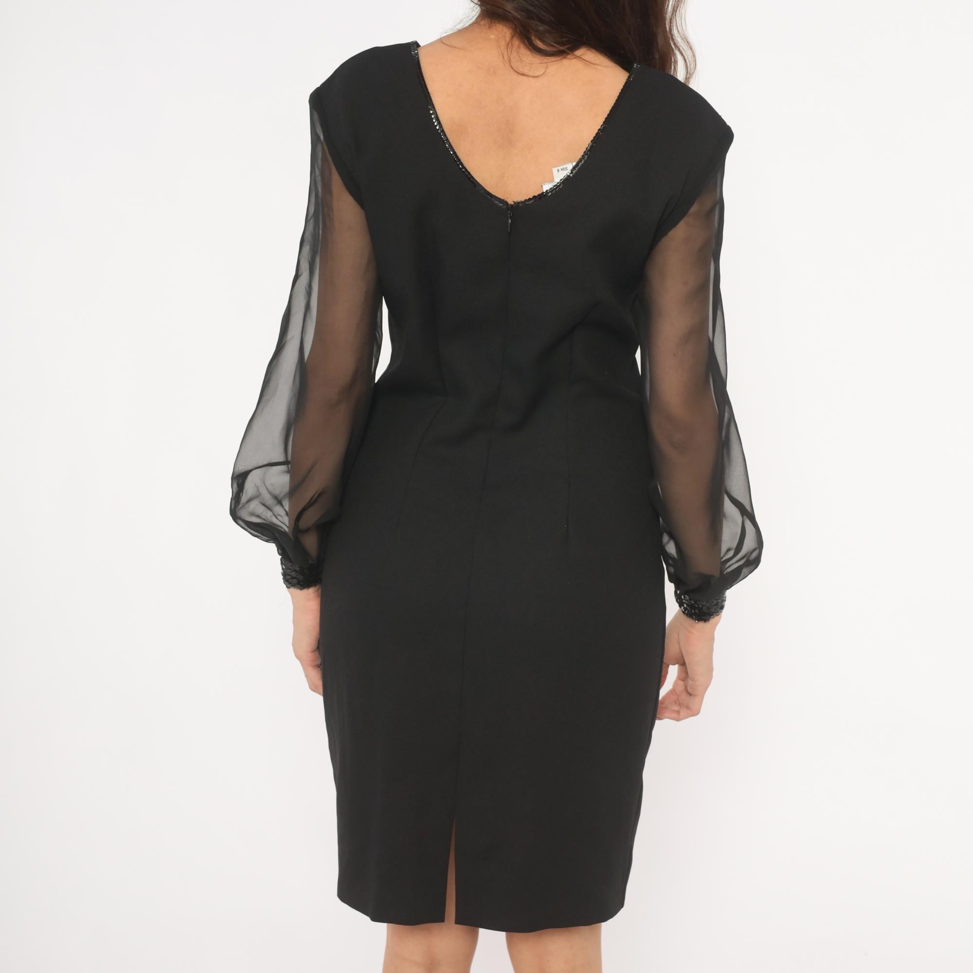 80s black pencil dress from Caron Petite with sheer organza bishop sleeves and sequin-beaded cuffs. Square neckline trimmed with beaded detail, fitted bodice with darted construction, and a straight skirt with back slit.