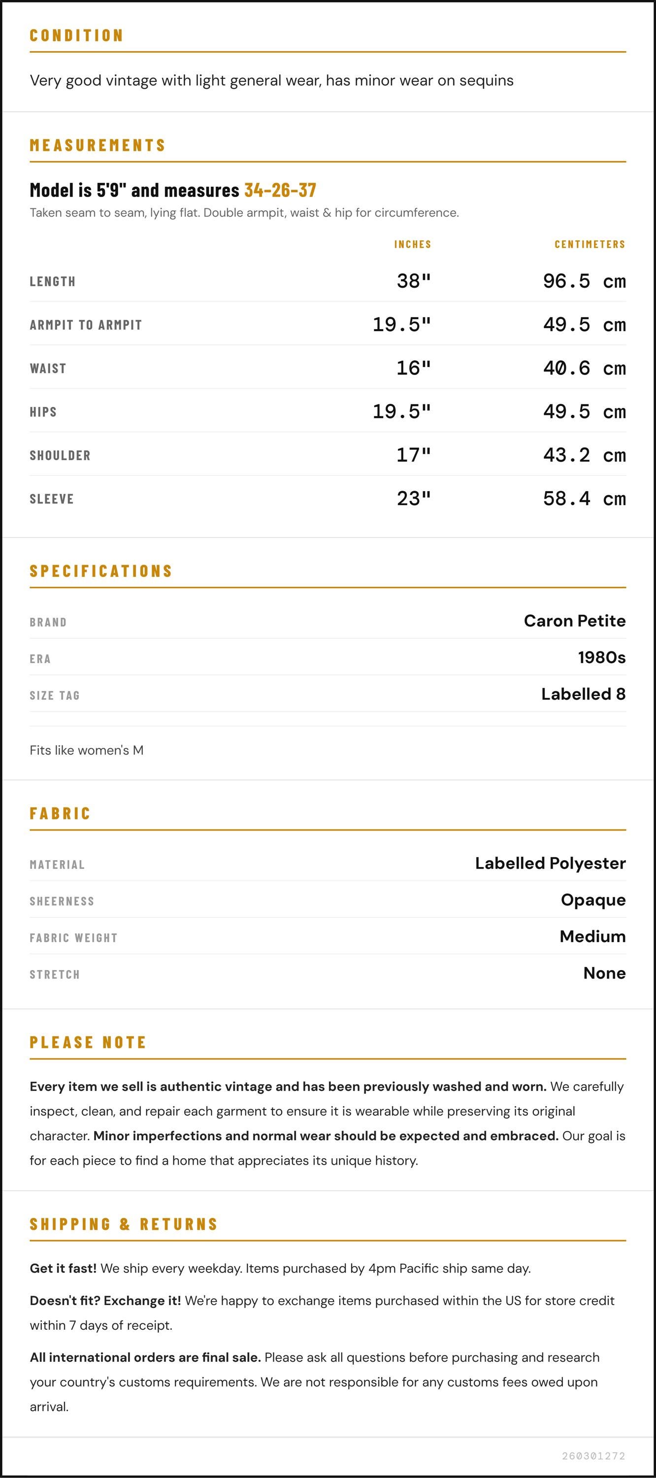 Condition: Very good vintage with light general wear, has minor wear on sequins