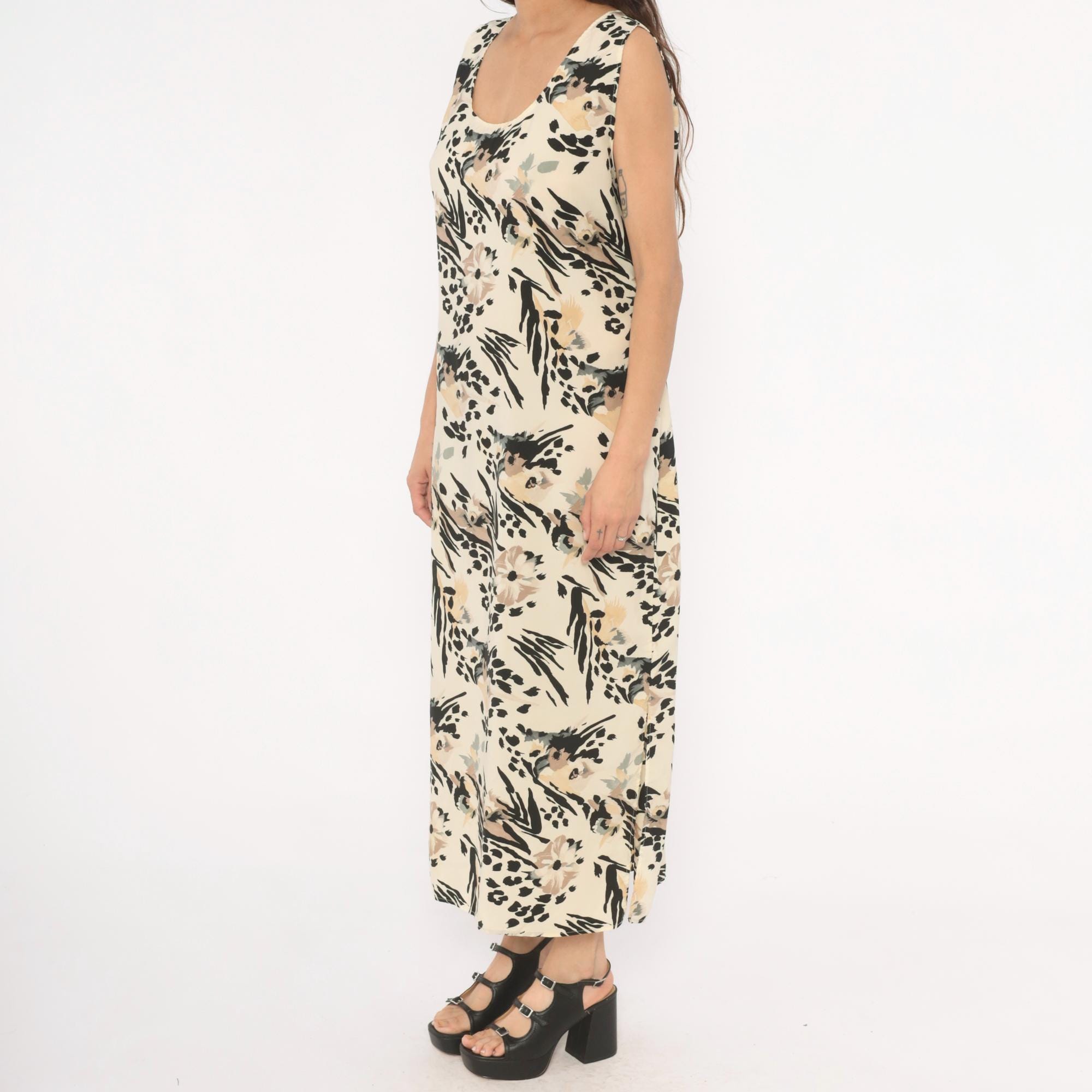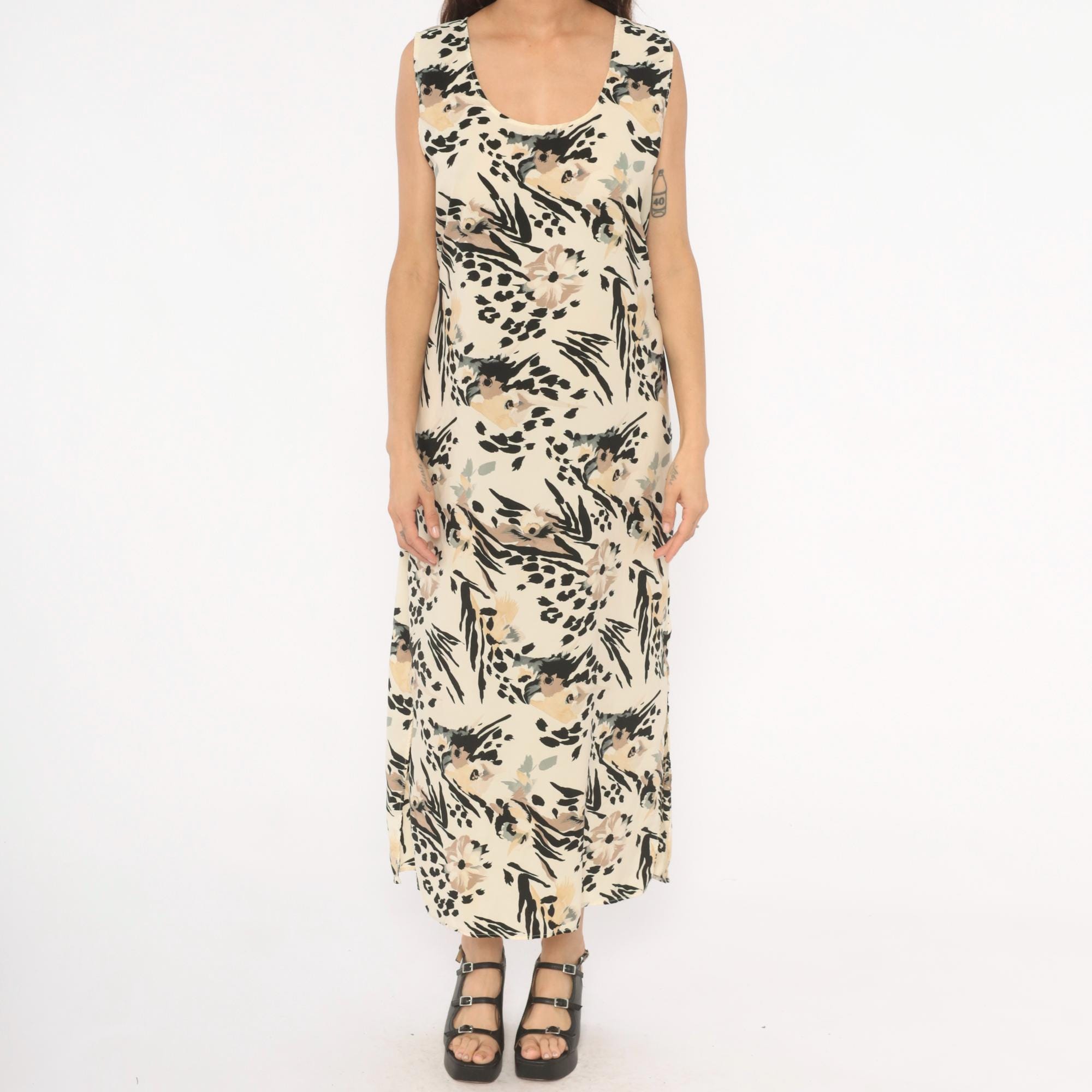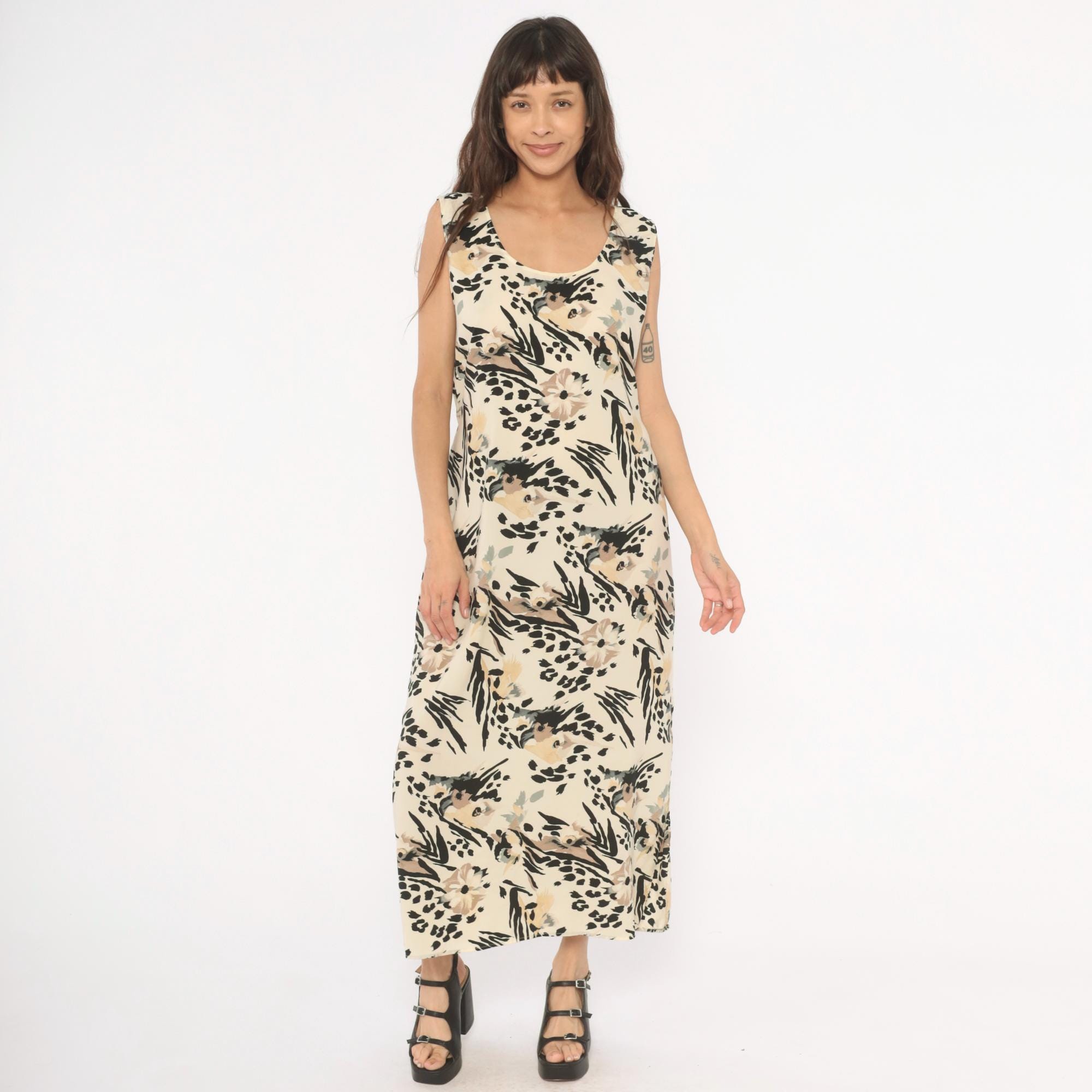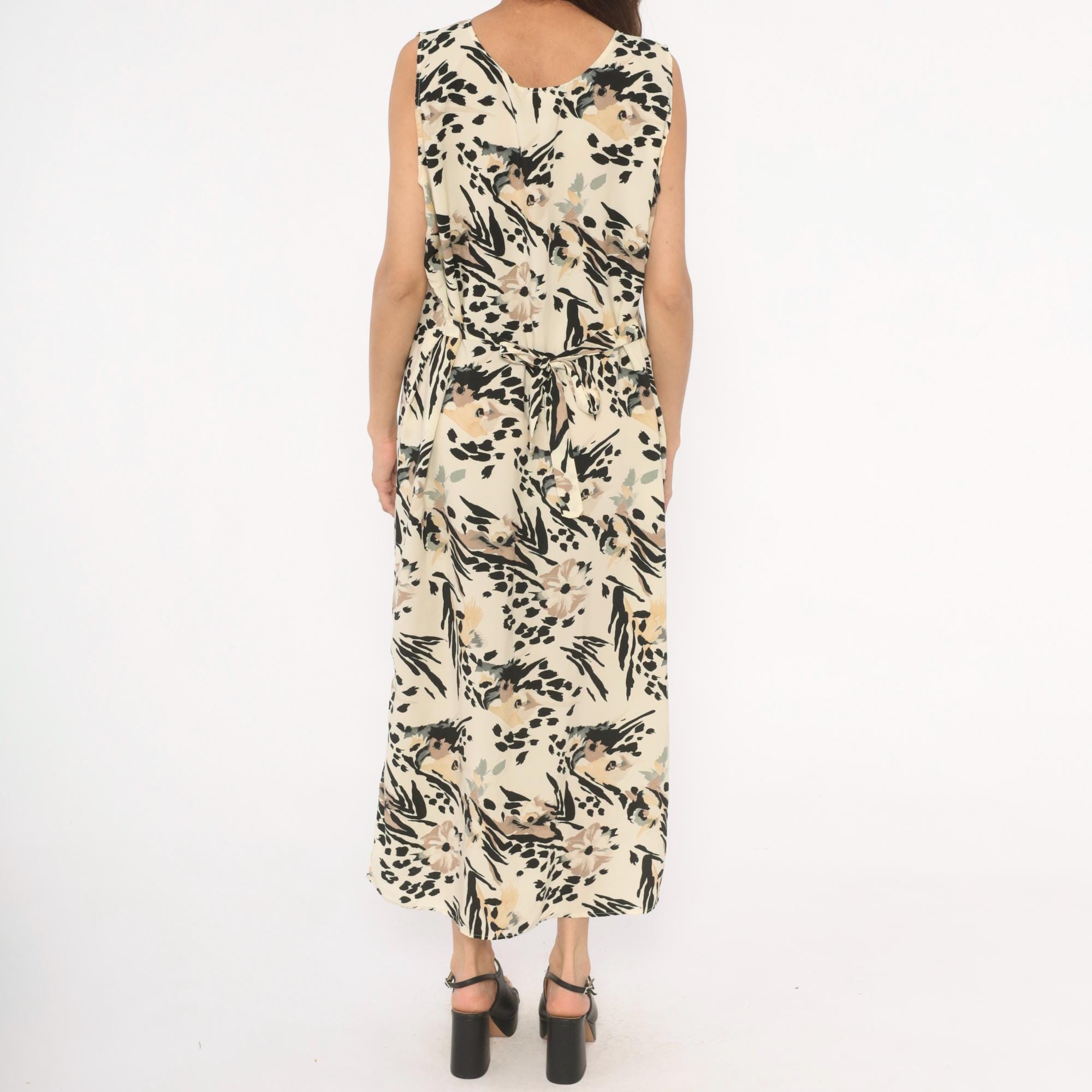 90s cream and black maxi dress from Ann Mali with an abstract animal print pattern combining leopard spots, zebra-like brush strokes, and floral motifs in tan, taupe, and sage green tones. Sleeveless shift silhouette with a scoop neckline and pullover construction. Tie closure at the center back waist, semi-sheer body throughout.
