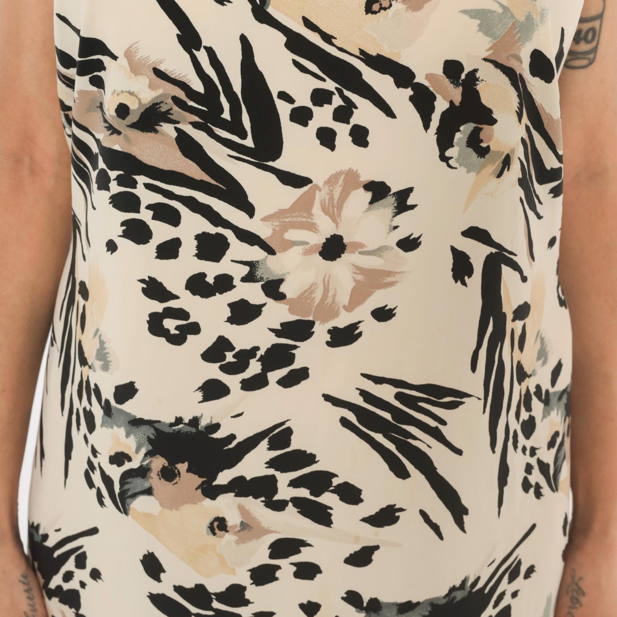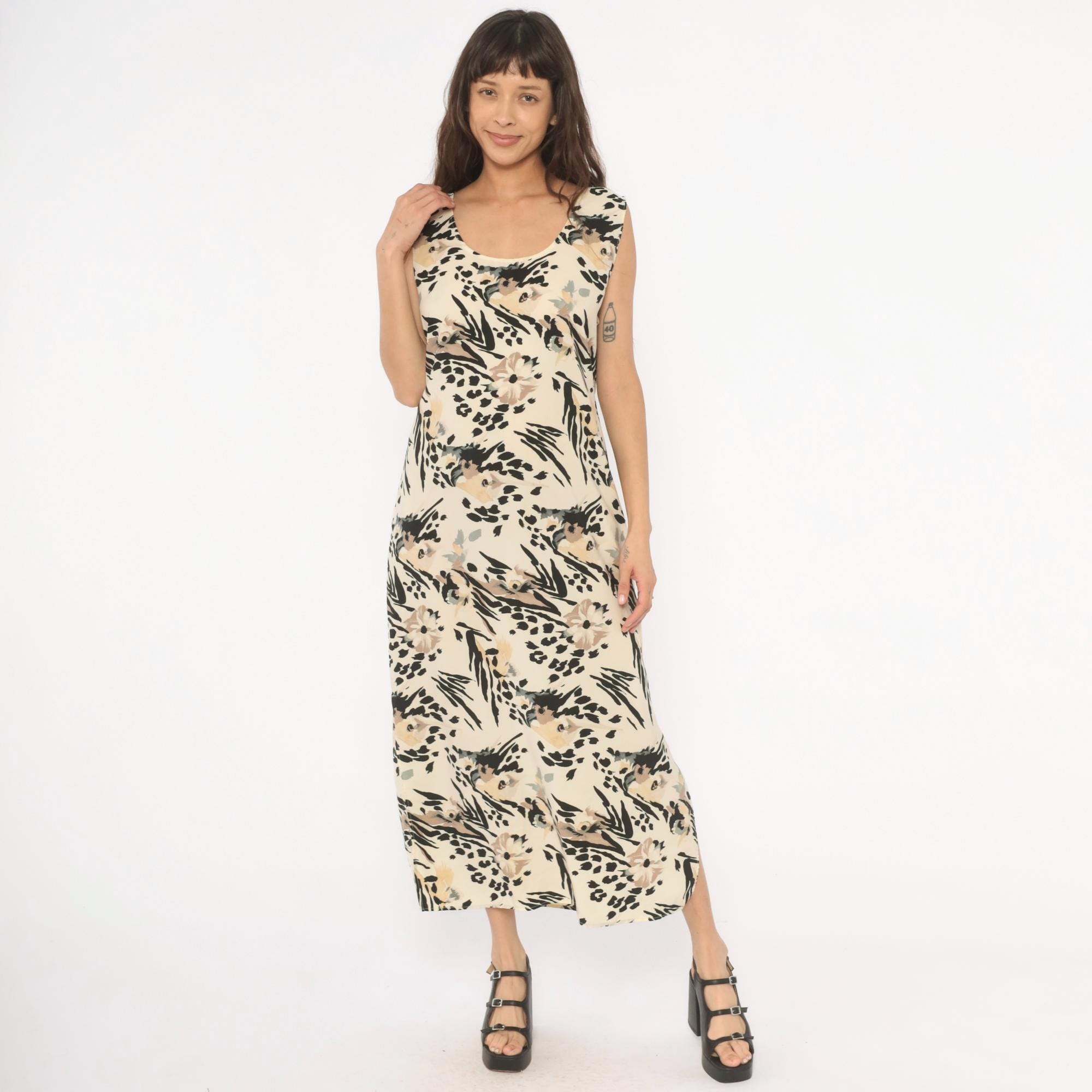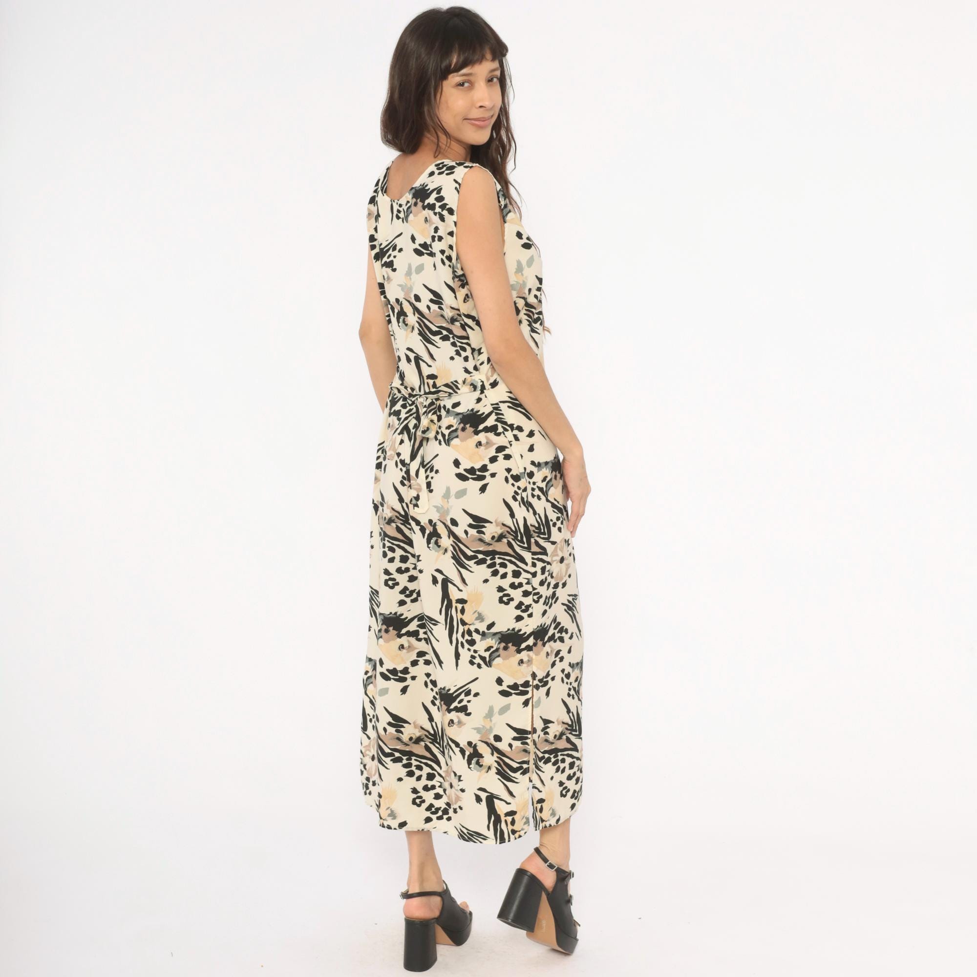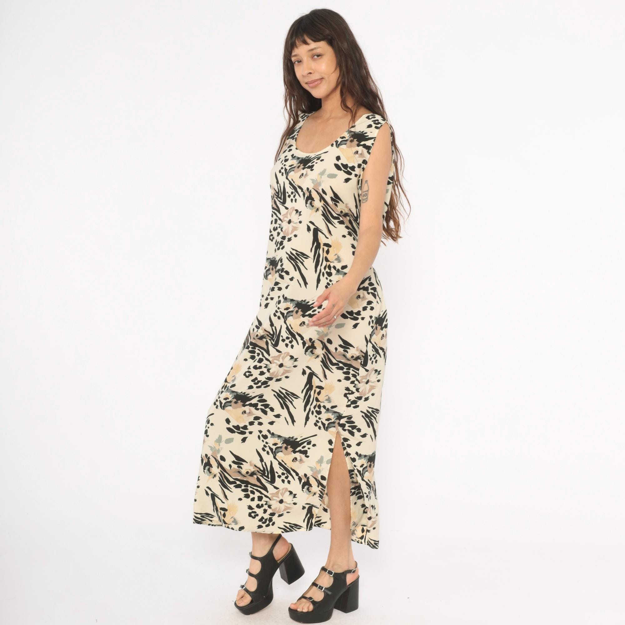 90s cream and black maxi dress from Ann Mali with an abstract animal print pattern combining leopard spots, zebra-like brush strokes, and floral motifs in tan, taupe, and sage green tones. Sleeveless shift silhouette with a scoop neckline and pullover construction. Tie closure at the center back waist, semi-sheer body throughout.