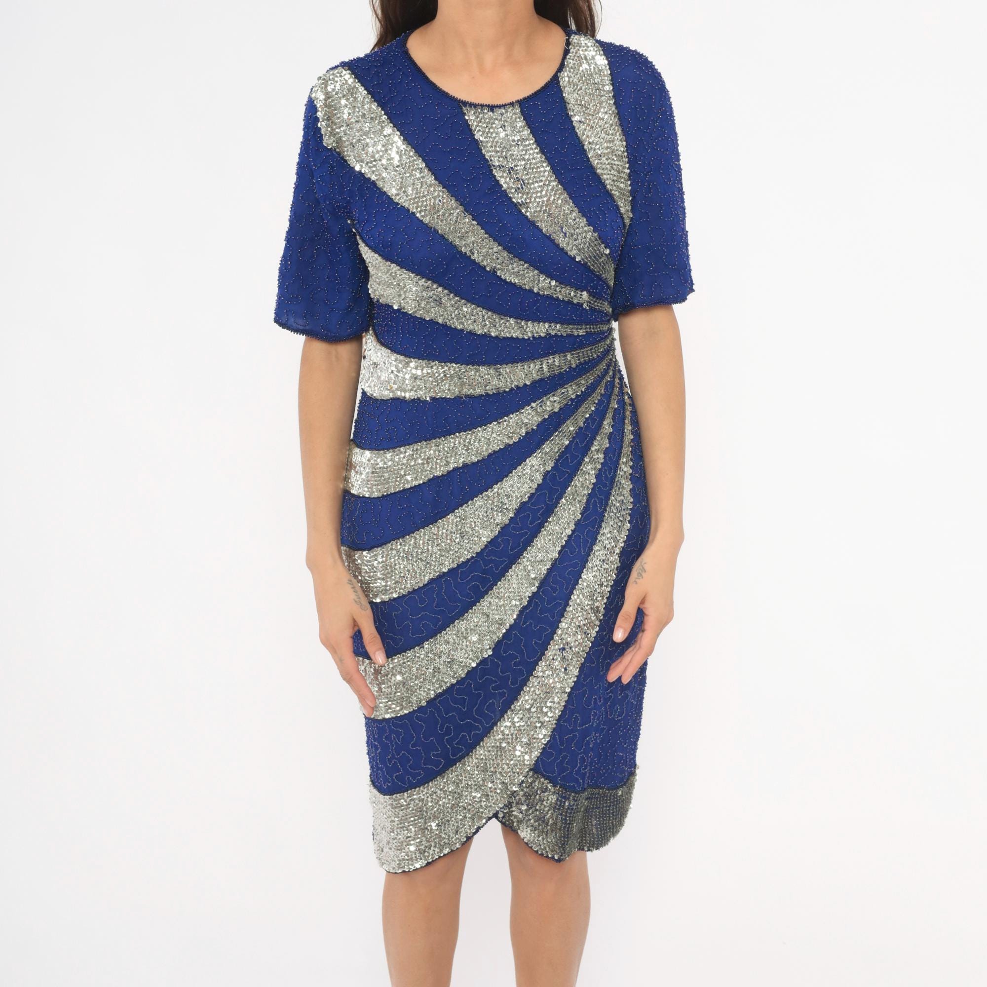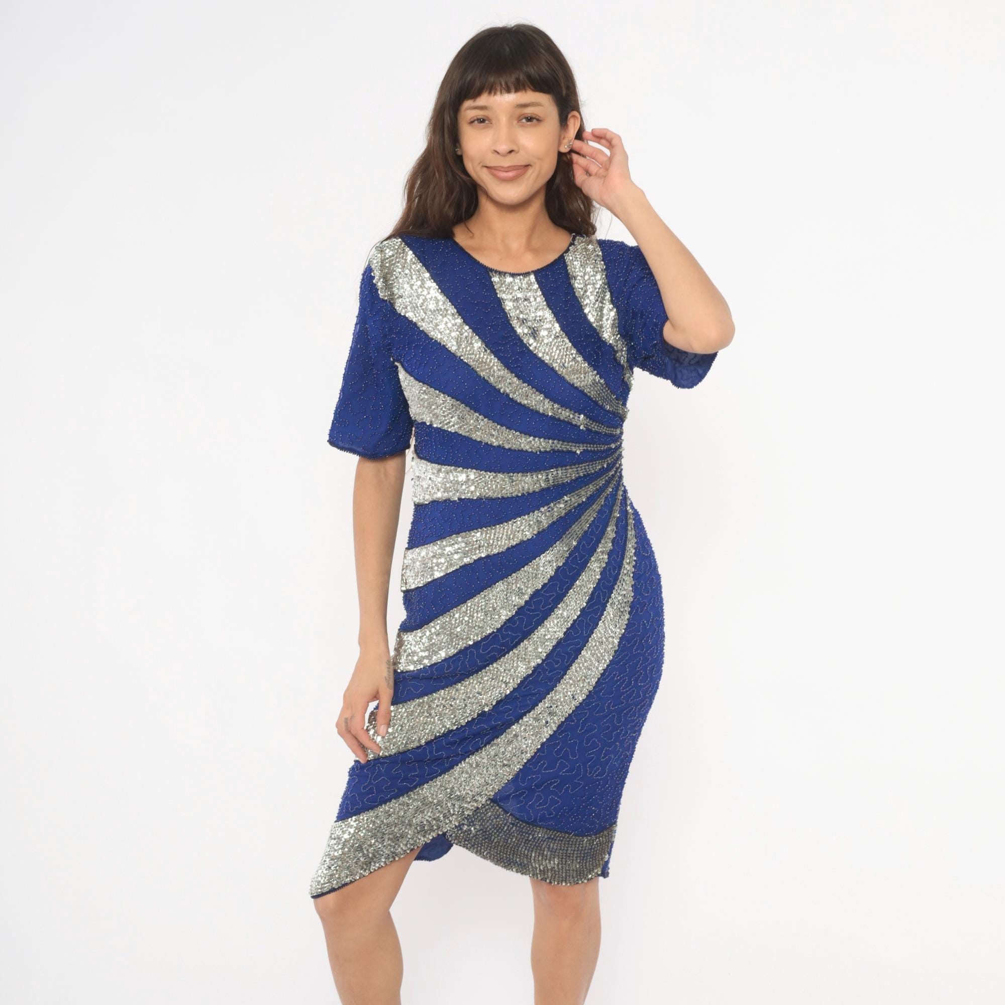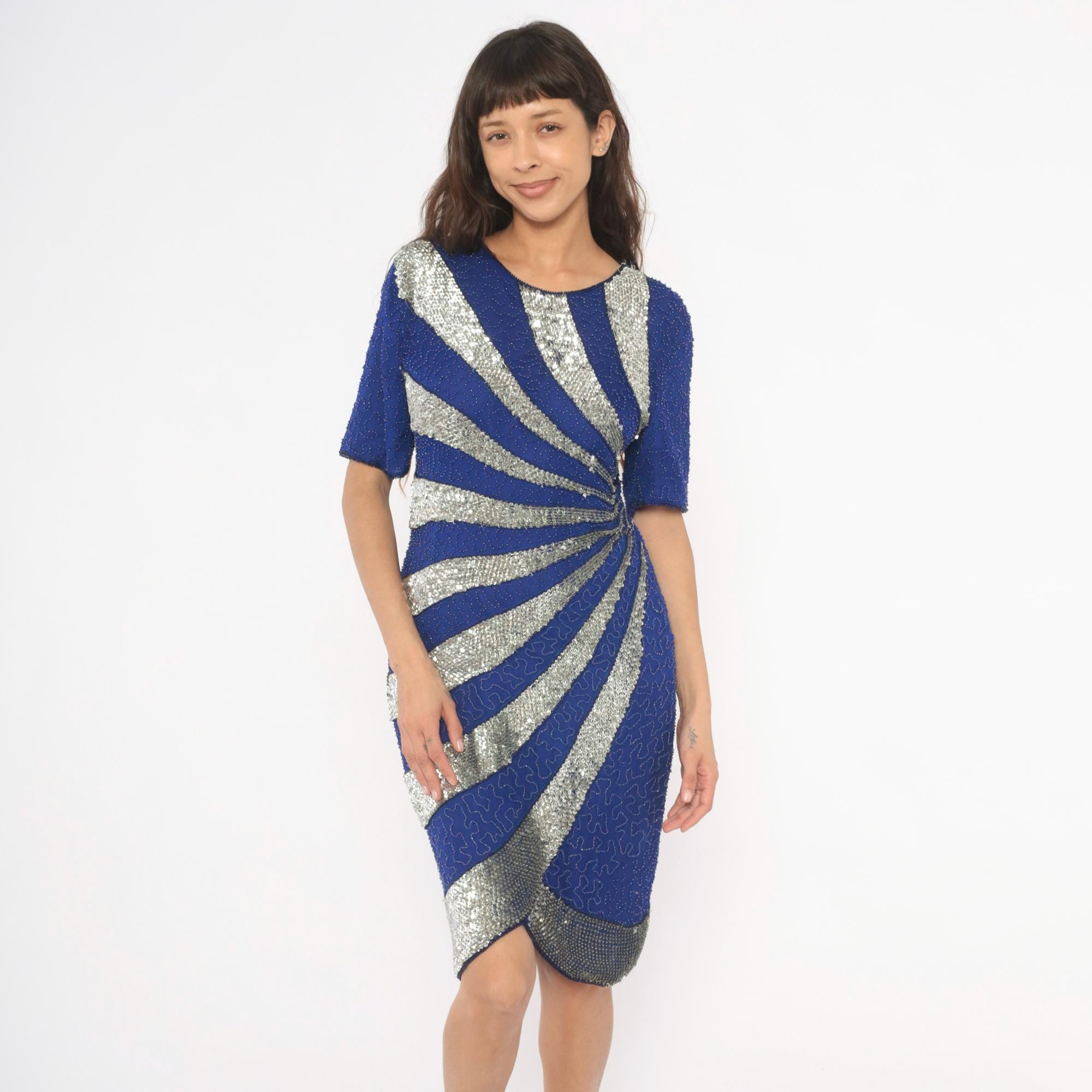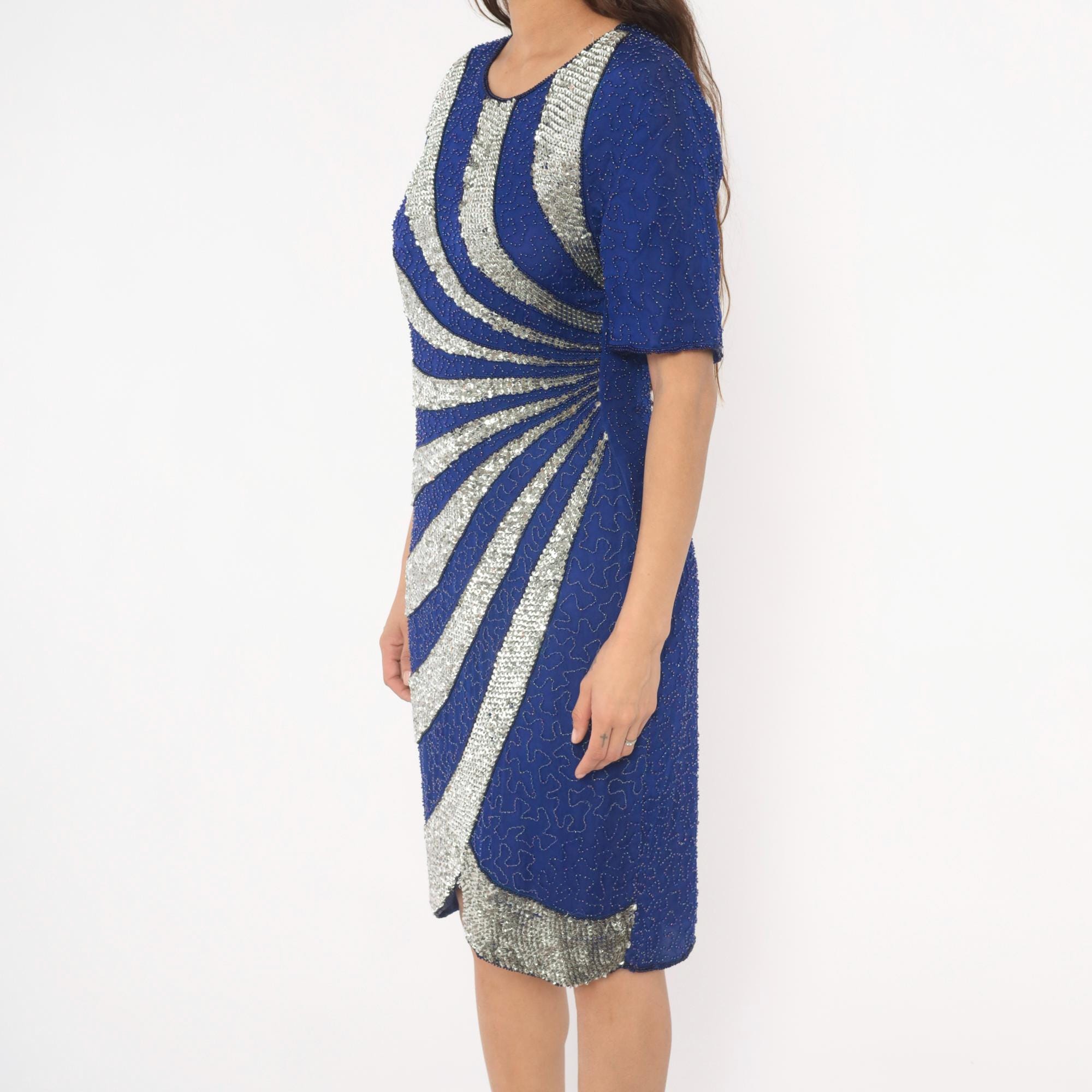 80s cobalt and silver sequin dress from Stenay with a sunburst stripe pattern radiating from the left hip across the front bodice. Alternating royal blue and silver sequined panels with allover beadwork in a puzzle-like pattern on the blue sections. Scoop neckline, short sleeves with beaded trim at the cuffs, and a fitted sheath silhouette. Back keyhole cutout with hook and eye closure above a full-length back zipper, and a short slit at the hem.