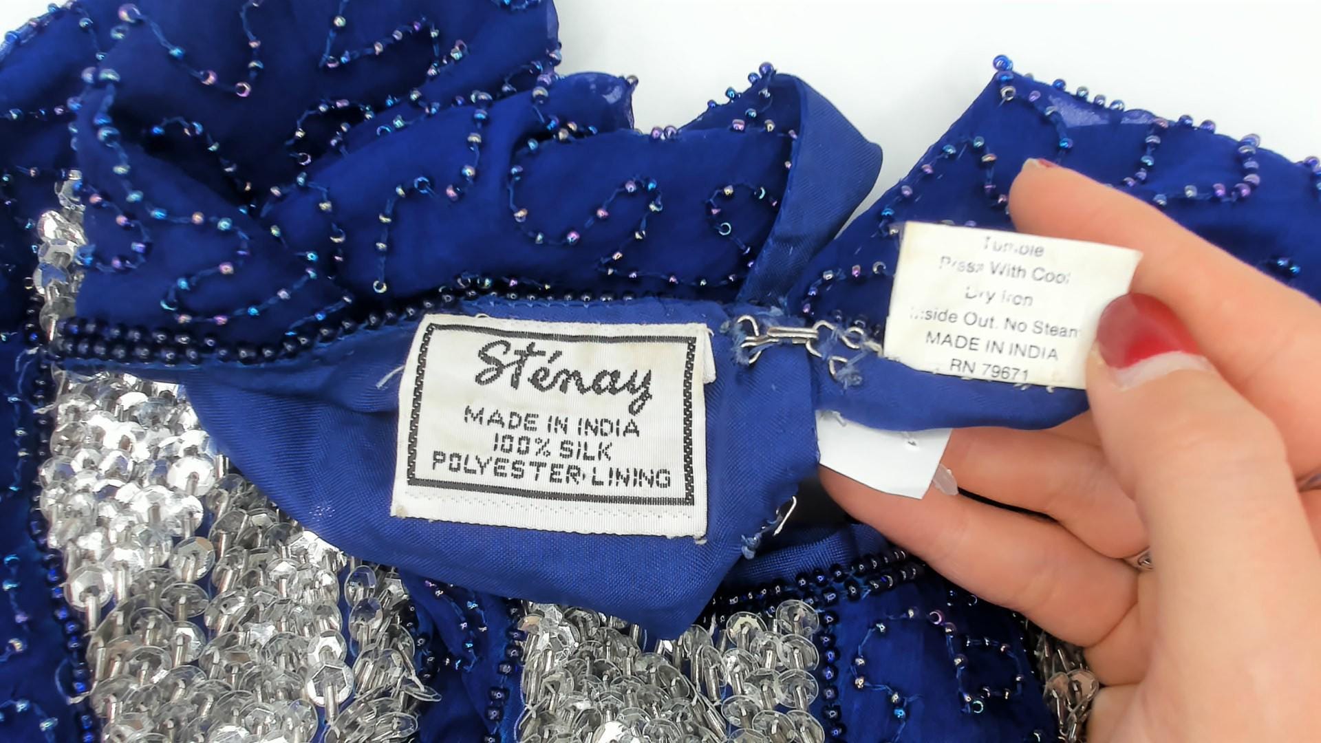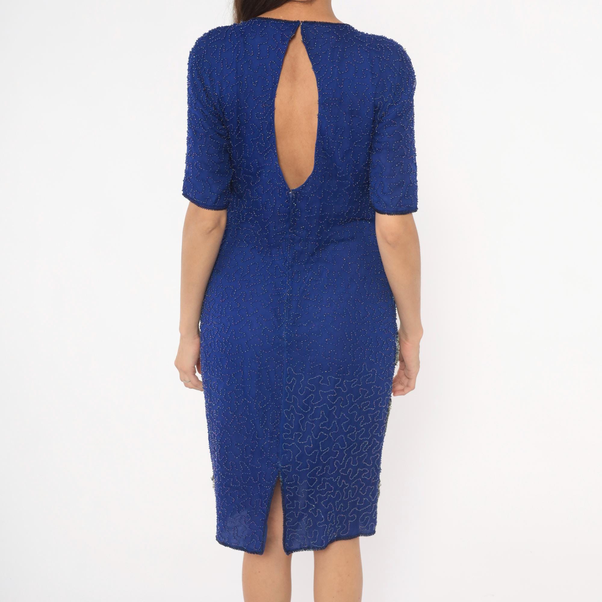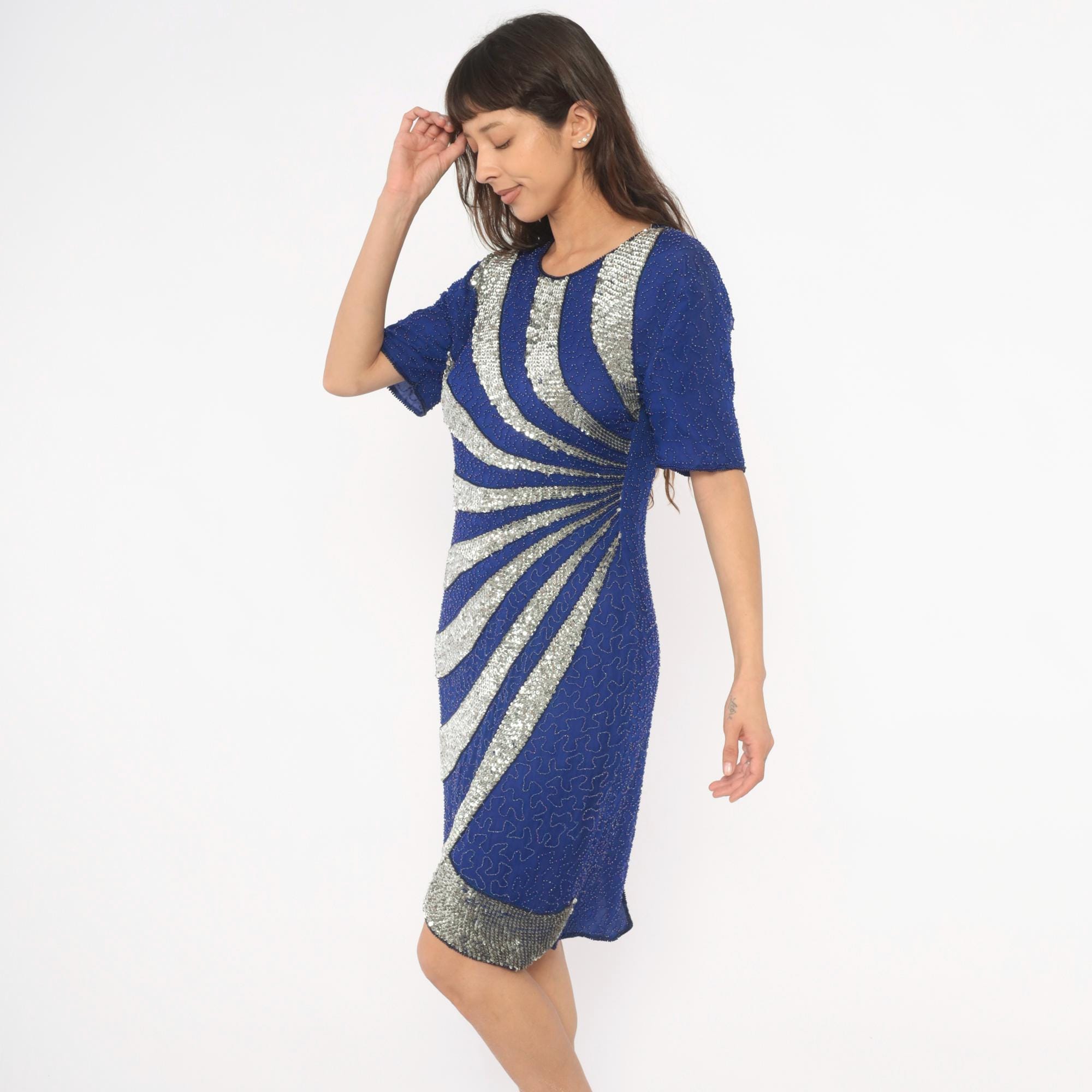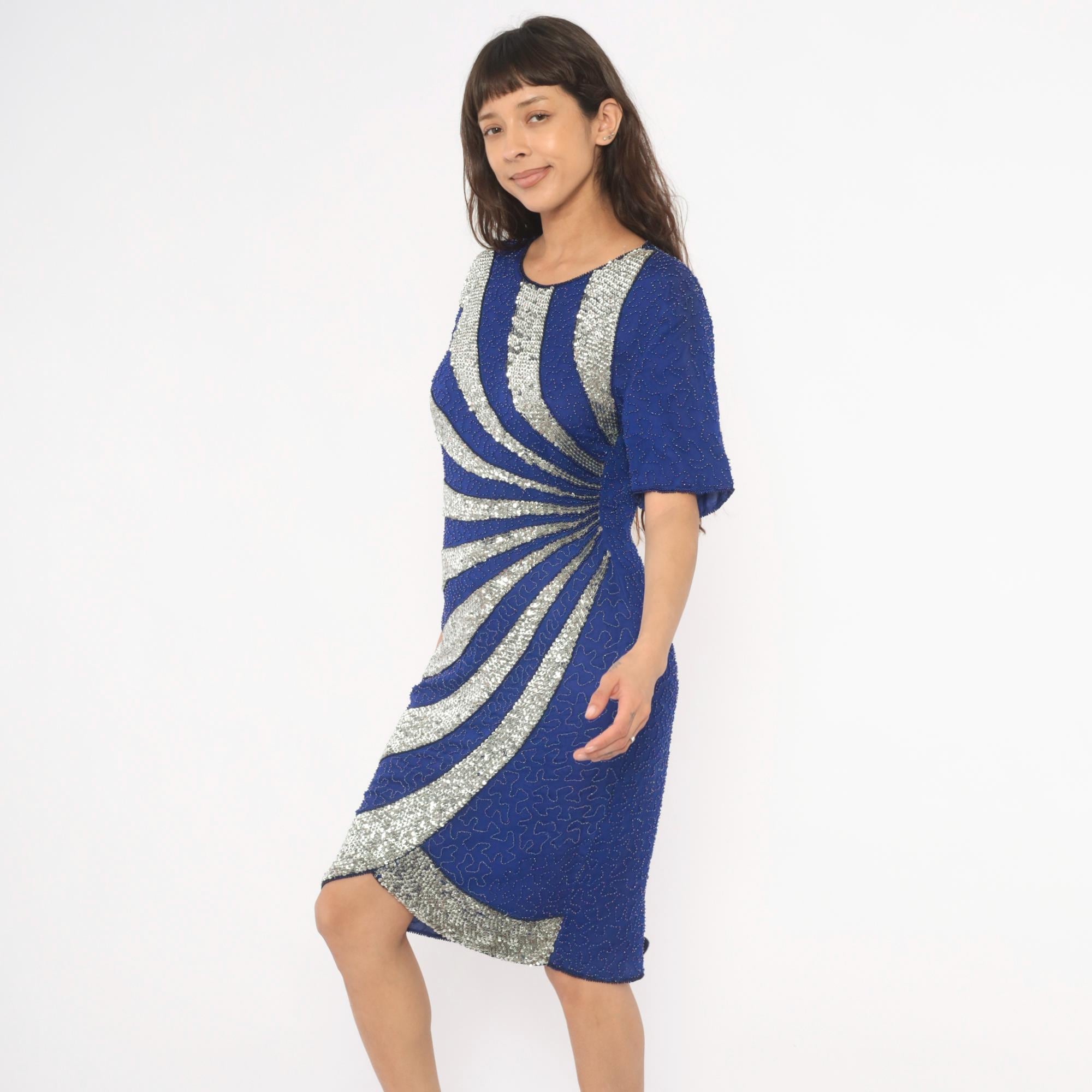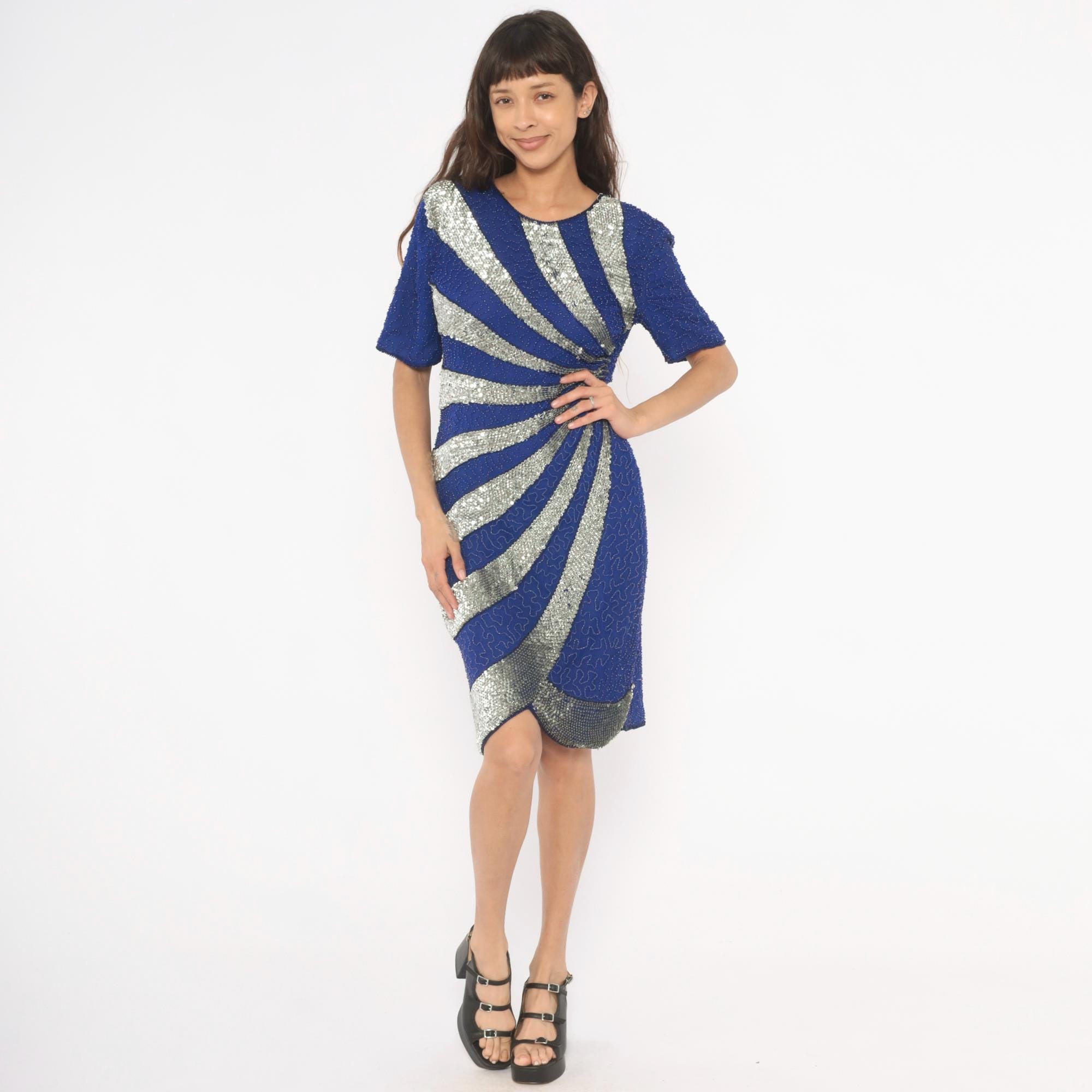 80s cobalt and silver sequin dress from Stenay with a sunburst stripe pattern radiating from the left hip across the front bodice. Alternating royal blue and silver sequined panels with allover beadwork in a puzzle-like pattern on the blue sections. Scoop neckline, short sleeves with beaded trim at the cuffs, and a fitted sheath silhouette. Back keyhole cutout with hook and eye closure above a full-length back zipper, and a short slit at the hem.