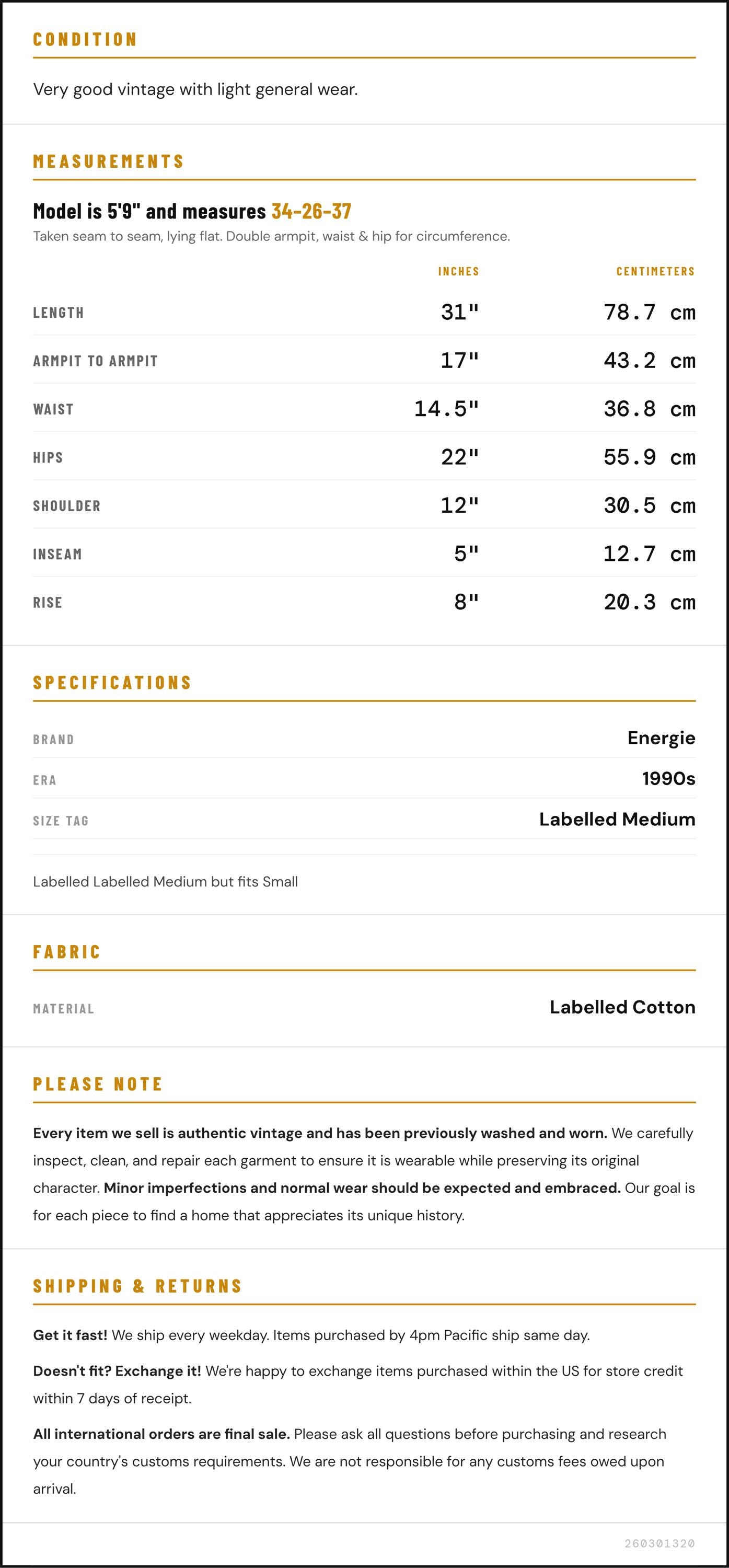 Vintage denim was usually made without any stretch, unlike modern jeans. Check the measurements to ensure proper fit, and remember to give yourself a little wiggle room in the waist and hips, depending on your preferred fit.