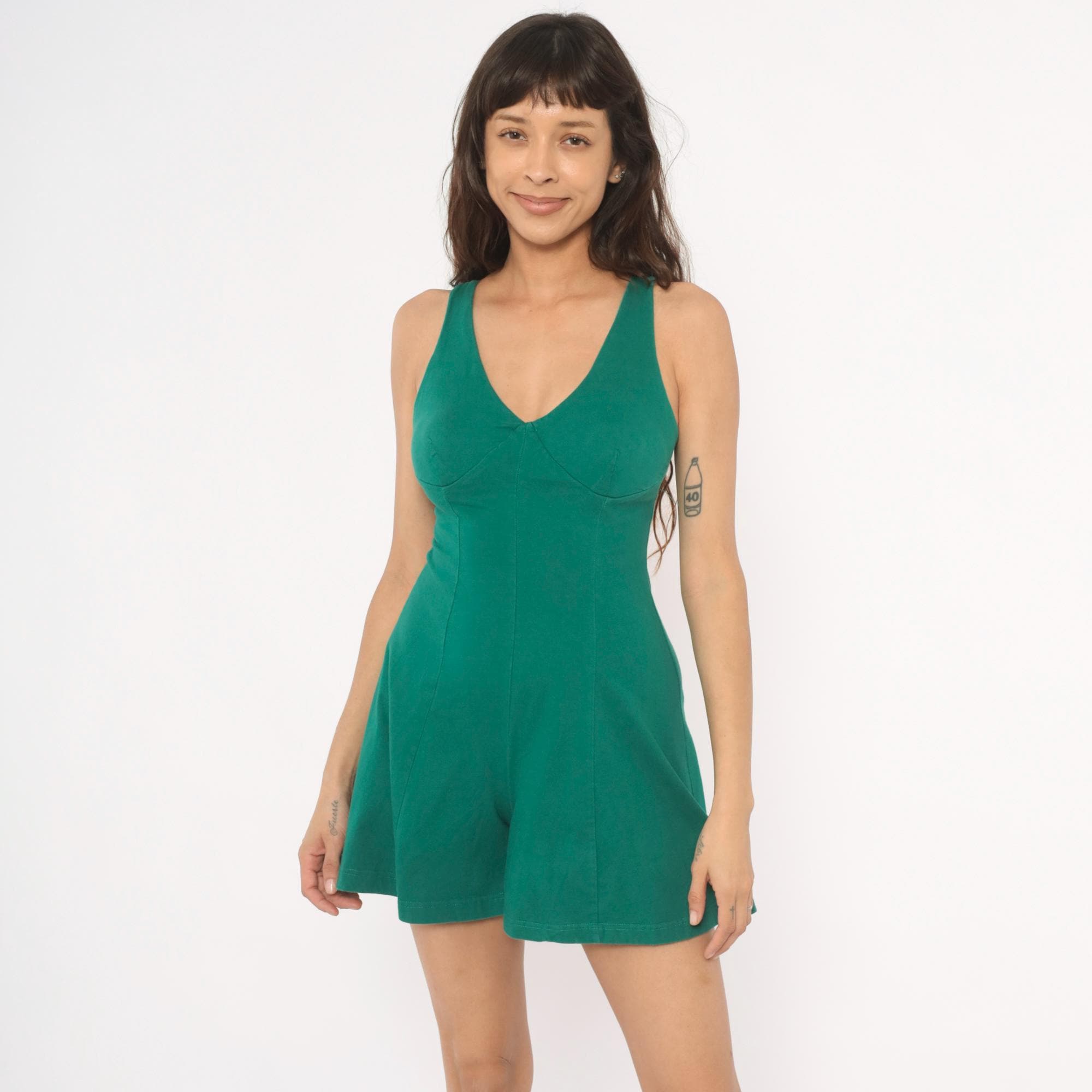 90s teal romper from Energie with a V-neckline and shaped bust seaming at the bodice. Wide tank straps transition to narrower straps at the back, with a center back zipper closure. Seamed waist and flared, wide-leg shorts with a paneled construction throughout.