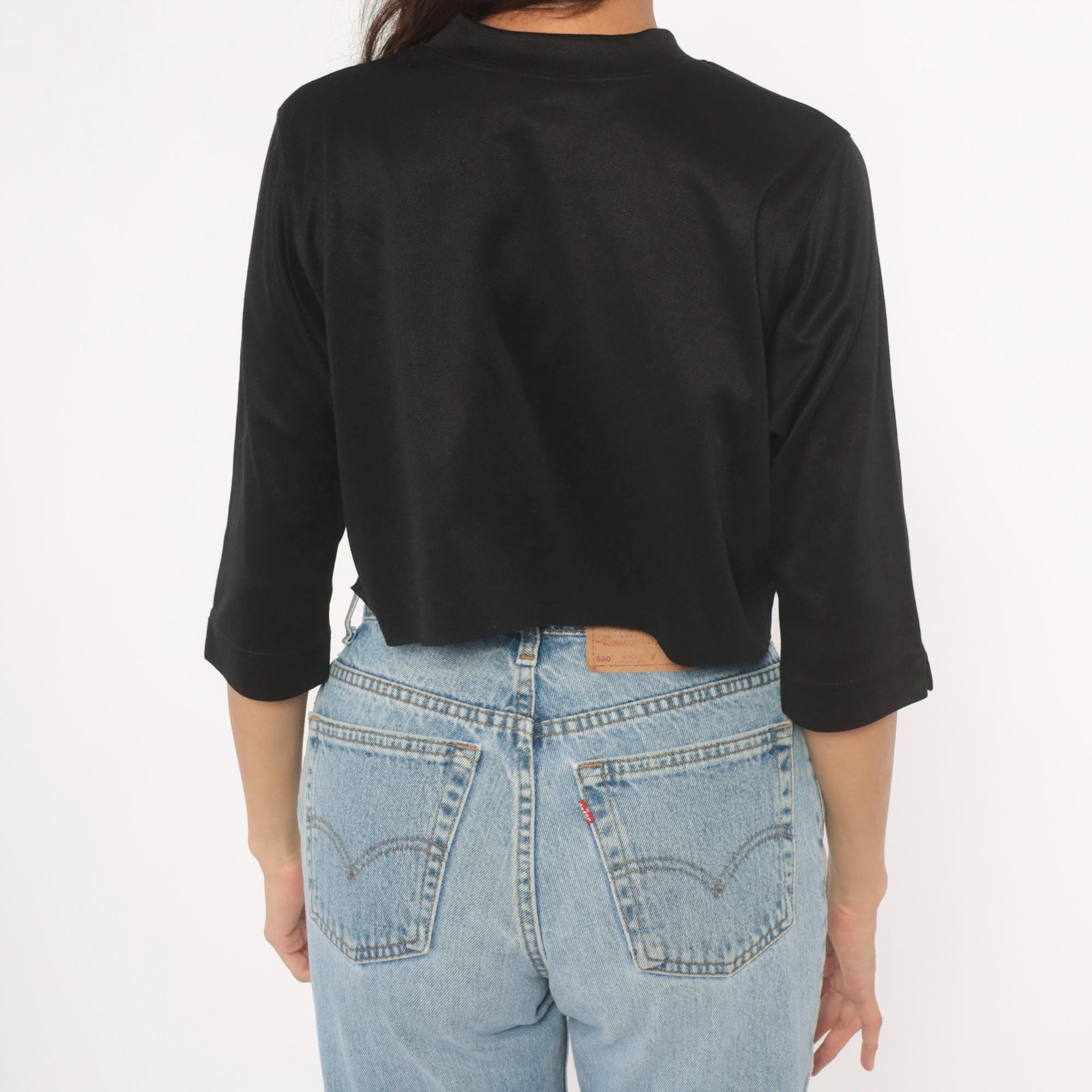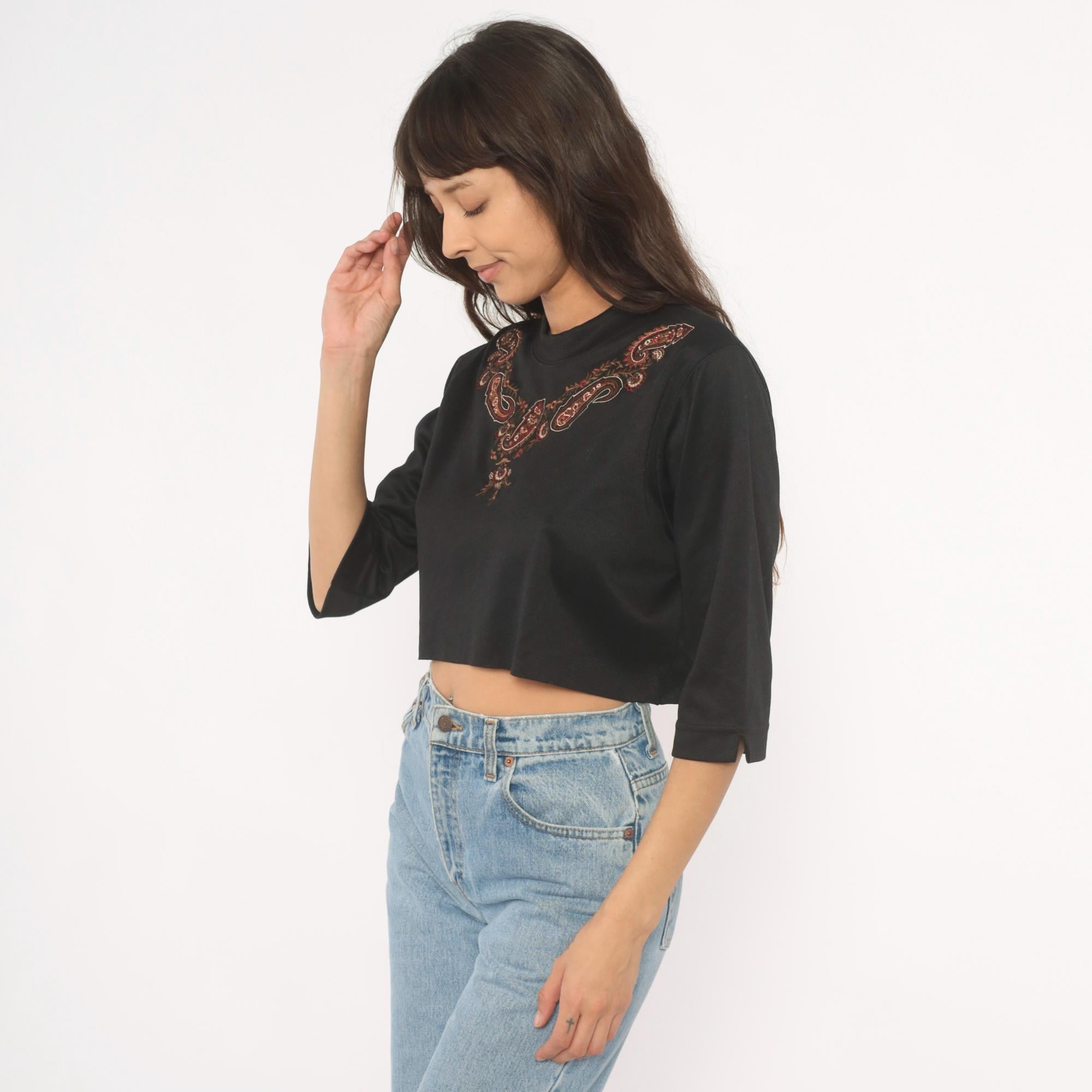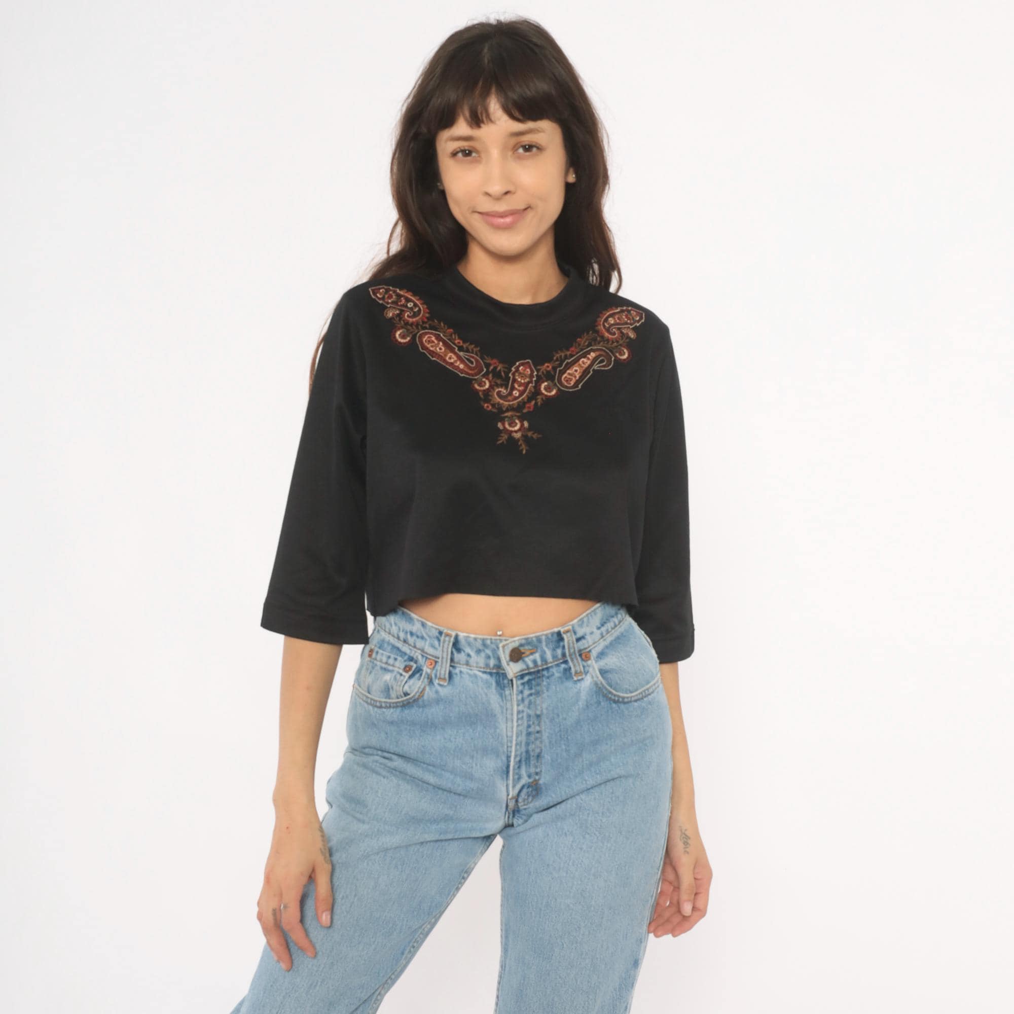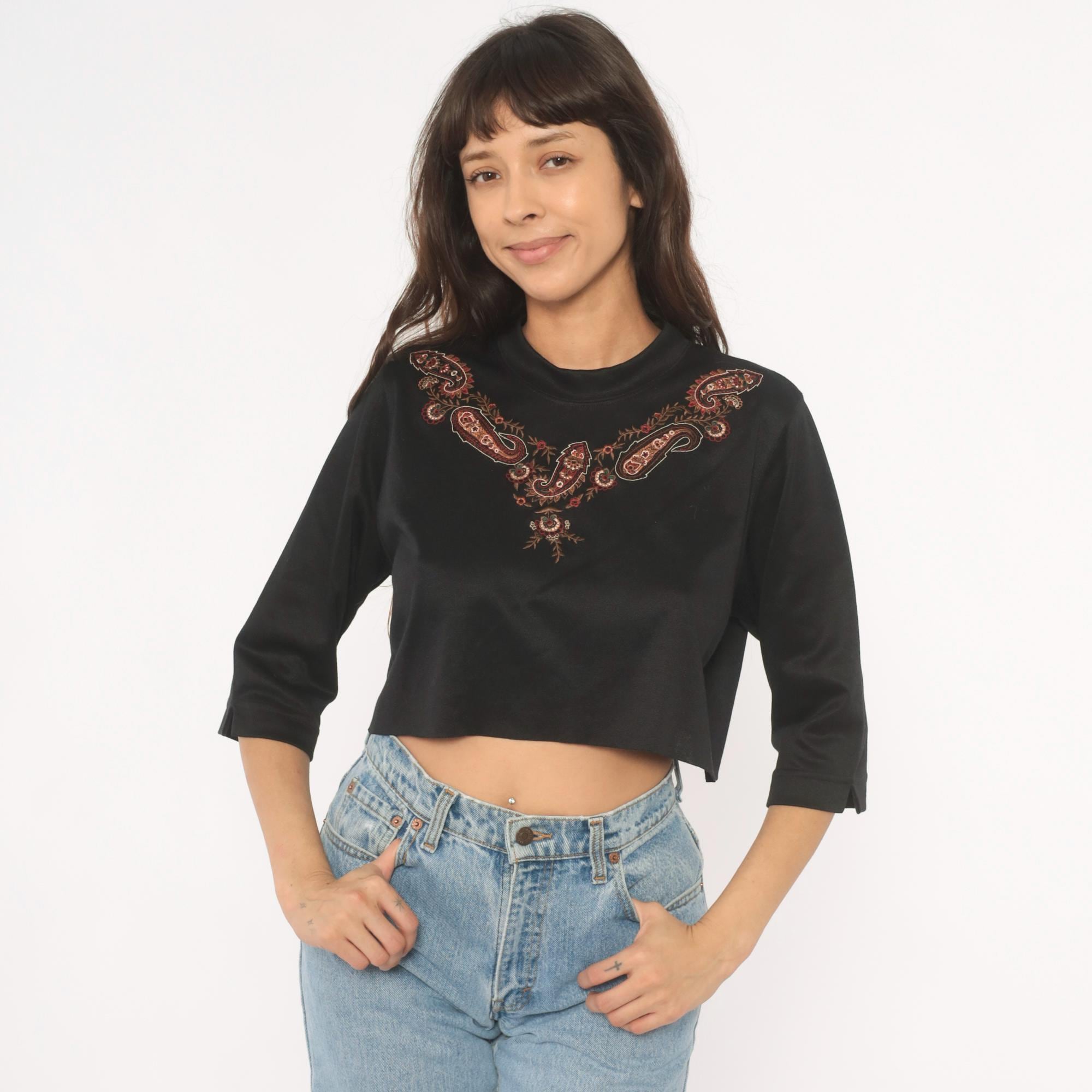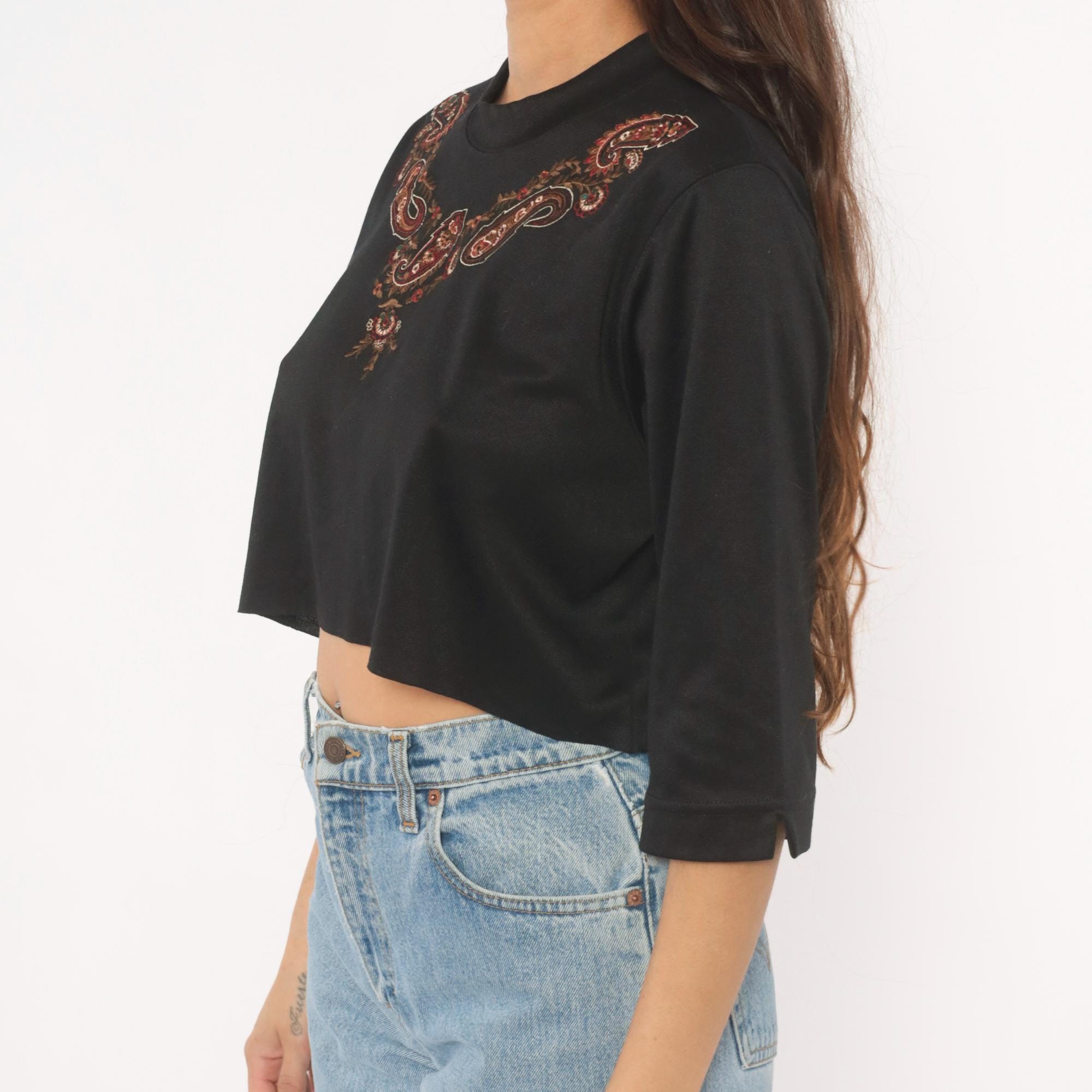 Black crop top with intricate paisley and floral embroidery across the chest in earthy brown, red, and green tones arranged in a V-shaped necklace pattern. Mock neck with three-quarter length sleeves and a straight cropped hem. Plain back with no embellishment, paired here with high-waisted denim.