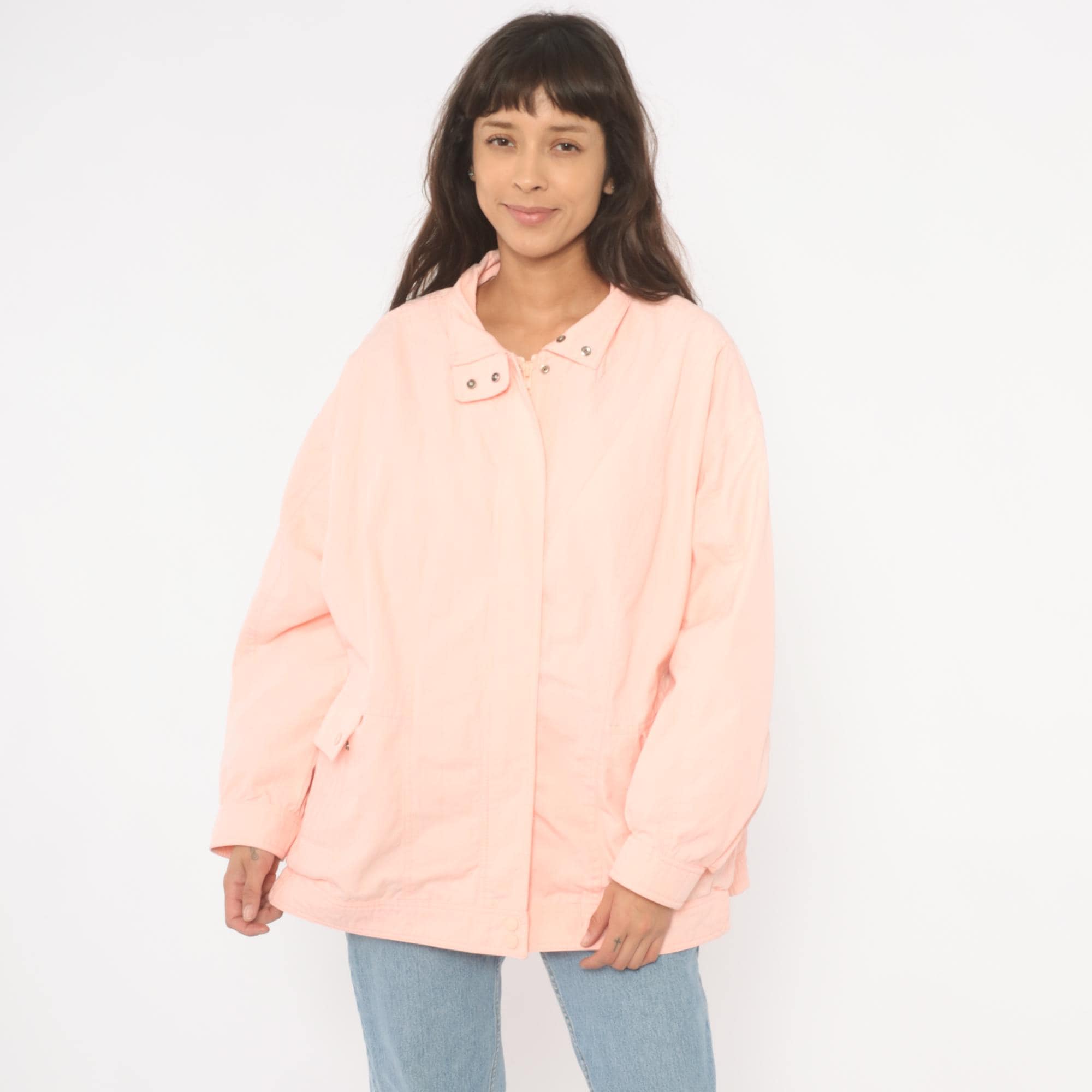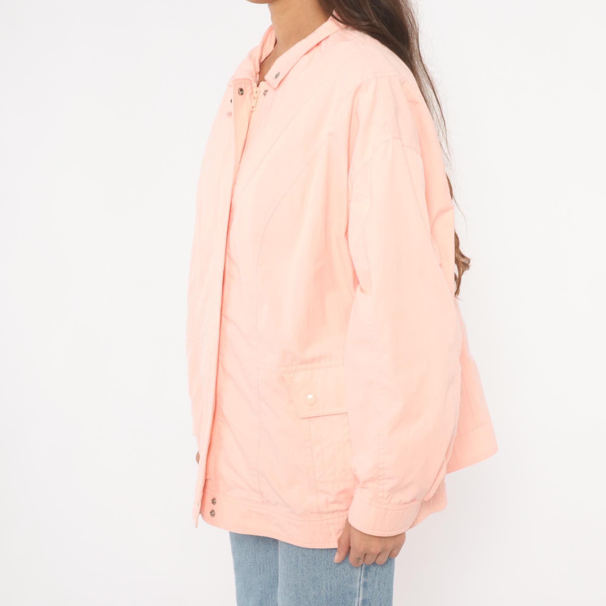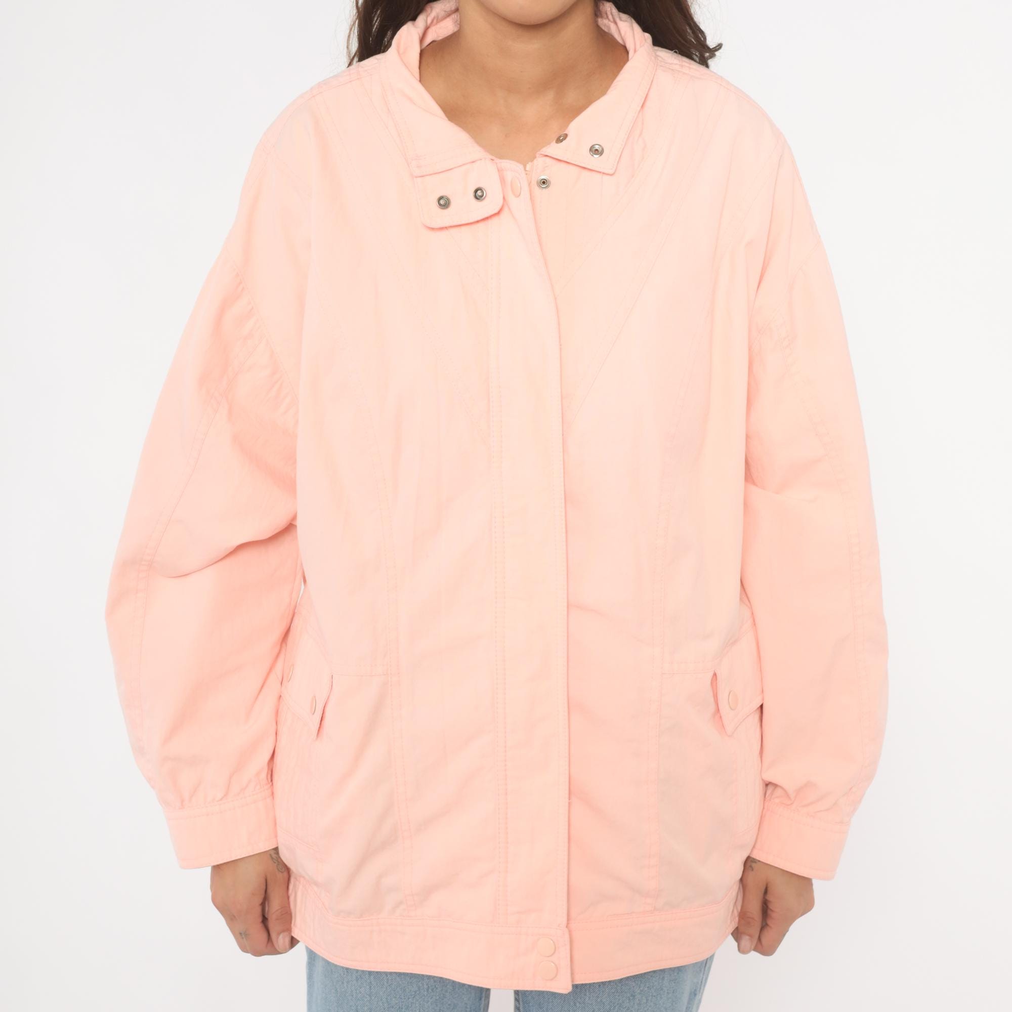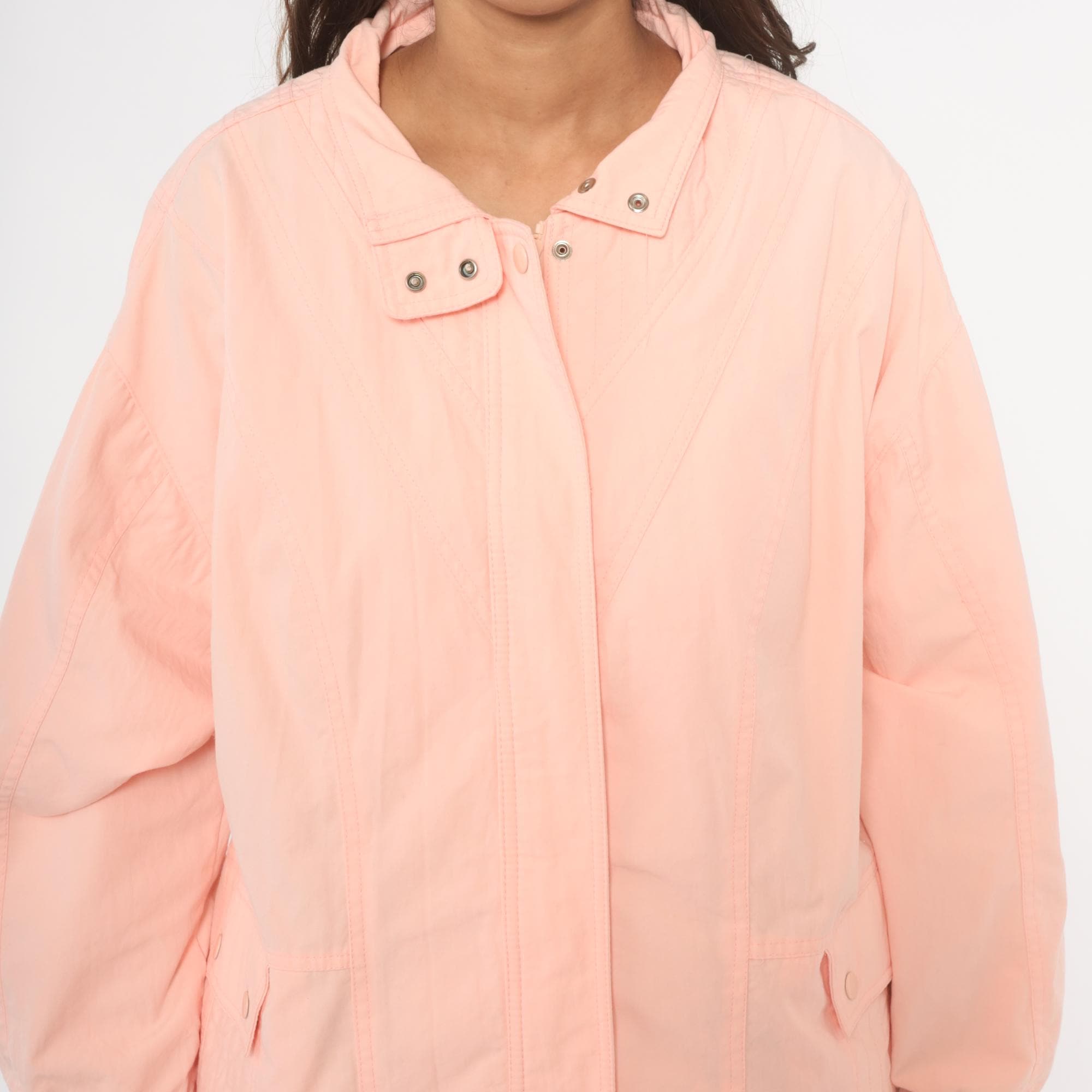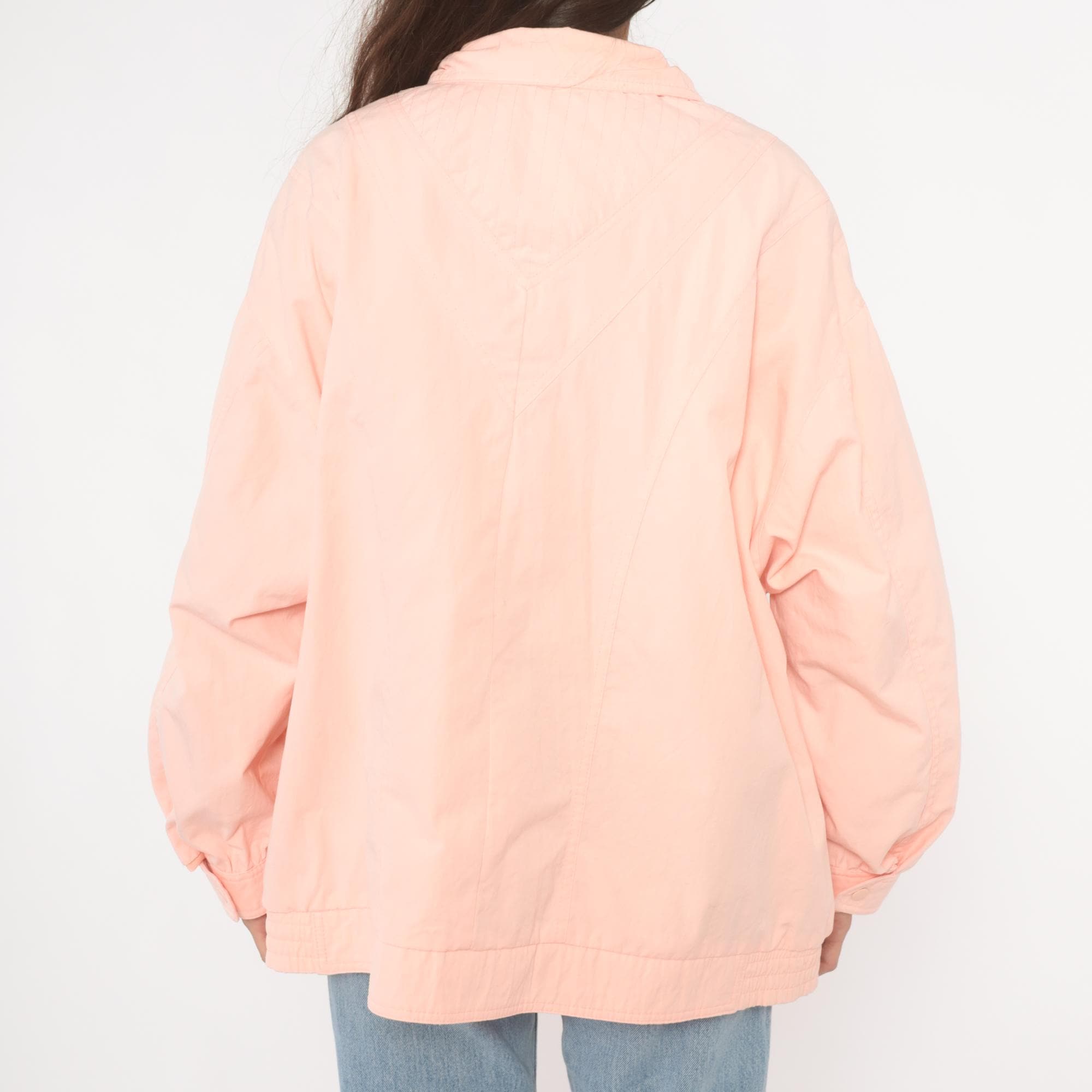 90s peach windbreaker jacket with snap-closure collar tab and hidden zip front. Diagonal seam detailing across the chest and back, with two snap-closure flap pockets at the hip. Elastic cuffs, snap closure at the hem, and a standing collar.