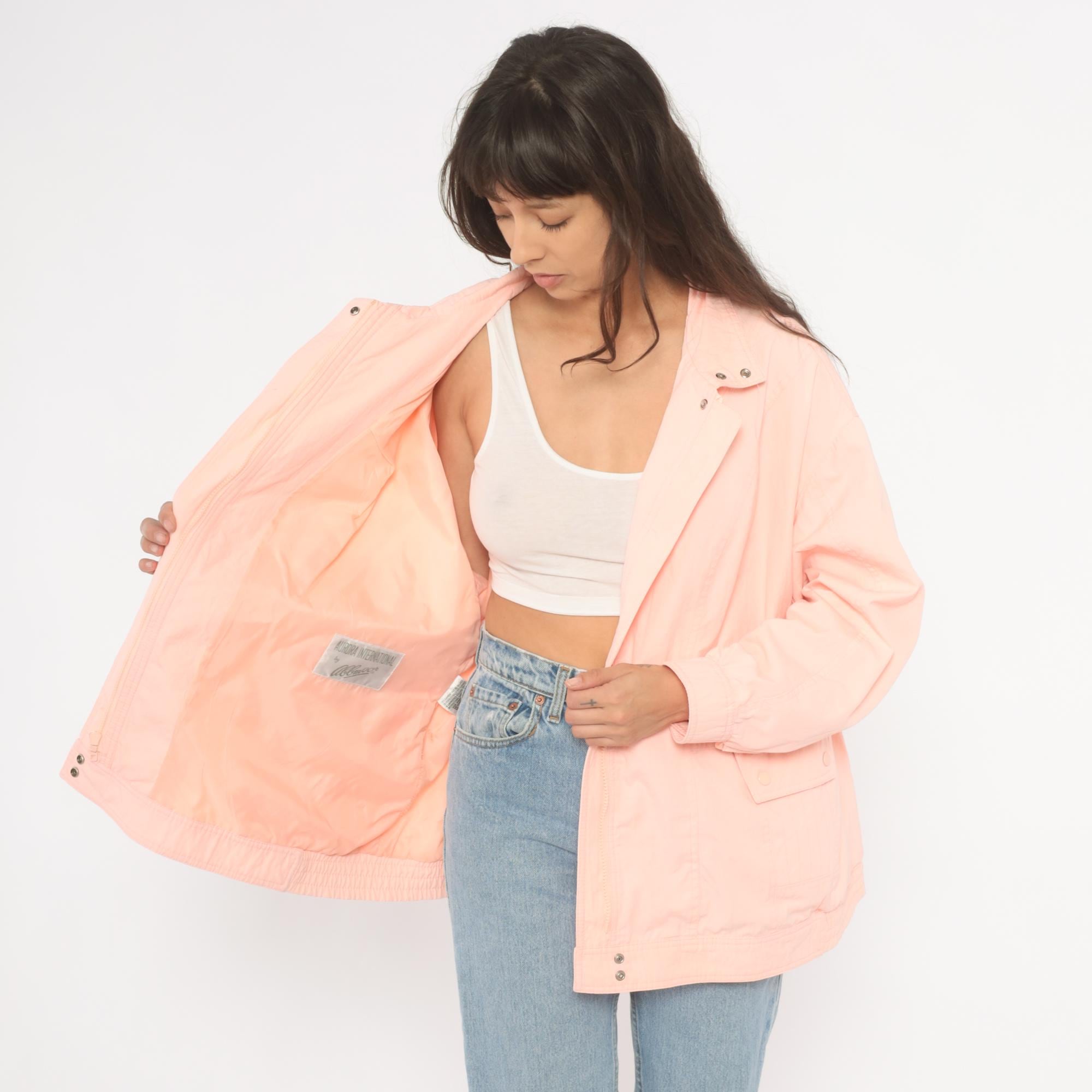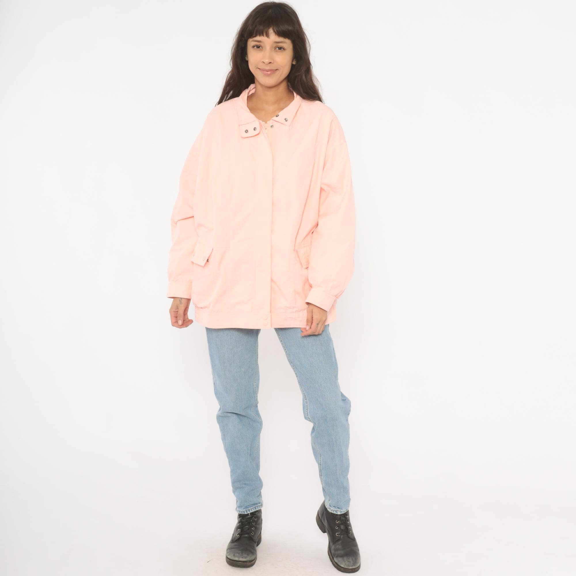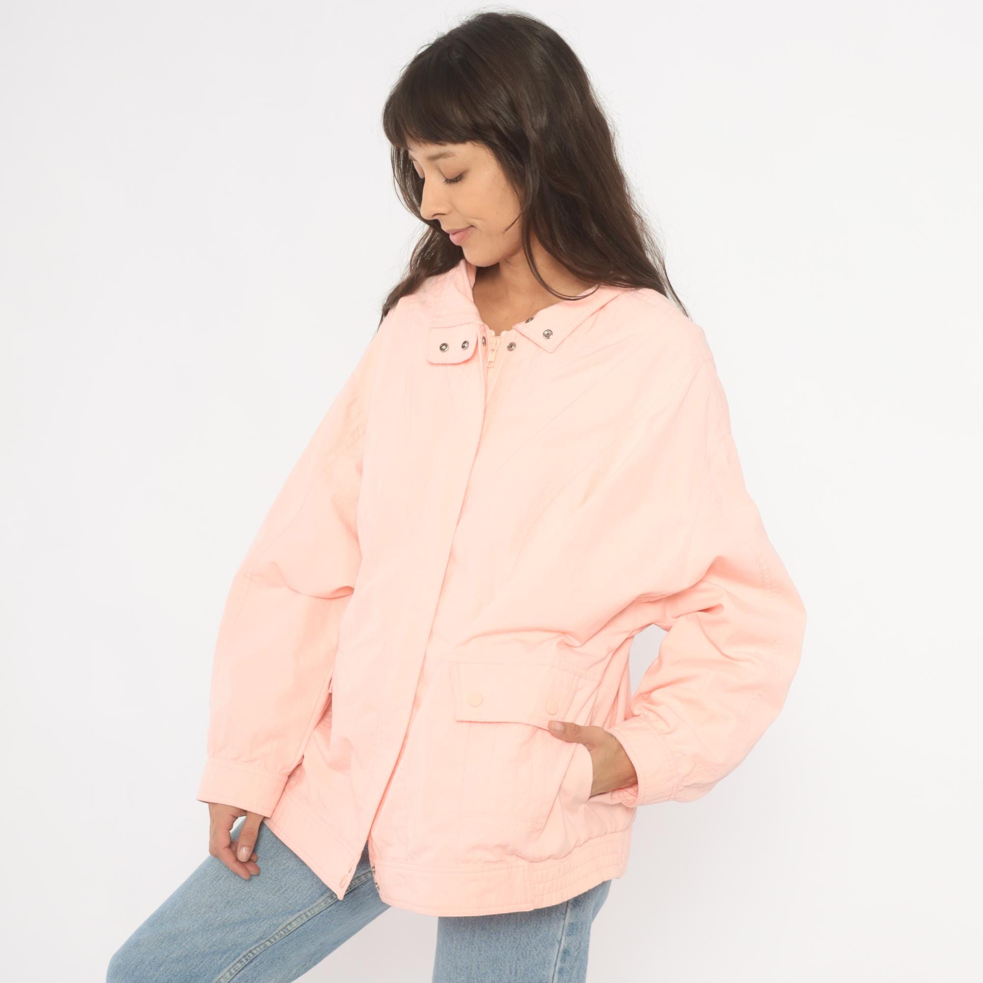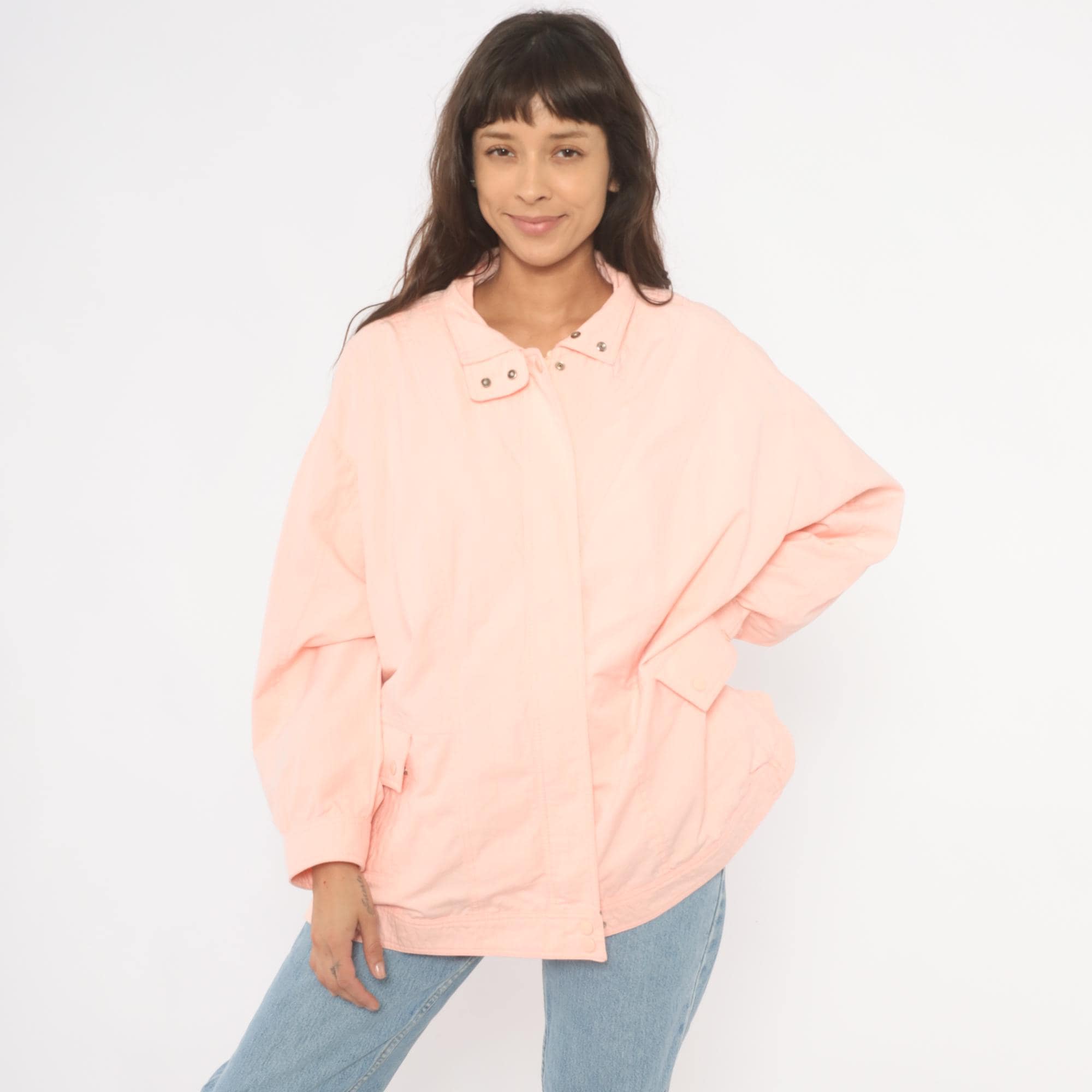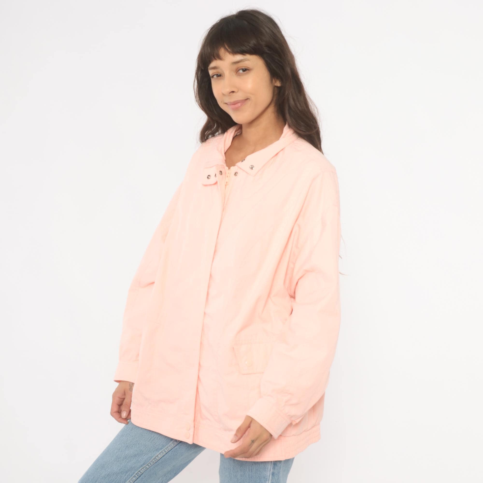 90s peach windbreaker jacket with snap-closure collar tab and hidden zip front. Diagonal seam detailing across the chest and back, with two snap-closure flap pockets at the hip. Elastic cuffs, snap closure at the hem, and a standing collar.