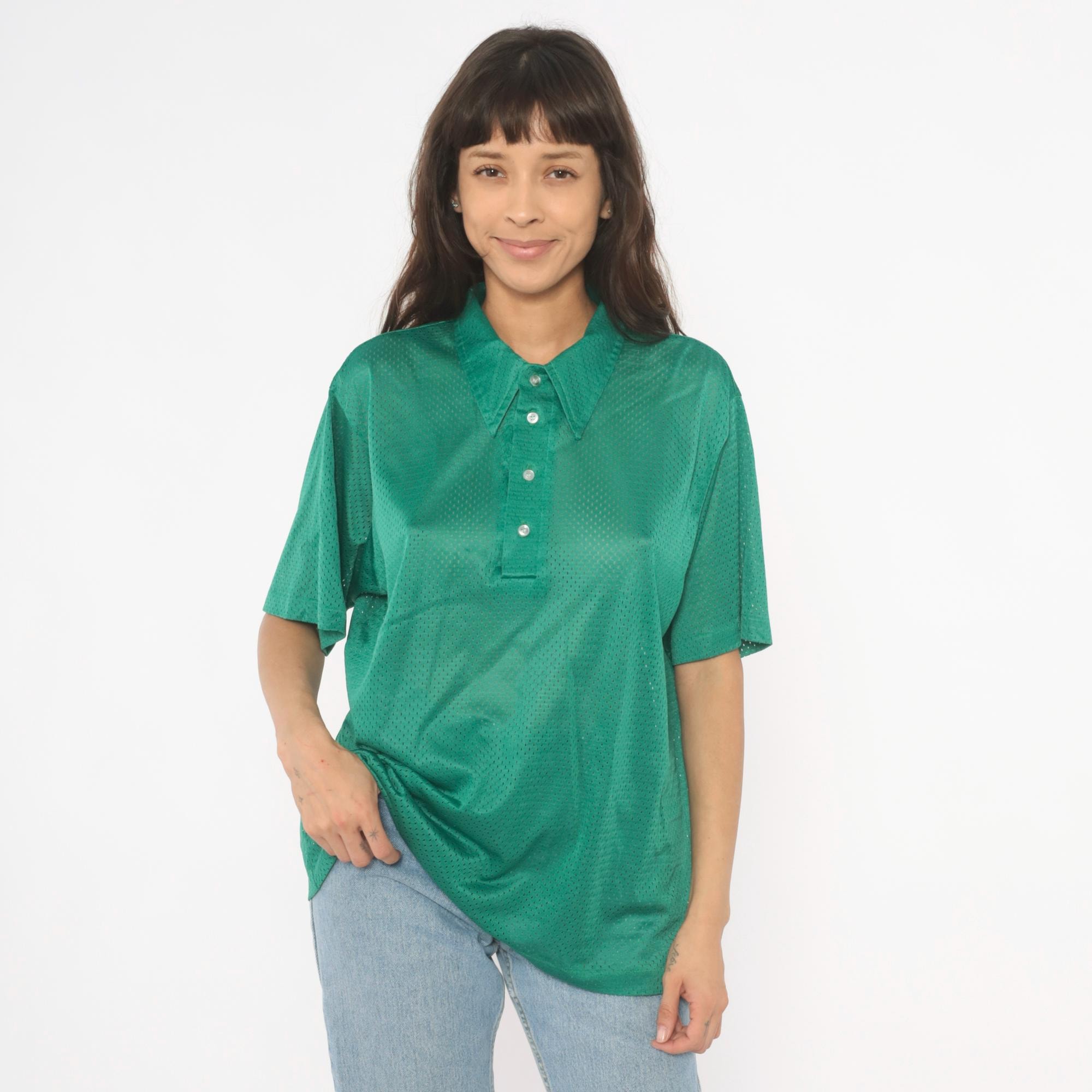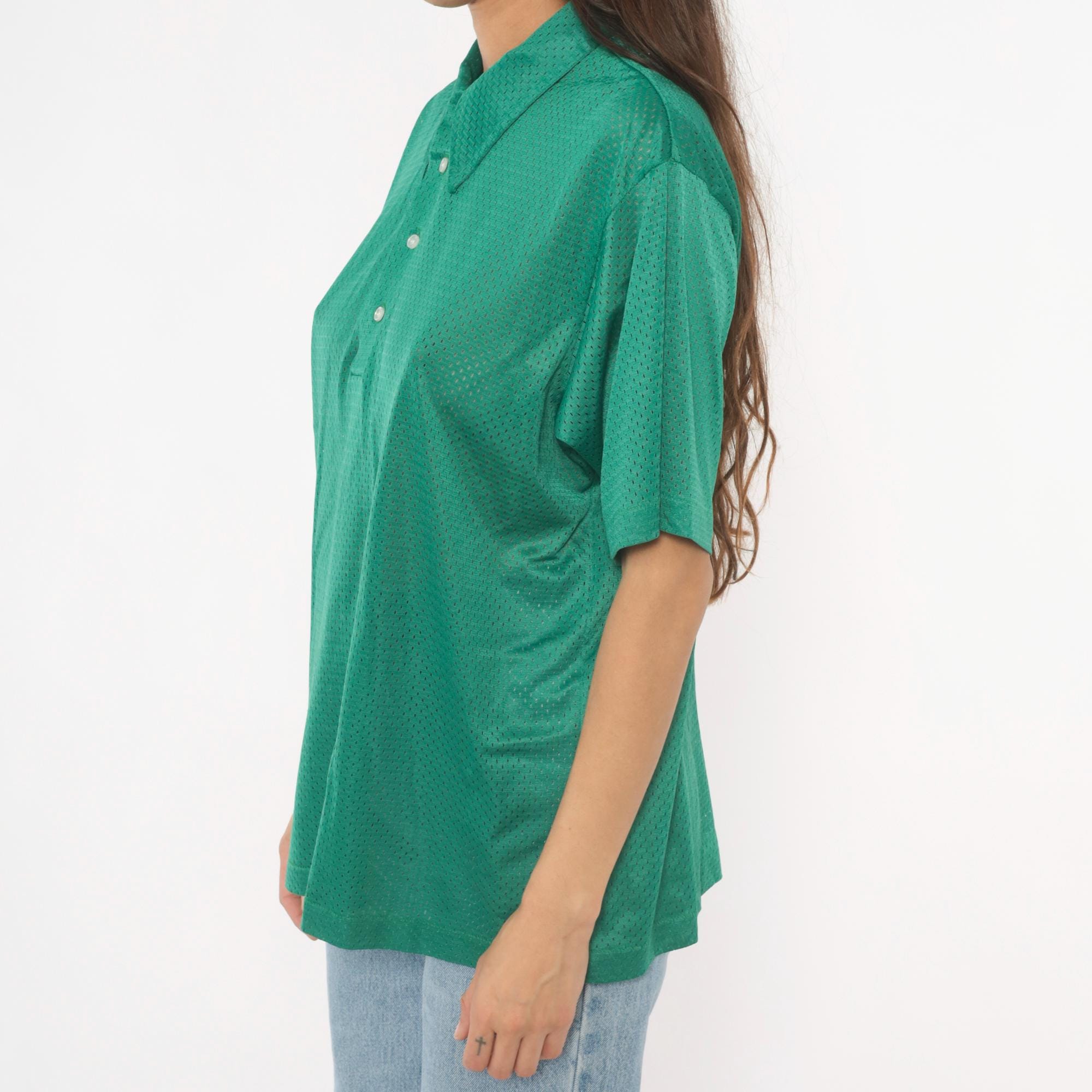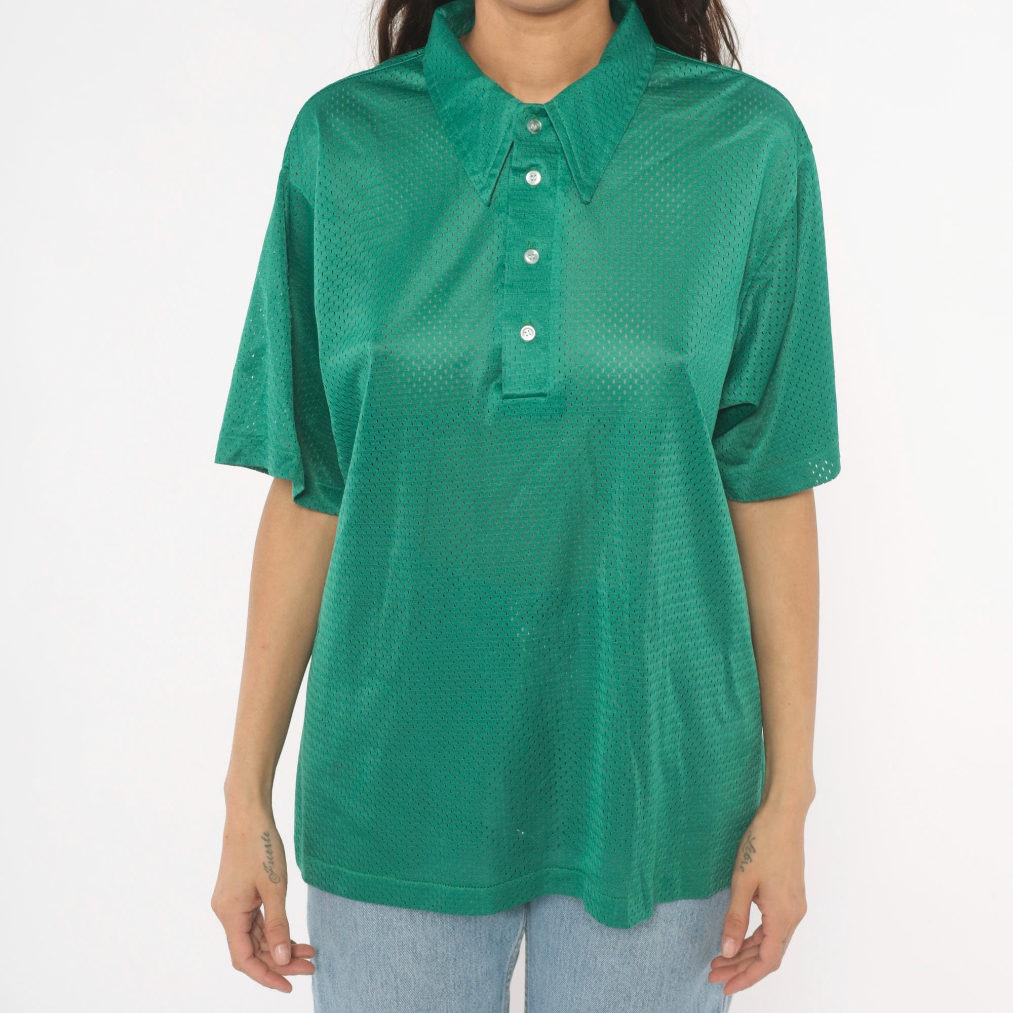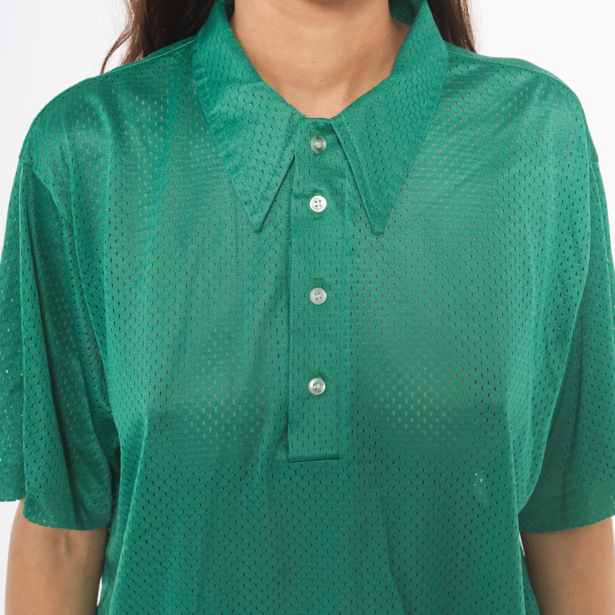 90s green mesh polo shirt with a pointed collar and four-button placket closure. Short sleeves with a relaxed boxy fit and all-over perforated mesh fabric in a rich emerald green.