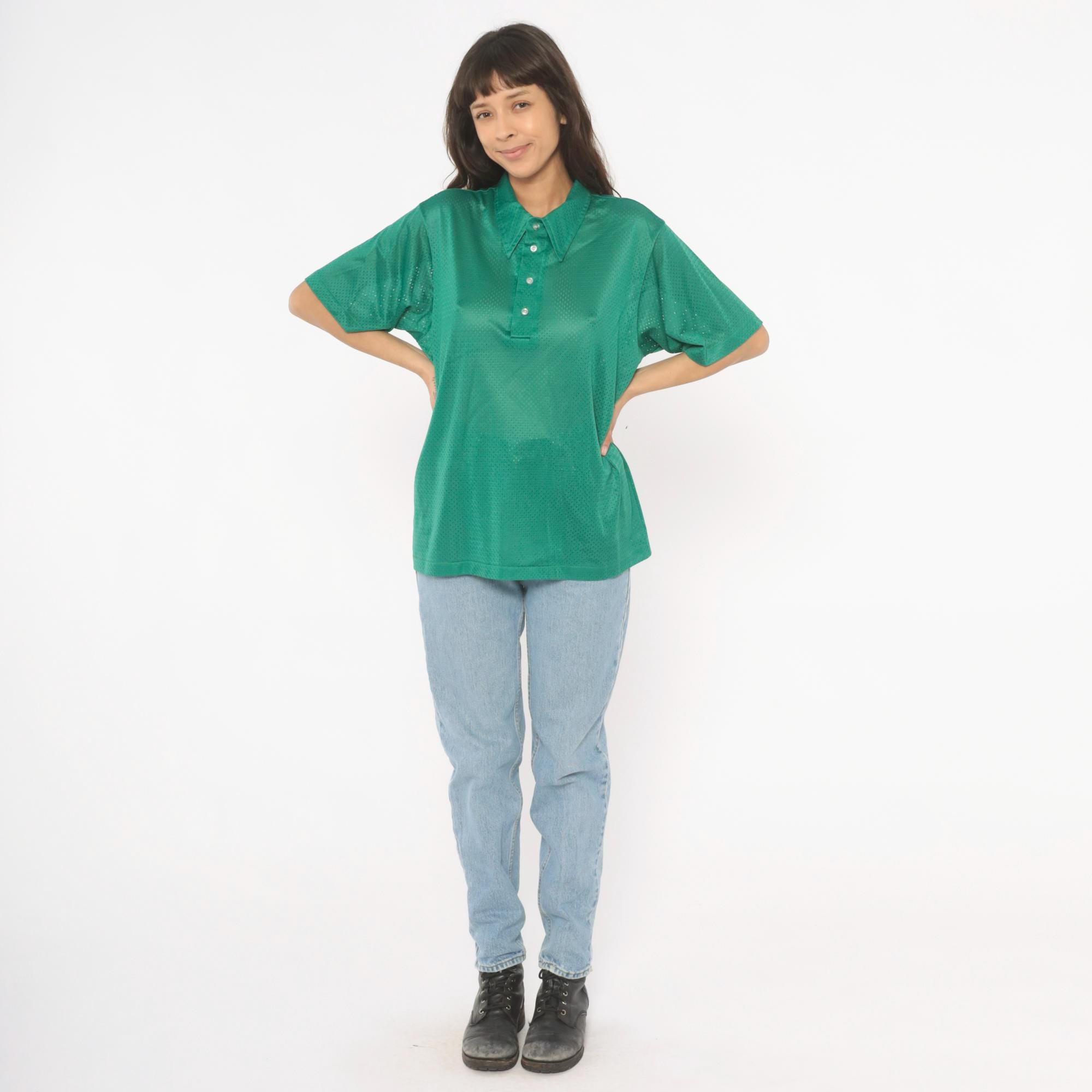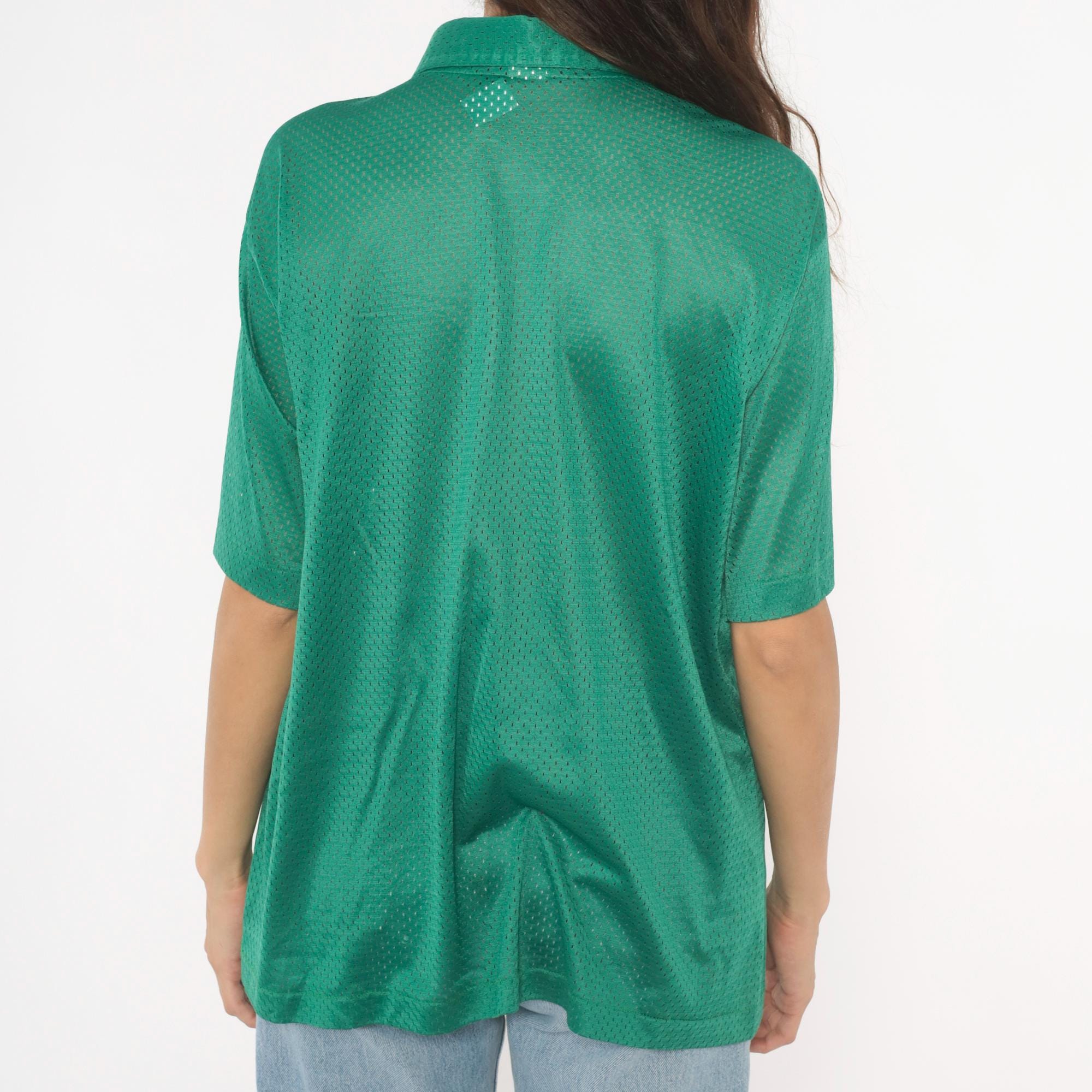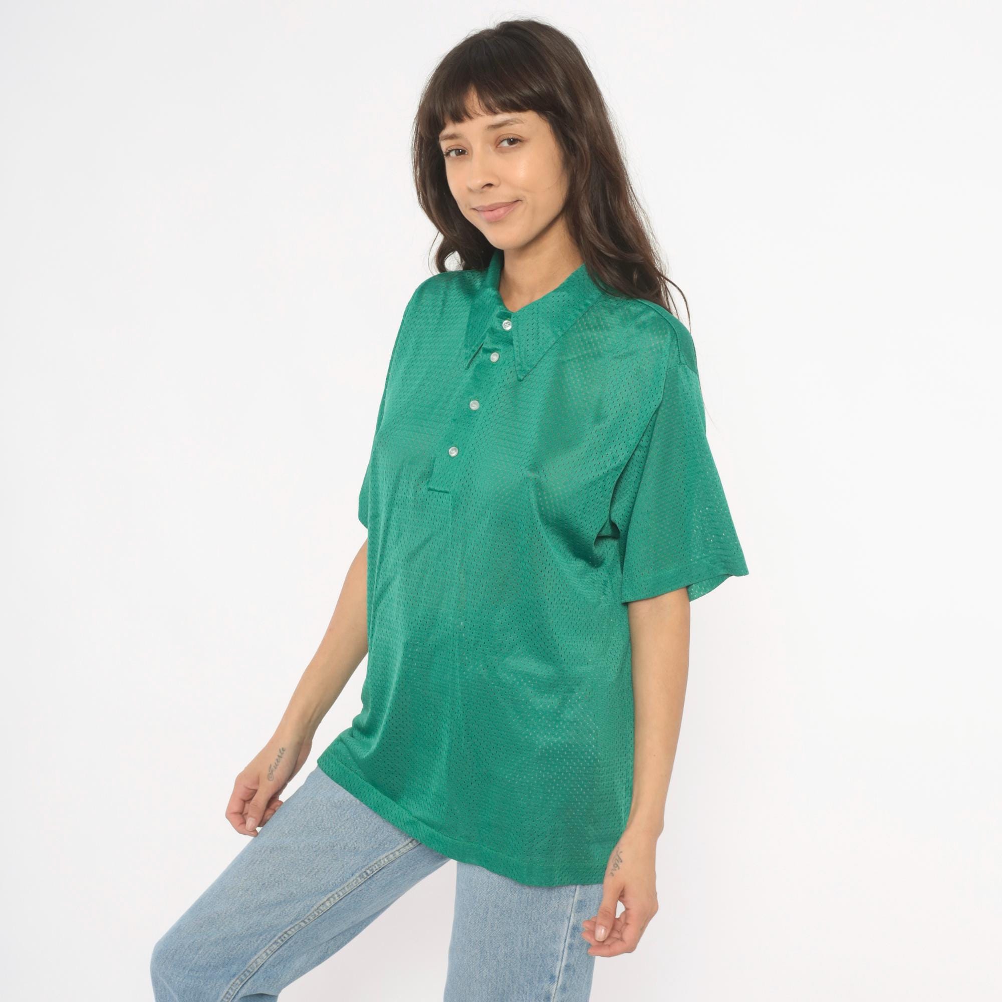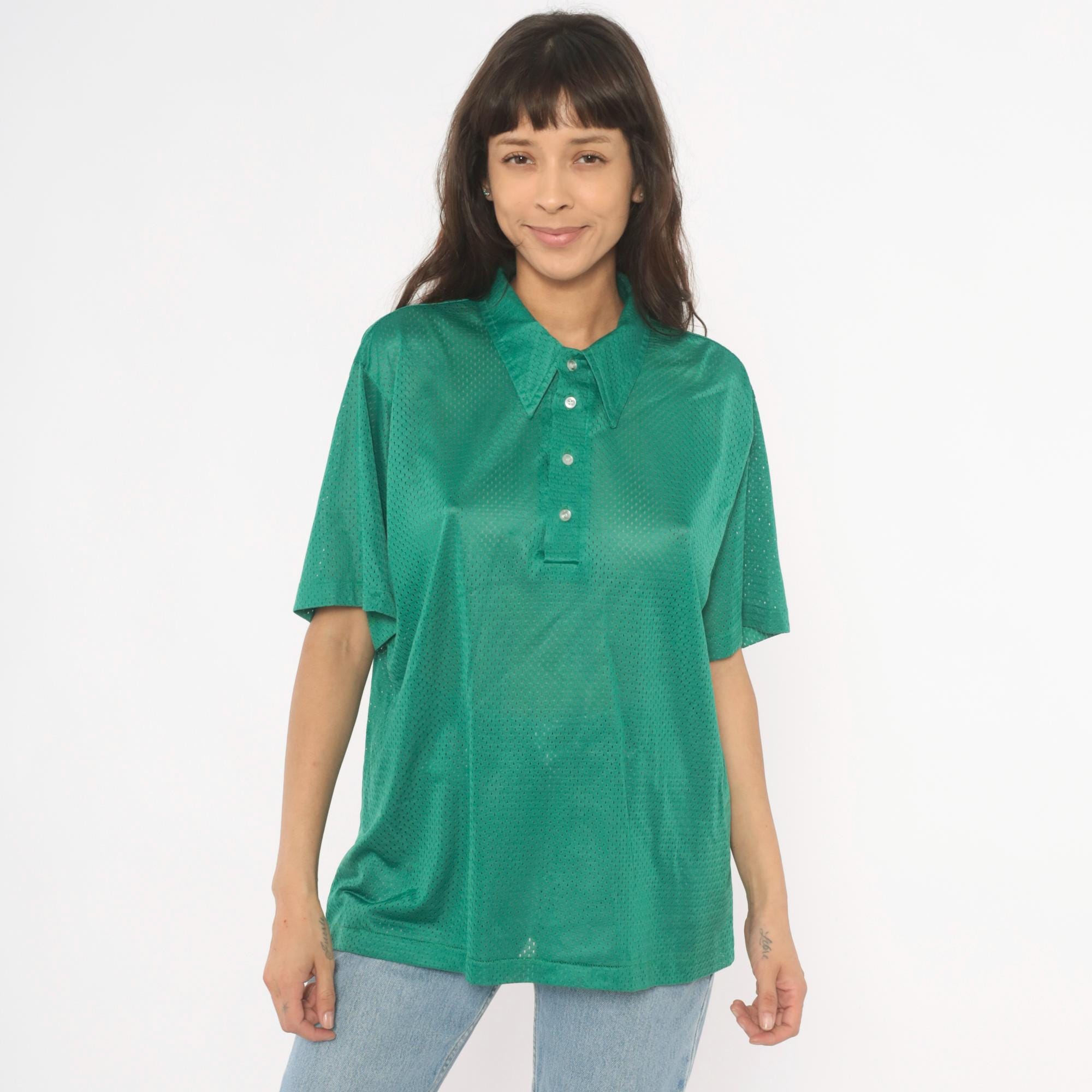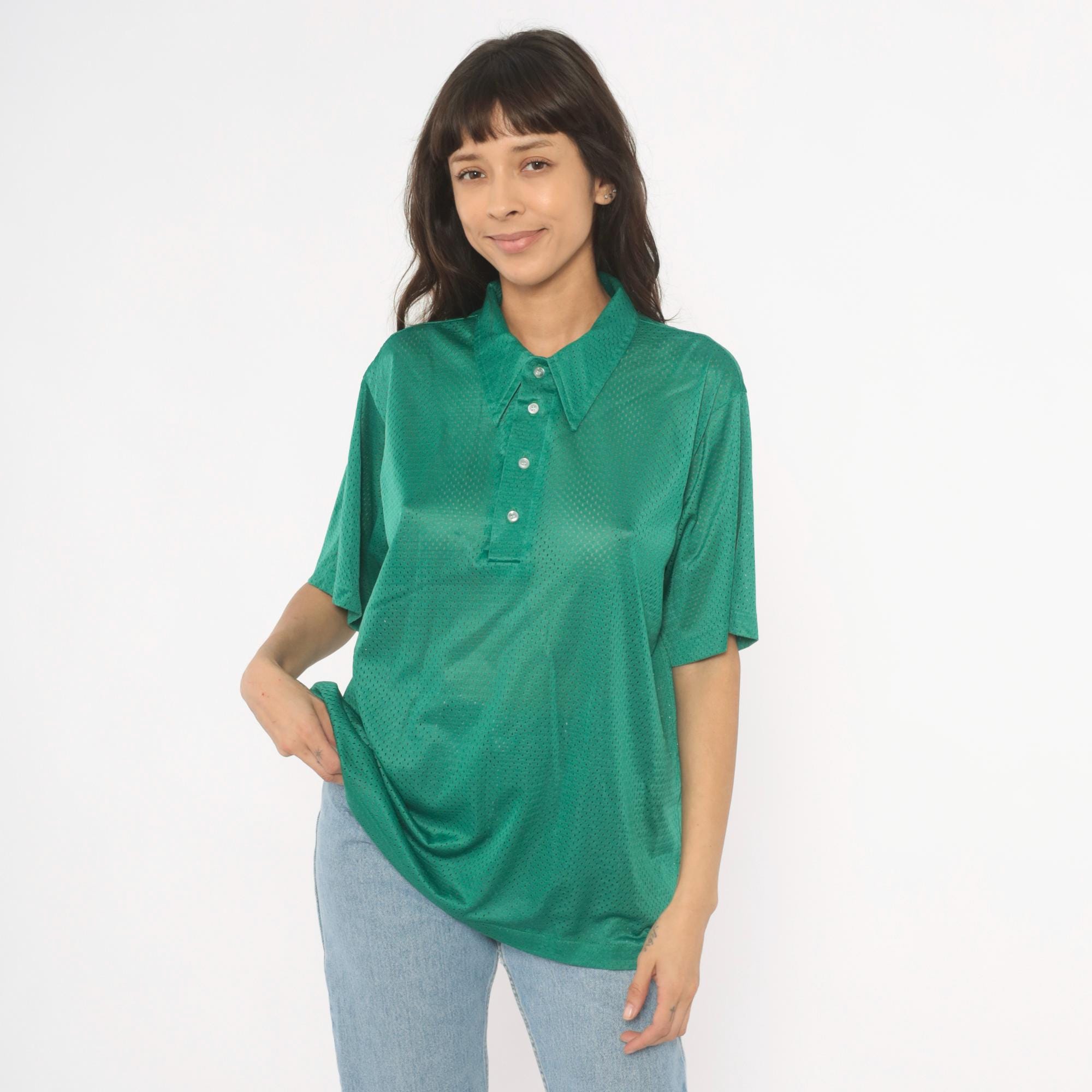 90s green mesh polo shirt with a pointed collar and four-button placket closure. Short sleeves with a relaxed boxy fit and all-over perforated mesh fabric in a rich emerald green.