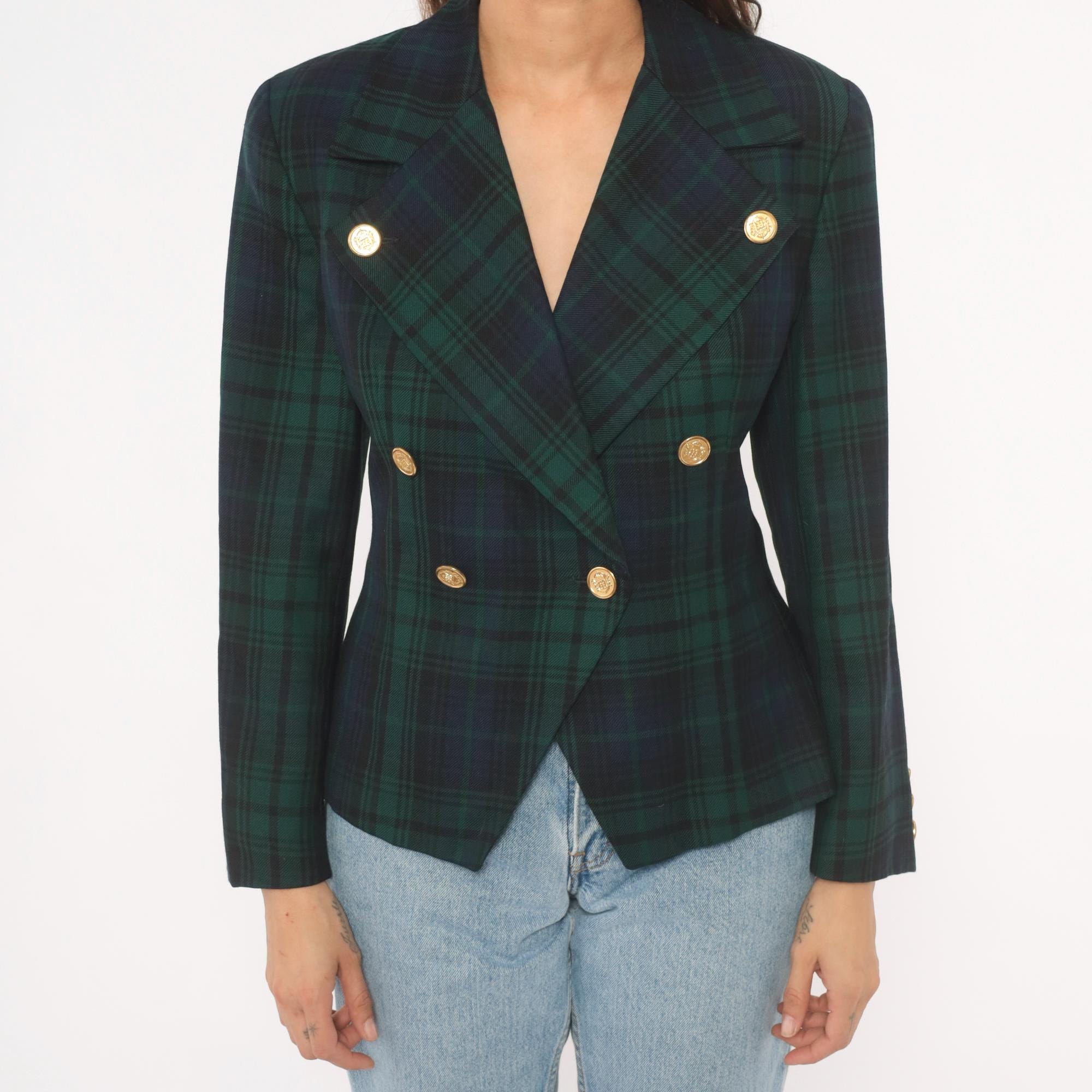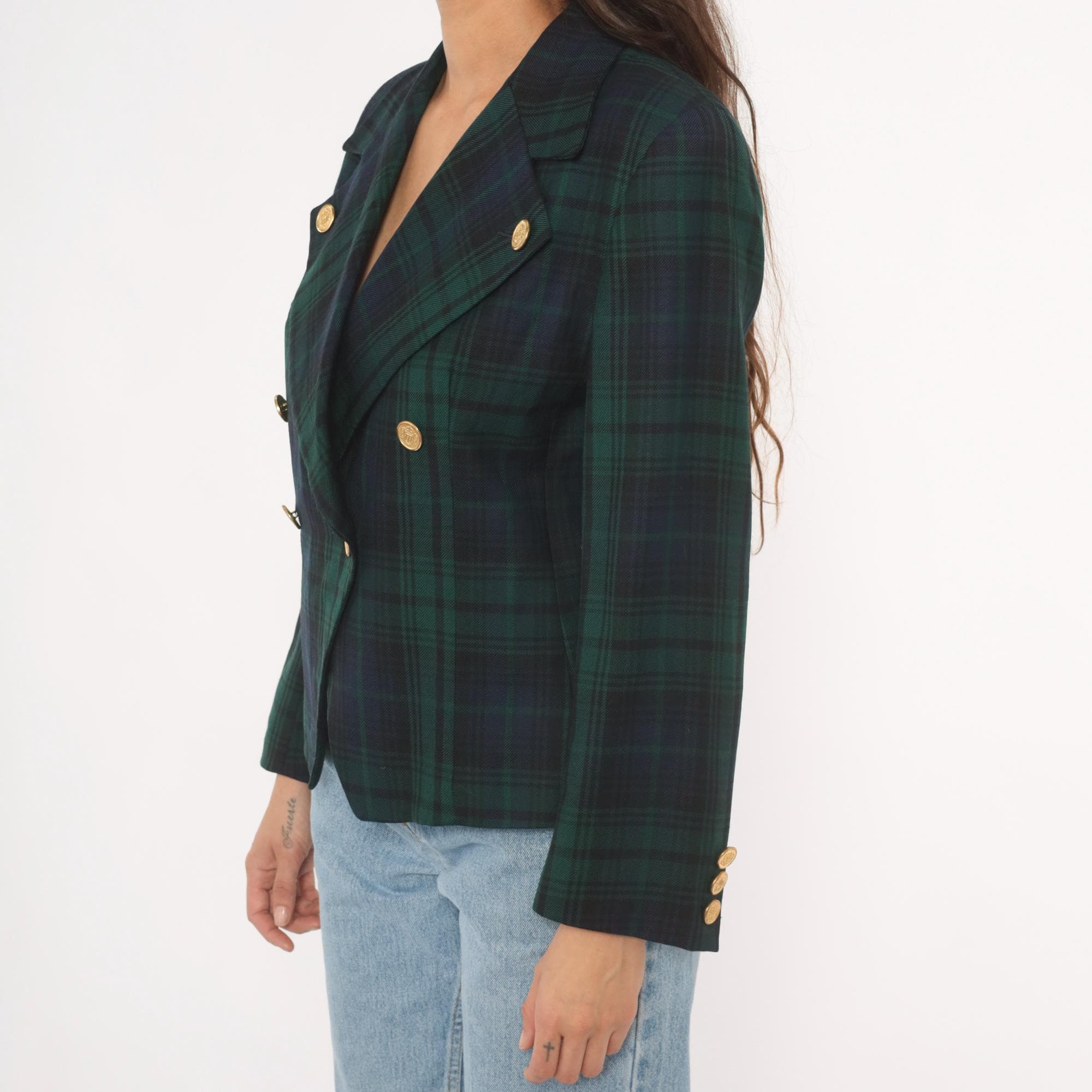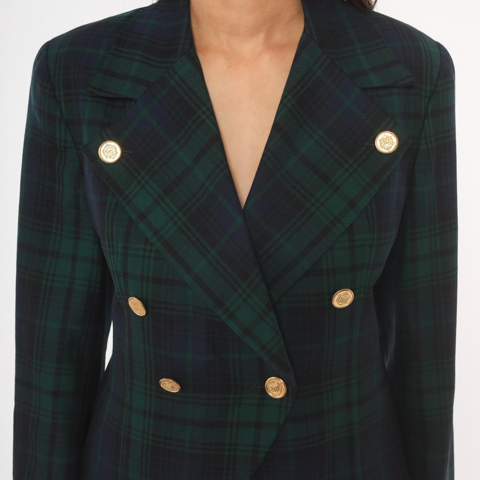 80s double breasted blazer in Black Watch tartan plaid with navy and hunter green tones. Six gold crest-embossed buttons on the front with three matching buttons on each cuff. Notched peak lapels, fitted waist, and structured shoulders with a hip-length hem.