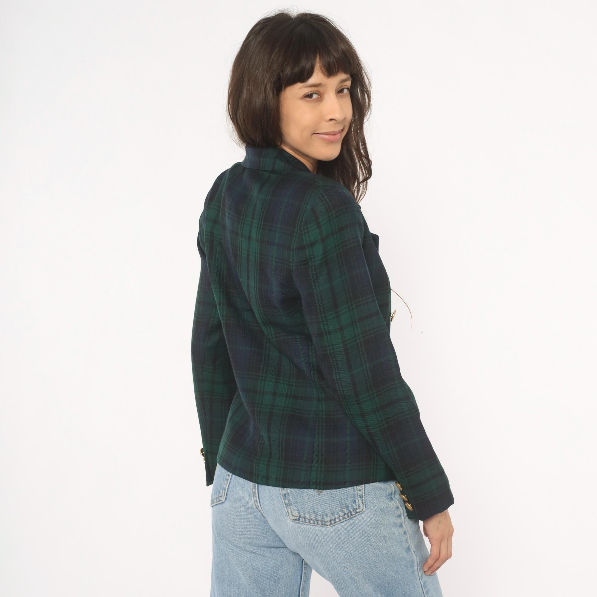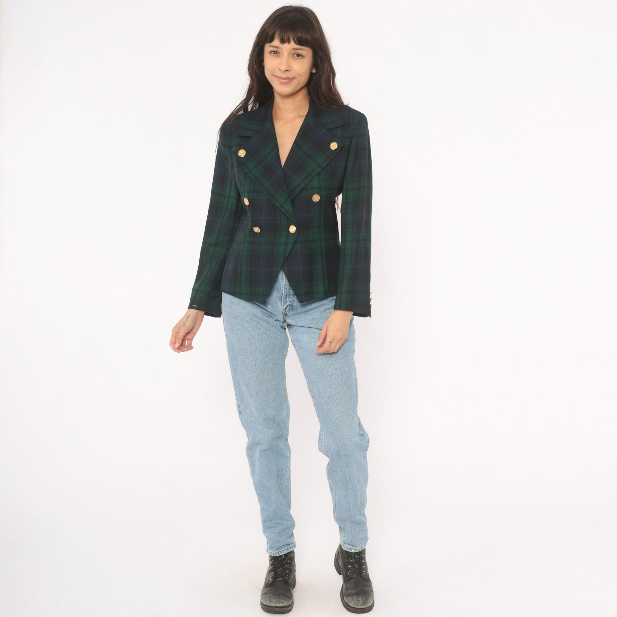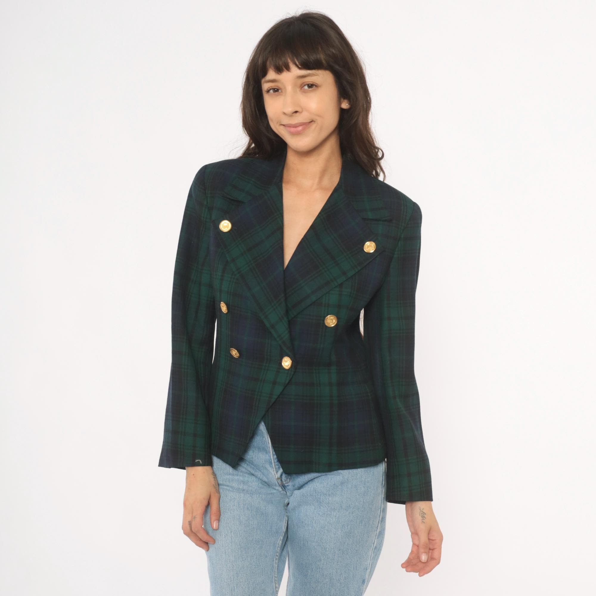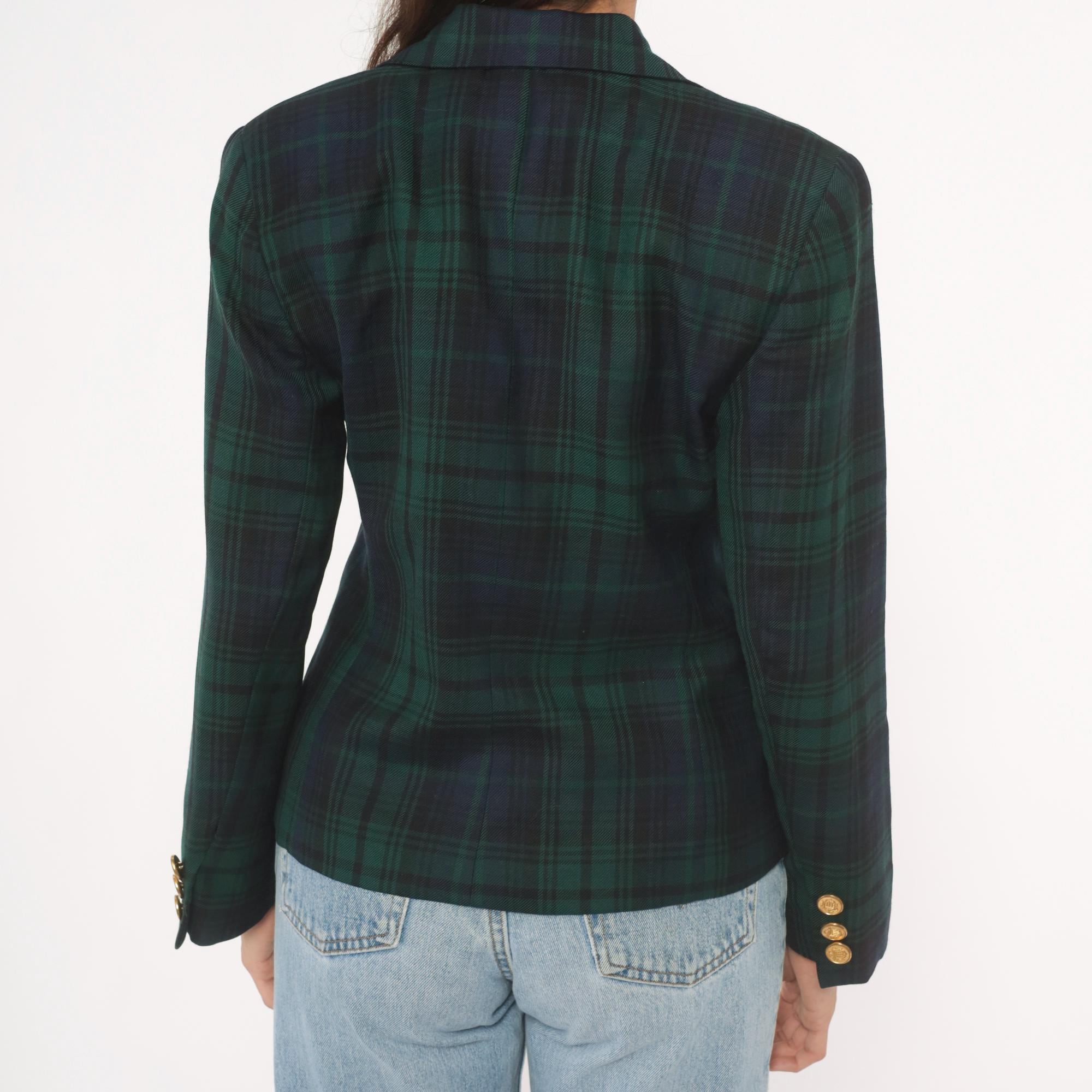 80s double breasted blazer in Black Watch tartan plaid with navy and hunter green tones. Six gold crest-embossed buttons on the front with three matching buttons on each cuff. Notched peak lapels, fitted waist, and structured shoulders with a hip-length hem.