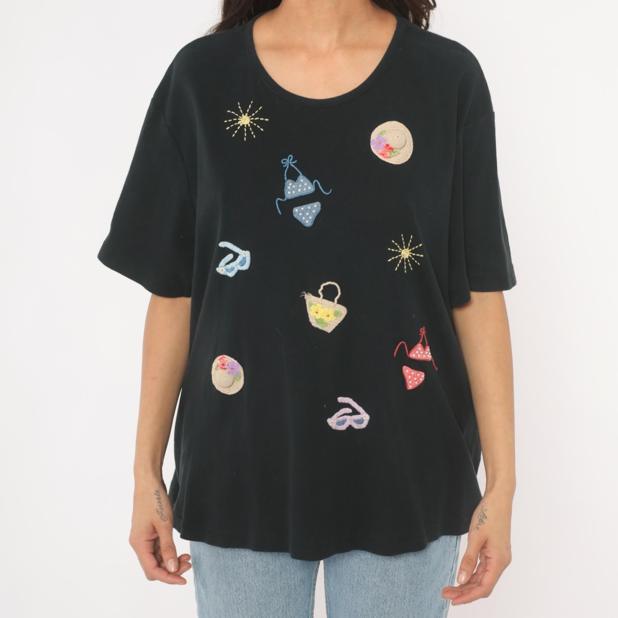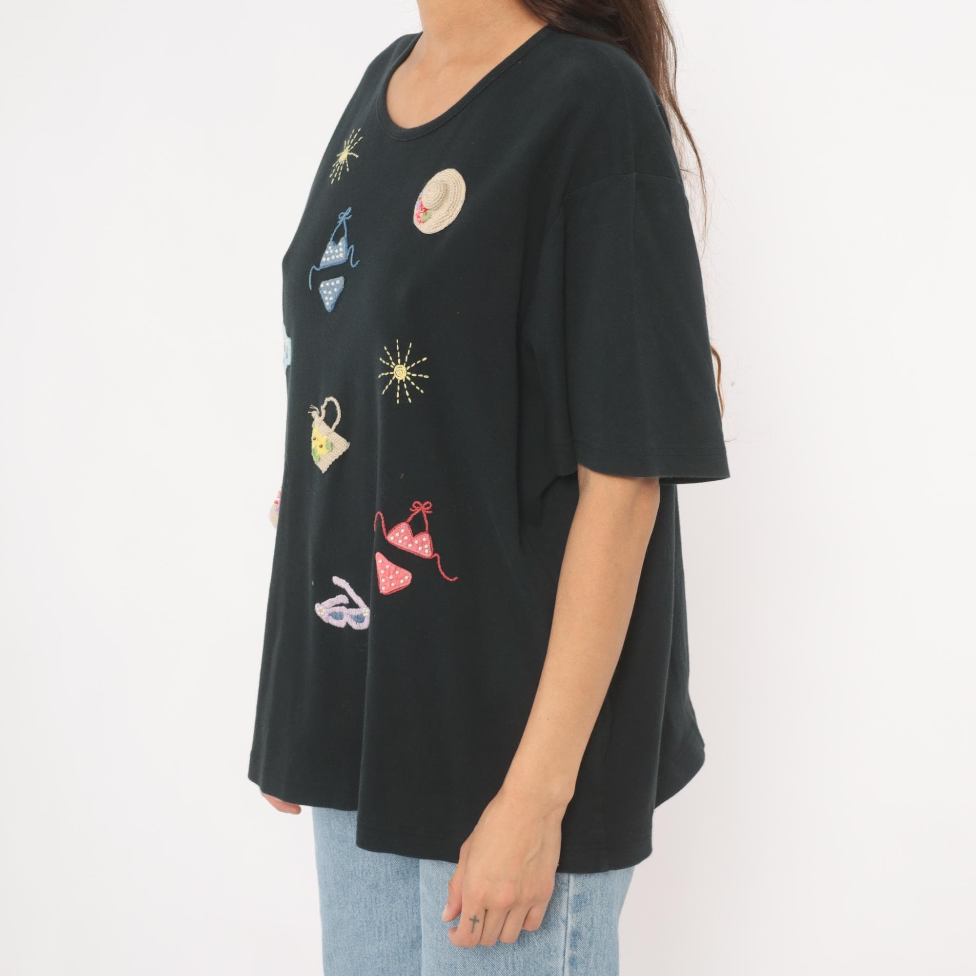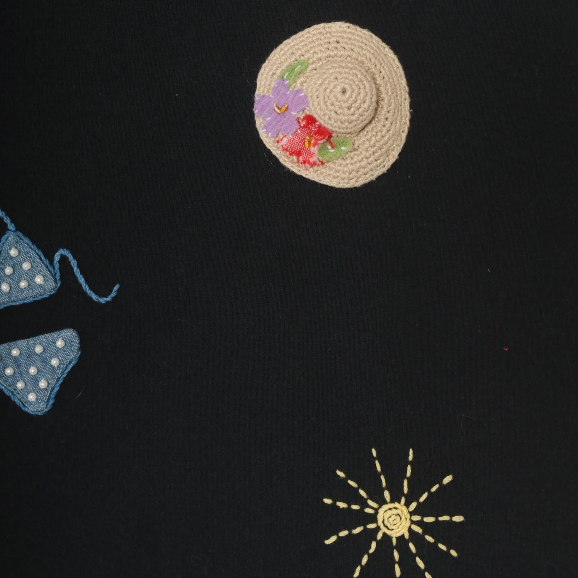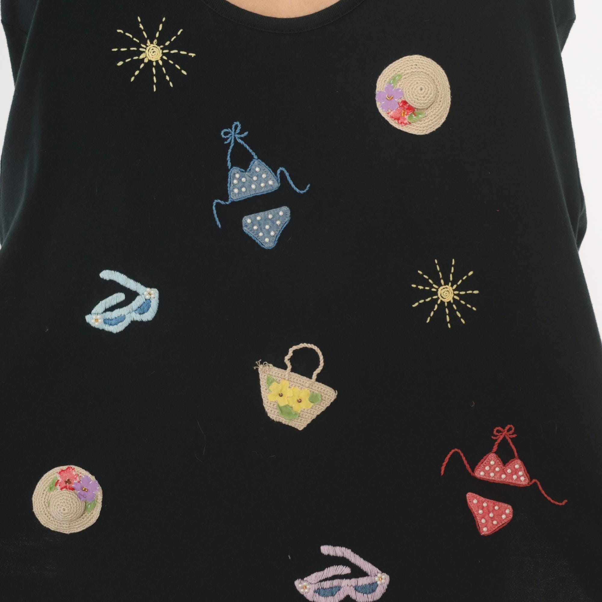 Black short sleeve crew neck tee with scattered hand-embroidered and crocheted beach-themed appliques across the front. Motifs include polka dot bikinis in blue and red, straw sun hats with floral accents, flip flop sandals, a woven basket with flowers, and embroidered sunbursts in gold thread. Relaxed fit with a straight hem and dropped shoulders.