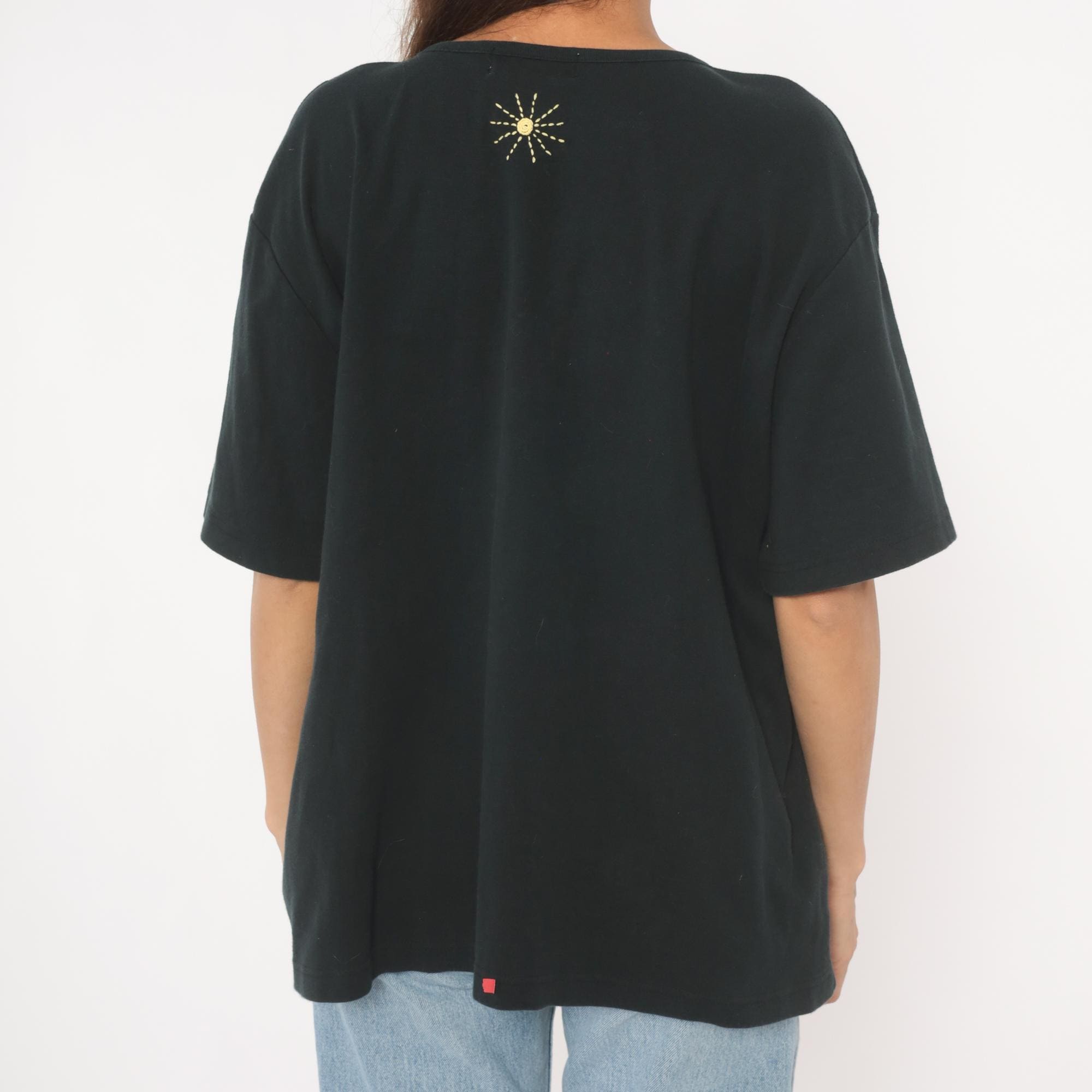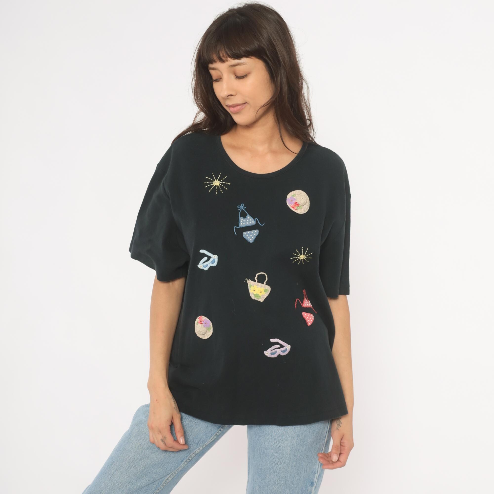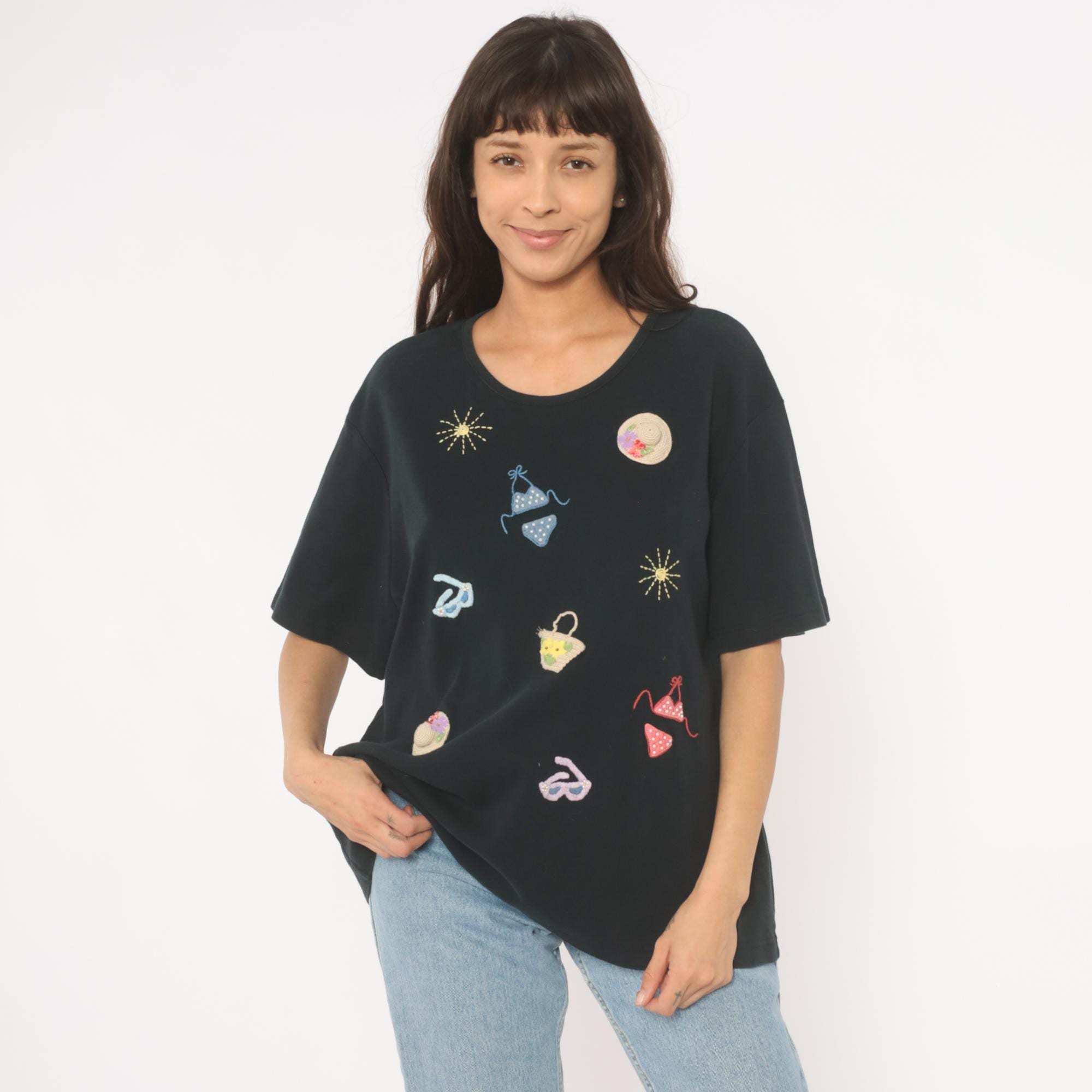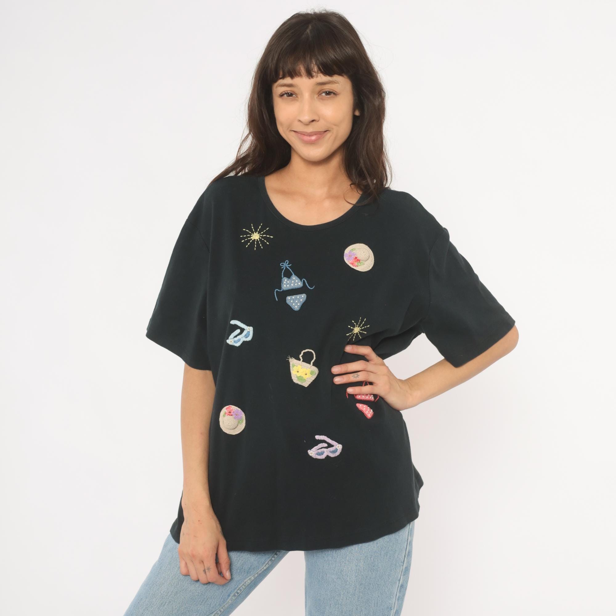 Black short sleeve crew neck tee with scattered hand-embroidered and crocheted beach-themed appliques across the front. Motifs include polka dot bikinis in blue and red, straw sun hats with floral accents, flip flop sandals, a woven basket with flowers, and embroidered sunbursts in gold thread. Relaxed fit with a straight hem and dropped shoulders.