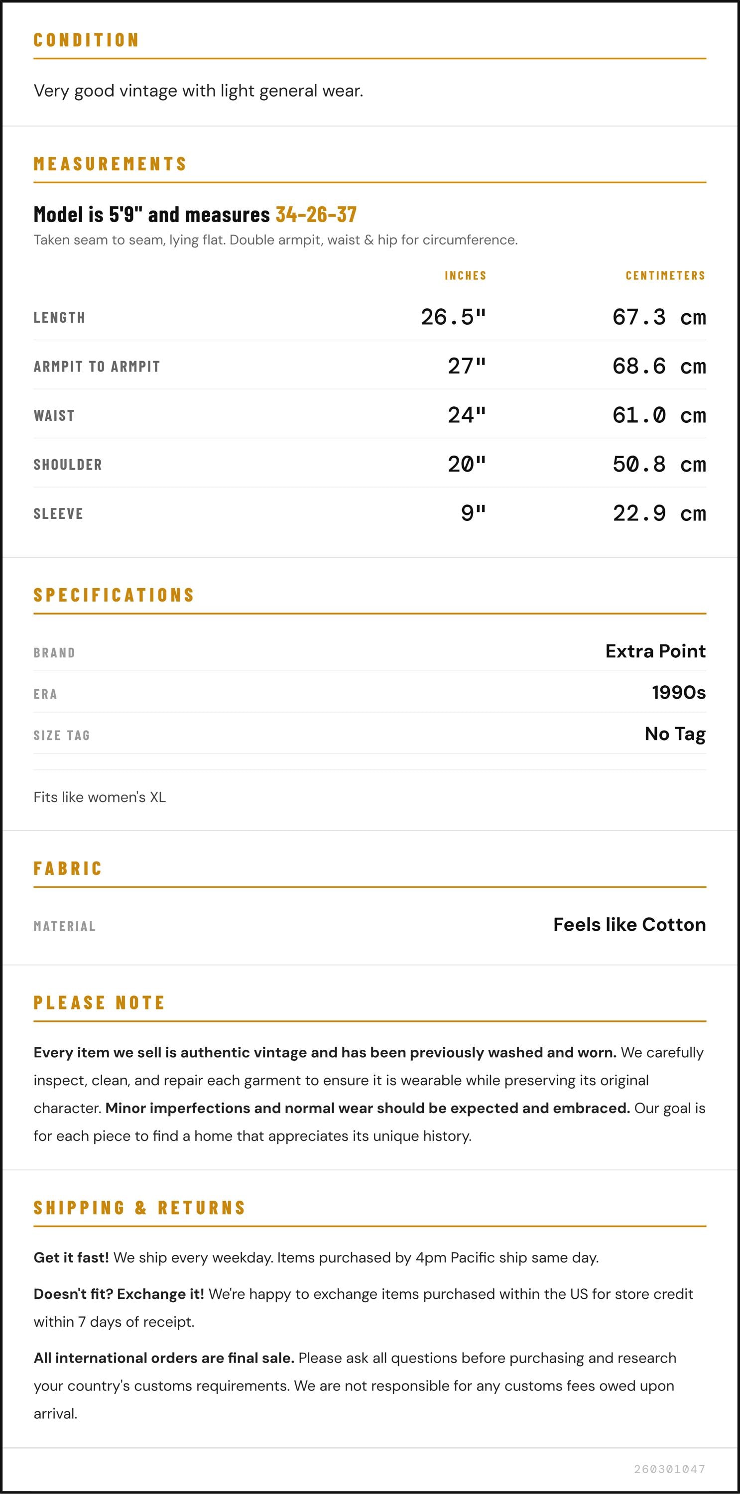 Measurements are taken laying flat and should be doubled where applicable. The "best fits" size is just an estimate, and vintage sizing can vary from modern sizing. Please use measurements to ensure proper fit. The best thing to do is measure a similar item of your own, and compare. When an item has stretch, we will list the unstretched dimensions with the stretched measurement afterwards.