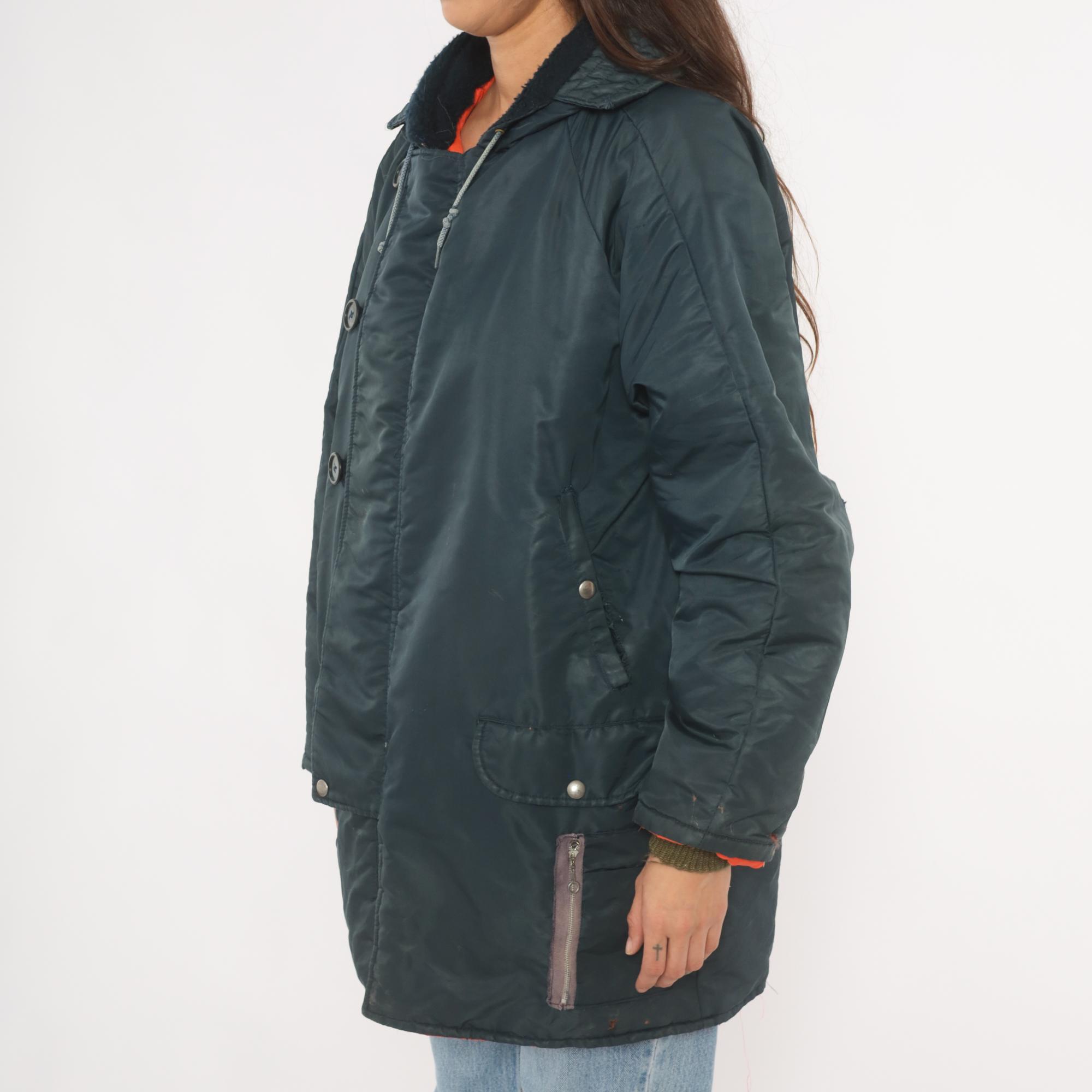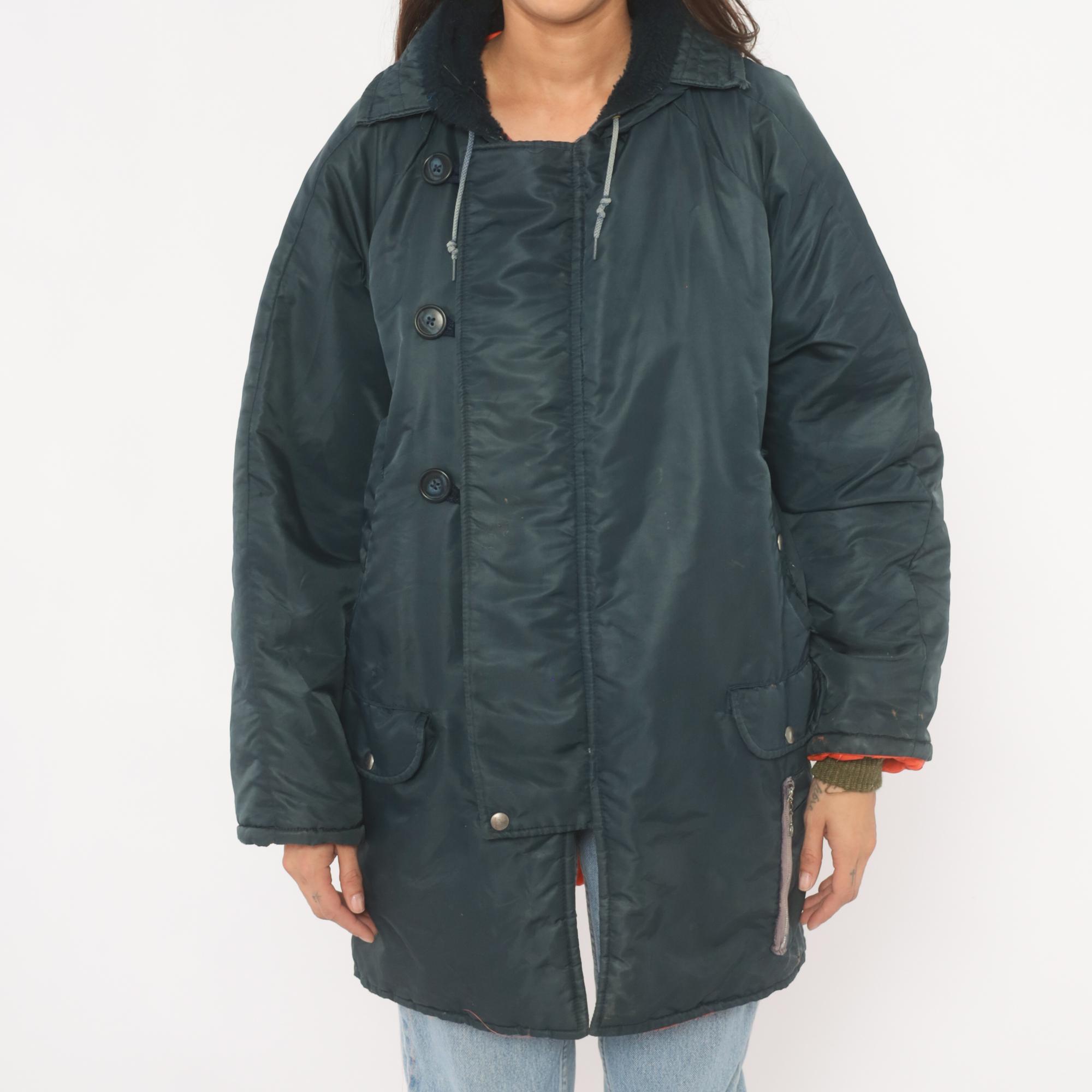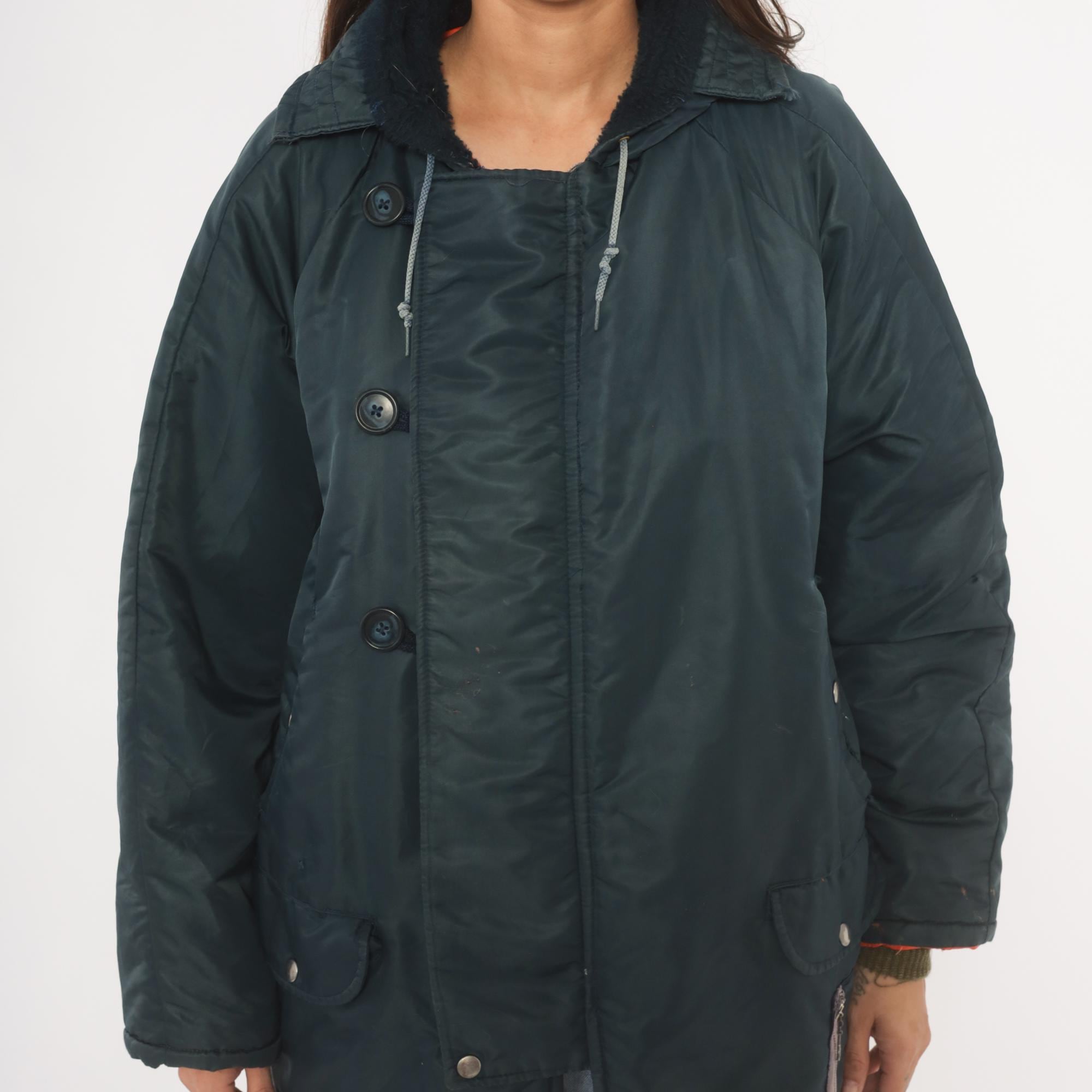 80s navy puffer parka with attached hood, drawstring closure at the neckline, and dark sherpa-lined collar. Button front placket with snap closures at the lower hem, two flap pockets at the hip. Orange lining visible at the cuffs and lower hem, with knit wrist cuffs underneath the sleeves.