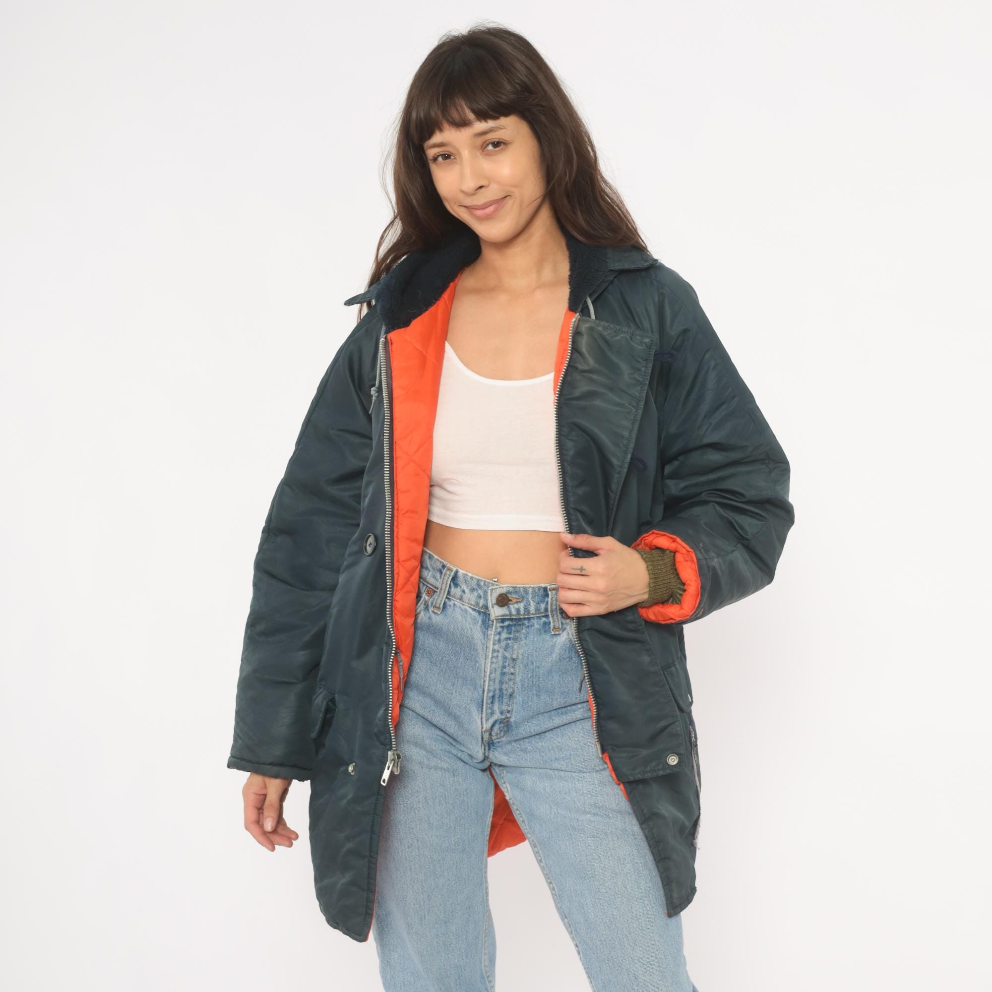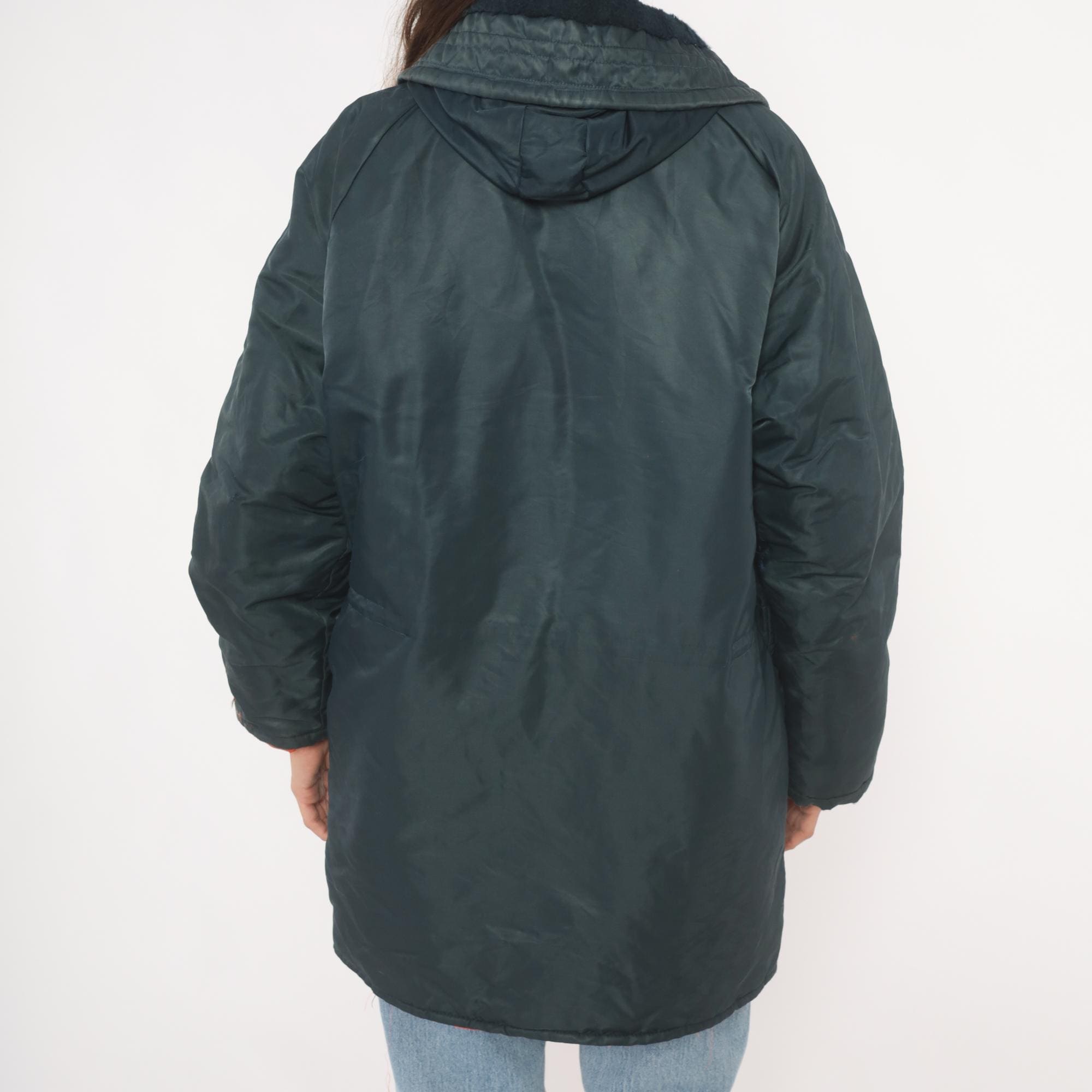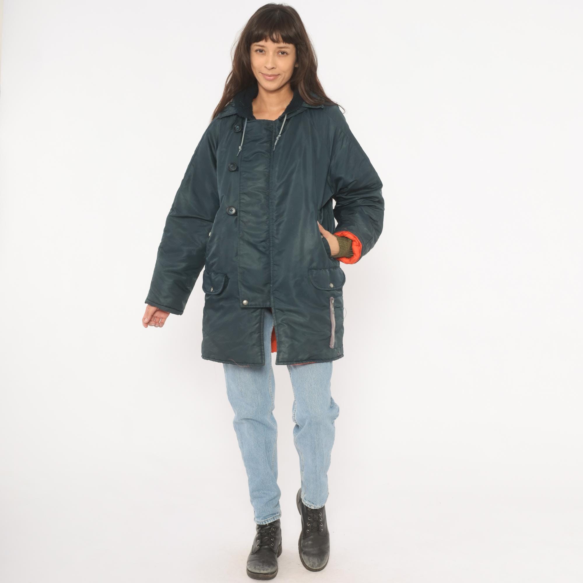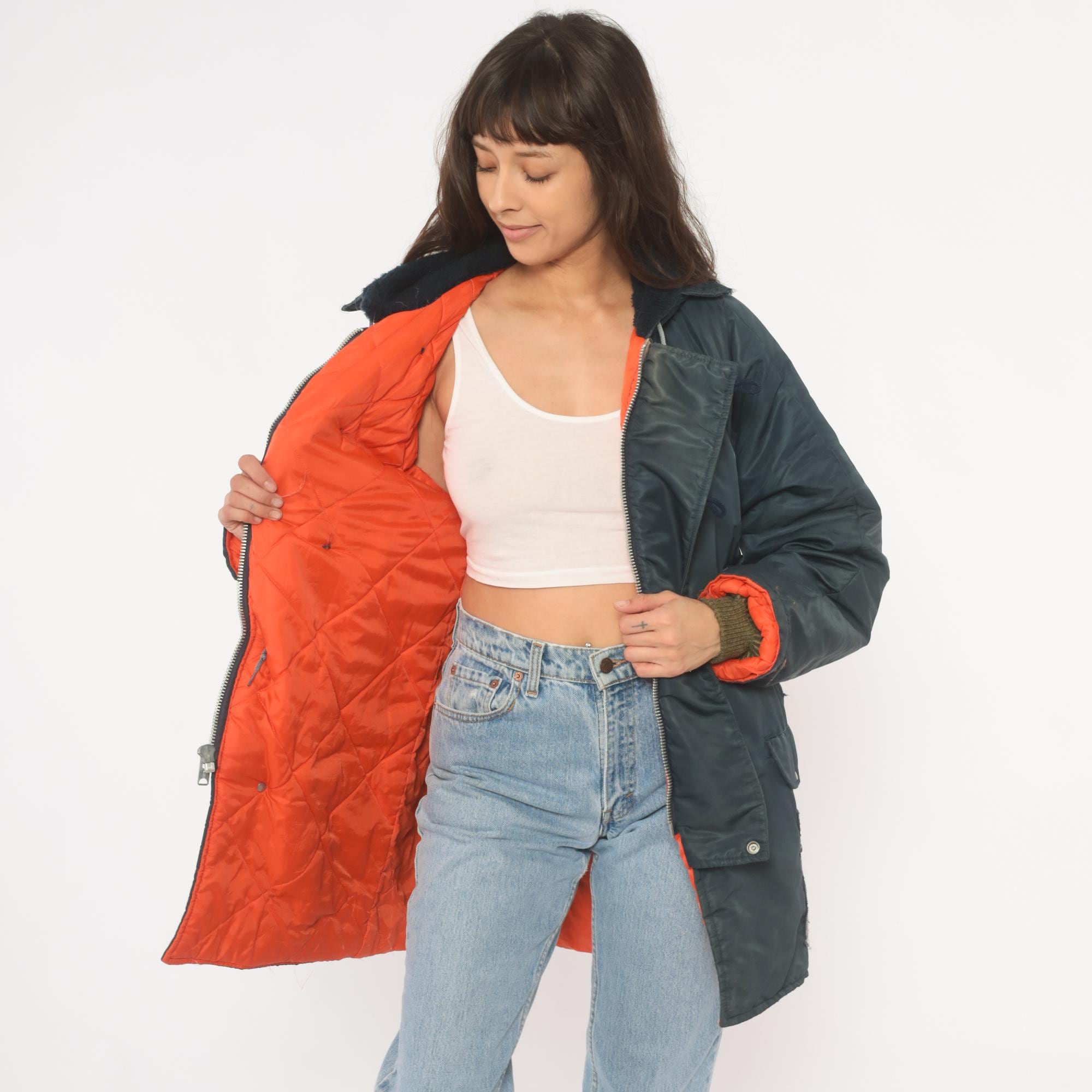 80s navy puffer parka with attached hood, drawstring closure at the neckline, and dark sherpa-lined collar. Button front placket with snap closures at the lower hem, two flap pockets at the hip. Orange lining visible at the cuffs and lower hem, with knit wrist cuffs underneath the sleeves.