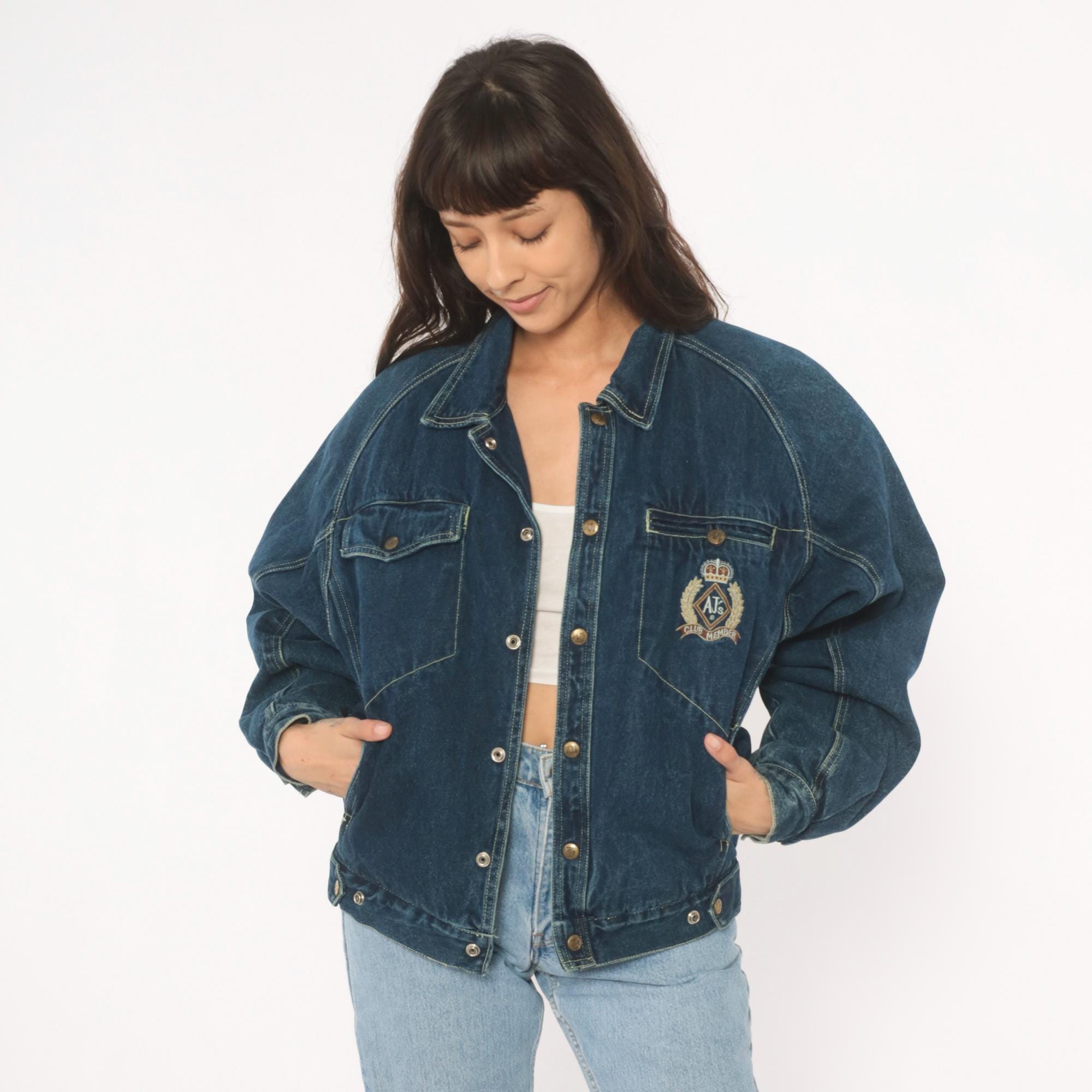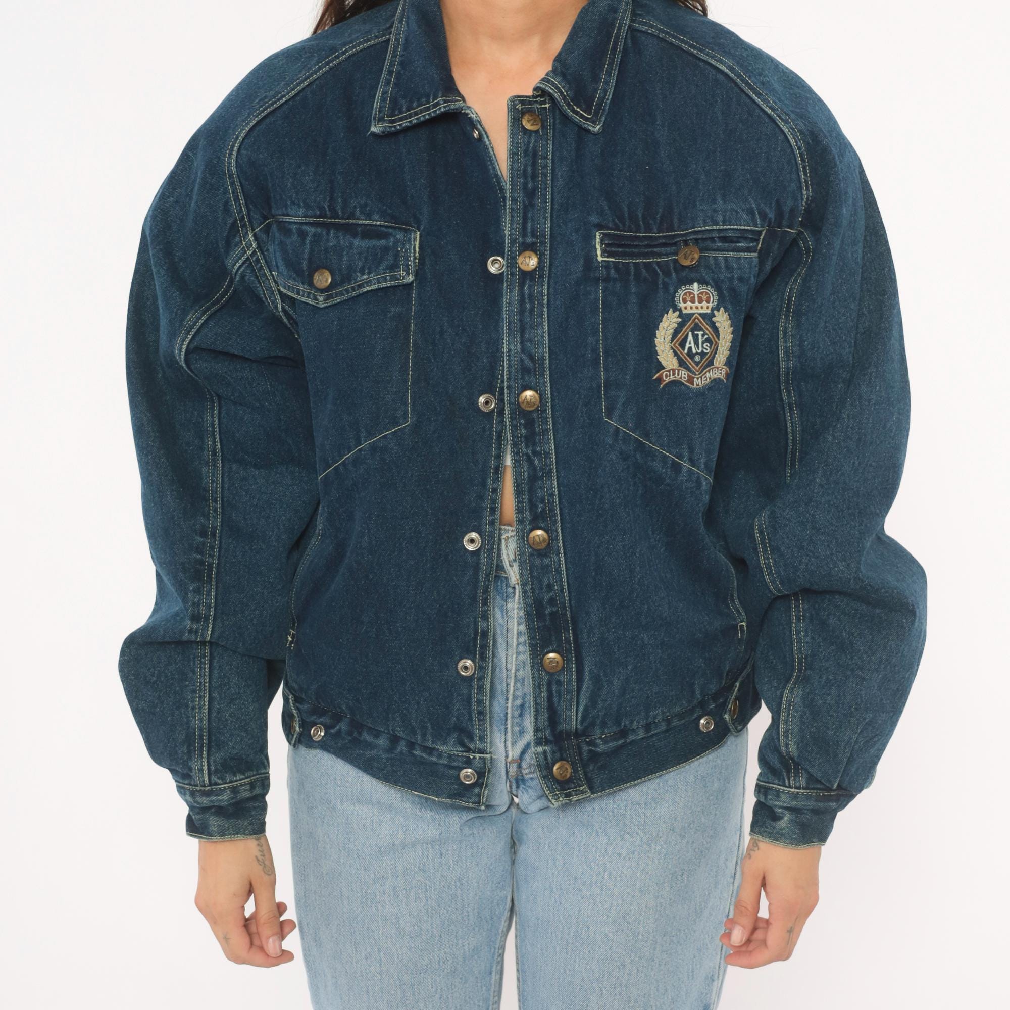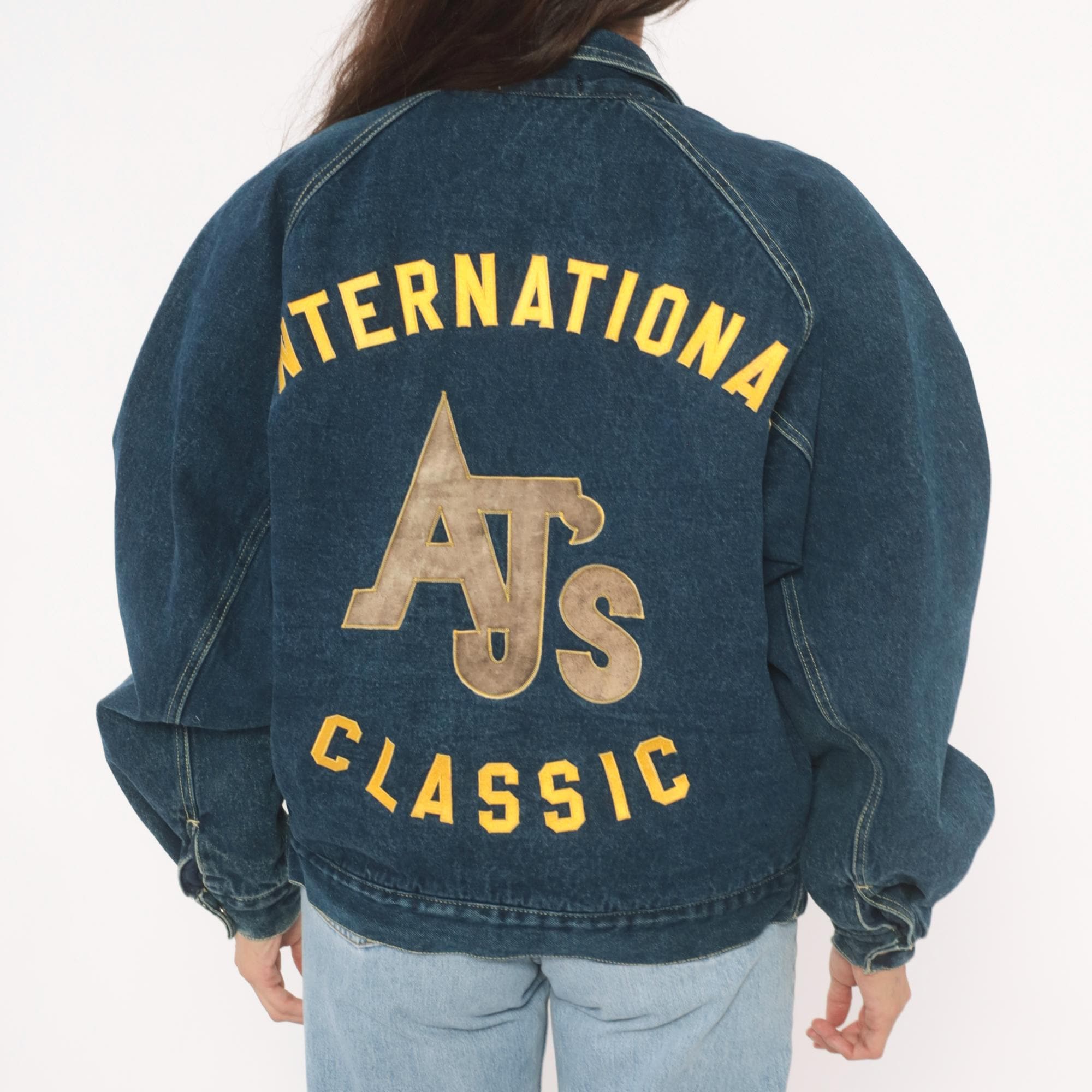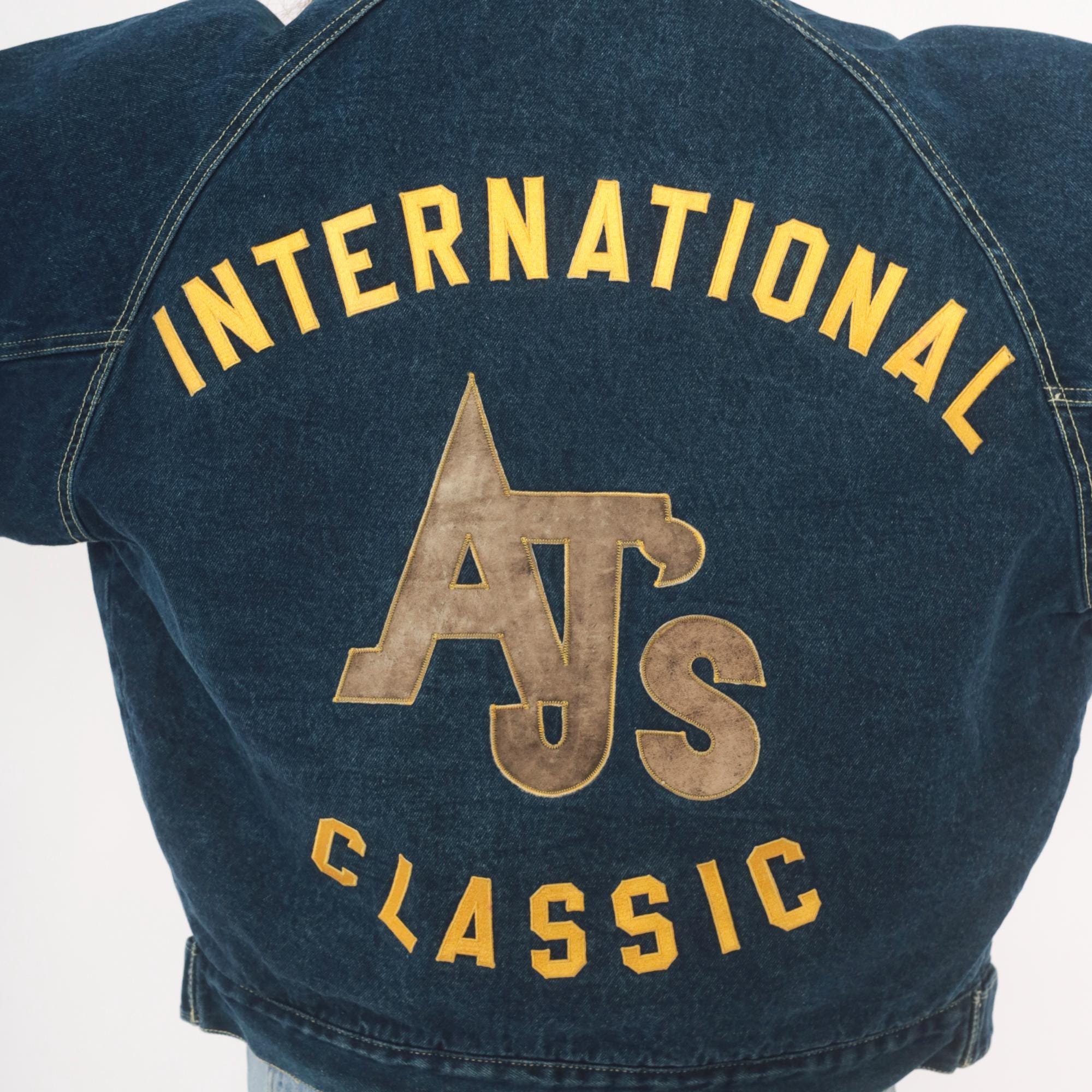 90s dark wash denim jacket from AJs with large gold and tan "ATJS International Classic" appliqué lettering across the back. Embroidered crest logo on the left chest reads "AJs Club Member" with a crown and laurel wreath detail. Snap button front closure, two flap chest pockets, pointed collar, and side snap tabs at the waist. Dropped shoulders with a boxy, relaxed silhouette and tapered cuffs.