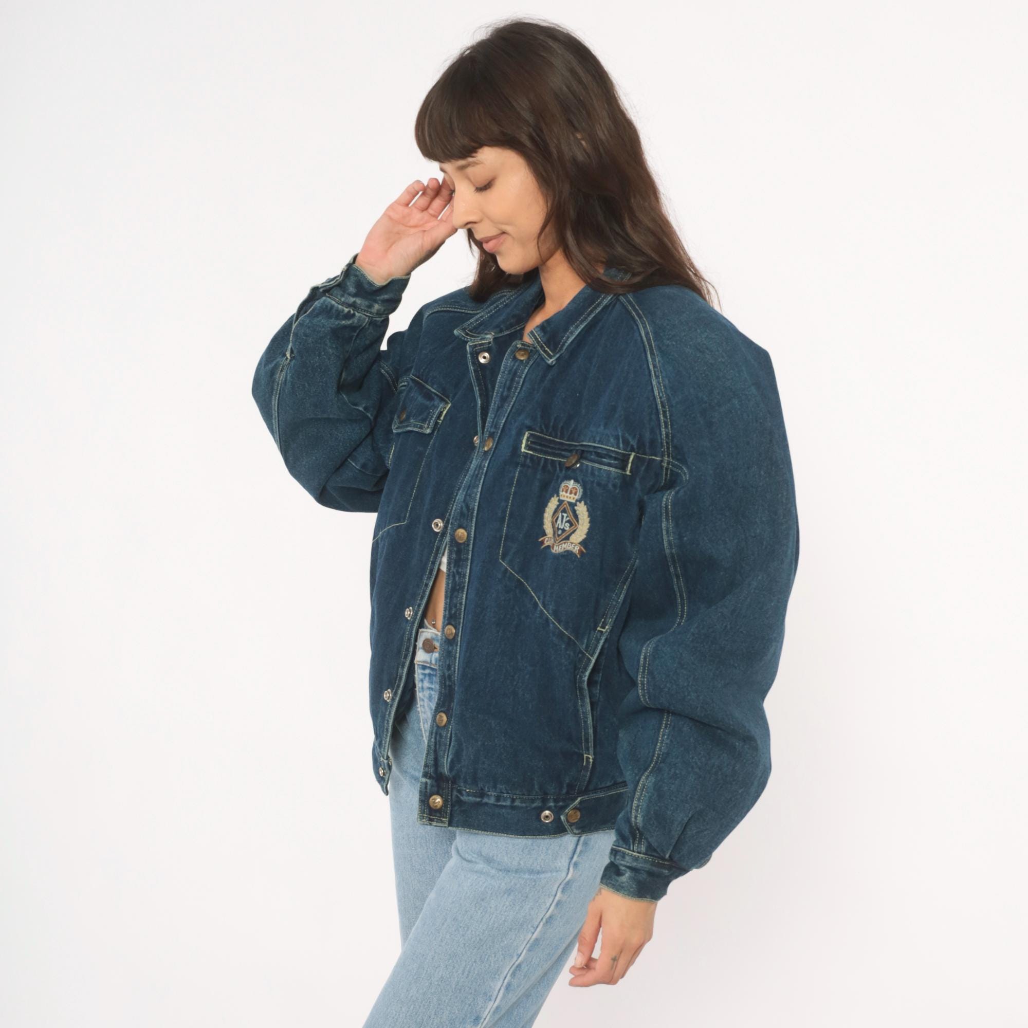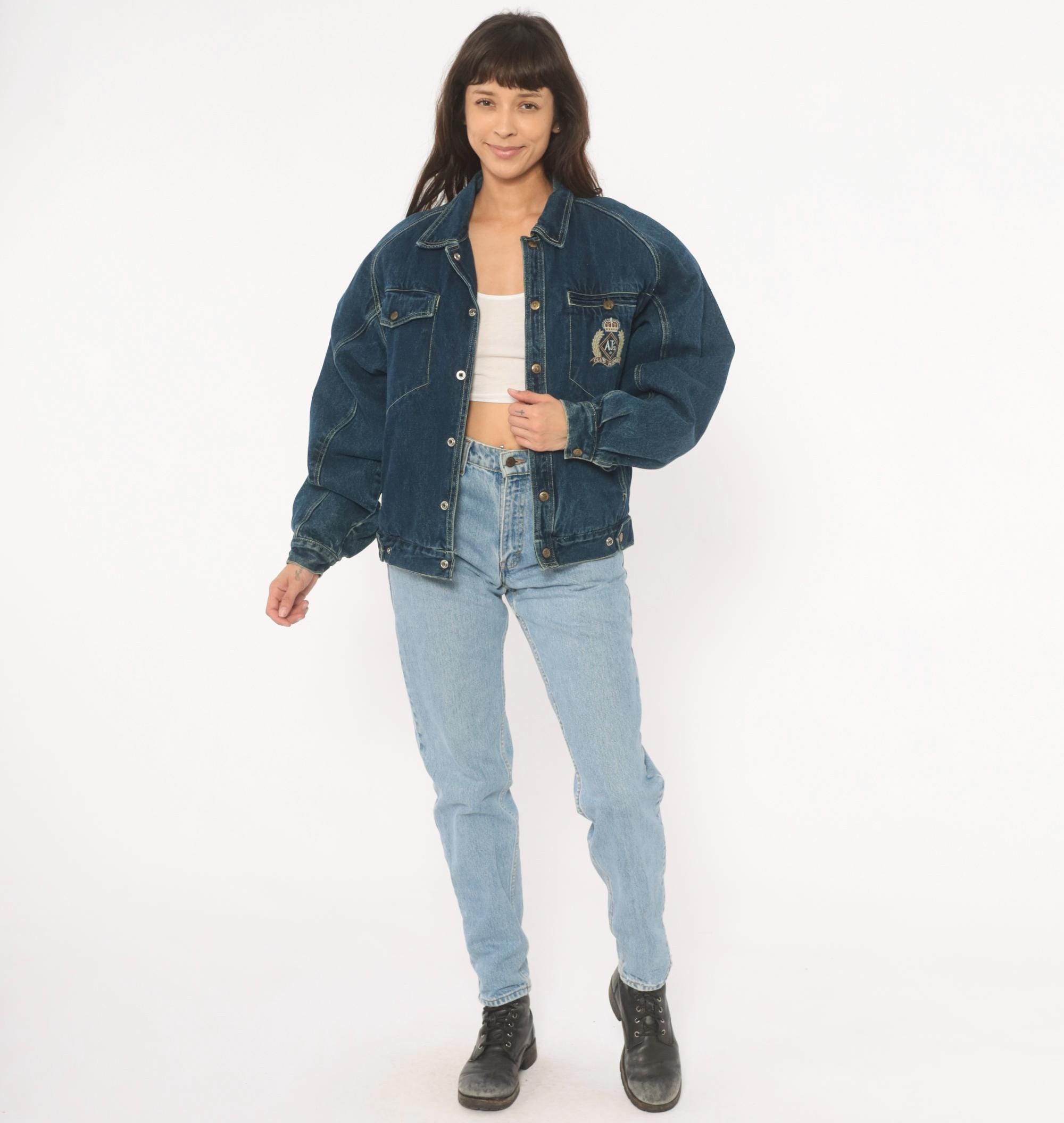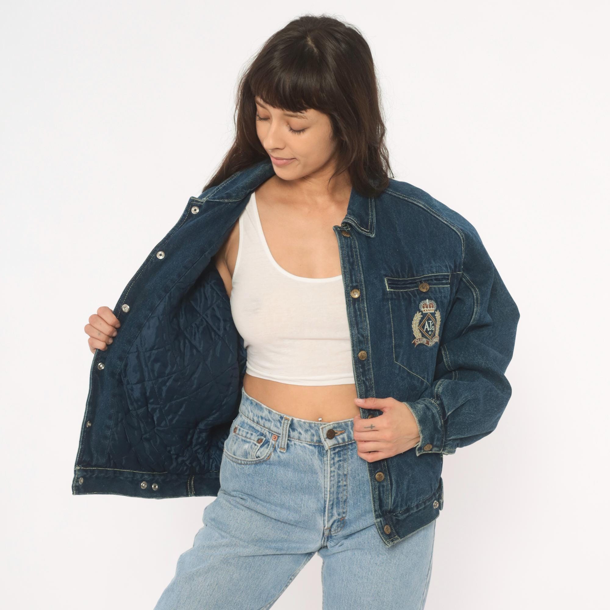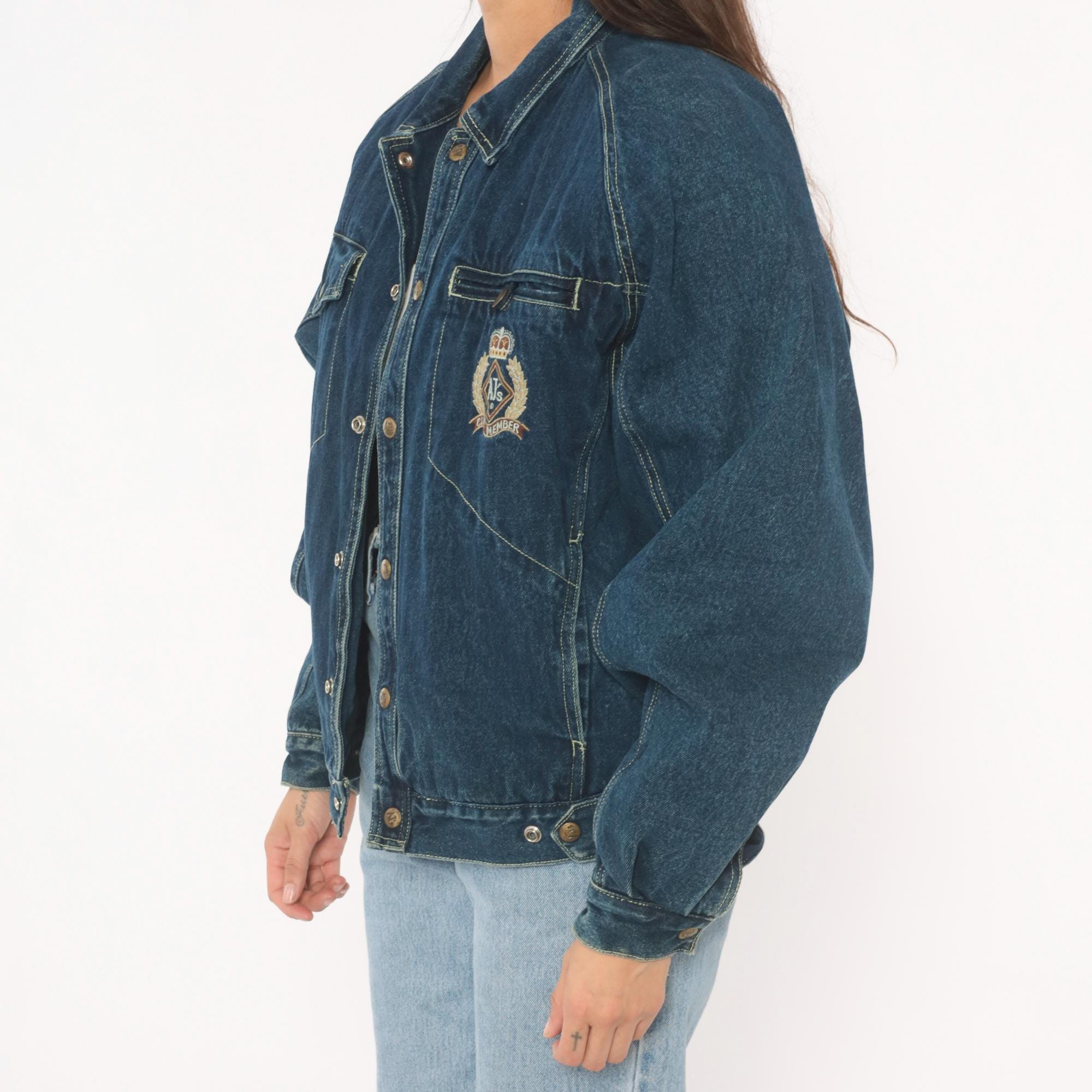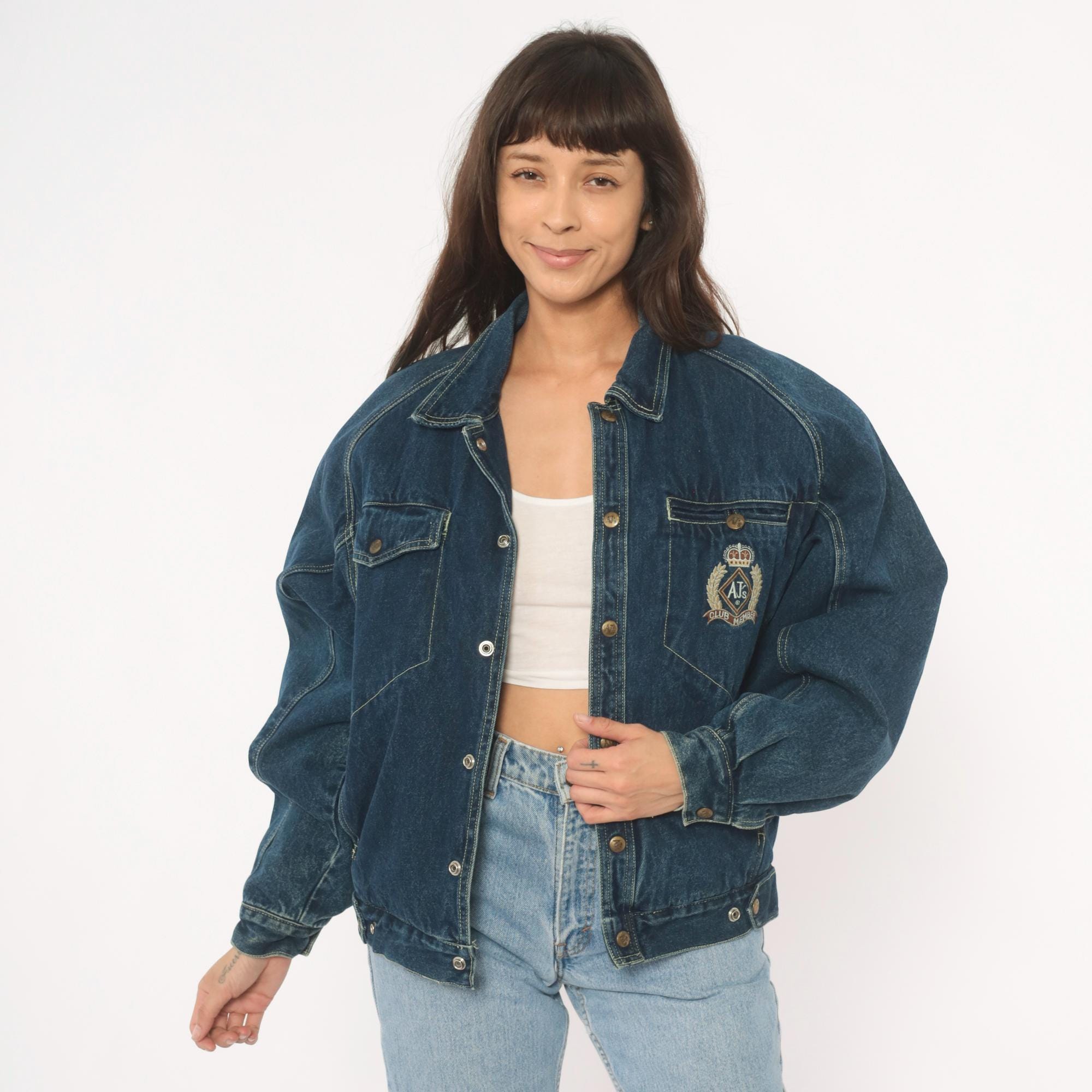 90s dark wash denim jacket from AJs with large gold and tan "ATJS International Classic" appliqué lettering across the back. Embroidered crest logo on the left chest reads "AJs Club Member" with a crown and laurel wreath detail. Snap button front closure, two flap chest pockets, pointed collar, and side snap tabs at the waist. Dropped shoulders with a boxy, relaxed silhouette and tapered cuffs.