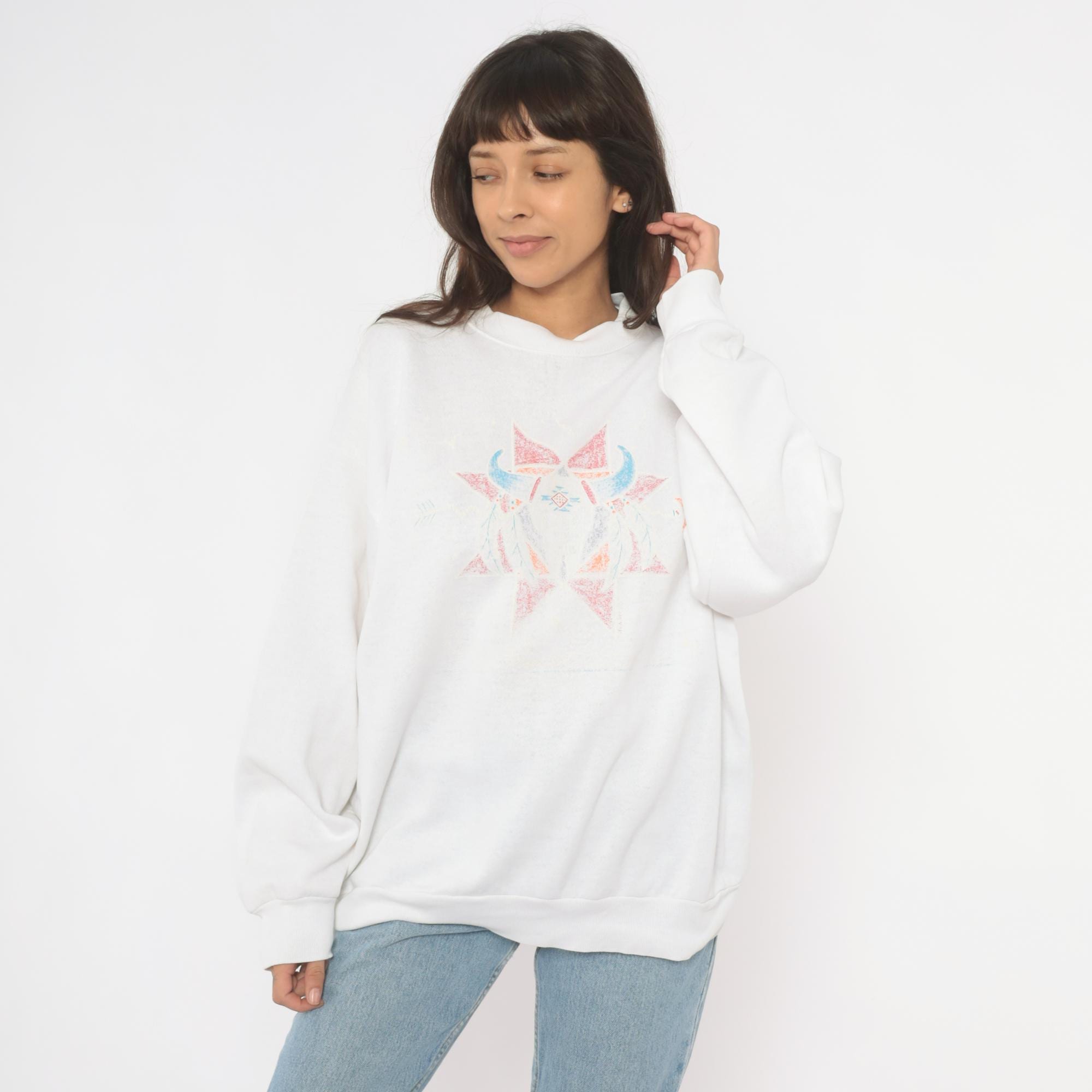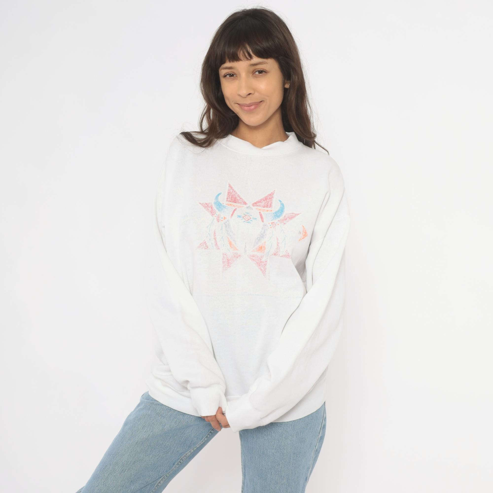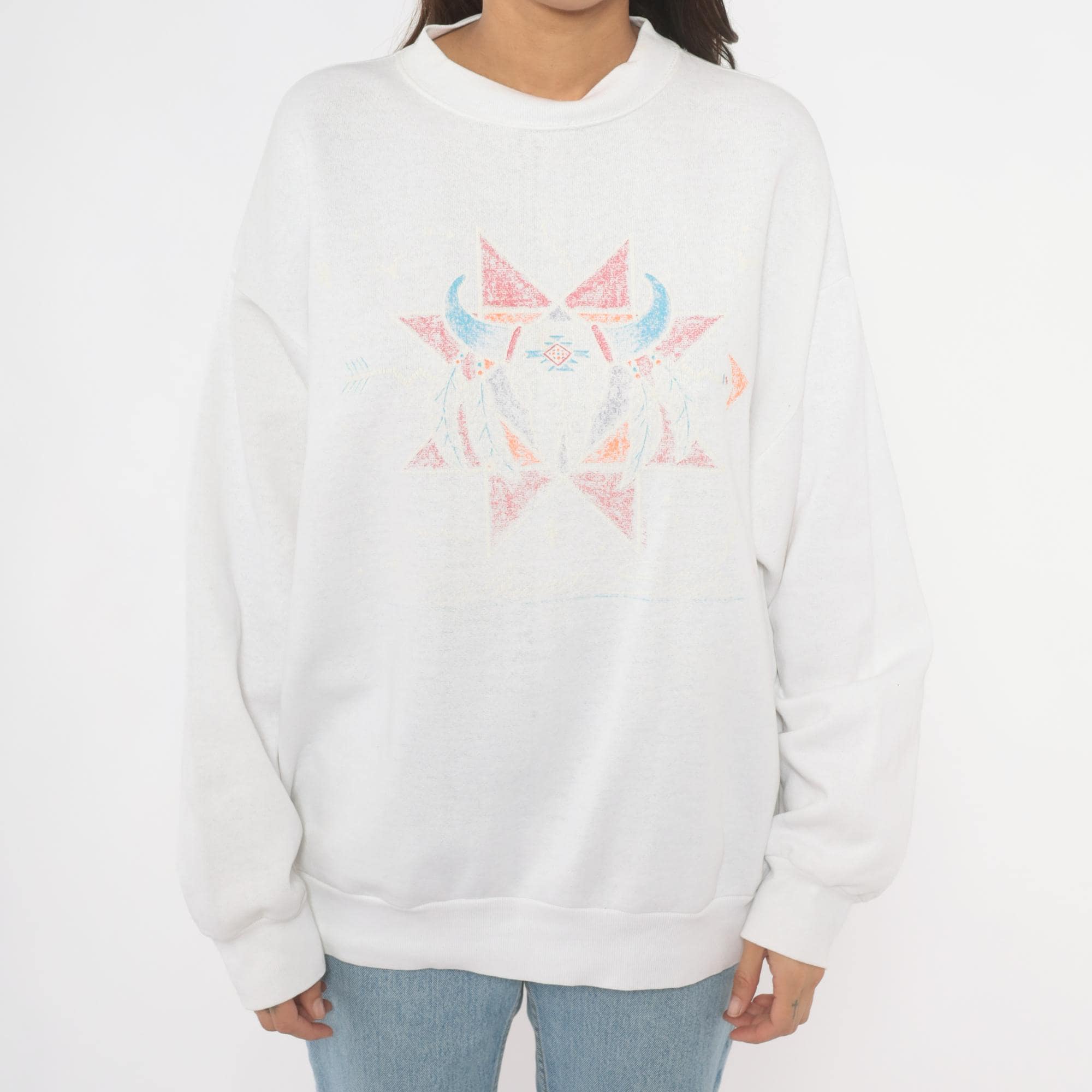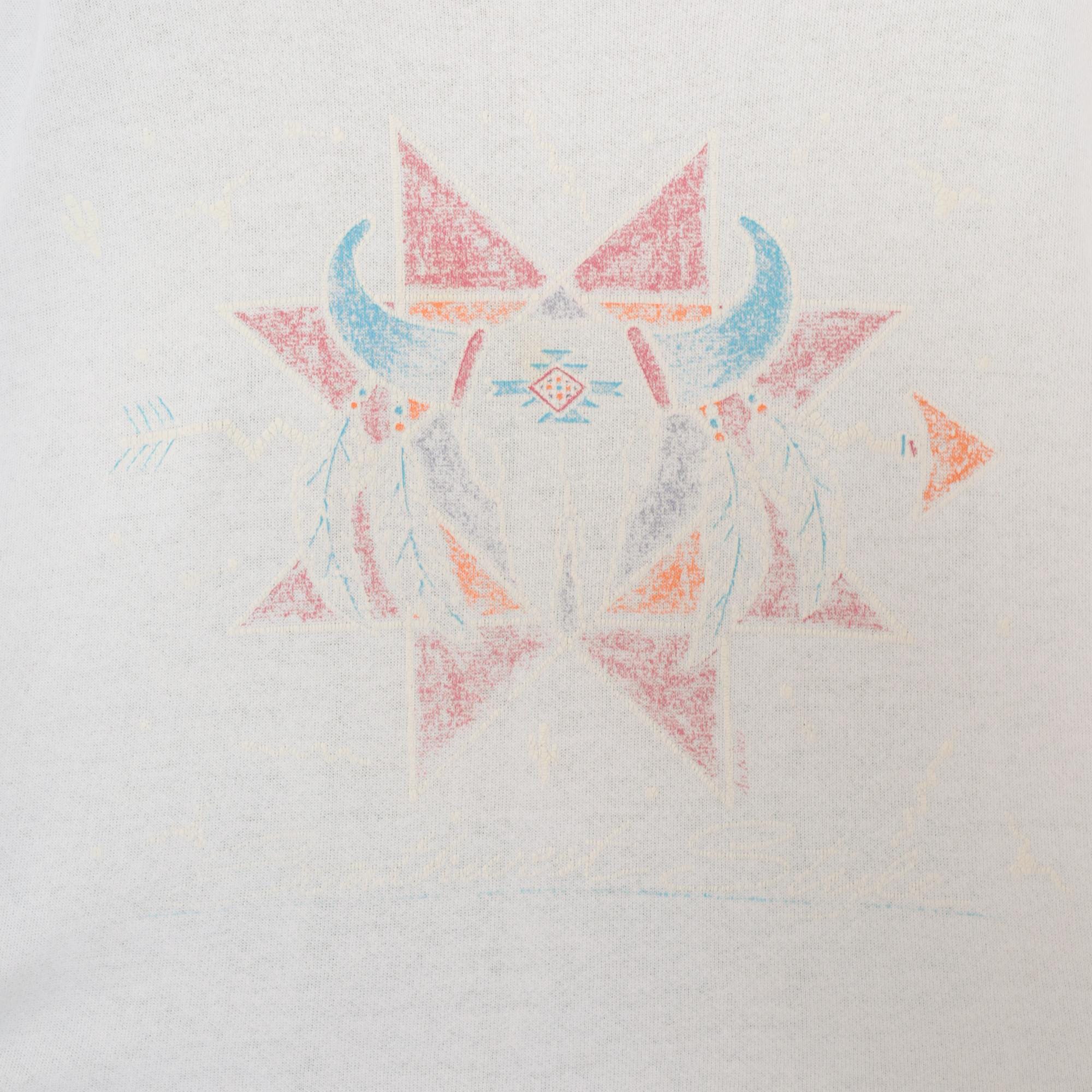 90s white crewneck sweatshirt with a symmetrical Southwestern-style geometric star print in faded pink, blue, orange, and gray across the chest. Has a bull skull in front of the star. Ribbed crew neckline, cuffs, and waistband with a relaxed boxy fit throughout the body.
