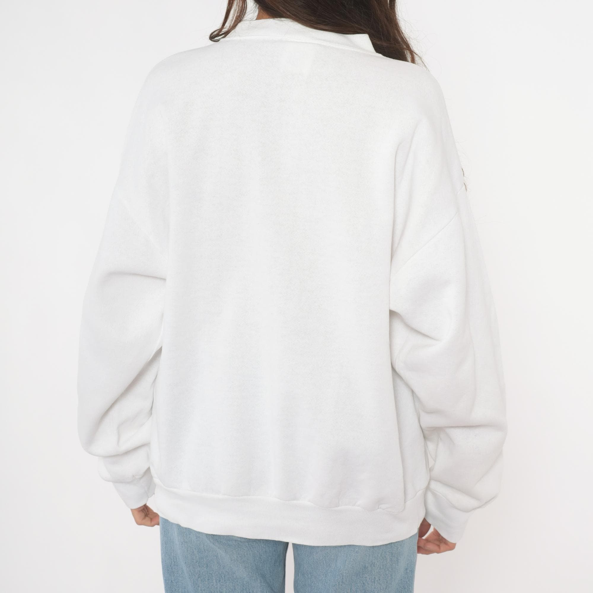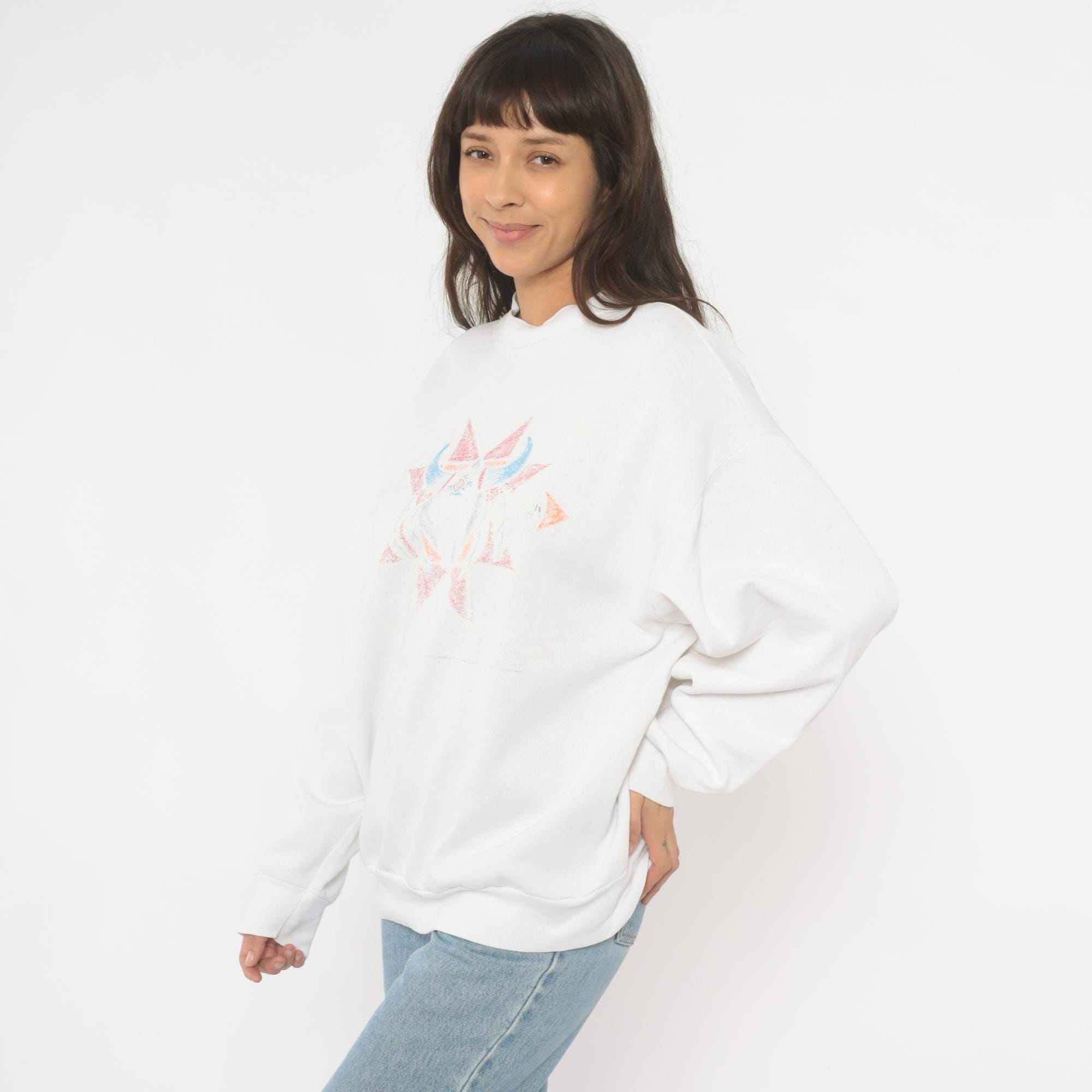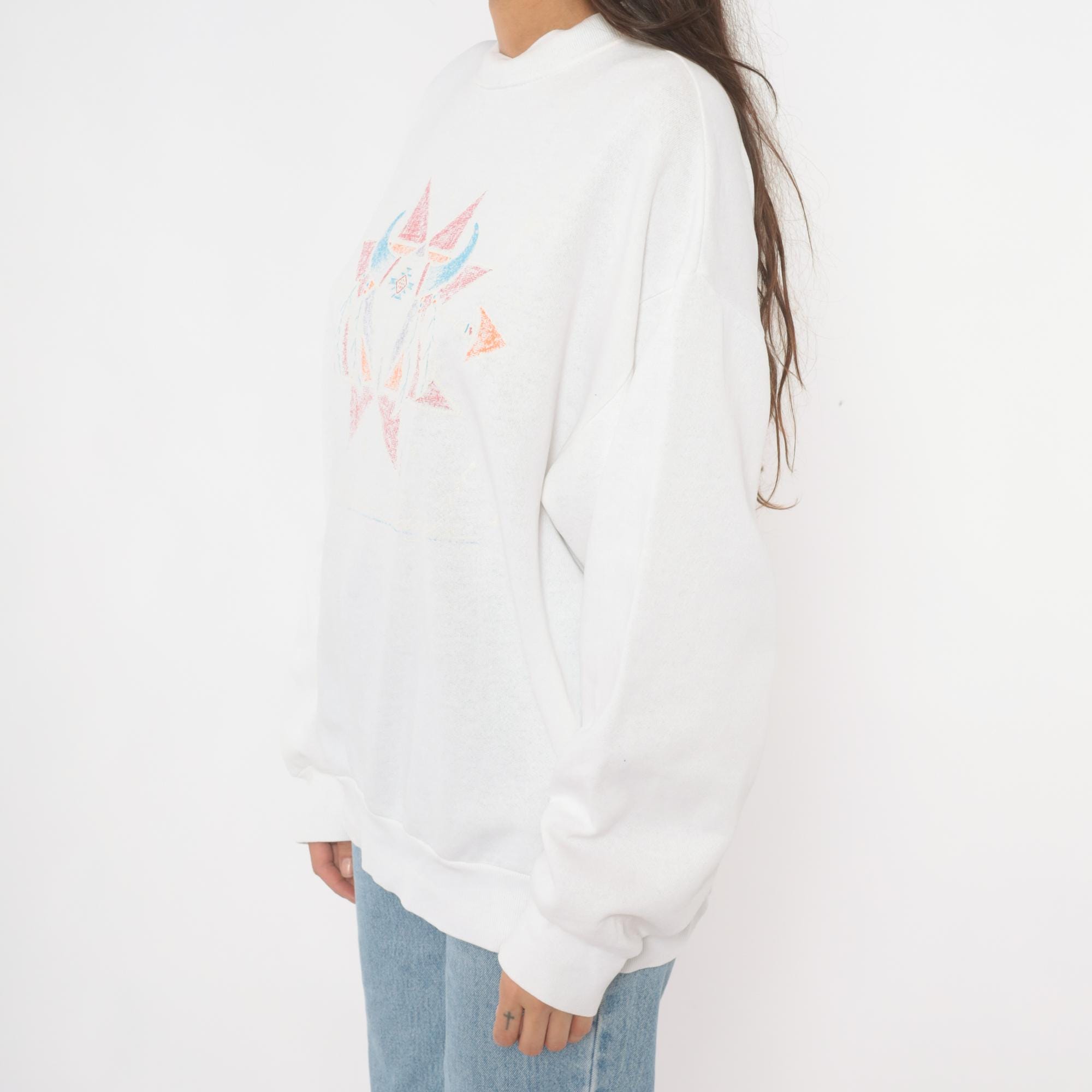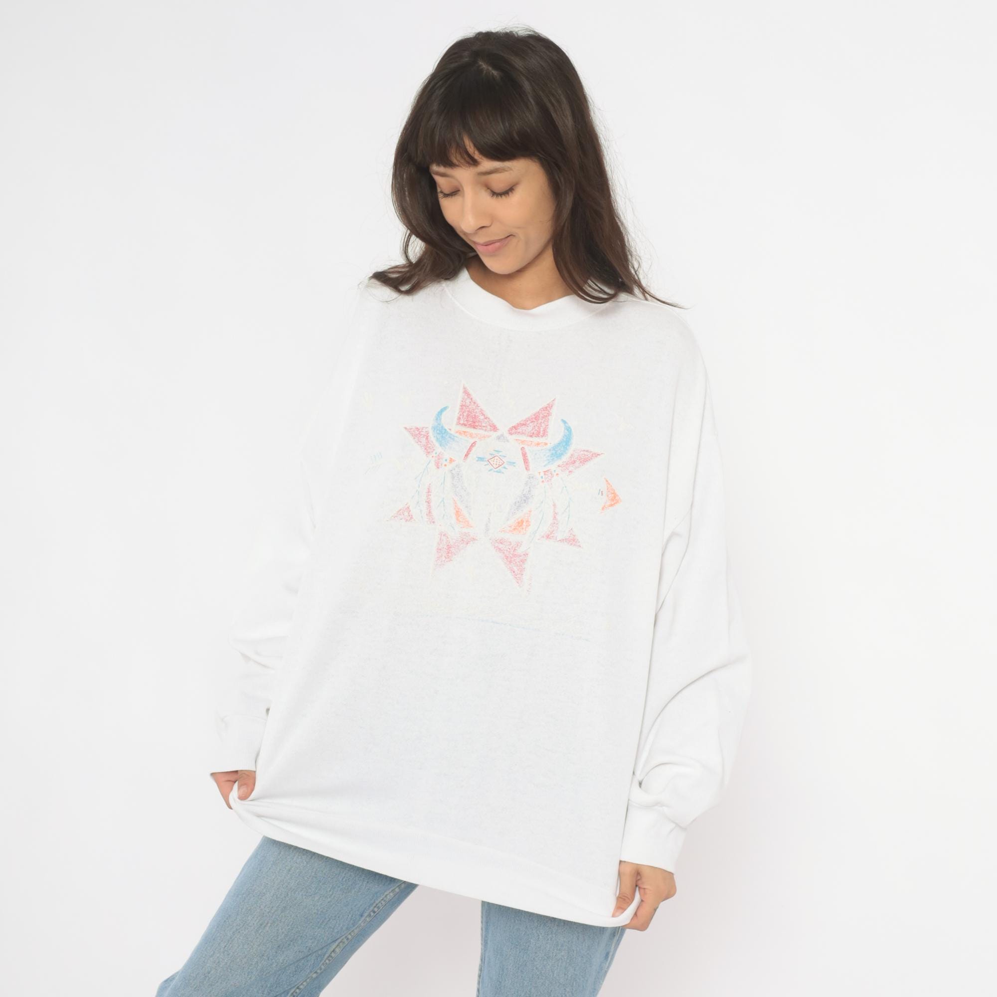 90s white crewneck sweatshirt with a symmetrical Southwestern-style geometric star print in faded pink, blue, orange, and gray across the chest. Has a bull skull in front of the star. Ribbed crew neckline, cuffs, and waistband with a relaxed boxy fit throughout the body.