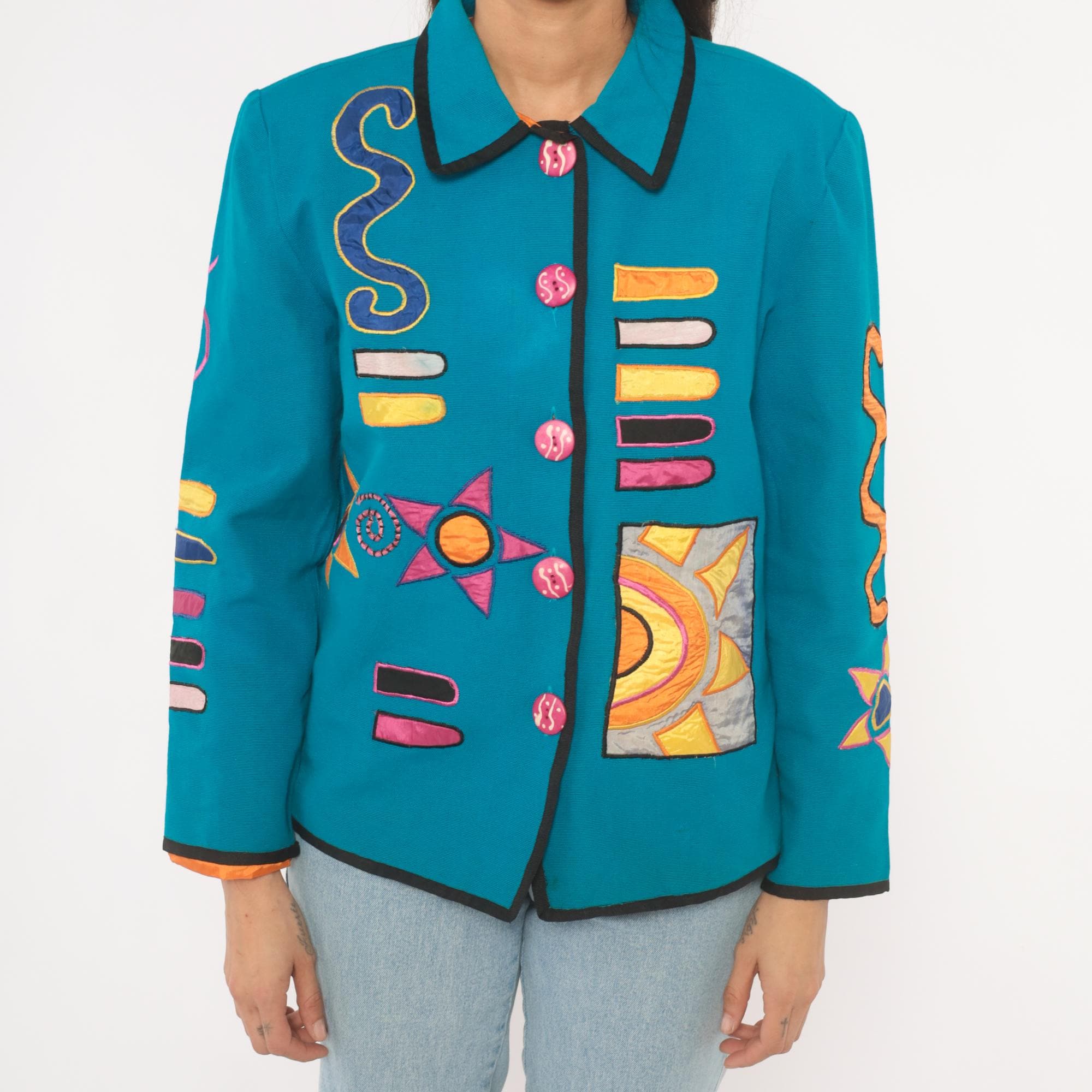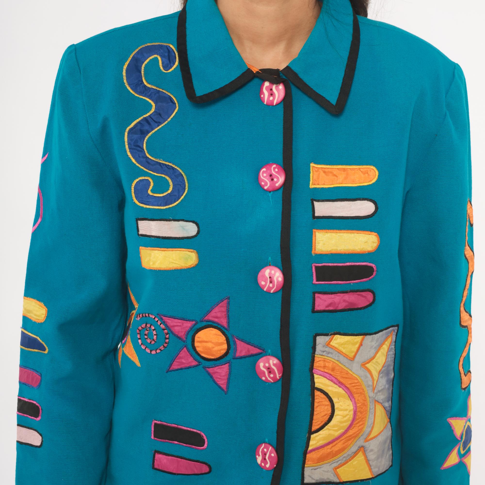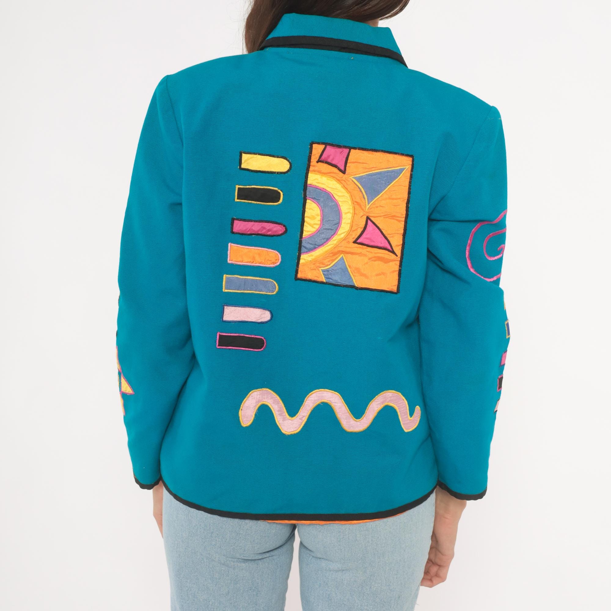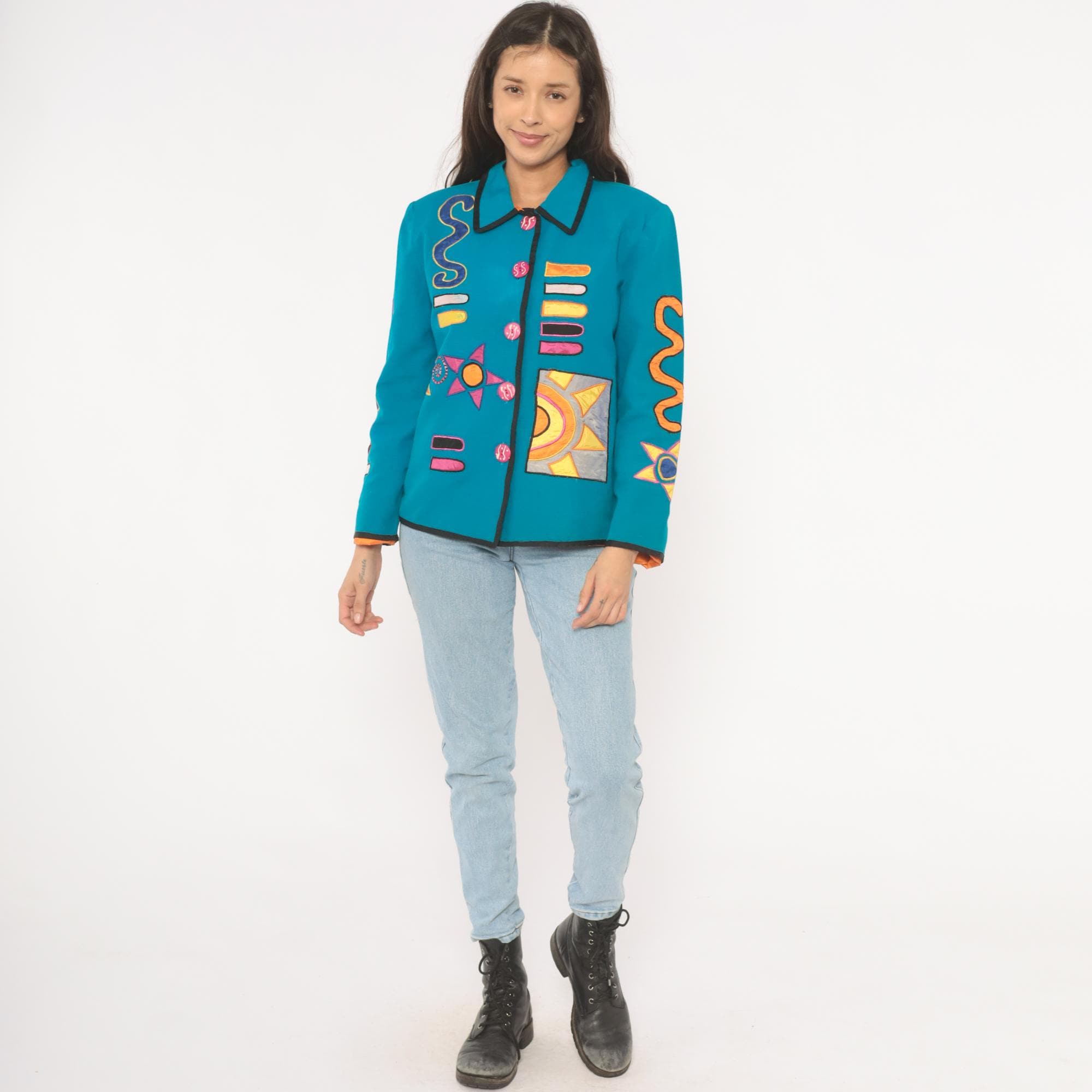 90s teal blazer from Julia Kim with colorful appliqué patchwork across the front, back, and sleeves. Abstract sun, star, and squiggle motifs in orange, pink, navy, yellow, and lavender with satin-like fabric patches. Black contrast piping along the collar, front placket, cuffs, and hem.