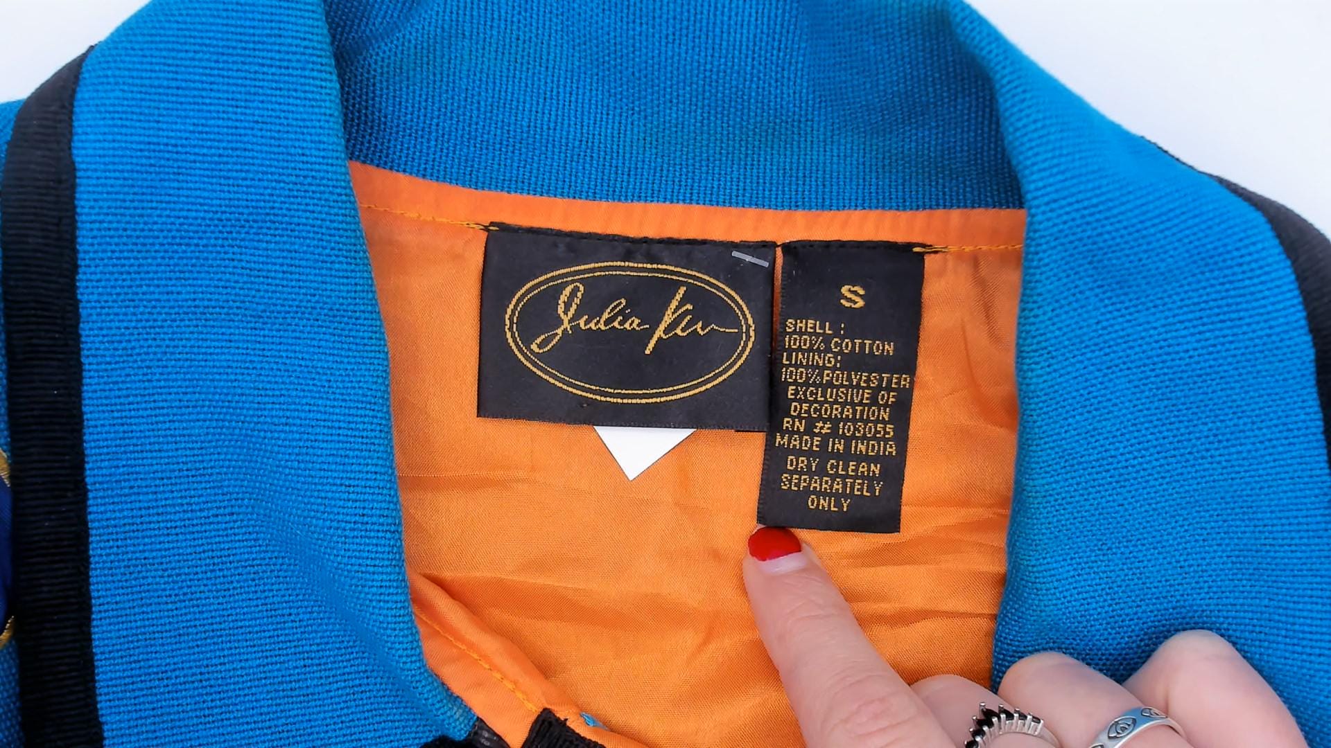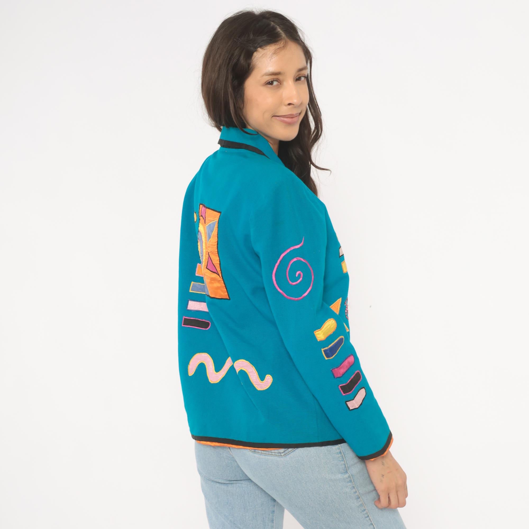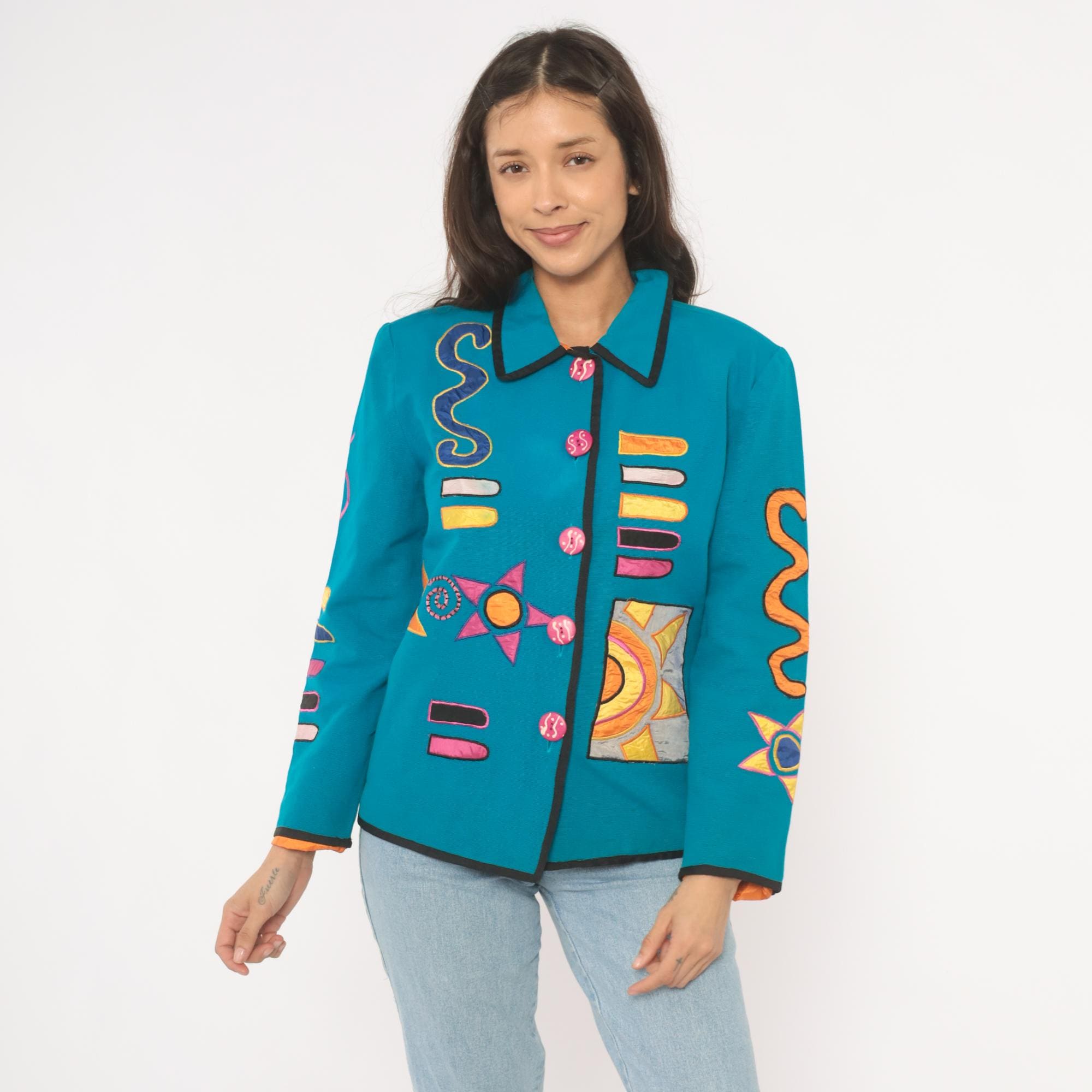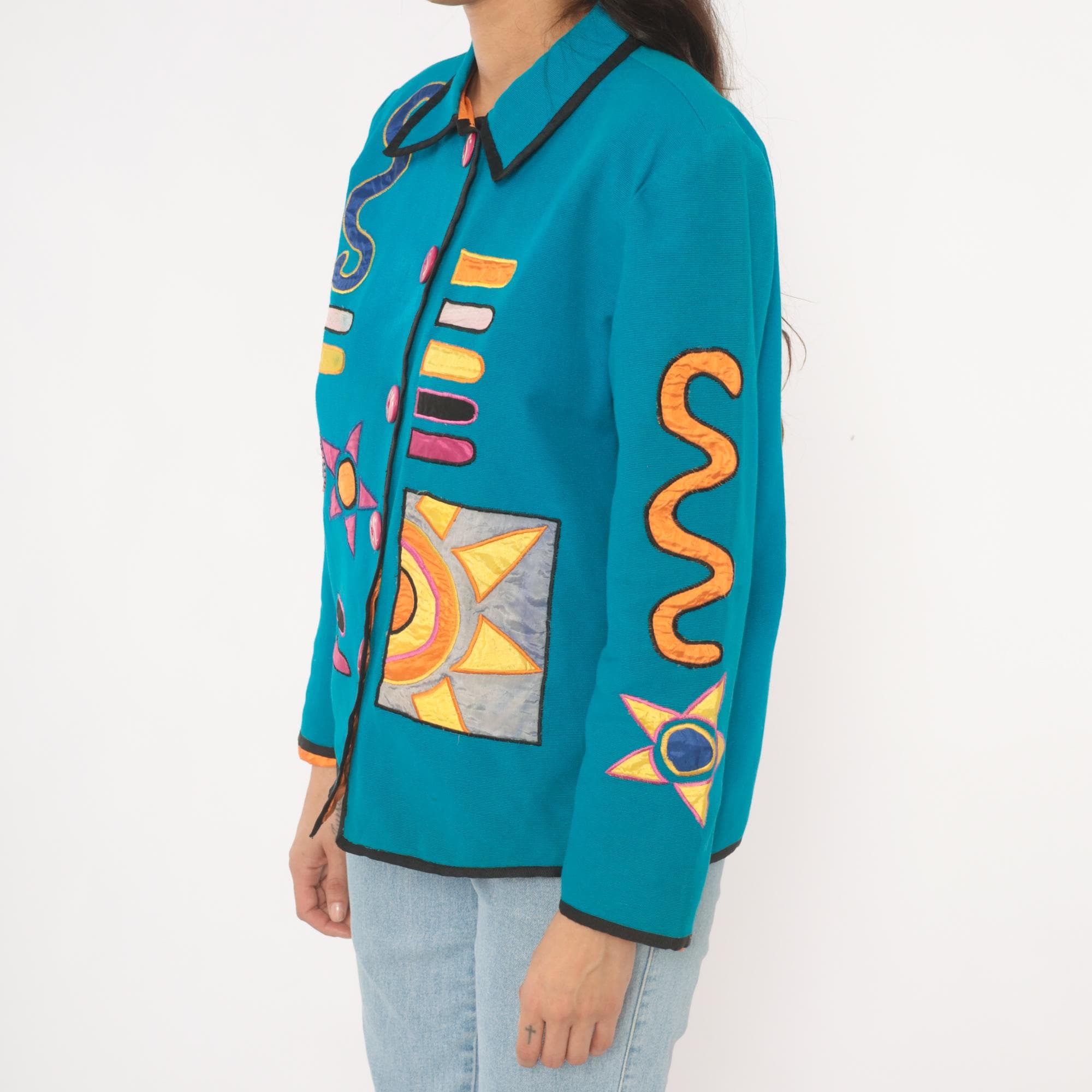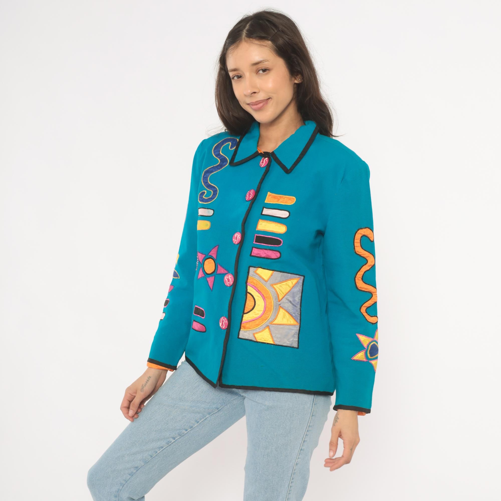 90s teal blazer from Julia Kim with colorful appliqué patchwork across the front, back, and sleeves. Abstract sun, star, and squiggle motifs in orange, pink, navy, yellow, and lavender with satin-like fabric patches. Black contrast piping along the collar, front placket, cuffs, and hem.