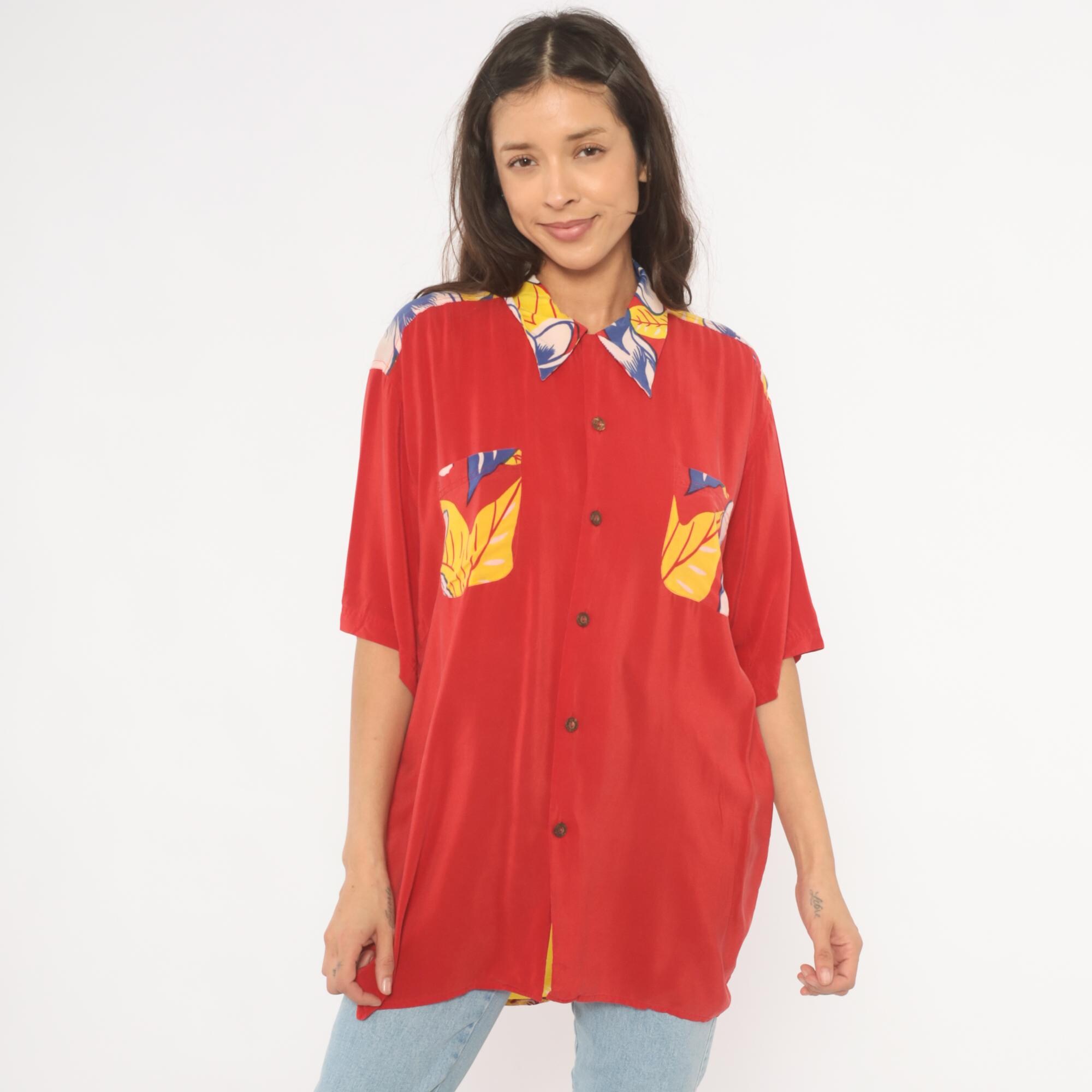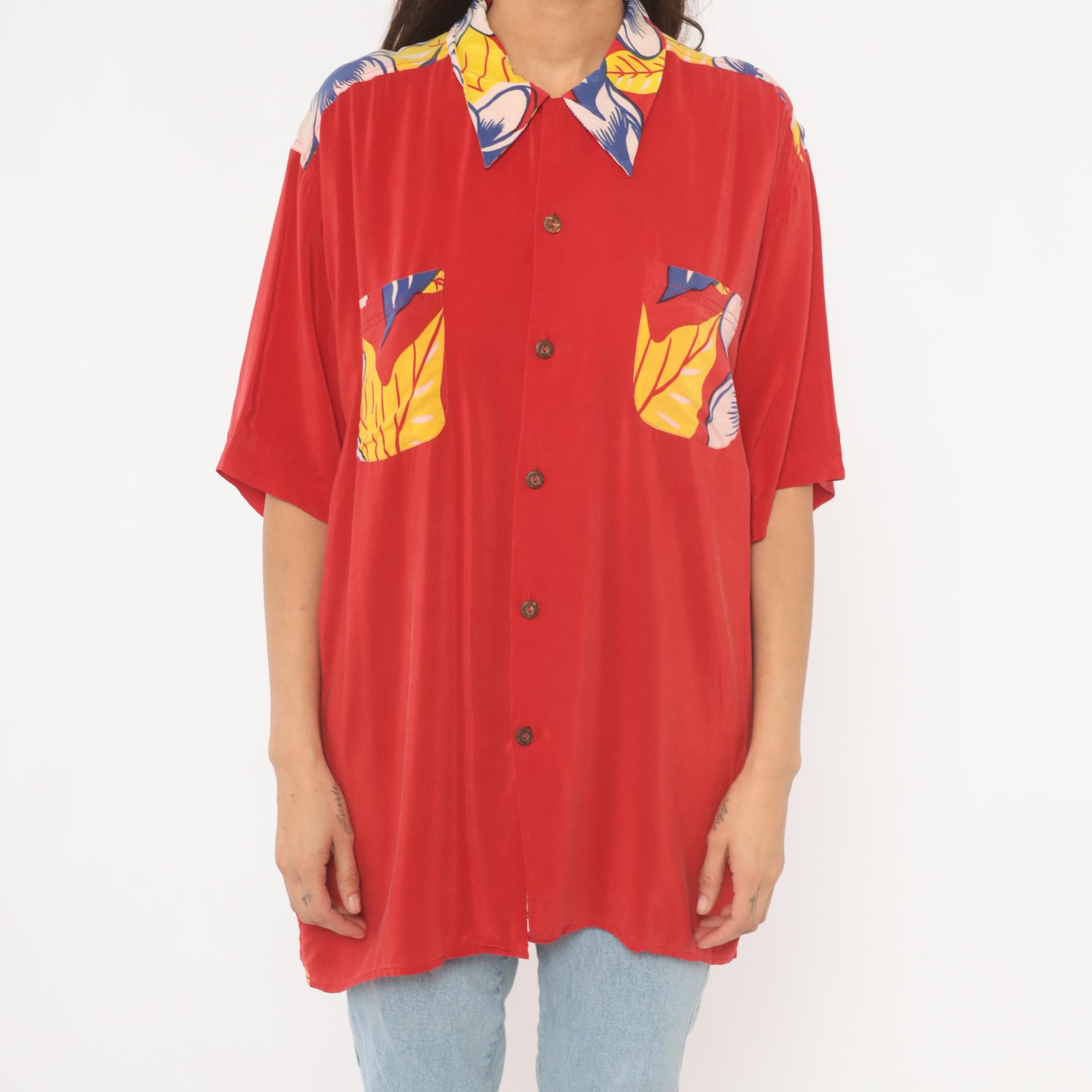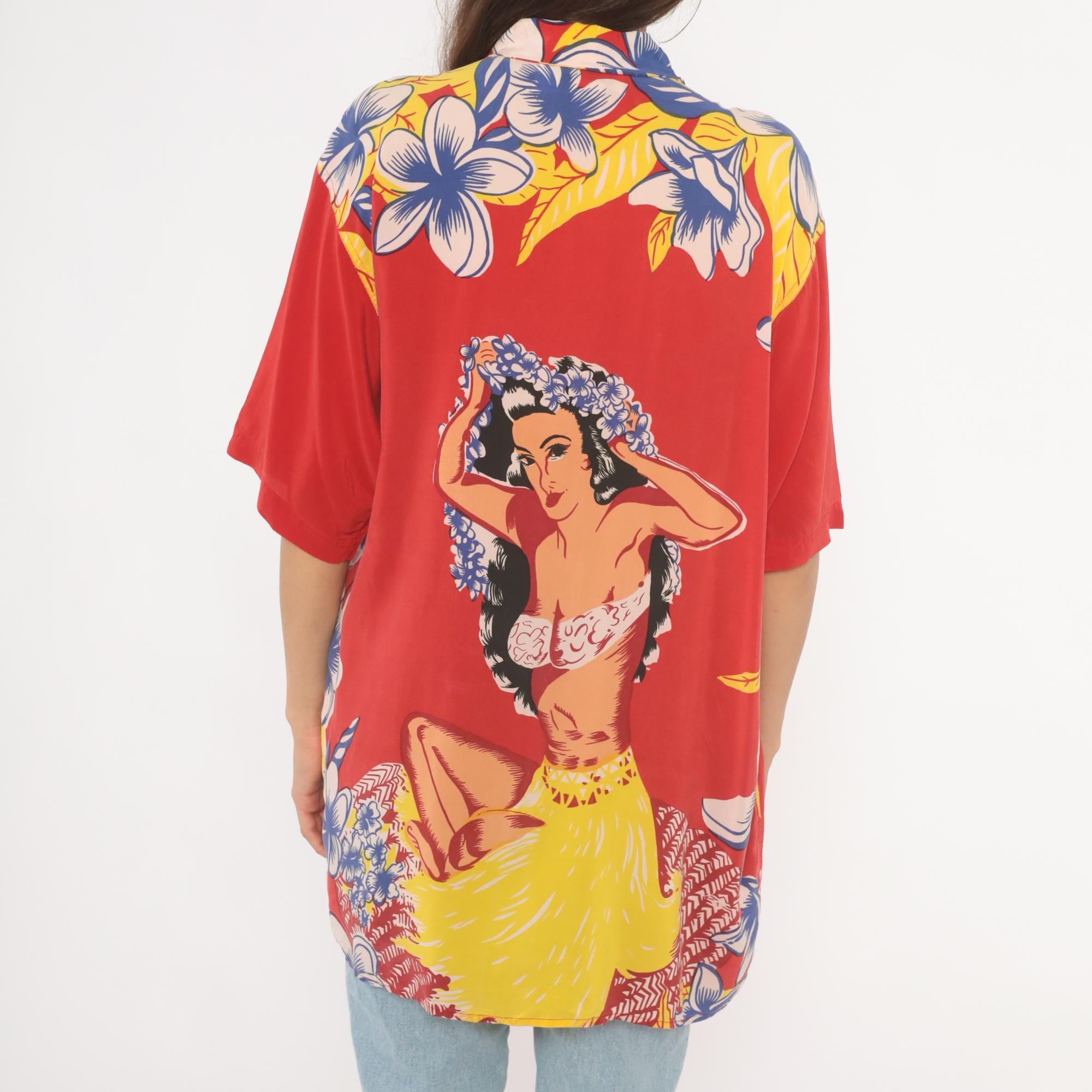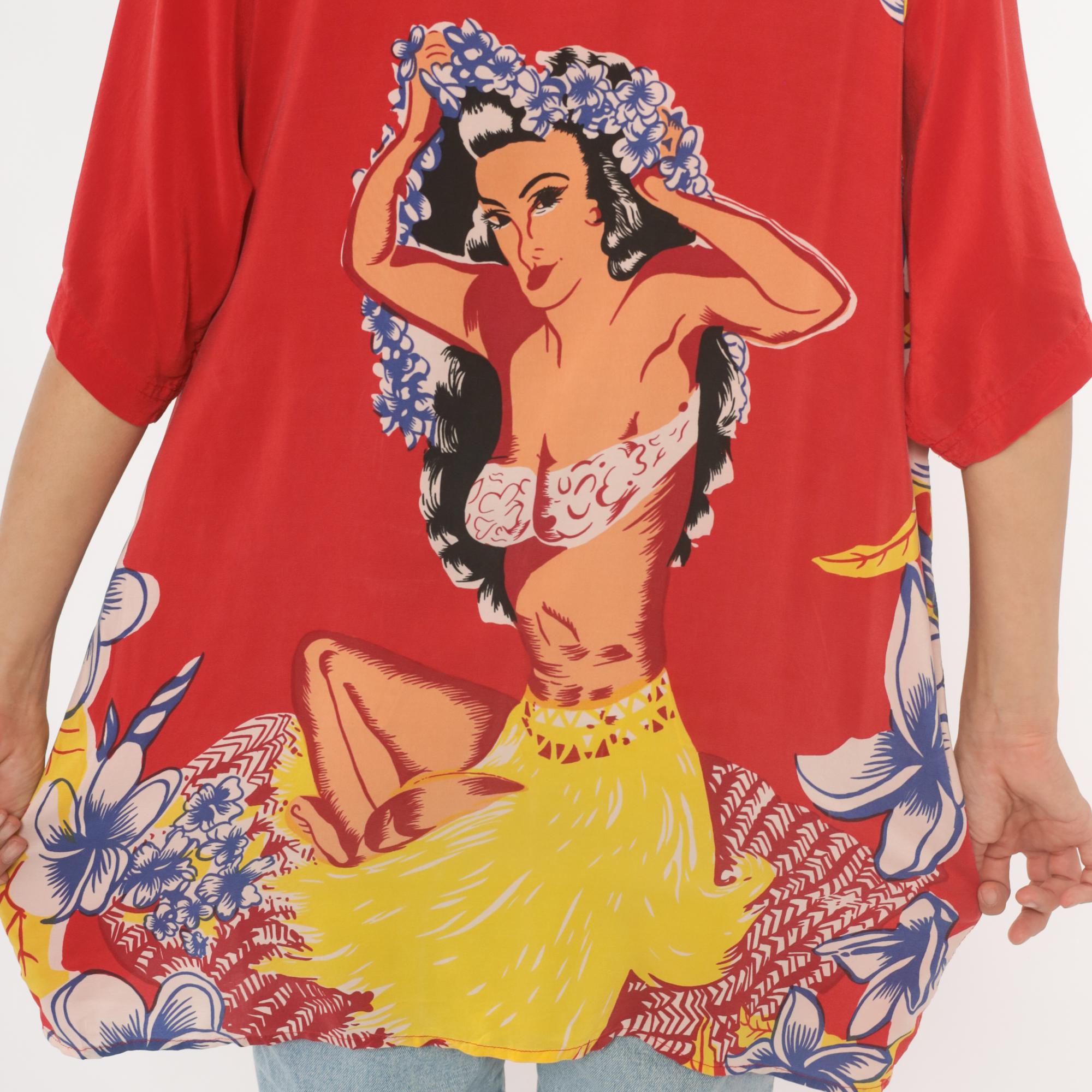 90s red Avanti Hawaiian shirt with a large hula girl illustration printed across the back, surrounded by plumeria flowers and tropical foliage in blue, yellow, and pink. Button front closure with coconut-style buttons, camp collar with floral print, and short sleeves. Two chest pockets with matching floral print detail. Predominantly red base with the front kept relatively plain and the back dominated by the pin-up style graphic in a yellow grass skirt and lei.