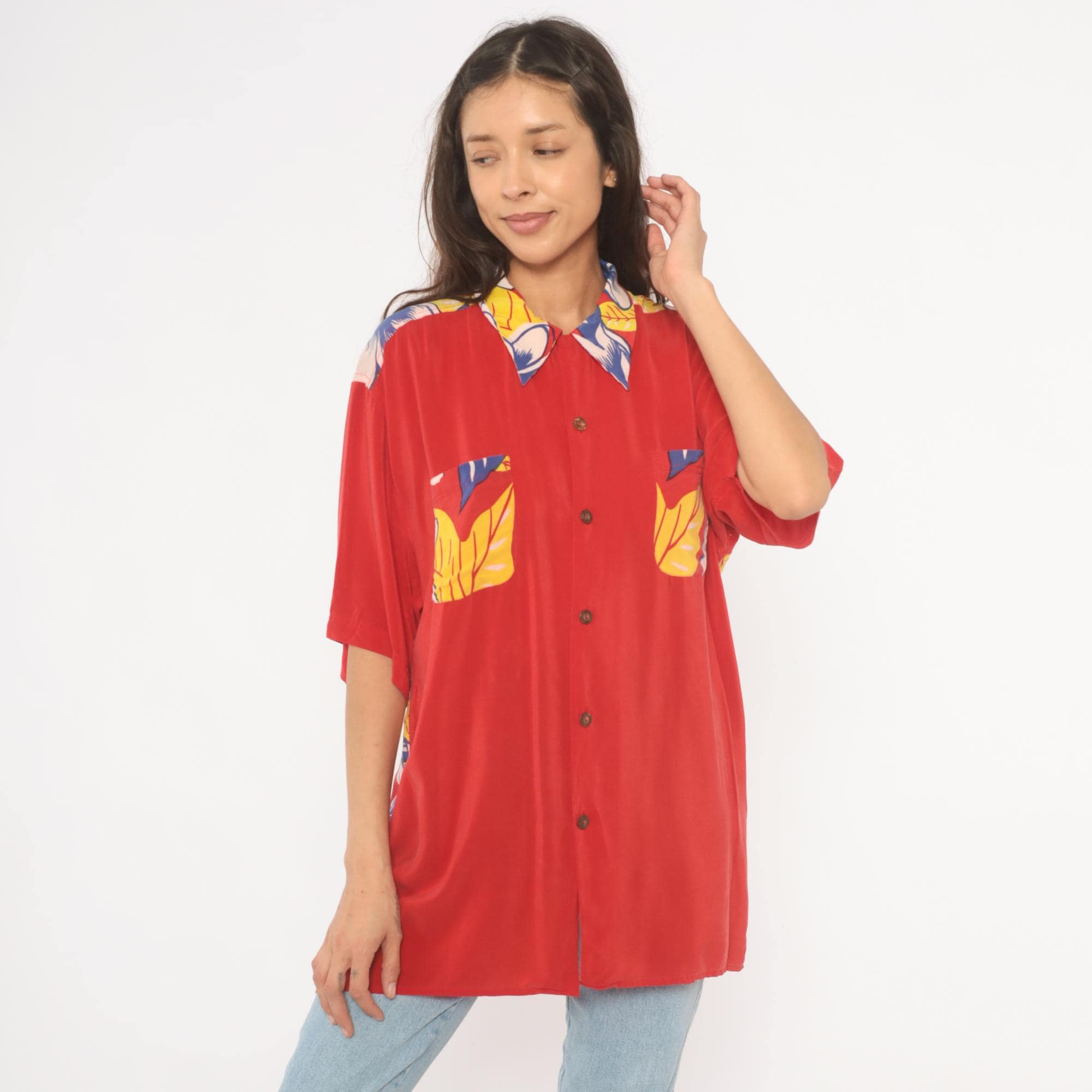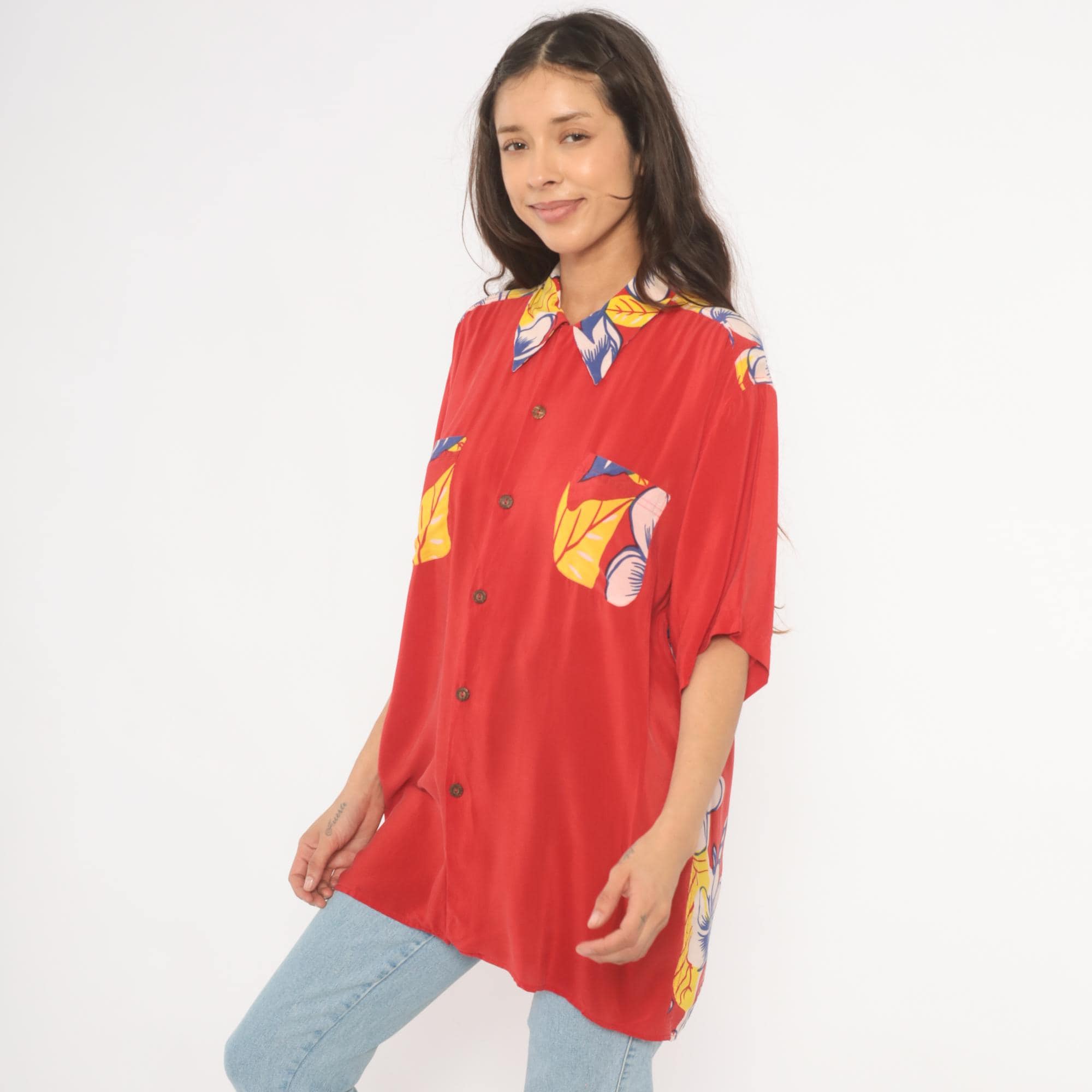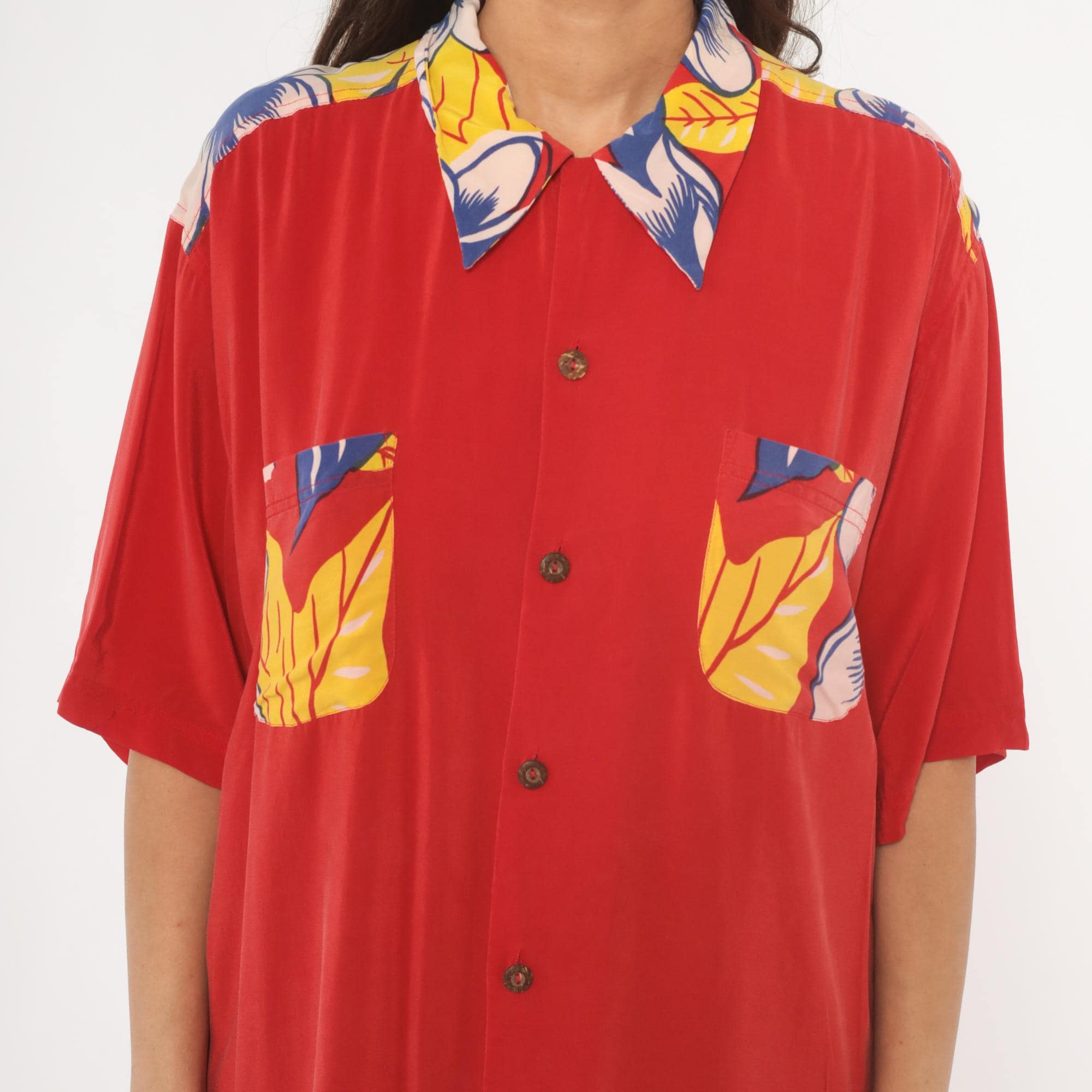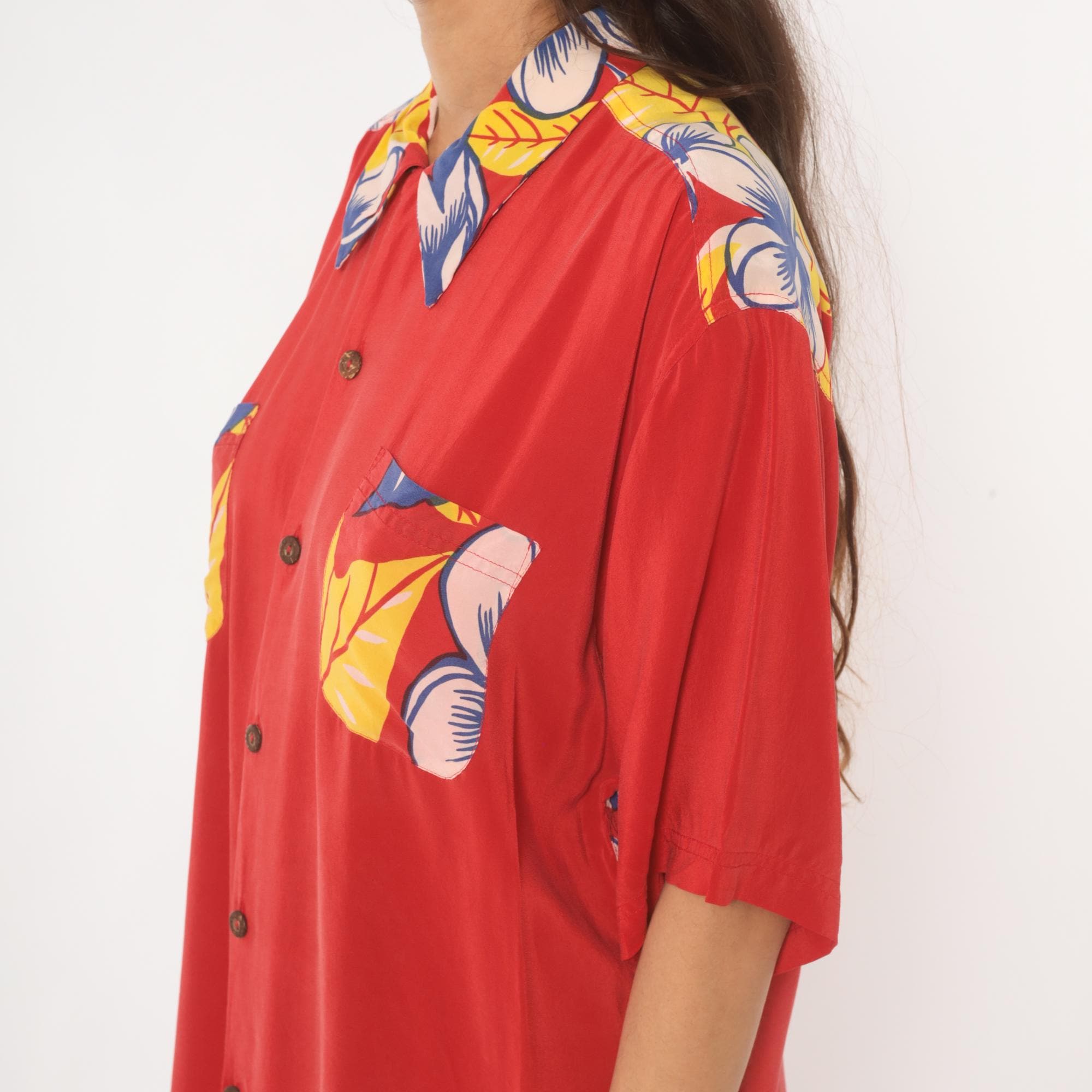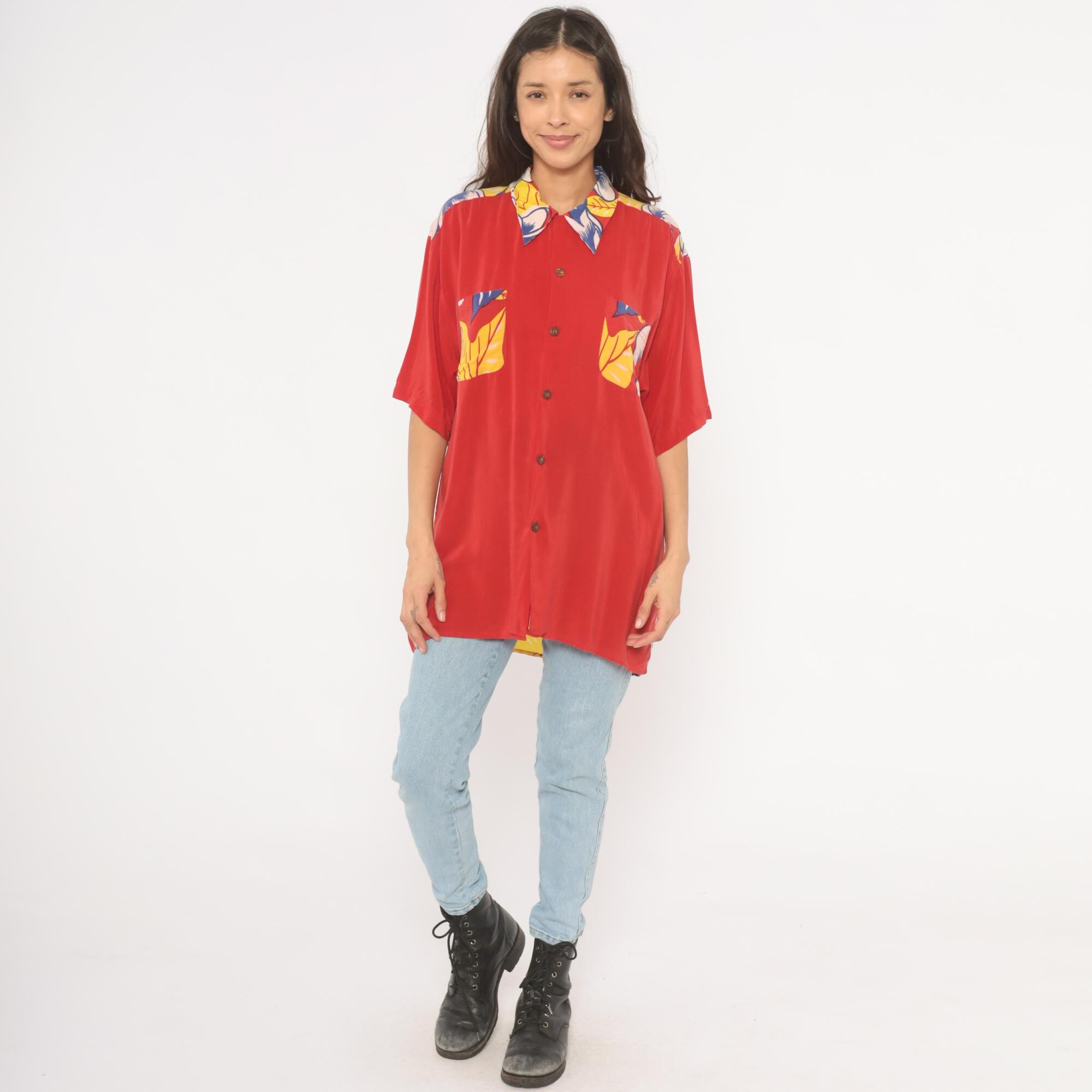 90s red Avanti Hawaiian shirt with a large hula girl illustration printed across the back, surrounded by plumeria flowers and tropical foliage in blue, yellow, and pink. Button front closure with coconut-style buttons, camp collar with floral print, and short sleeves. Two chest pockets with matching floral print detail. Predominantly red base with the front kept relatively plain and the back dominated by the pin-up style graphic in a yellow grass skirt and lei.