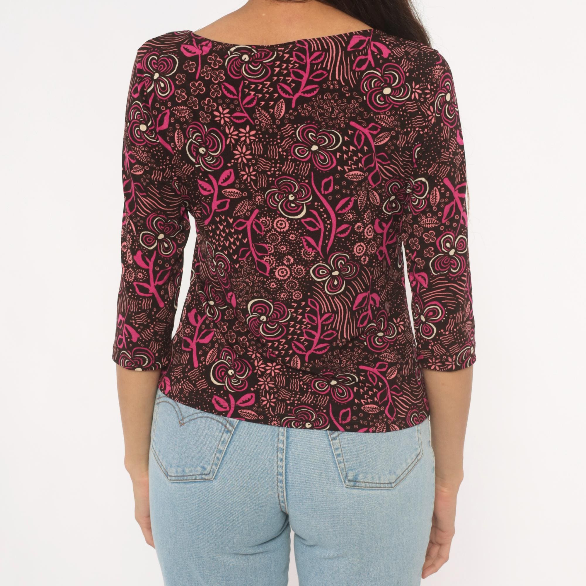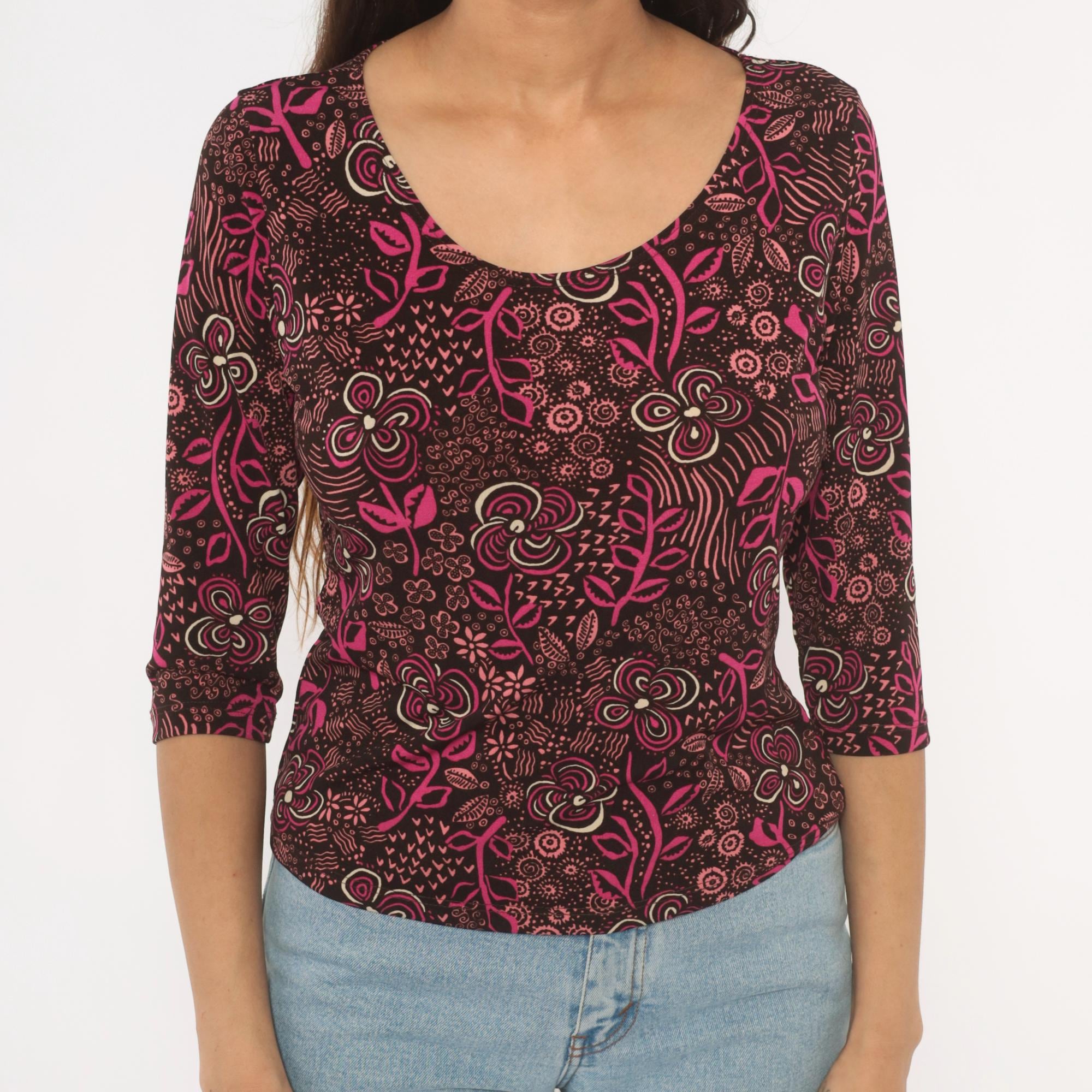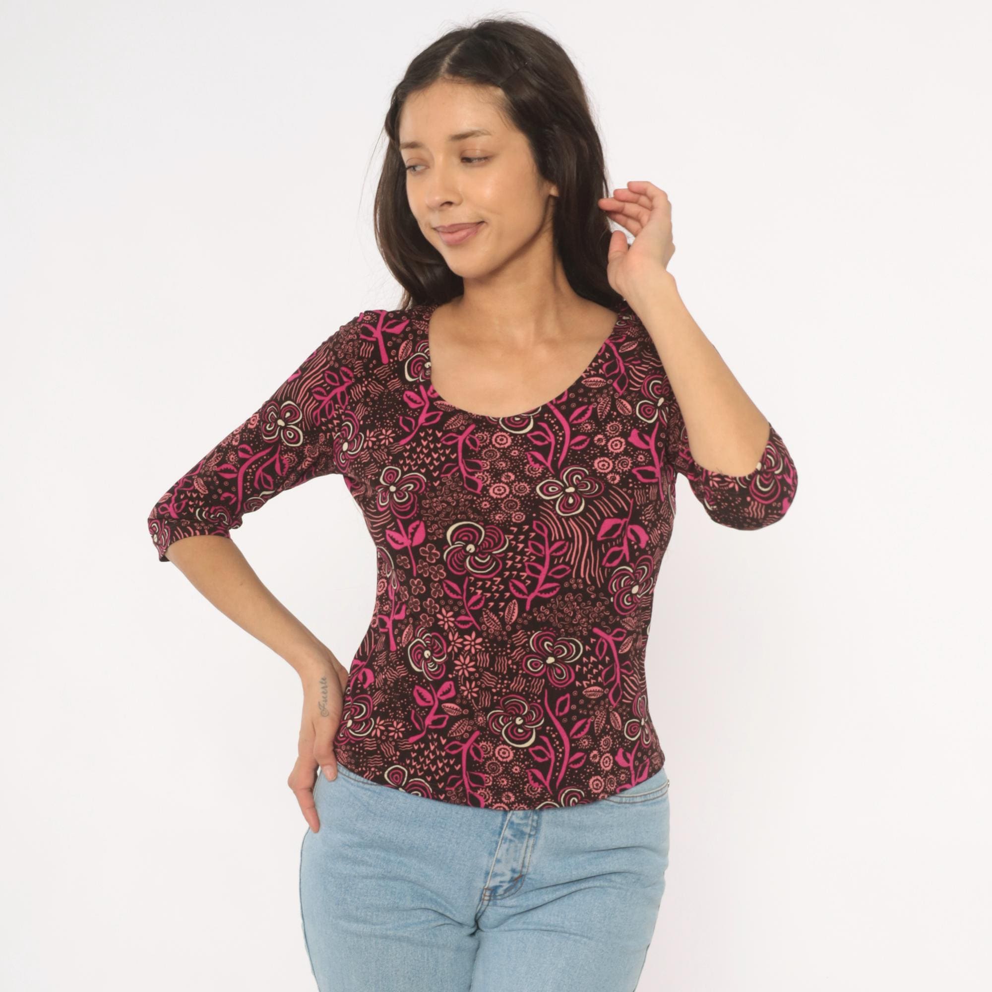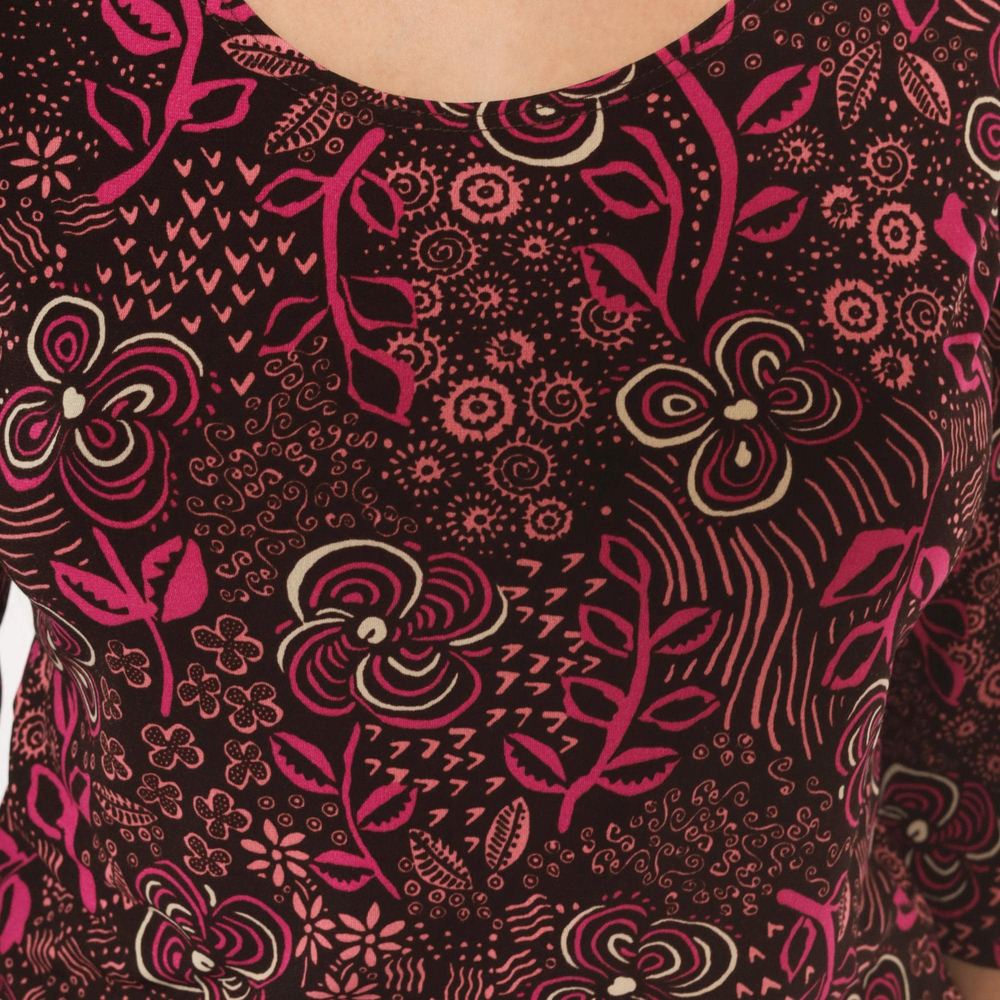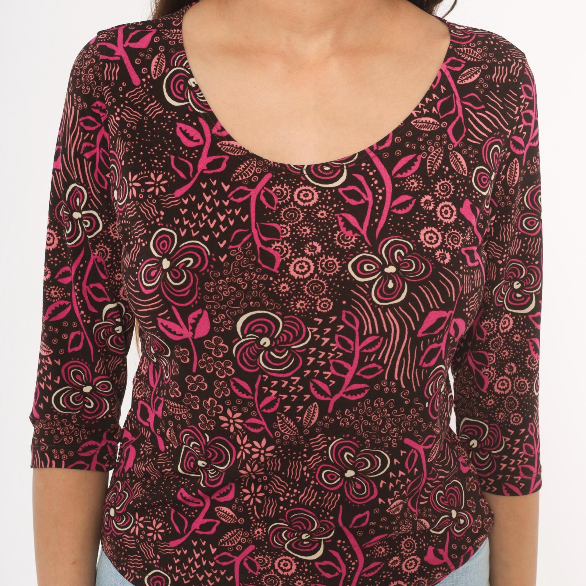 Y2K scoop neck top from Only Nine with an allover folk art floral print in magenta, pink, and cream against a dark brown background. Three-quarter length sleeves with a fitted silhouette and pullover construction. Whimsical hand-drawn style botanical doodle pattern with stylized flowers, swirls, leaves, and abstract line work throughout.
