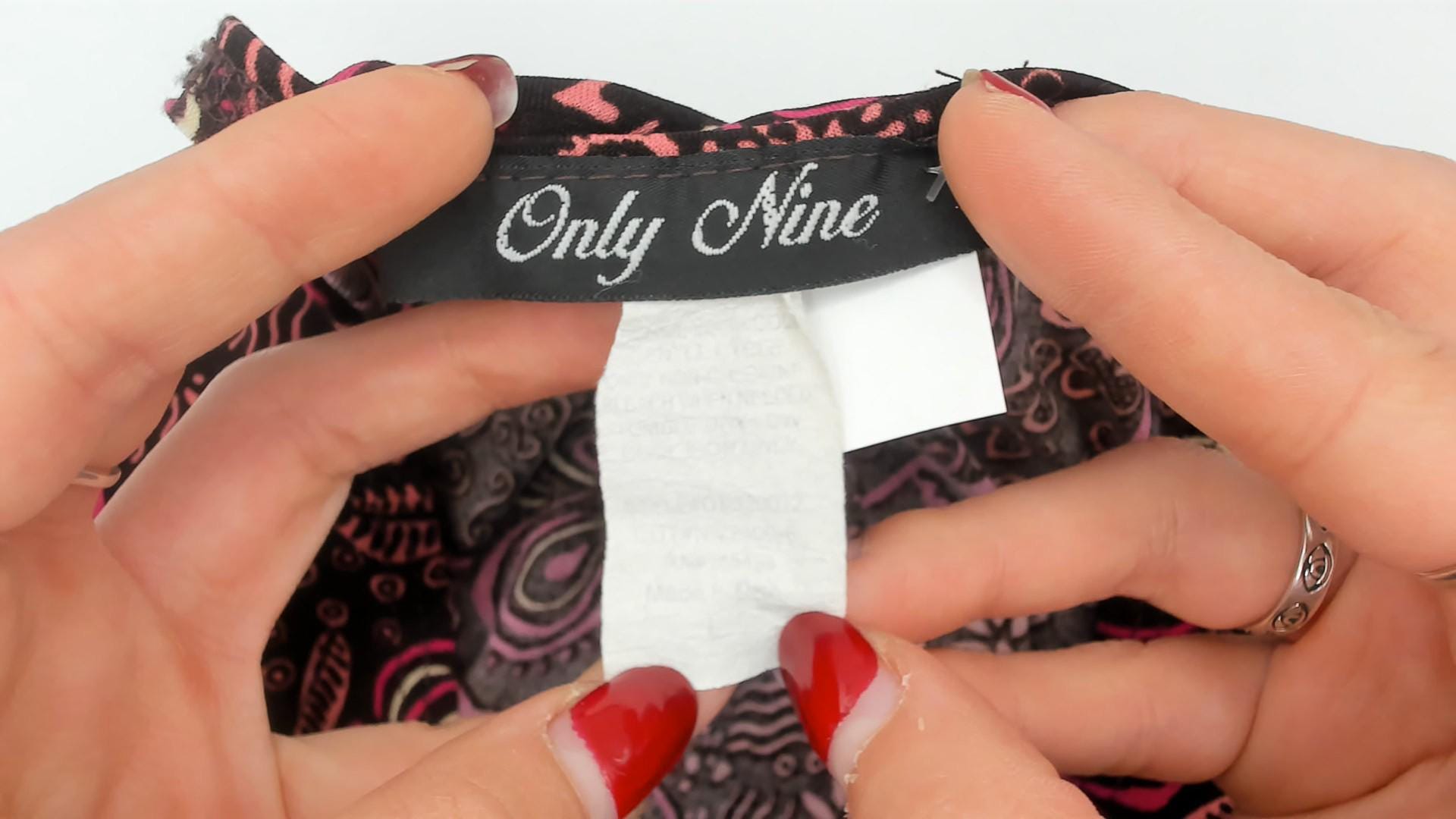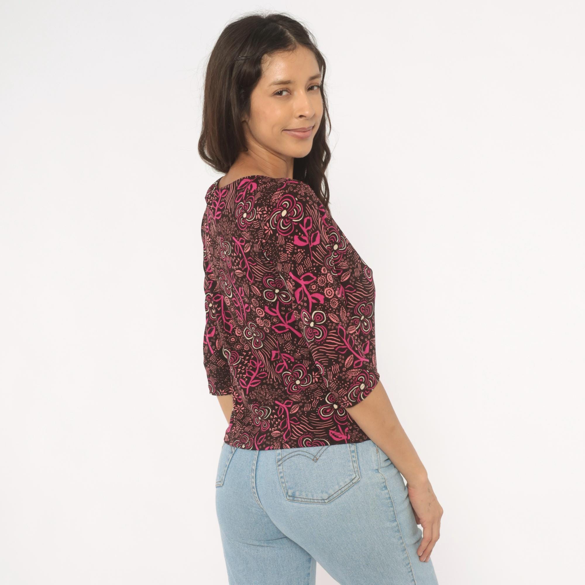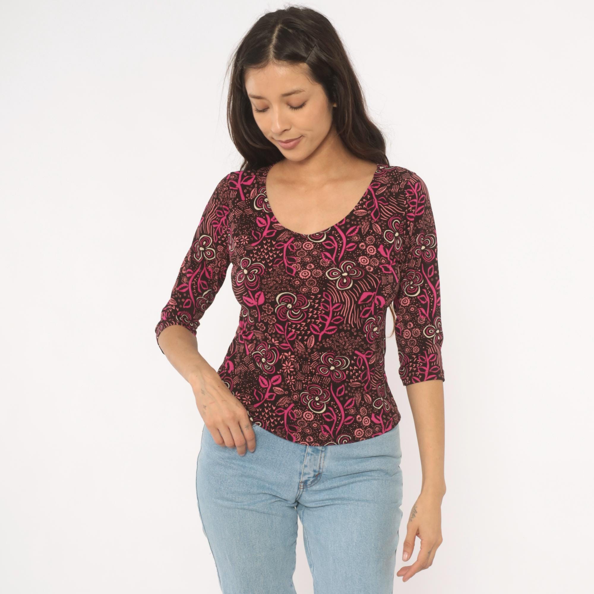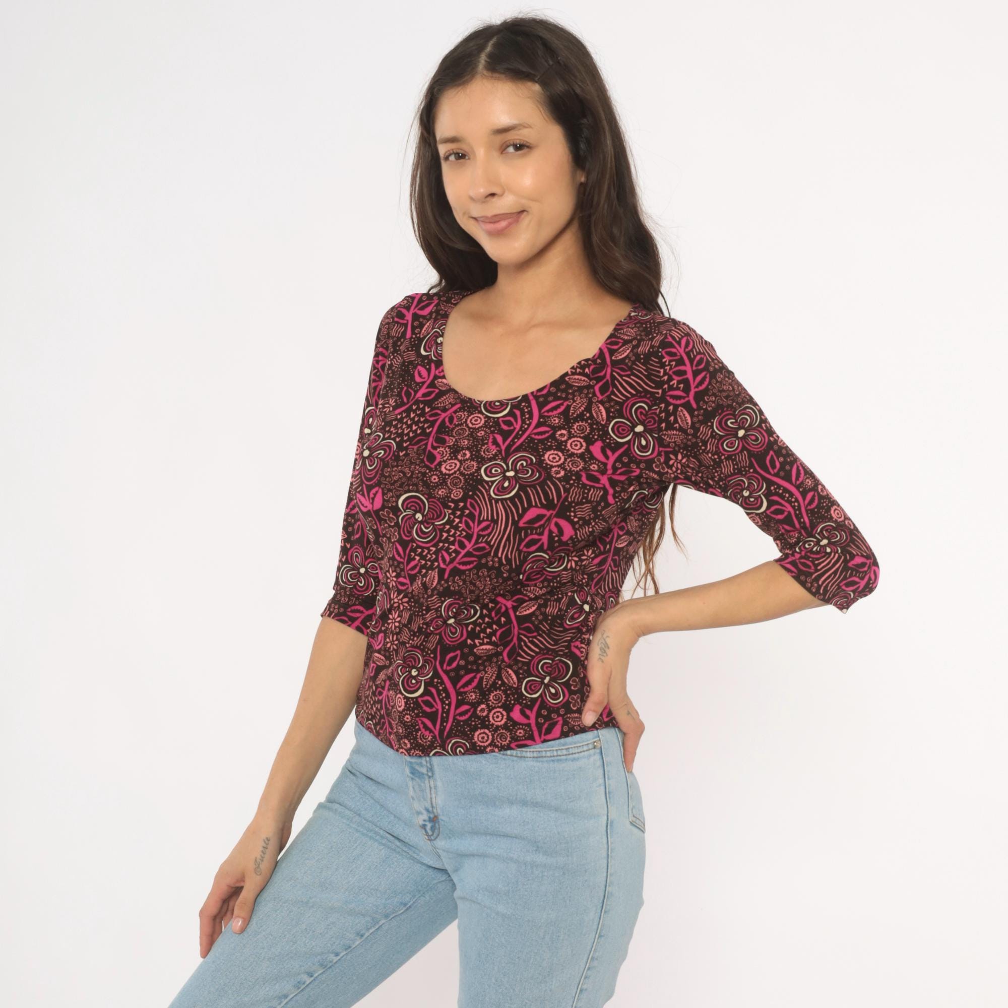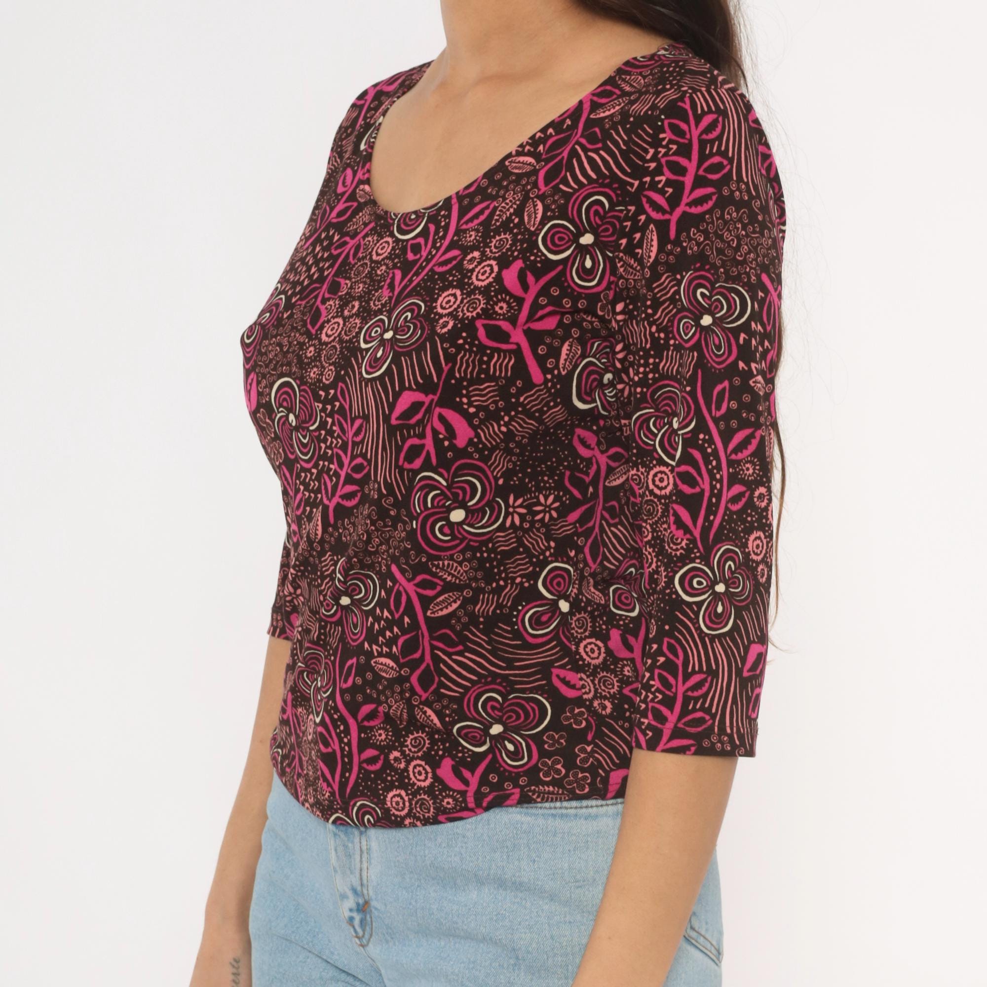 Y2K scoop neck top from Only Nine with an allover folk art floral print in magenta, pink, and cream against a dark brown background. Three-quarter length sleeves with a fitted silhouette and pullover construction. Whimsical hand-drawn style botanical doodle pattern with stylized flowers, swirls, leaves, and abstract line work throughout.