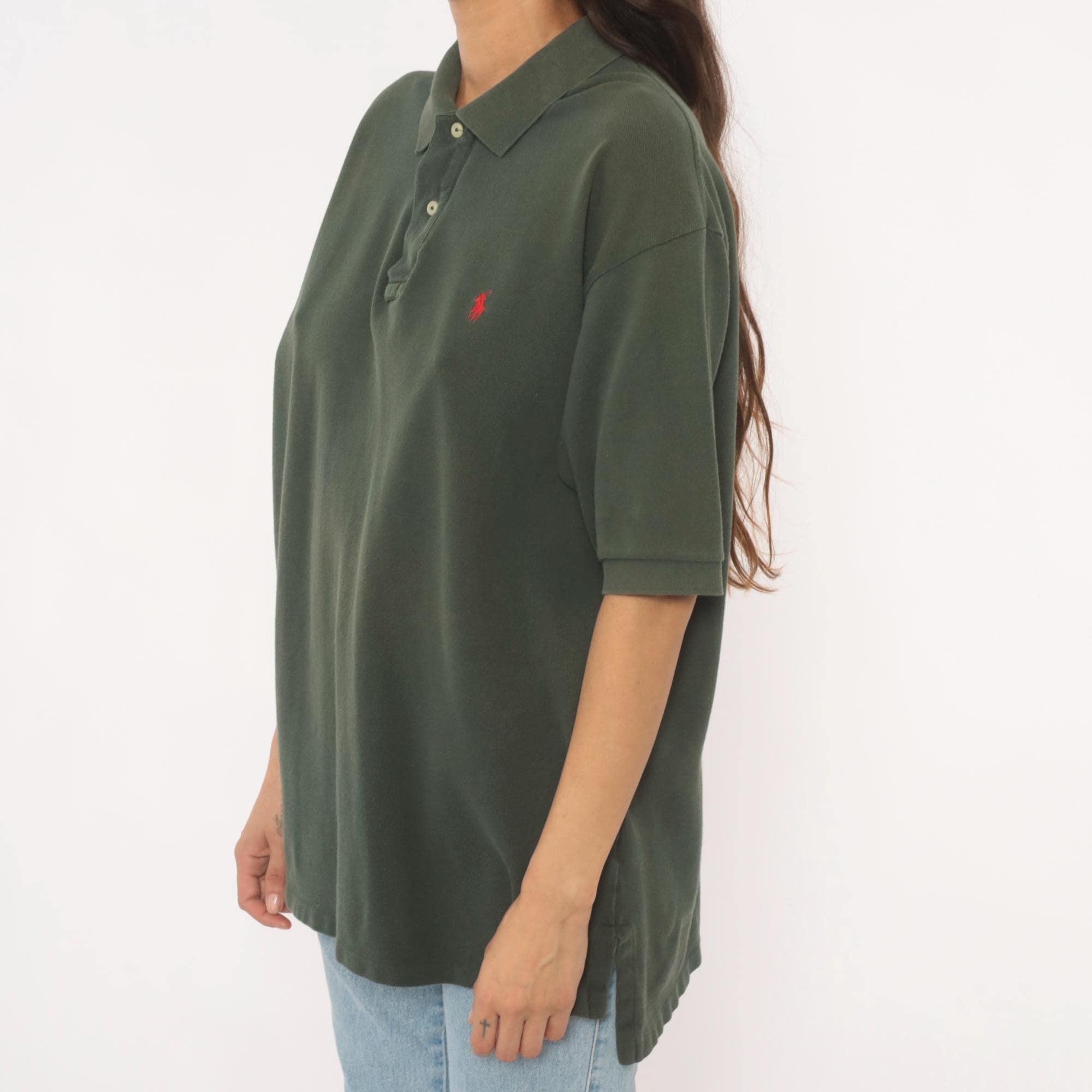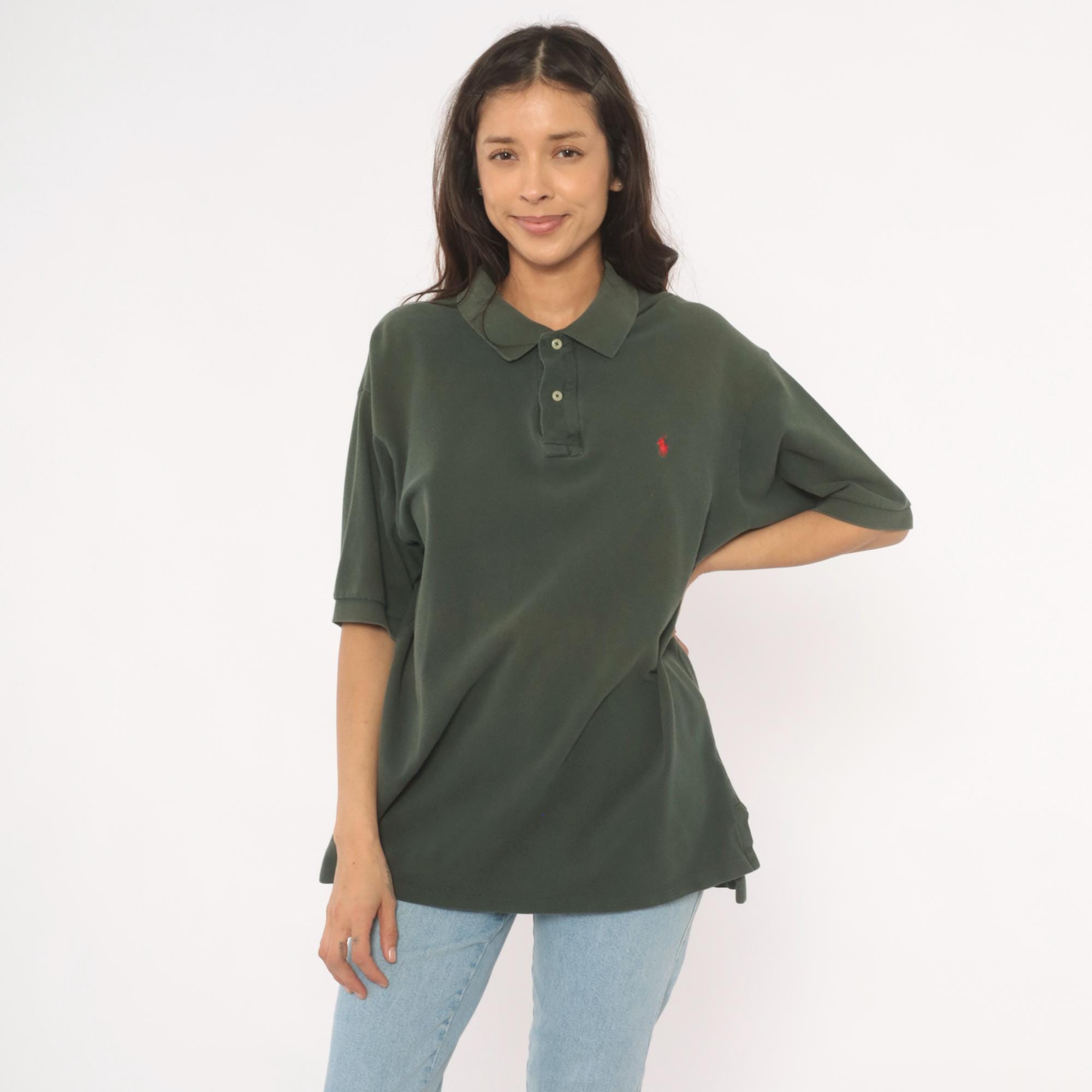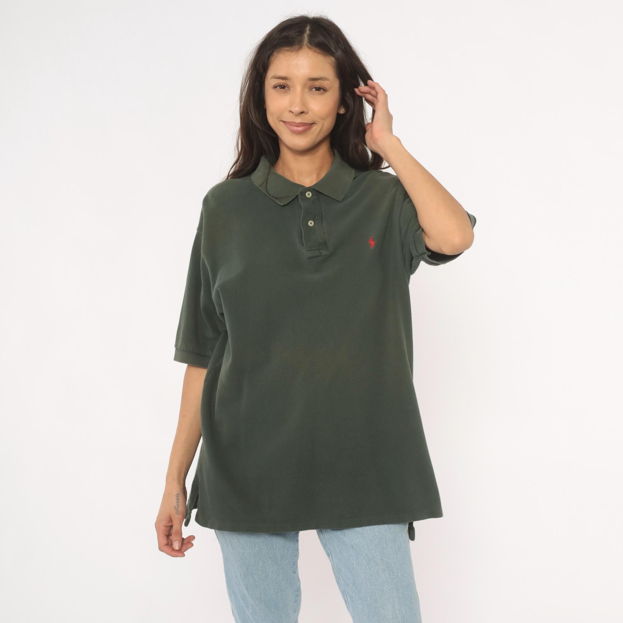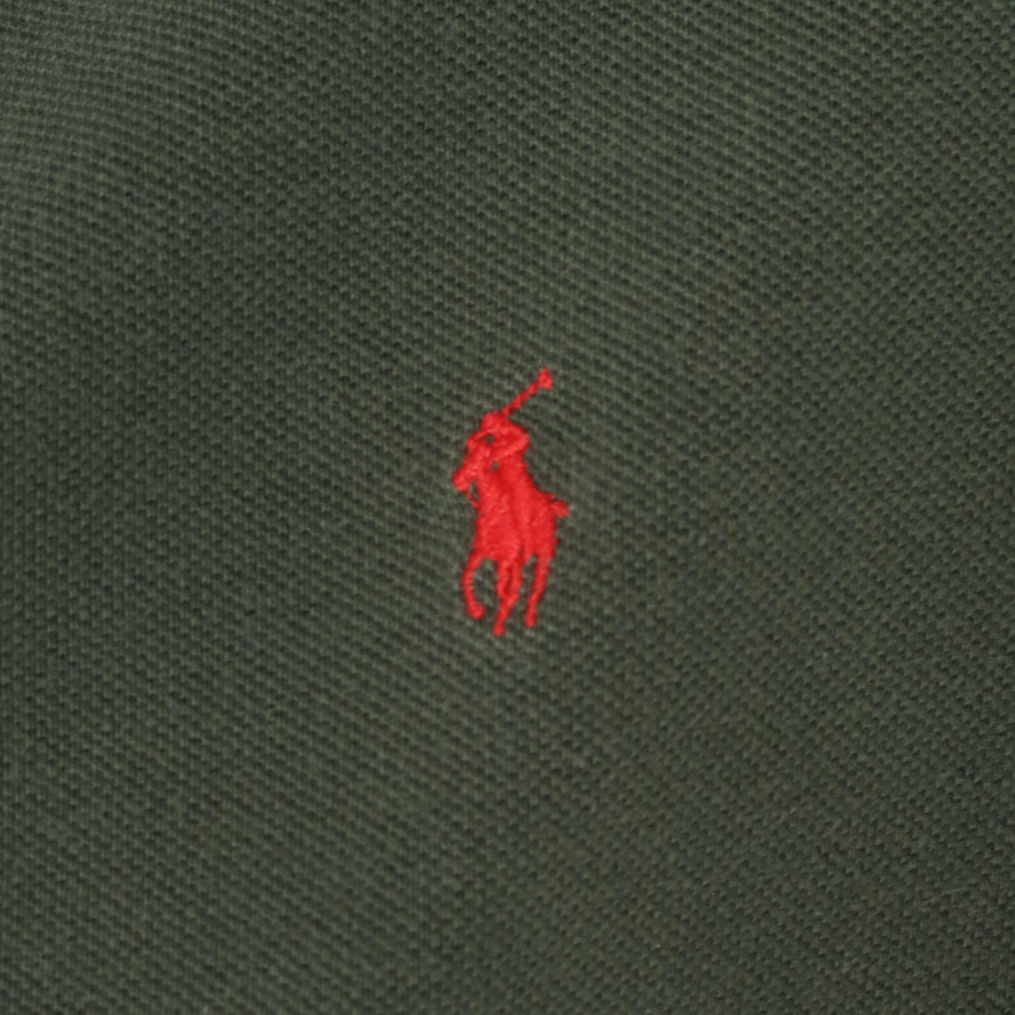 90s dark green polo shirt from Polo Ralph Lauren with a two-button placket and flat knit collar. Red embroidered pony logo on the left chest, short sleeves, and straight hem with side vents. Pique knit cotton in a deep forest green with a relaxed, boxy cut through the body.