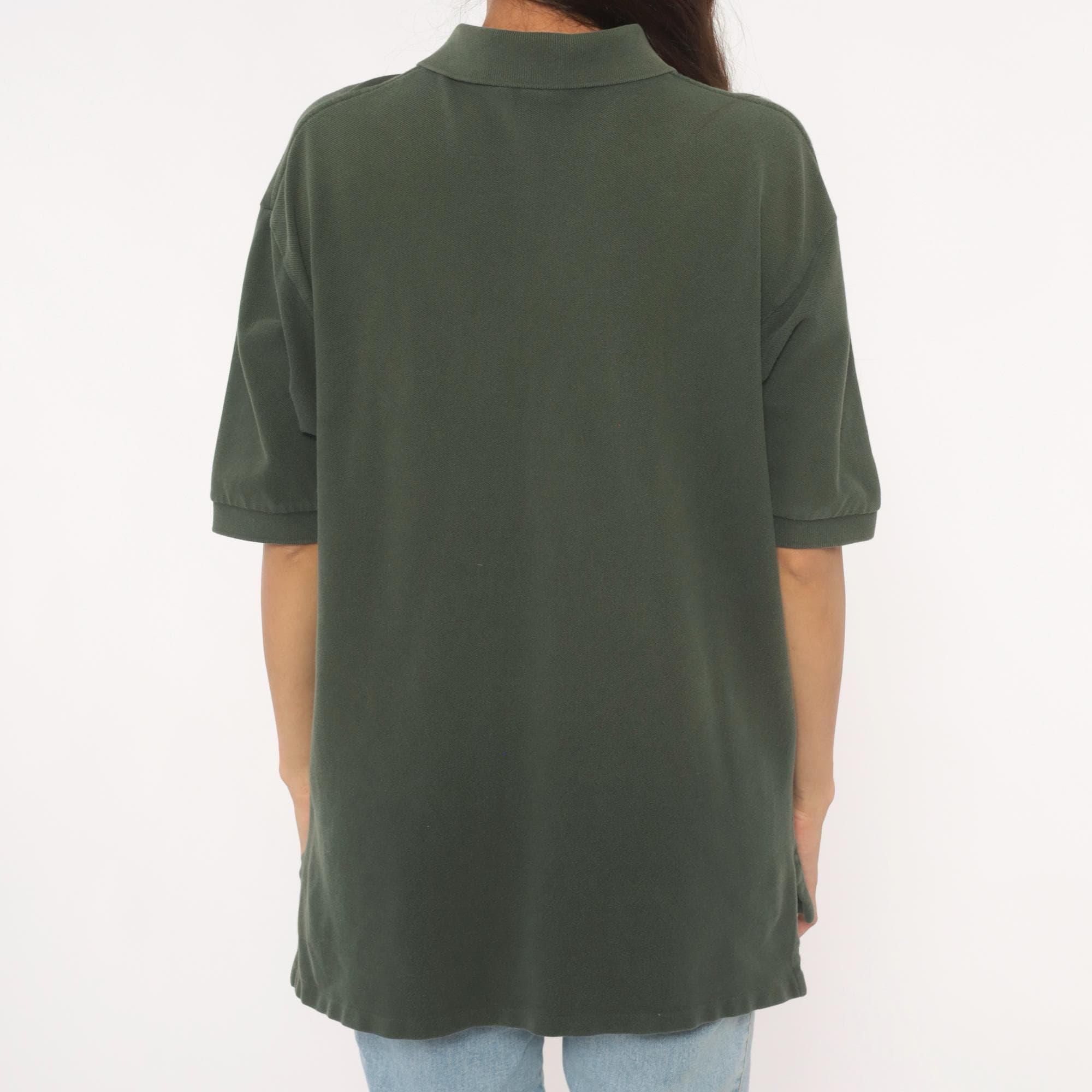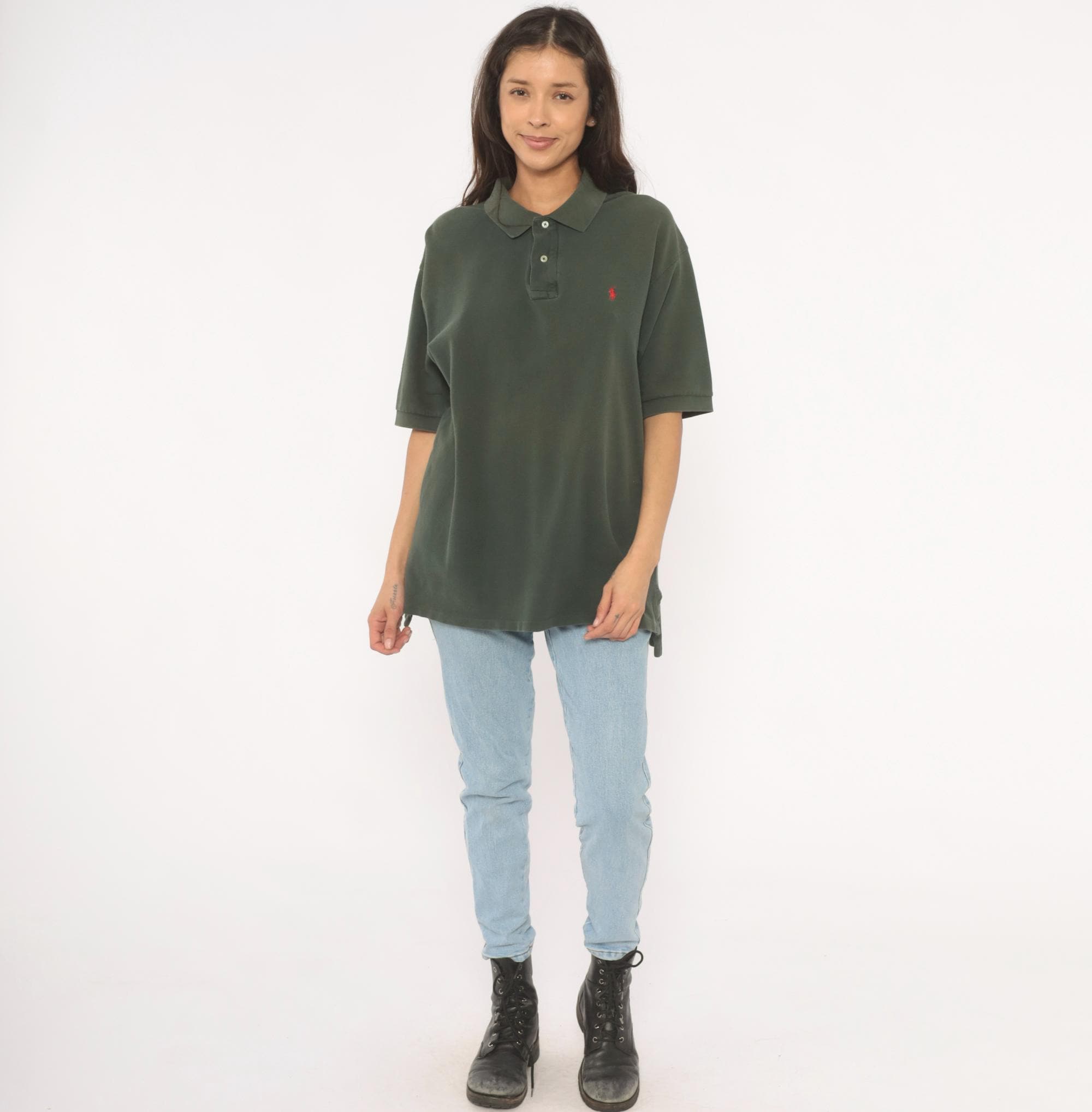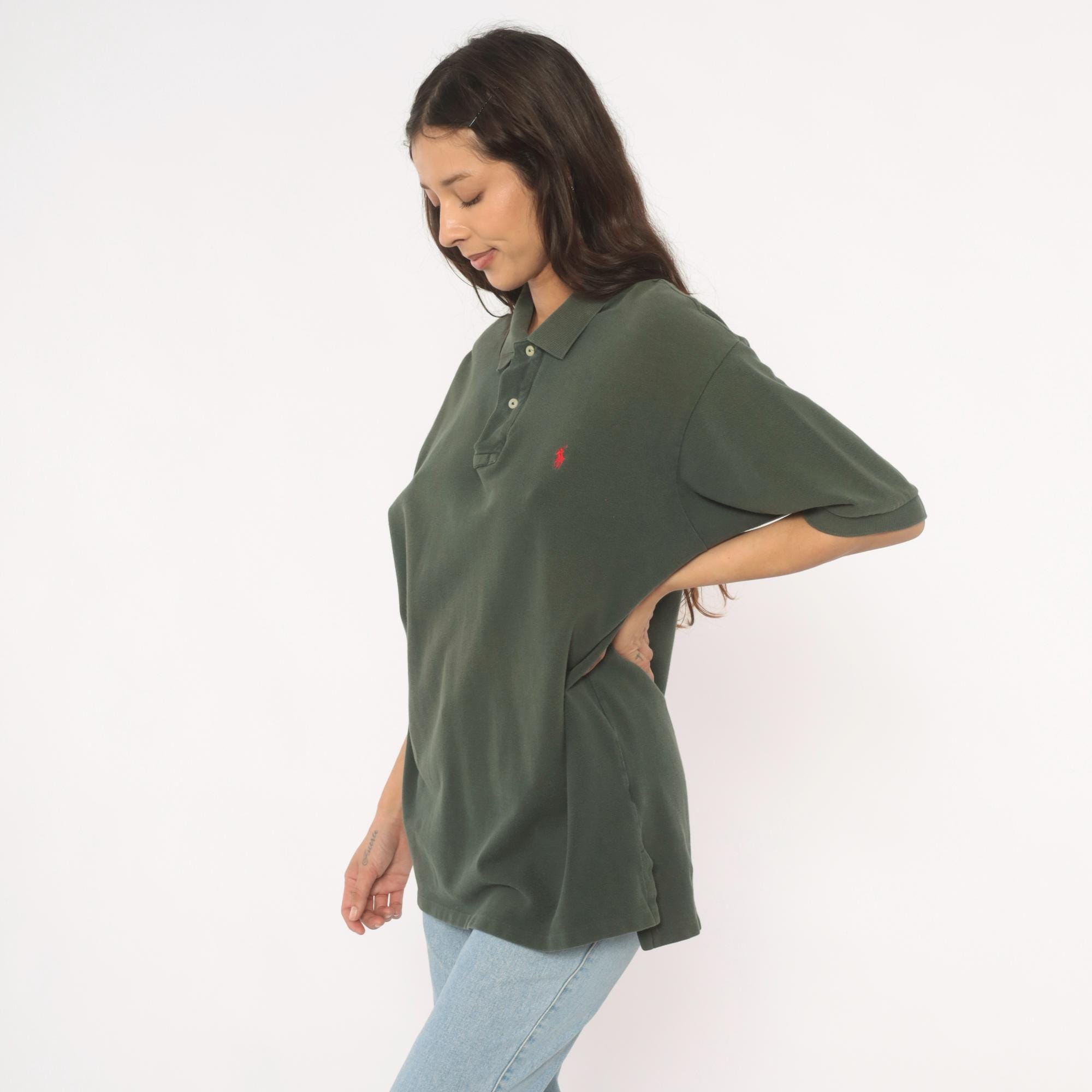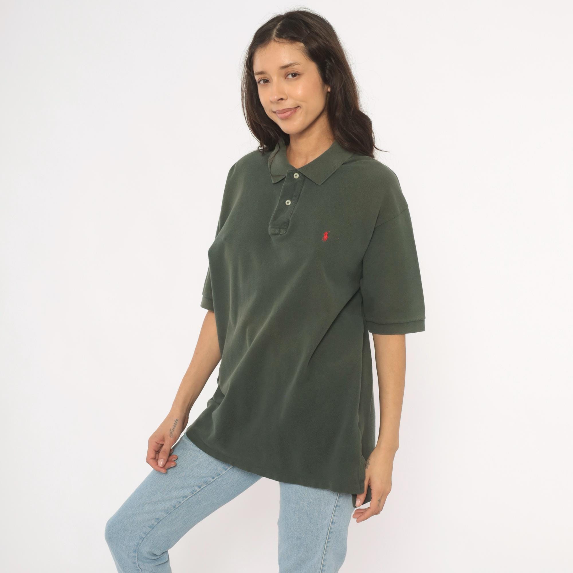 90s dark green polo shirt from Polo Ralph Lauren with a two-button placket and flat knit collar. Red embroidered pony logo on the left chest, short sleeves, and straight hem with side vents. Pique knit cotton in a deep forest green with a relaxed, boxy cut through the body.