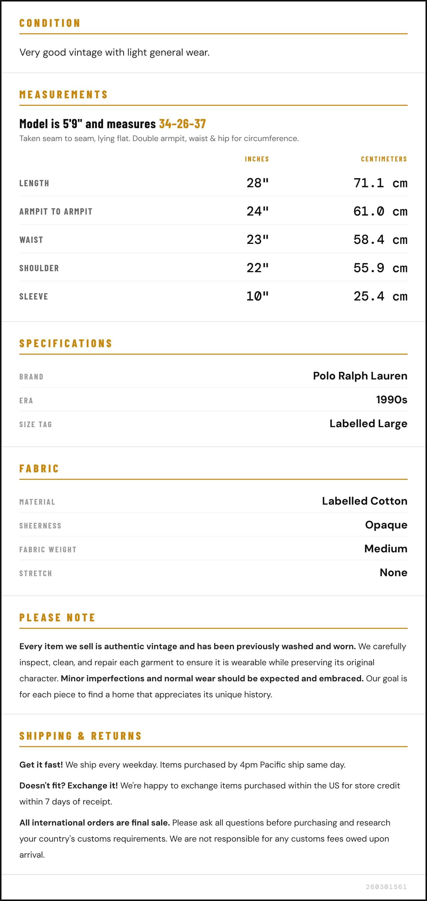 Vintage denim was usually made without any stretch, unlike modern jeans. Check the measurements to ensure proper fit, and remember to give yourself a little wiggle room in the waist and hips, depending on your preferred fit.