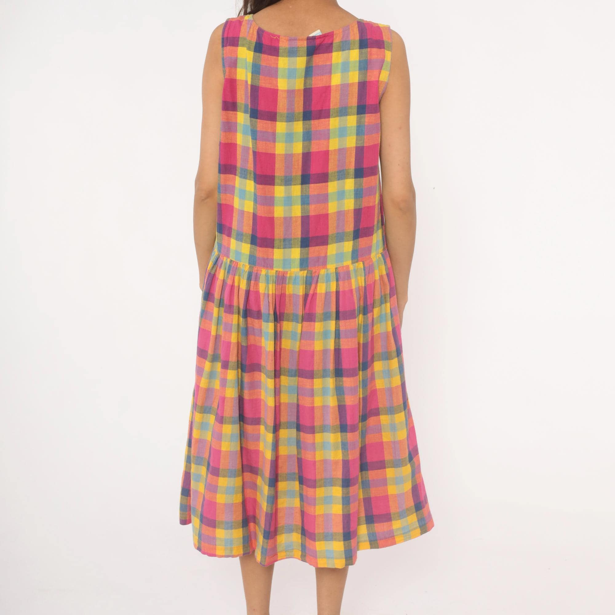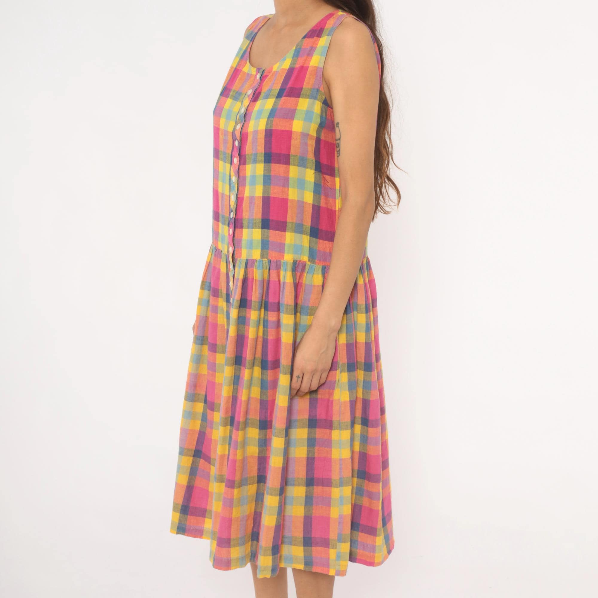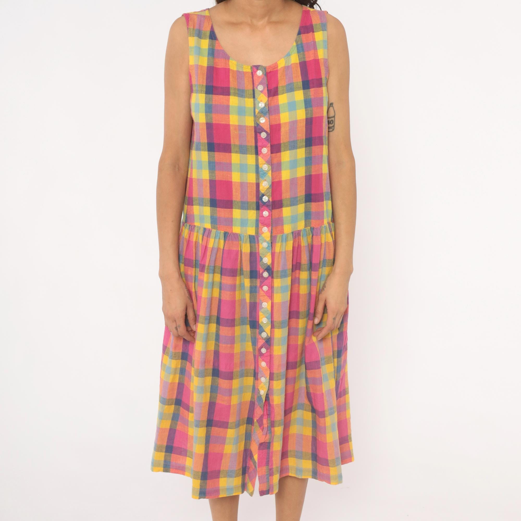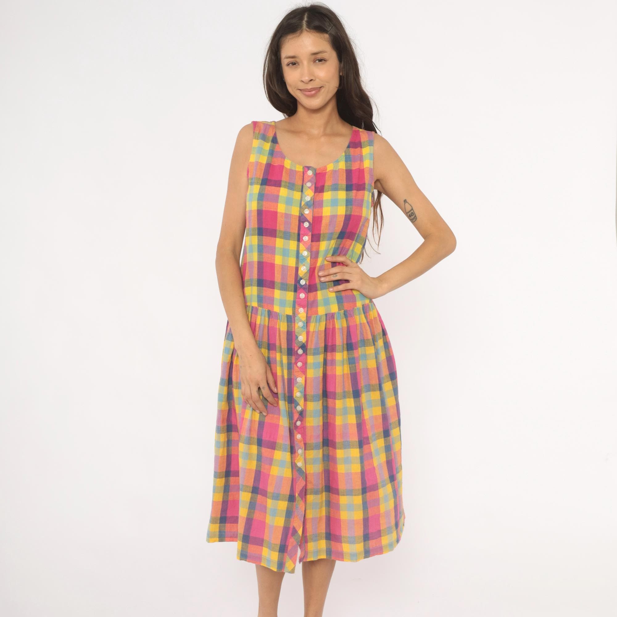 80s madras plaid sundress from pink, yellow, and blue check pattern with a scoop neckline and sleeveless cut. Full button front closure with small pearlescent buttons set along a bias-cut placket detail running the entire length. Drop waist seam with a gathered skirt below, and side seam pockets.