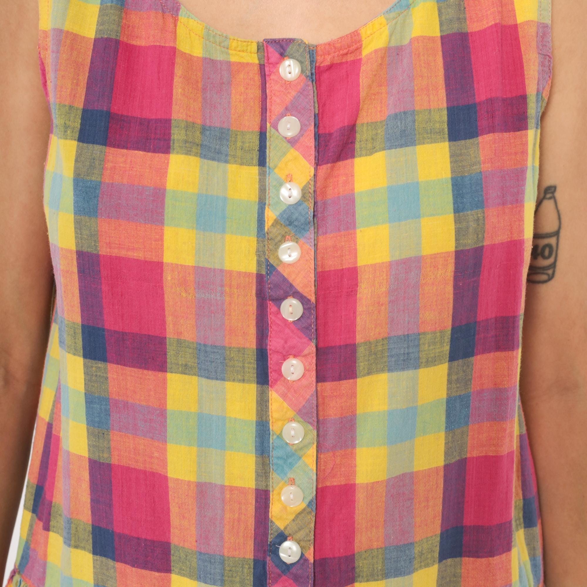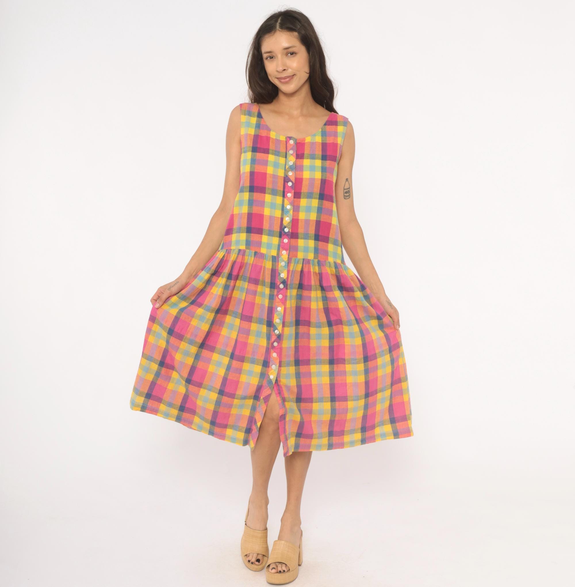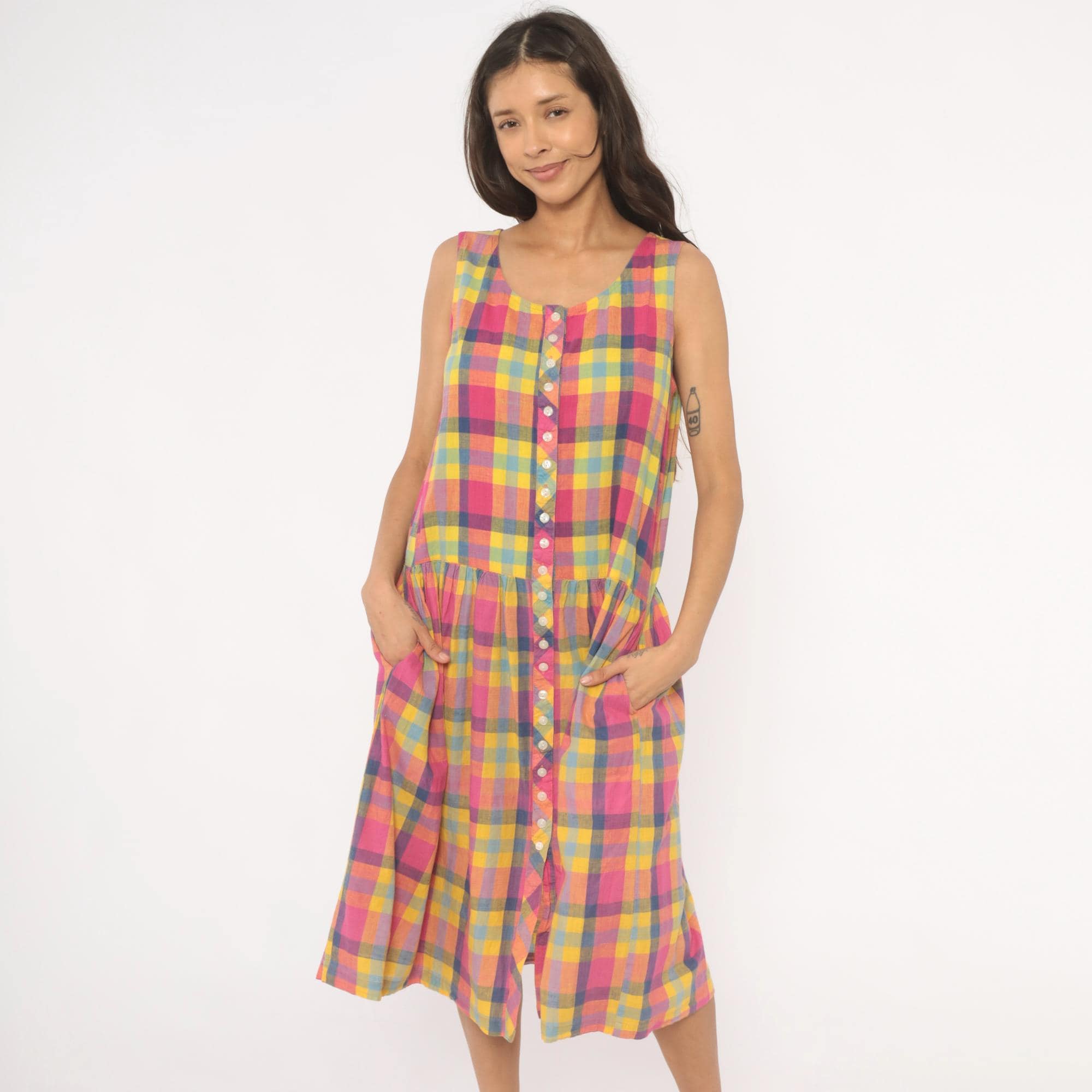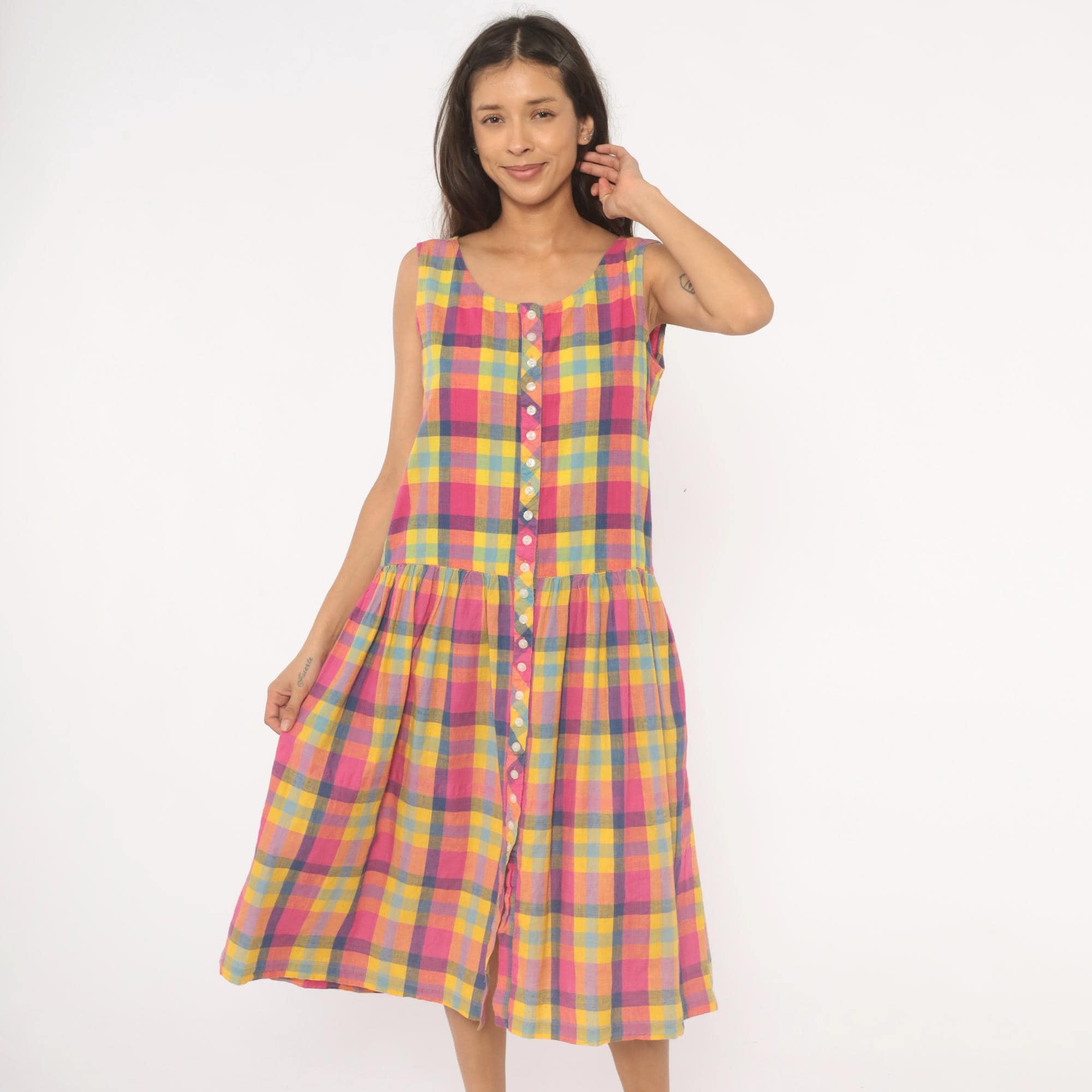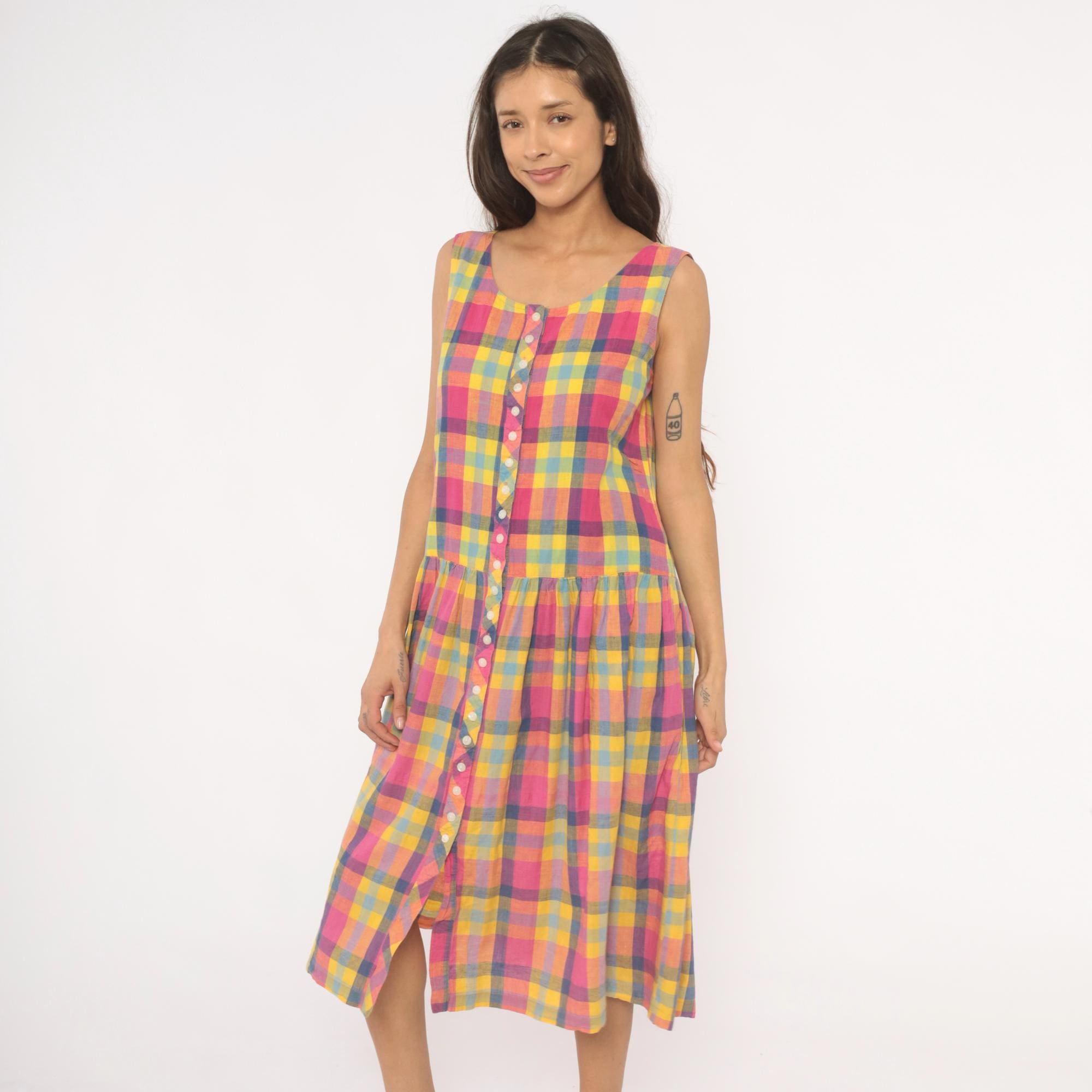 80s madras plaid sundress from pink, yellow, and blue check pattern with a scoop neckline and sleeveless cut. Full button front closure with small pearlescent buttons set along a bias-cut placket detail running the entire length. Drop waist seam with a gathered skirt below, and side seam pockets.